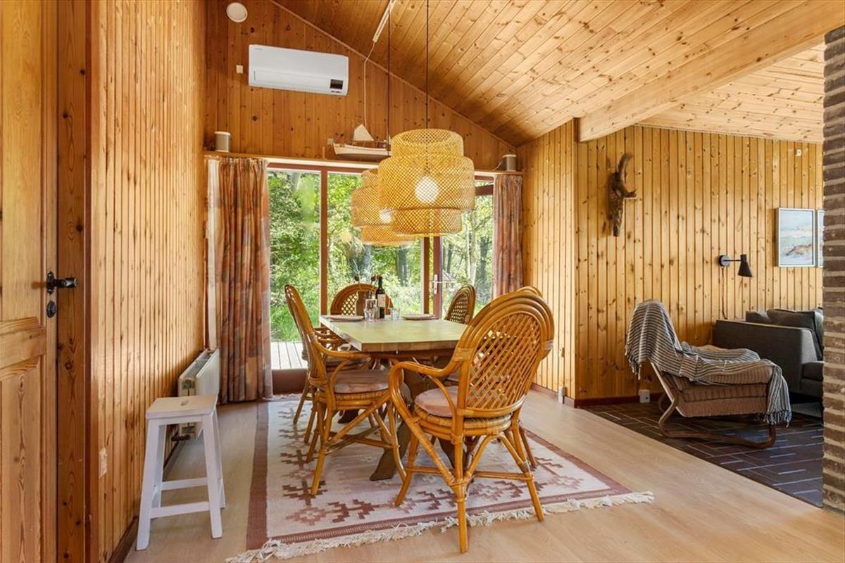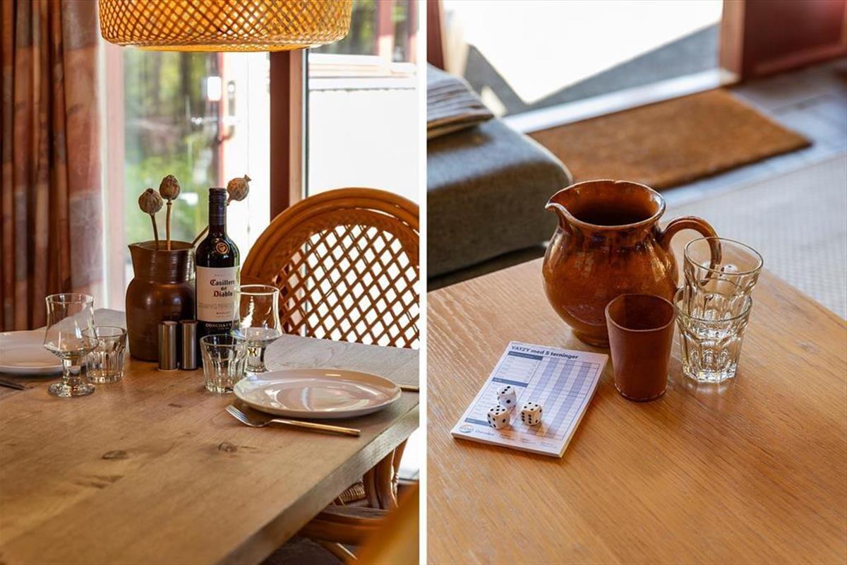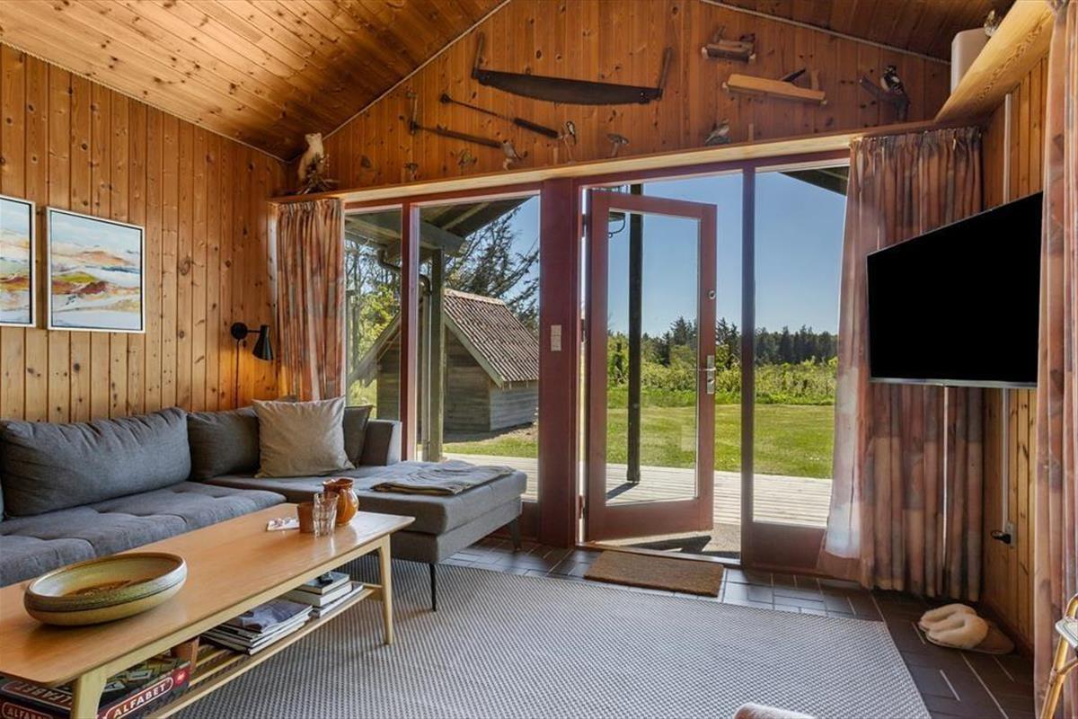 Das Sommerhaus dient als gemütliche Ferienwohnung für bis zu sechs Personen, und auch ein Hund ist willkommen, wenn dieser zur Familie gehört. Im Inneren gibt es rustikale Holzwände, eine offene Decke und komfortable Möbel, und der Kaminofen im Wohnzimmer sorgt für Wärme und eine angenehme Atmosphäre an Tagen, an denen Sie sich einfach auf dem Sofa mit einem guten Buch, einem Yatzzy-Spiel oder einem Film auf dem Flachbildfernseher entspannen möchten. Die Küche ist auf praktische und gemütliche Weise in das Wohnzimmer integriert, und die Schlafzimmer sind gut im Haus verteilt. Übrigens hat jedes Zimmer eine Glastür zur Terrasse, sodass es einfach ist, nach draußen zu gelangen.