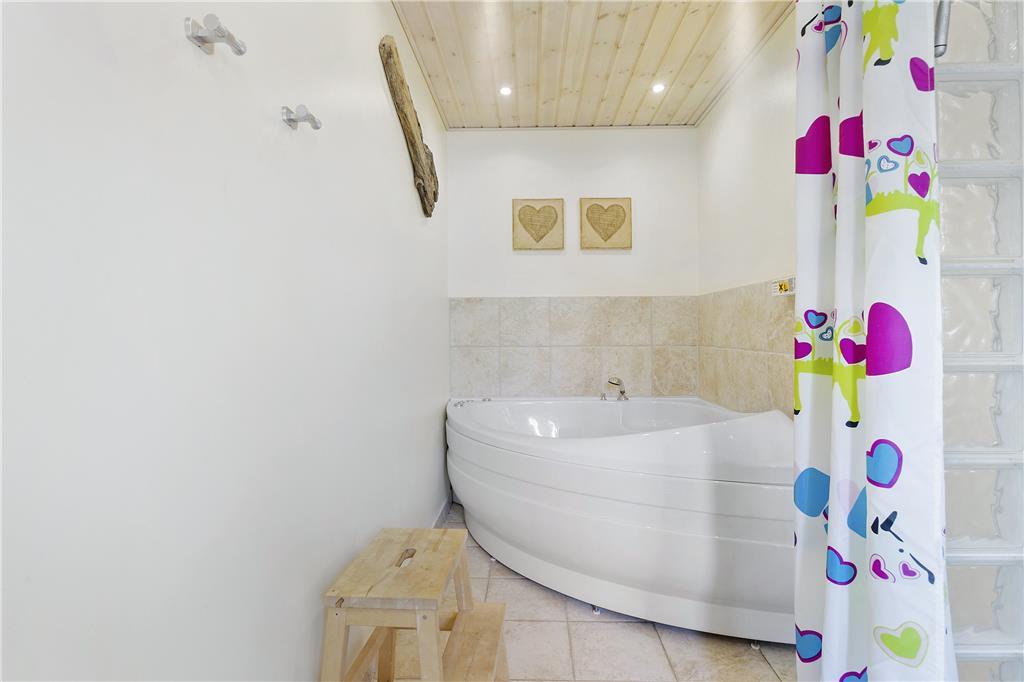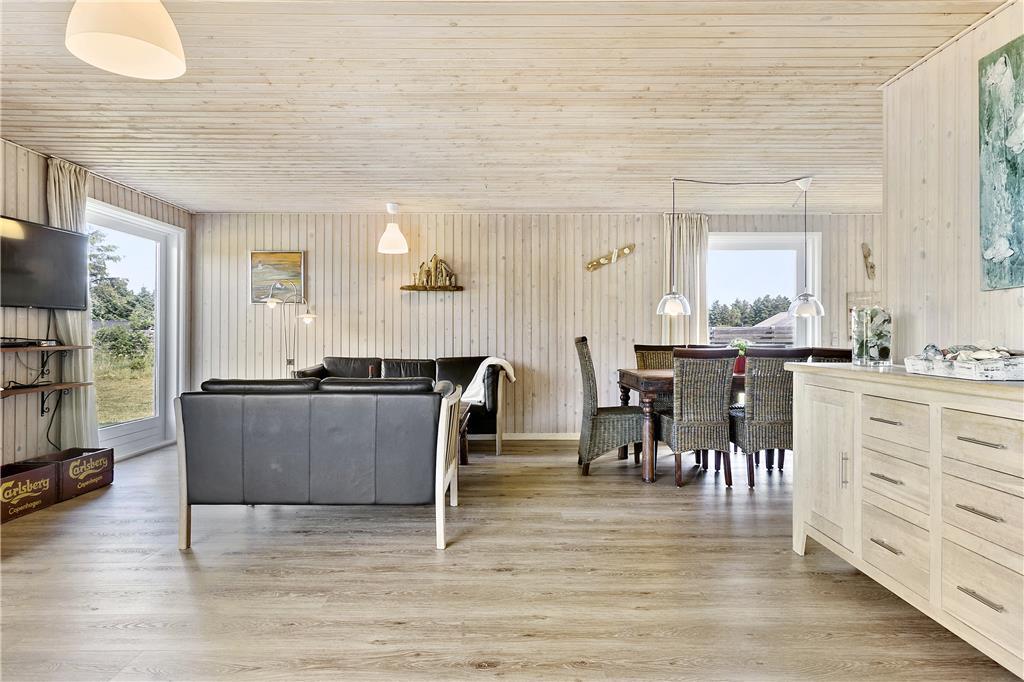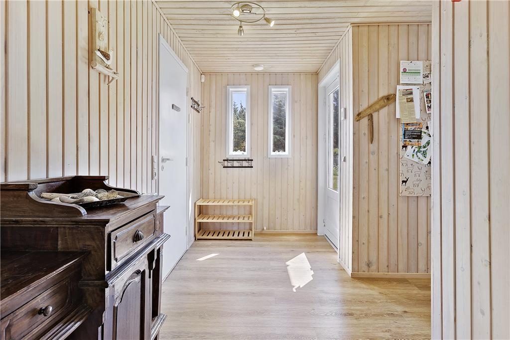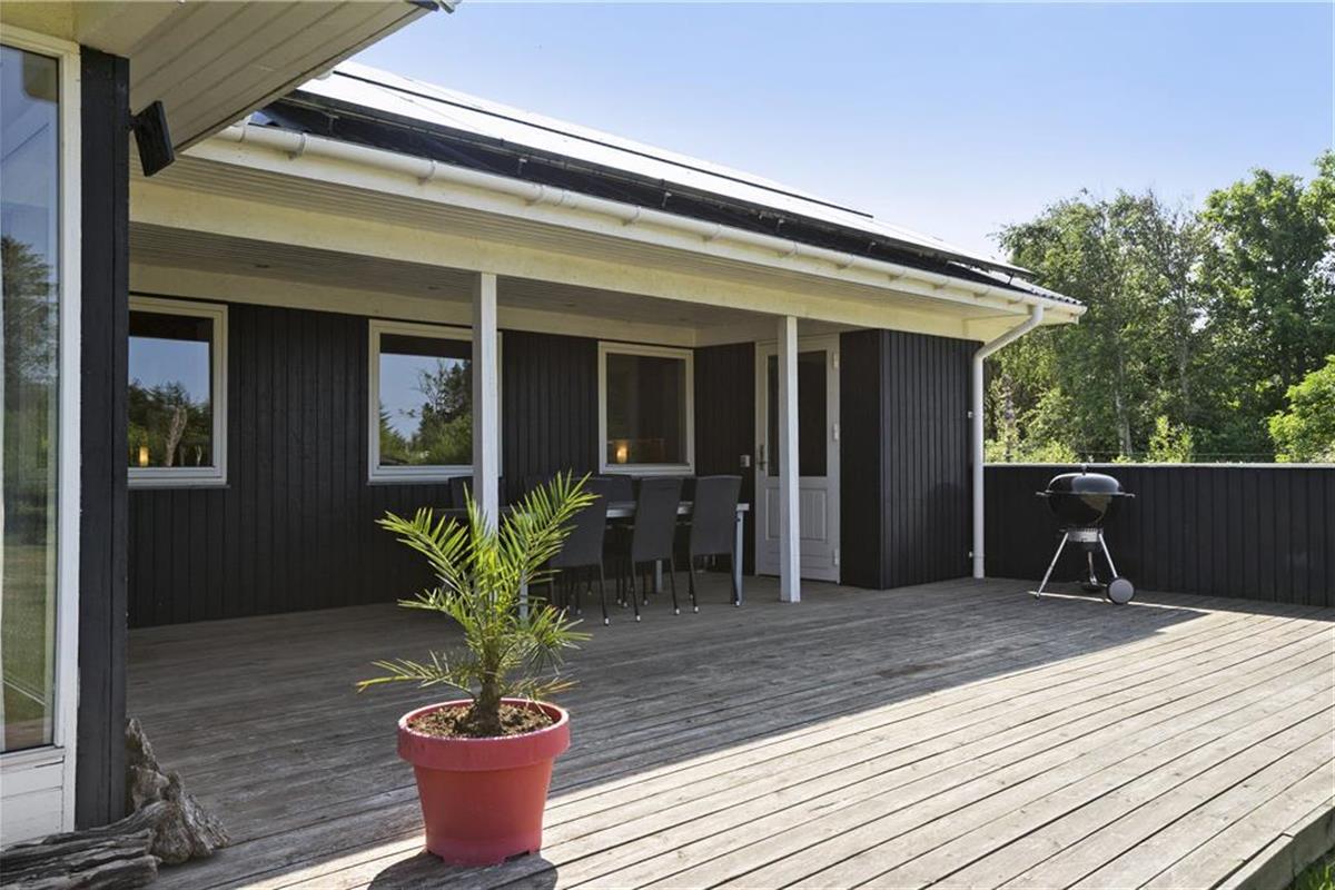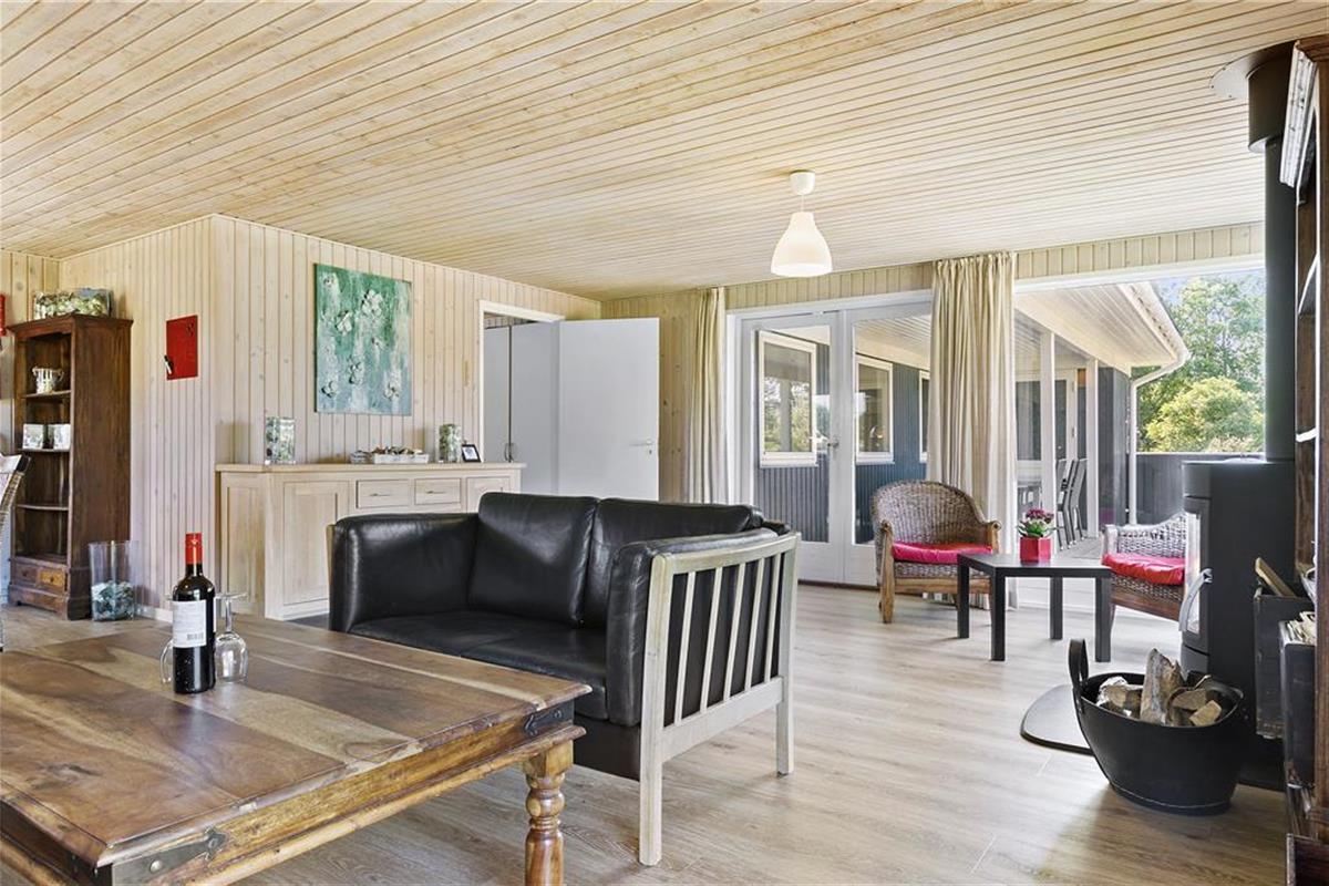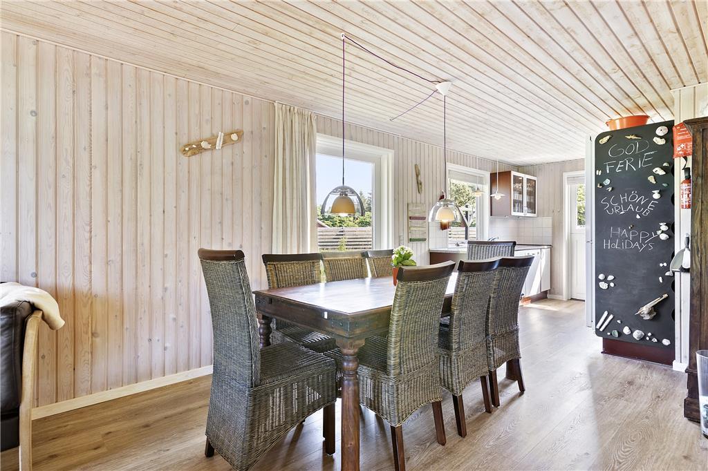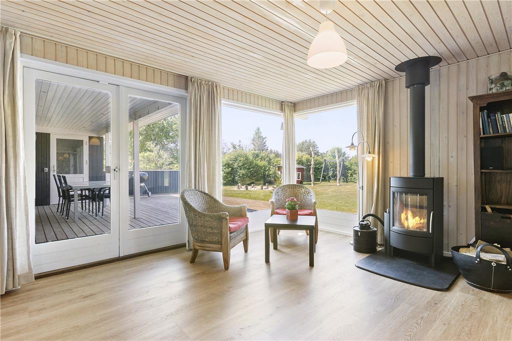 Die Einrichtung des Ferienhauses ist warm, praktisch und sehr kinderfreundlich. Das Haus verfügt über drei Schlafzimmer, zwei mit Doppelbetten und eines mit Etagenbetten. Das große, helle und freundliche Badezimmer ist mit einer Dusche, Toilette und einer schönen Whirlpool-Badewanne ausgestattet. Vom gemütlichen Wohnzimmer mit Kamin hat man Zugang zu einer teilweise überdachten, schönen Holzterrasse. Das Wohnzimmer ist offen mit einer gut ausgestatteten Küche verbunden, und das Ferienhaus ist energieeffizient mit sehr guter Isolierung und Solarpaneelen auf dem Dach.
