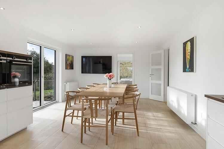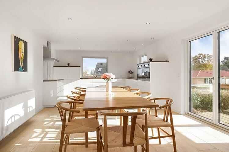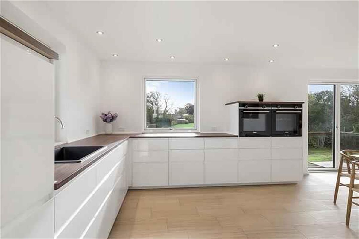 Ruim vakantiehuis op Langeland met zeezicht, 5 slaapkamers, 3 badkamers en dichtbij water en winkels.