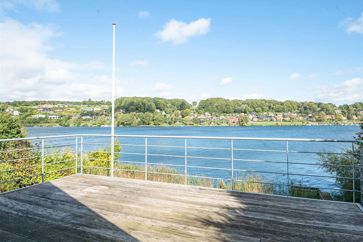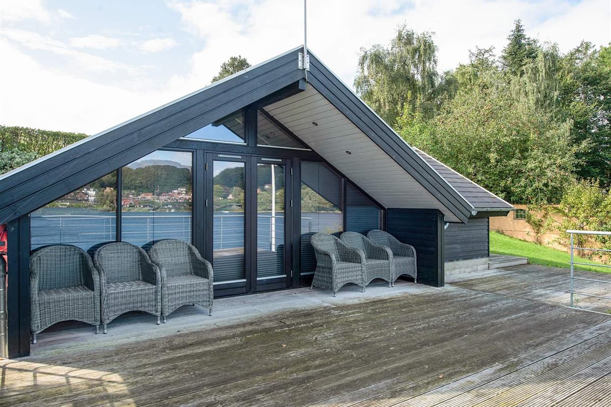 In der großen Wohnküche können Sie beim Kochen und geselligen Beisammensein einen fantastischen Panoramablick auf das Wasser genießen. Das Wohnzimmer führt direkt auf eine große Holzterrasse, wo Sie mit Blick auf den See entspannen können – perfekt für einen Morgenkaffee oder ein gemütliches Abendessen.
