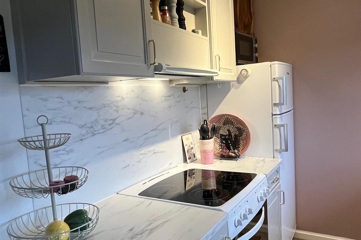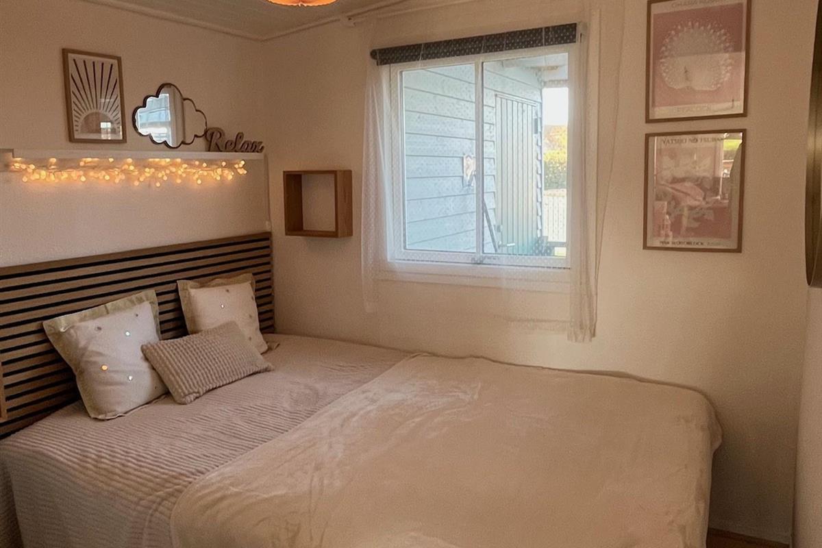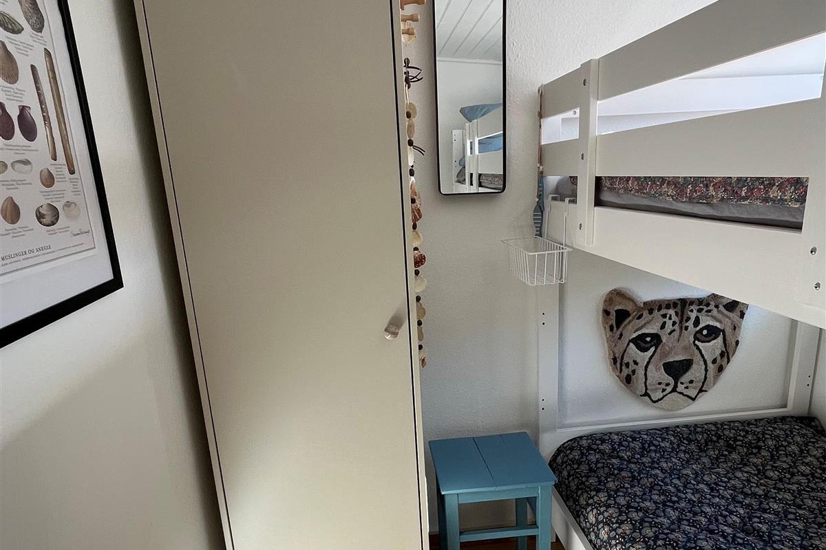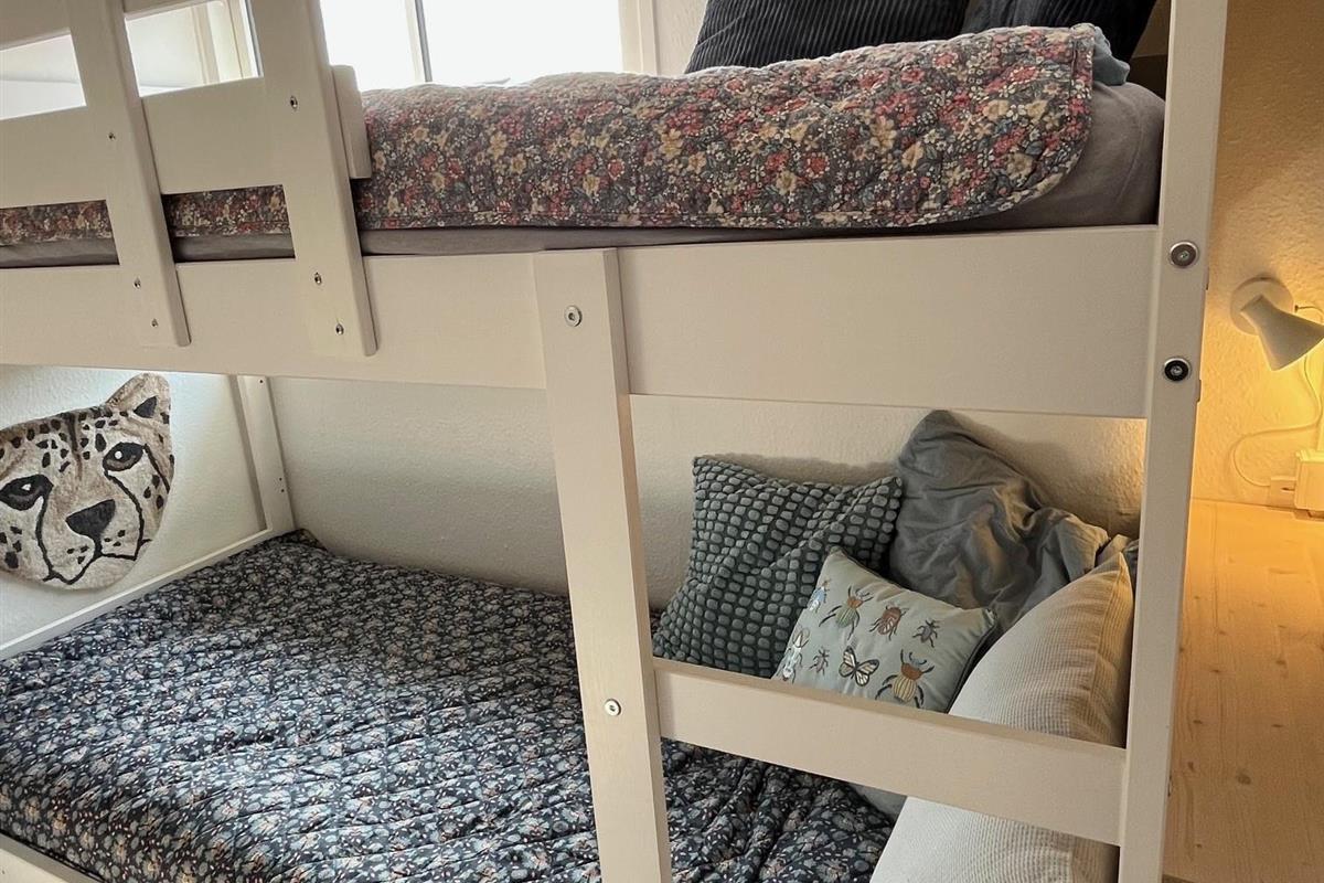 The bedroom is furnished with a 140 cm wide bed. In the extra room, there is a new bunk bed with two sleeping spaces (90x200 cm). Both rooms have a wardrobe for clothes.