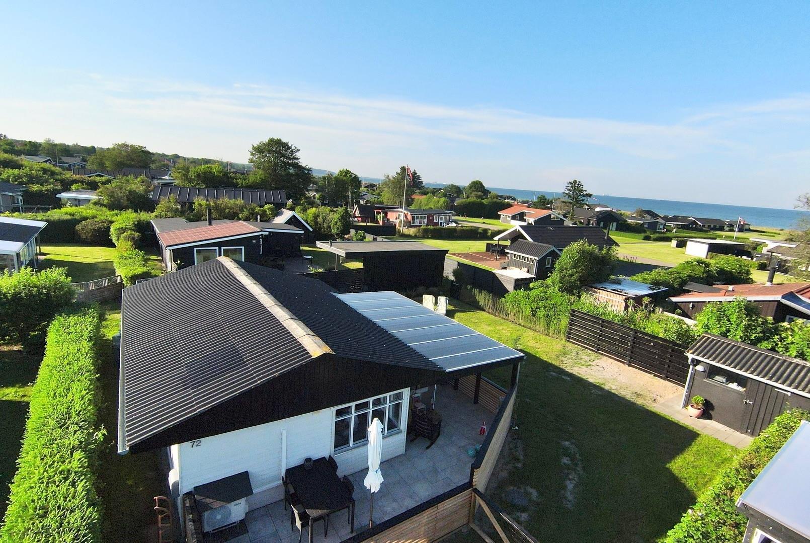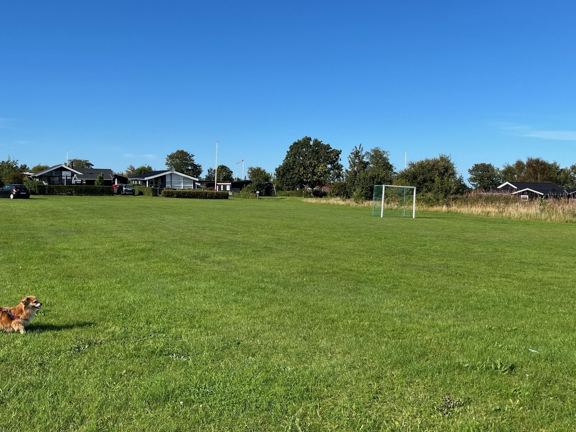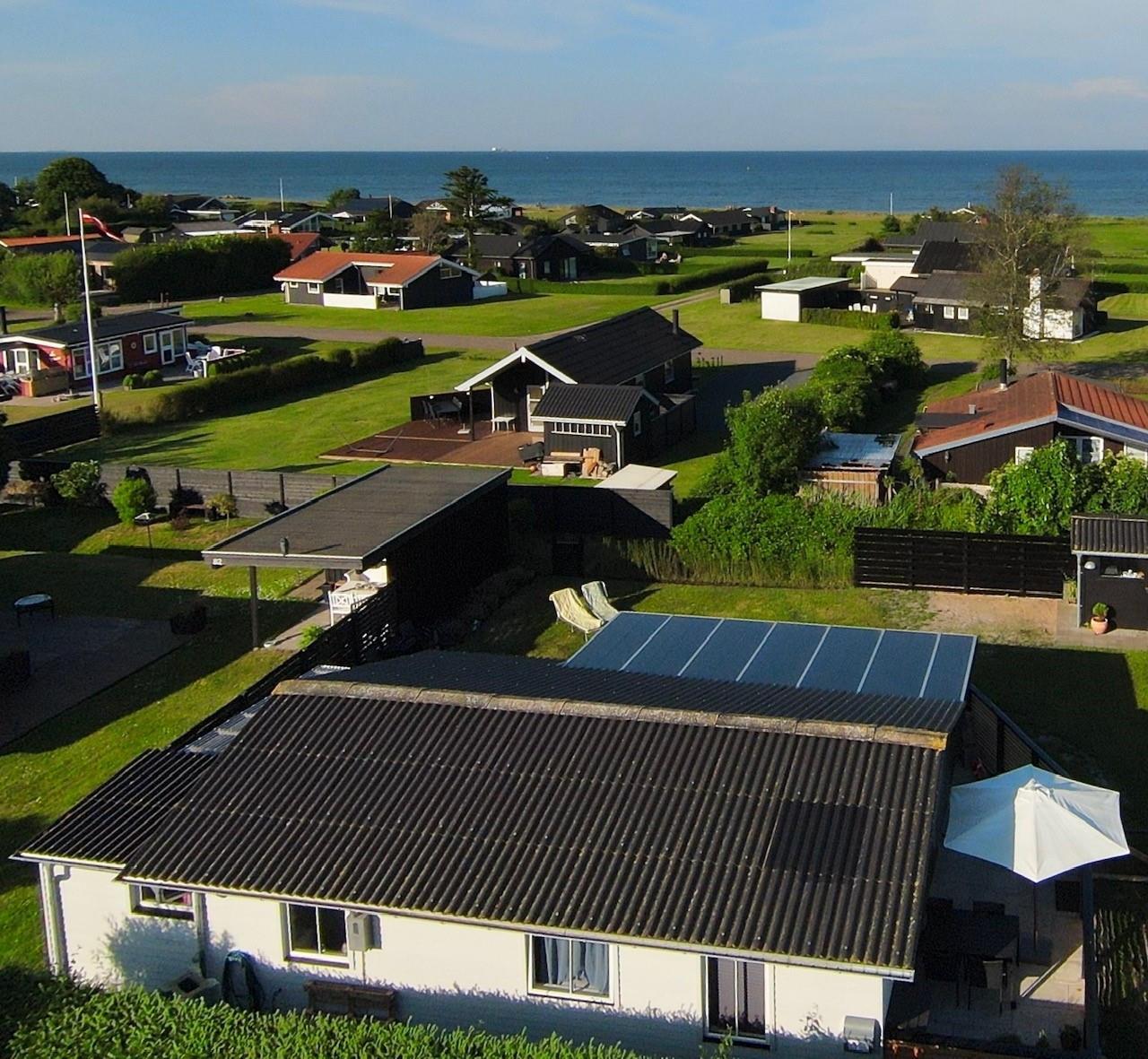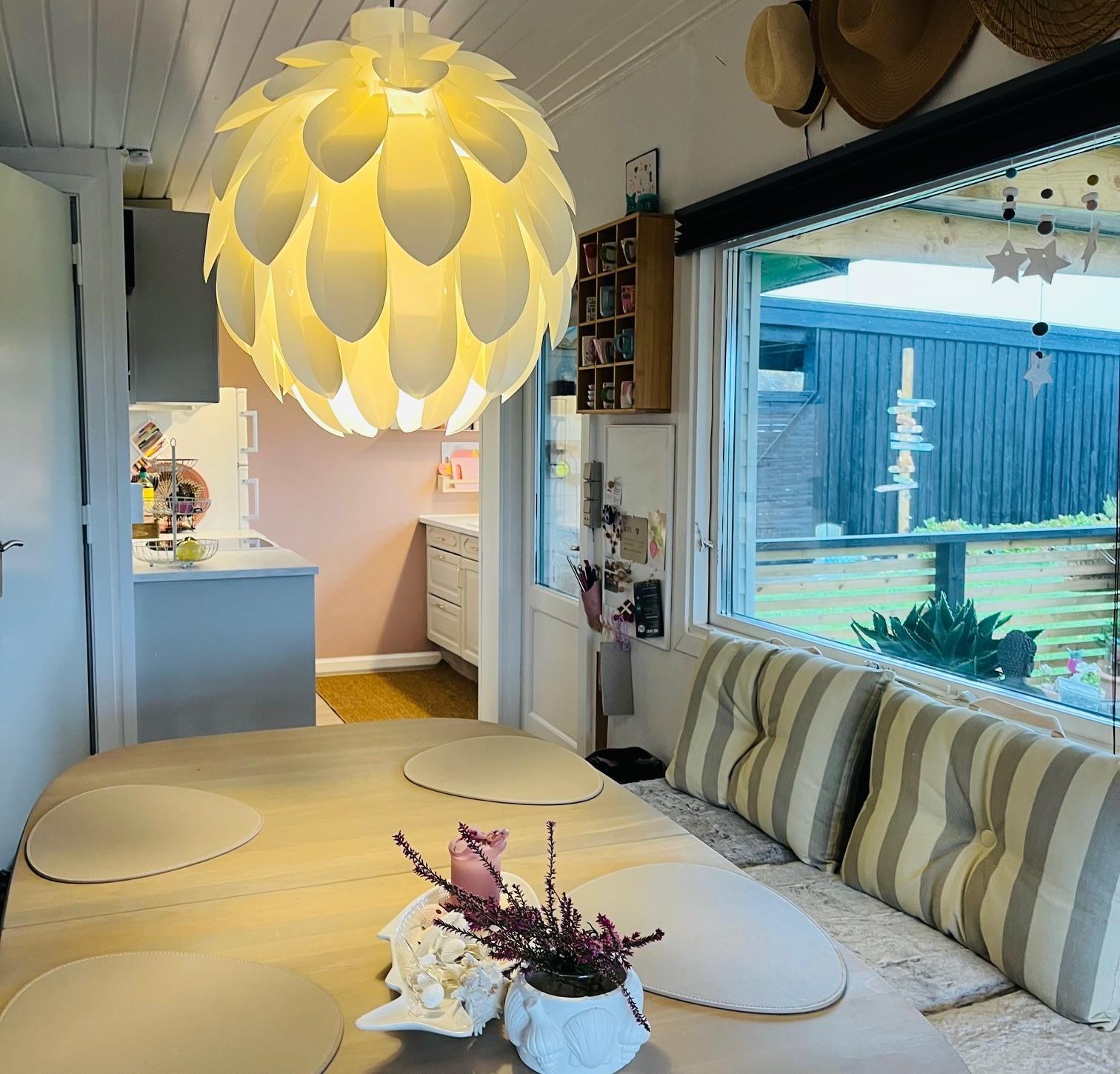 The house has a fully equipped kitchen where meals can be prepared while enjoying a sea view from the kitchen window. The kitchen is open to the living room, which features a dining area and a spacious corner sofa with a view of a large playing field available for free use. There is also a PlayStation 4 in the house with various games, as well as a selection of board games for fun and togetherness.