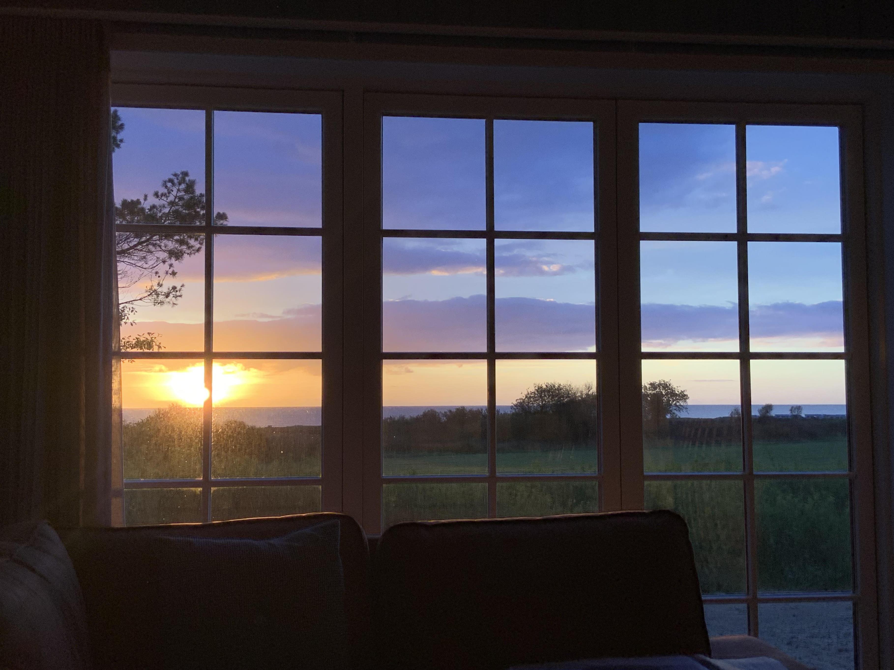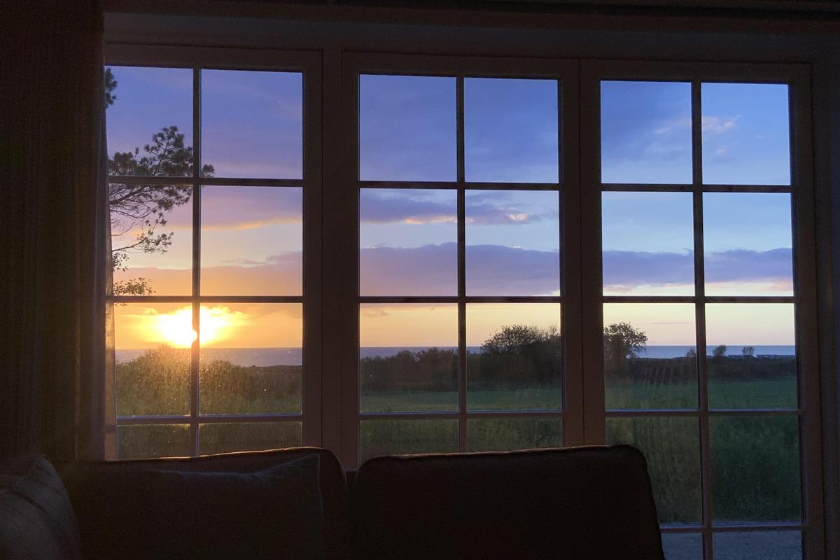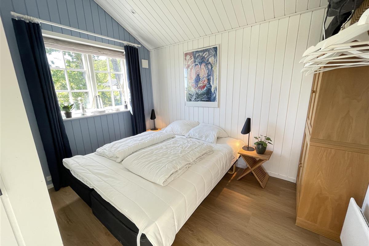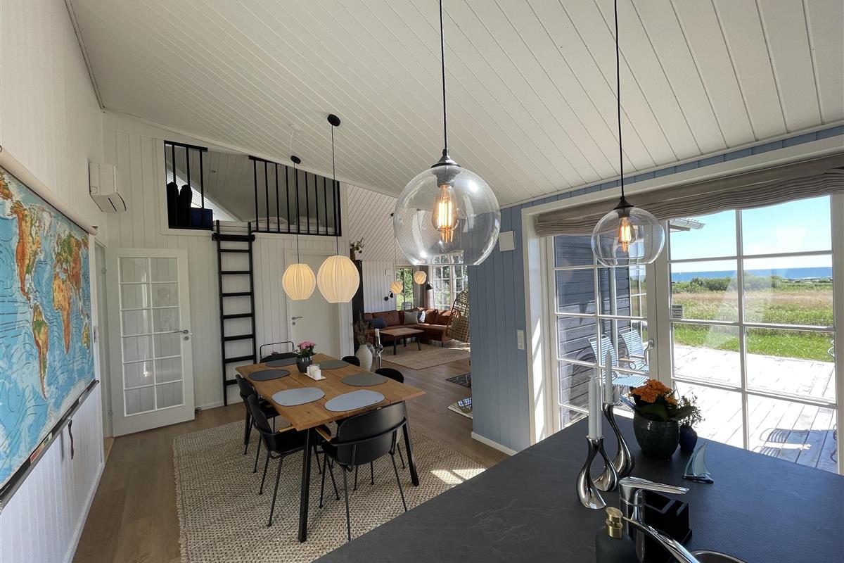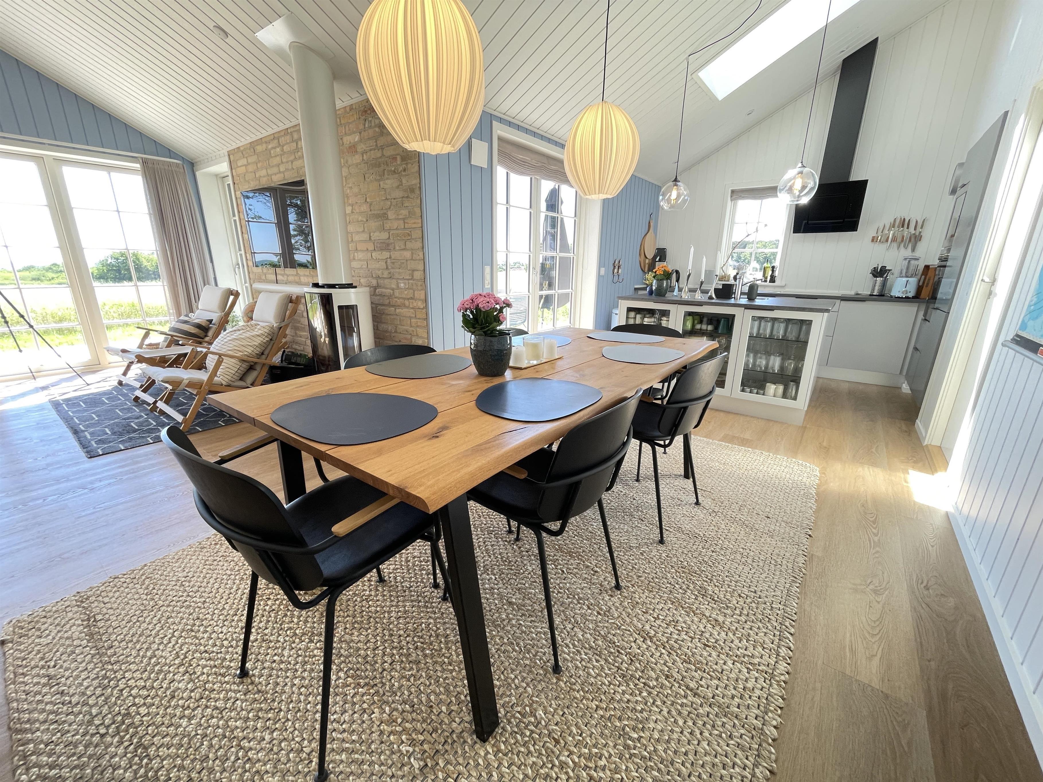 Upon arrival, you enter the large family room, where the kitchen, dining area and living room merge into one, providing guests with a spacious communal environment. Large windows open to spectacular views of the beautiful Kattegat, and natural light illuminates the exclusive and rustic décor of the living room. The large luxurious sofa invites you to cosy up with the wood-burning stove crackling and warming in the background.