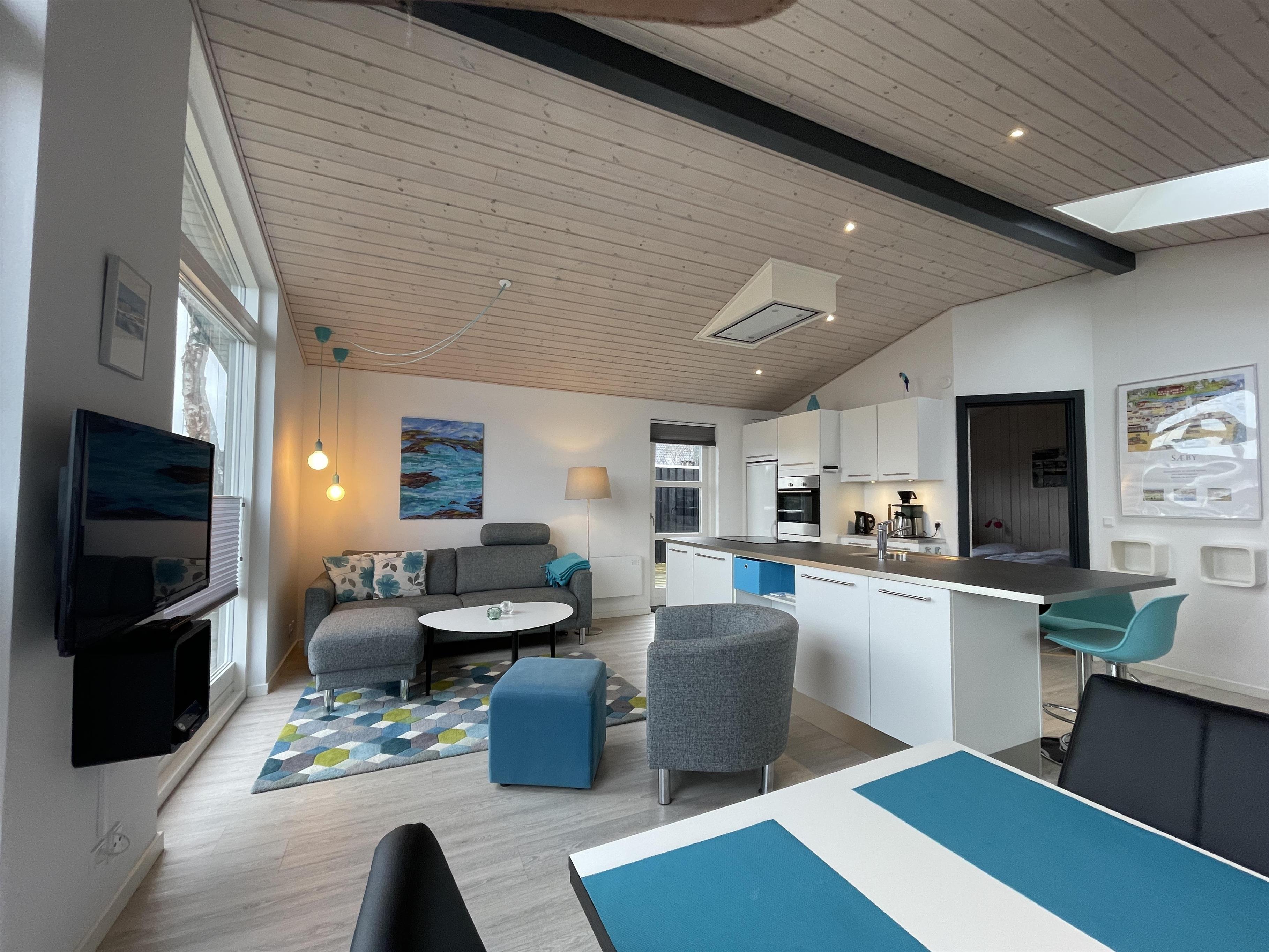 As you step into the house, you're greeted by a tastefully decorated open kitchen/dining area. This space features a cozy dining area by the kitchen counter and an elegant separate dining table. The open layout is adorned with large windows that let the light flood in and offer a stunning view of the Kattegat, creating a bright and inviting atmosphere.