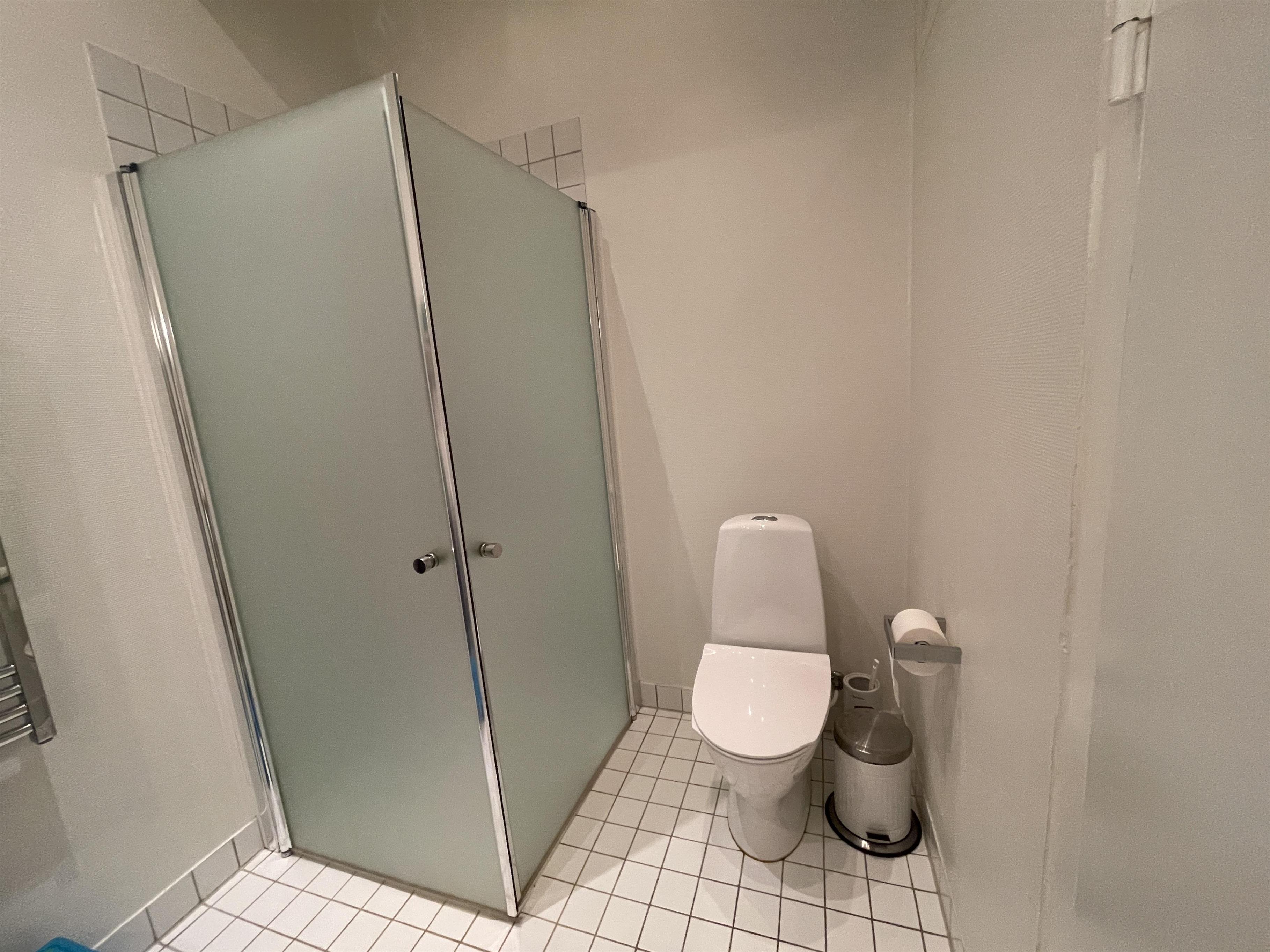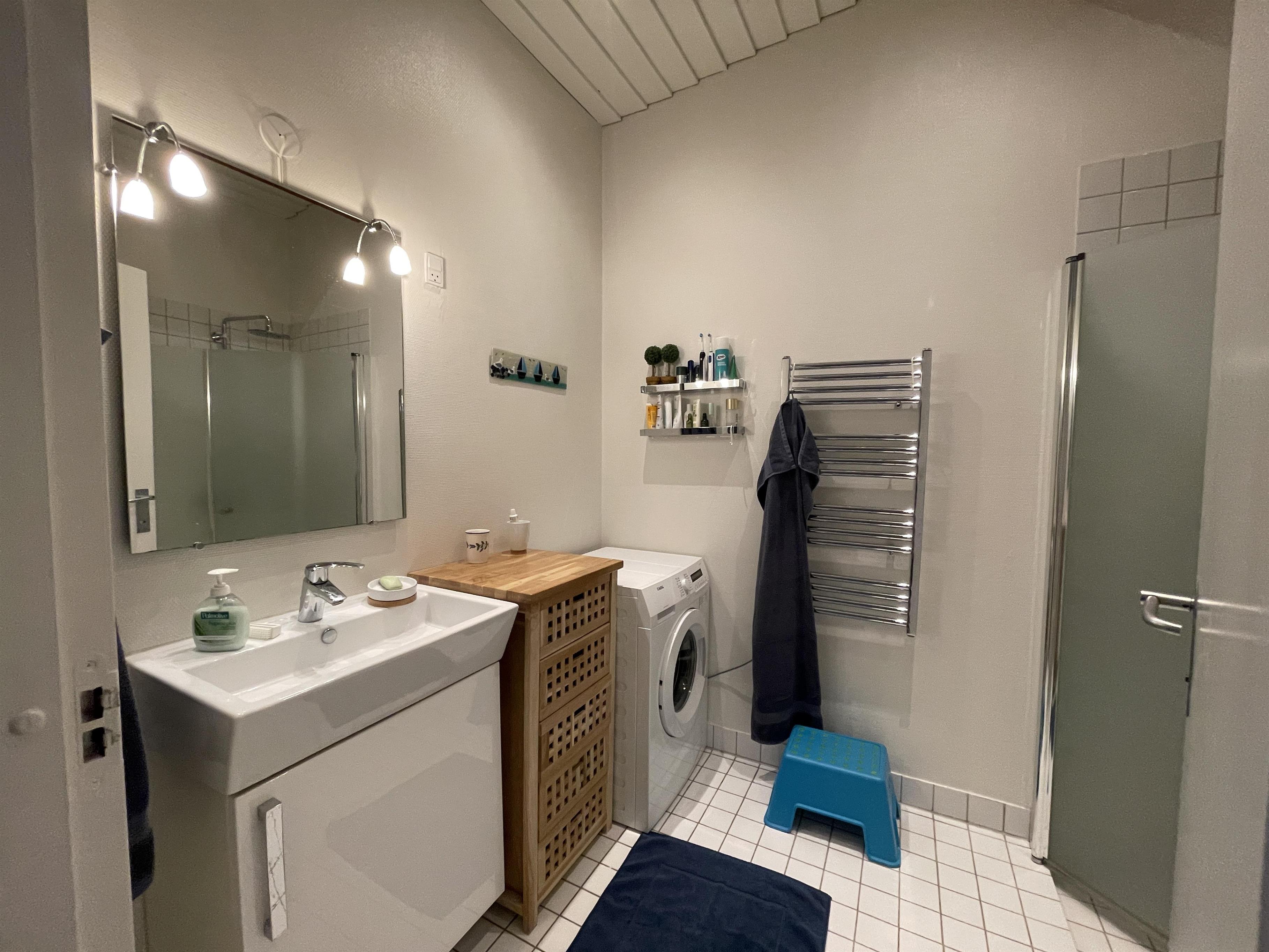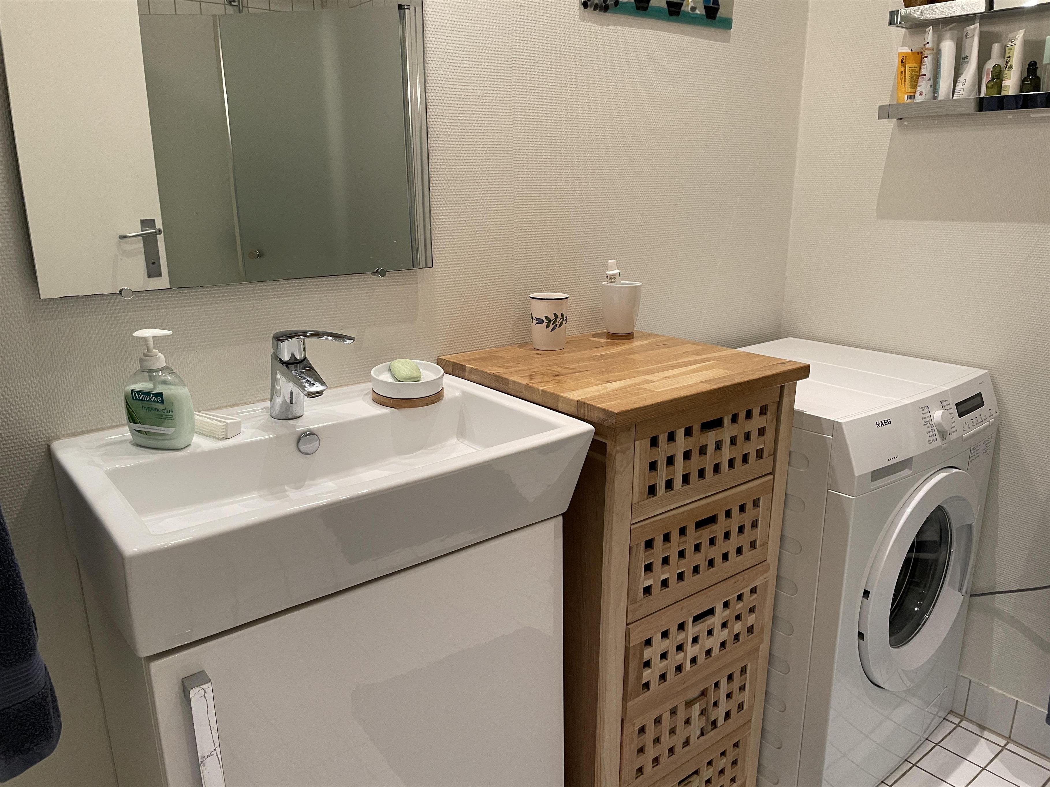 From the kitchen, you have access to a hallway that leads to both bedrooms and to a nice and spacious bathroom with a large shower room with a top-hung luxury shower and smart cabin doors that can be pushed inwards in the shower room, giving extra space in the bathroom at times other than bath time. In the bathroom is a washing machine.
