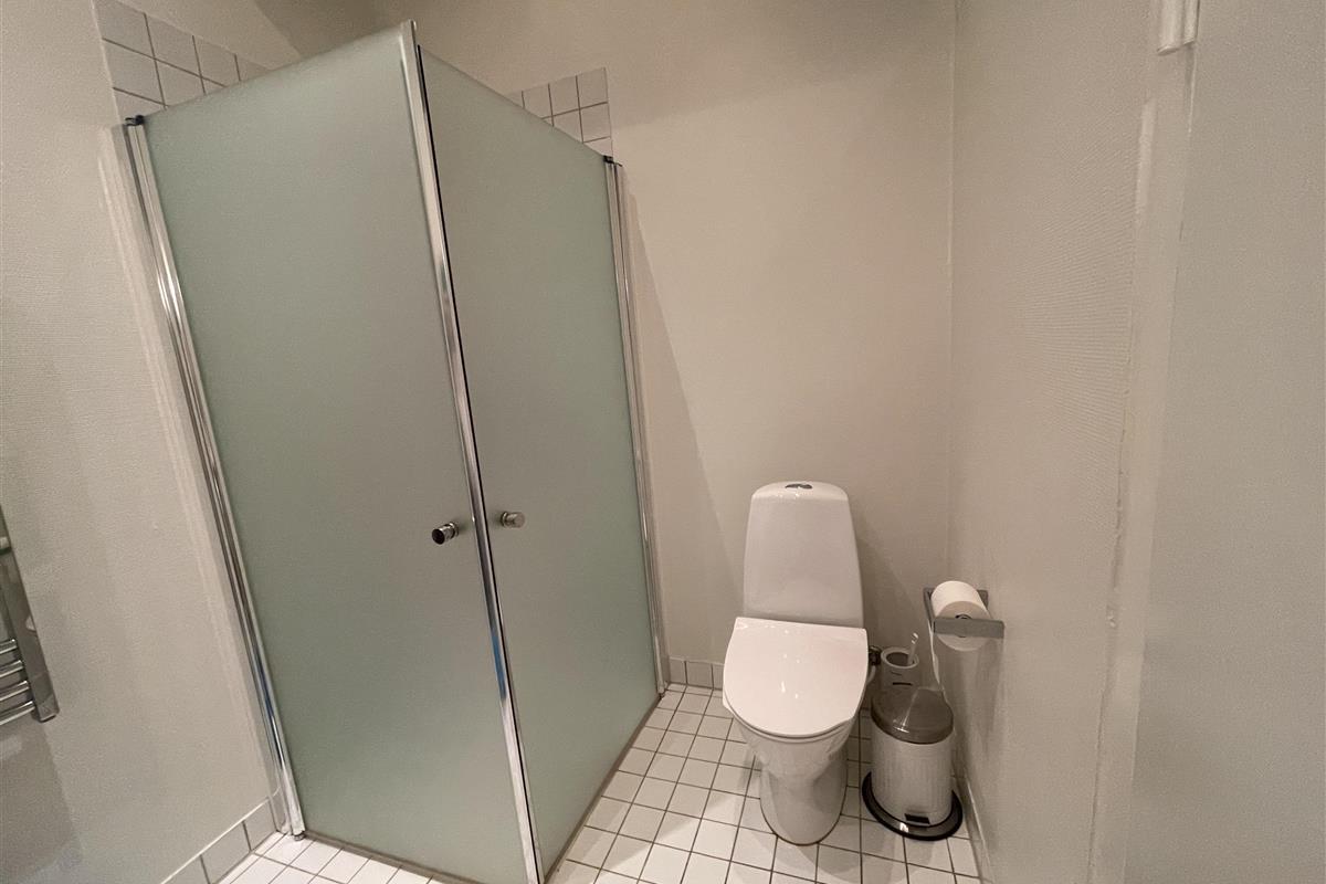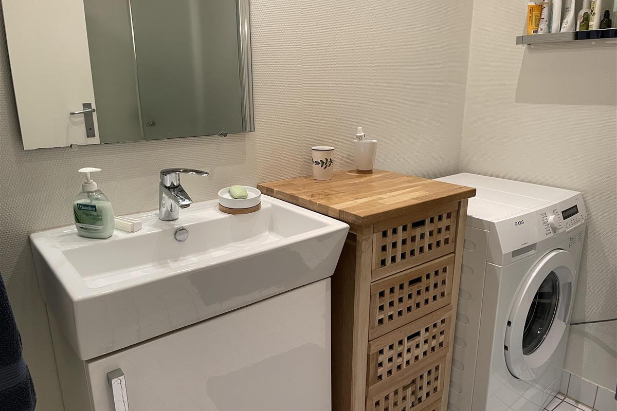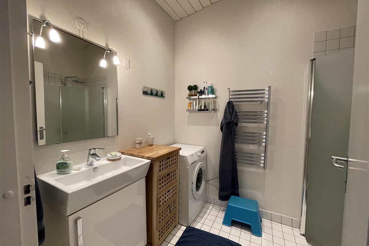 From the kitchen, you have access to a hallway that leads to both bedrooms and to a nice and spacious bathroom with a large shower room with a top-hung luxury shower and smart cabin doors that can be pushed inwards in the shower room, giving extra space in the bathroom at times other than bath time. In the bathroom is a washing machine.
