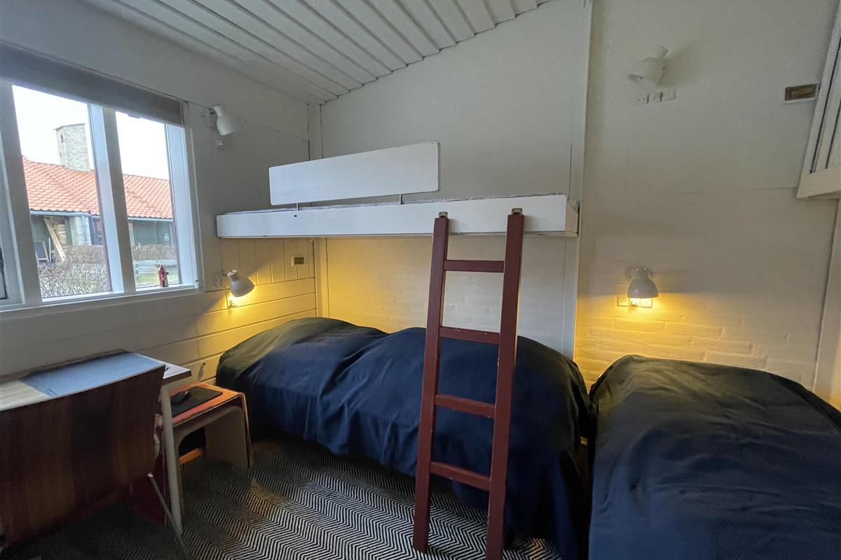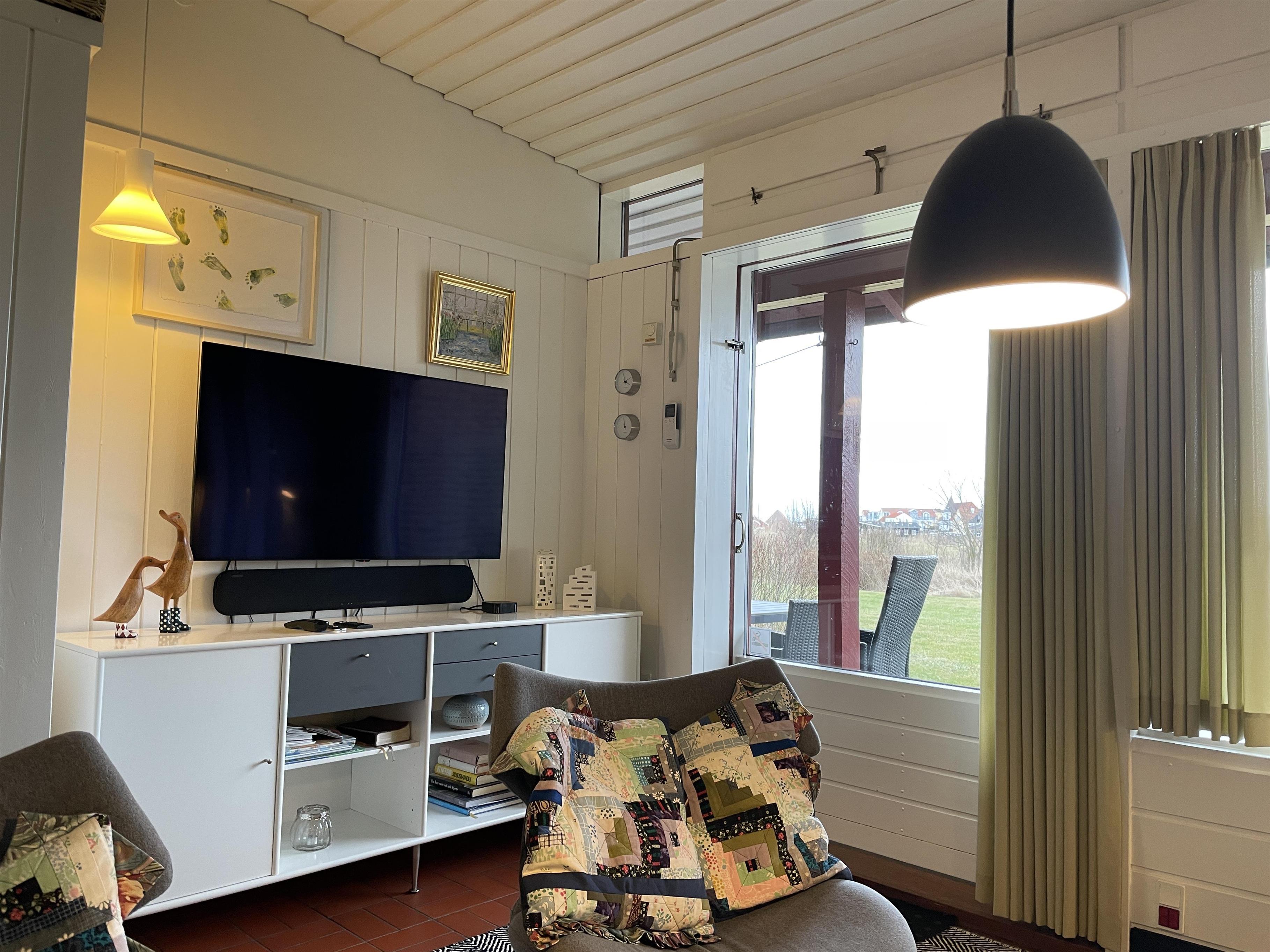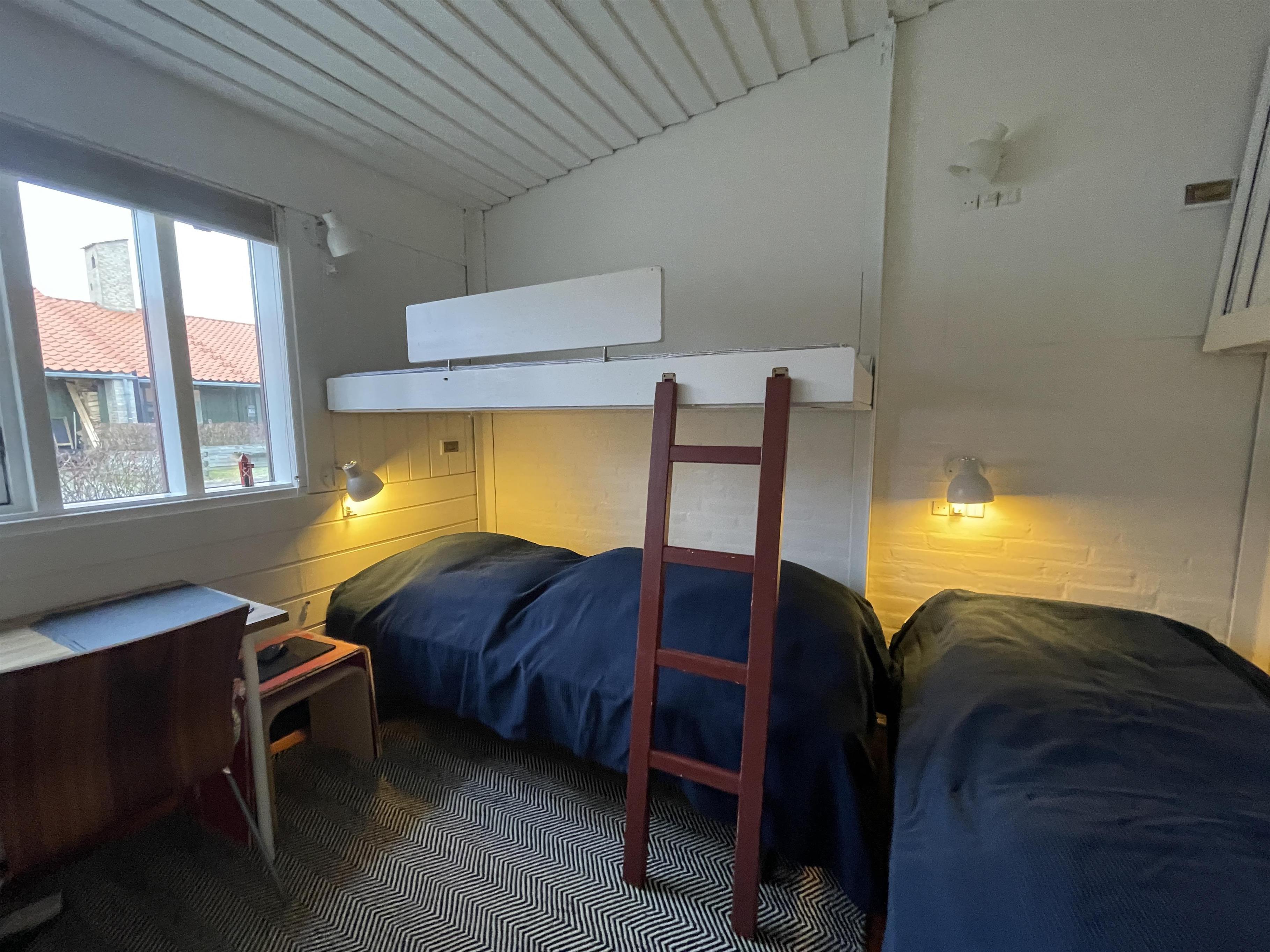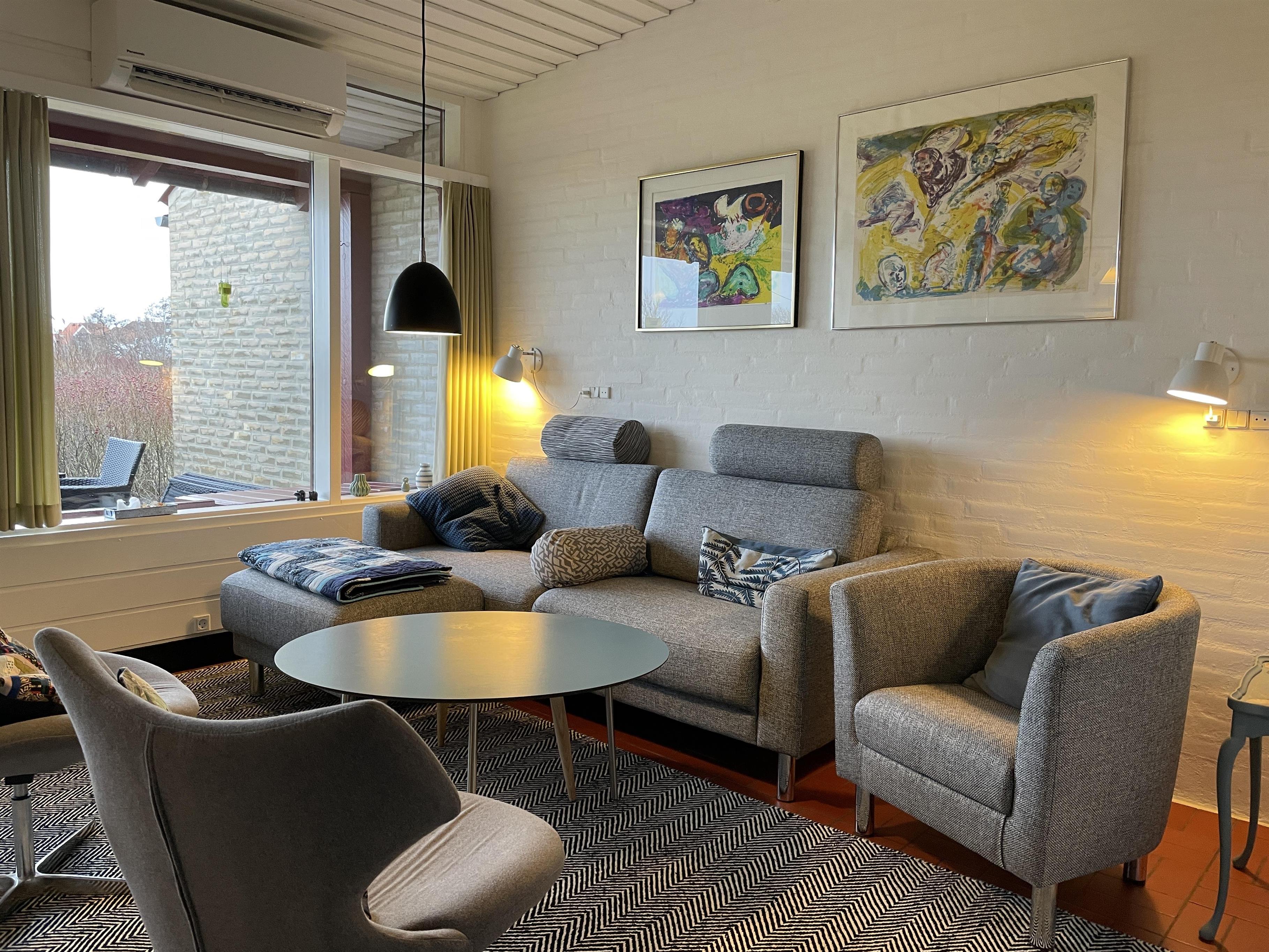 This holiday home located in the Sæby Søbad holiday centre is decorated with many beautiful architectural details and smart solutions. The ceiling is tilted, and the rooms are divided by windows at the top, which not only looks great but also provides light and lightness between the rooms. The home is designed for 6 people. One room is a bedroom with a good double bed, and the other is a room that can be flexibly arranged with the number of beds (2-4 beds) needed. There are 2 fixed single beds and 2 bunk beds that can be flipped up and down as needed. This is a detail that allows the room to be utilised optimally. The bedroom has plenty of closet space.