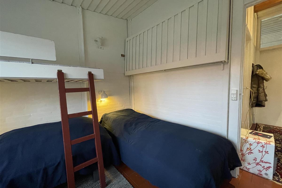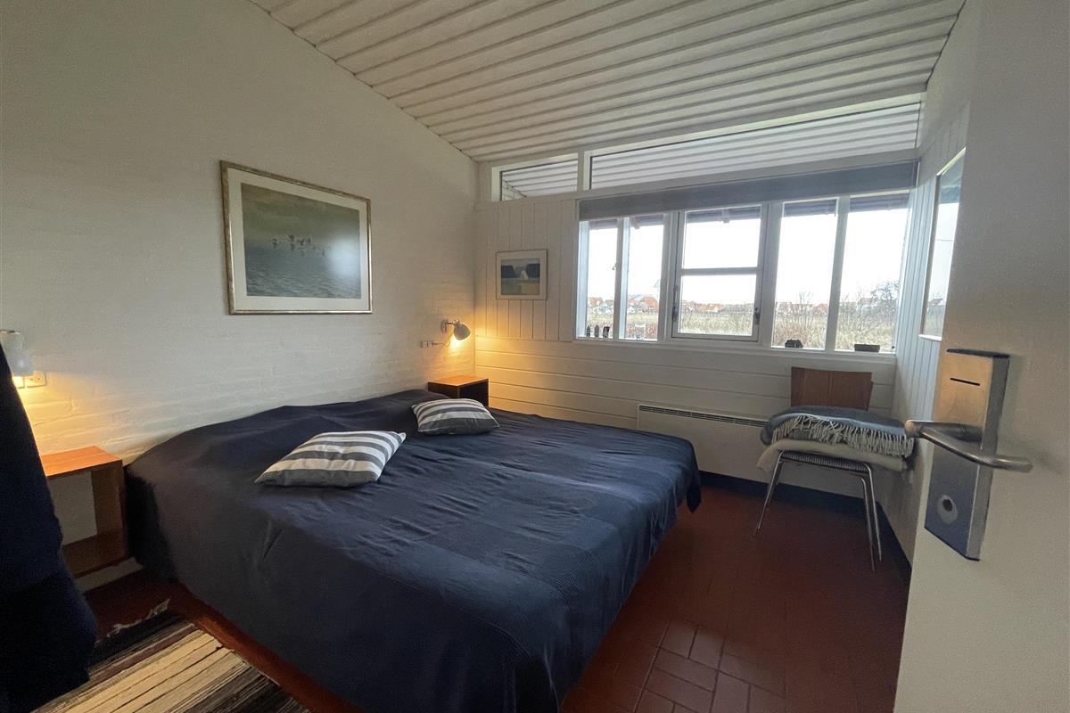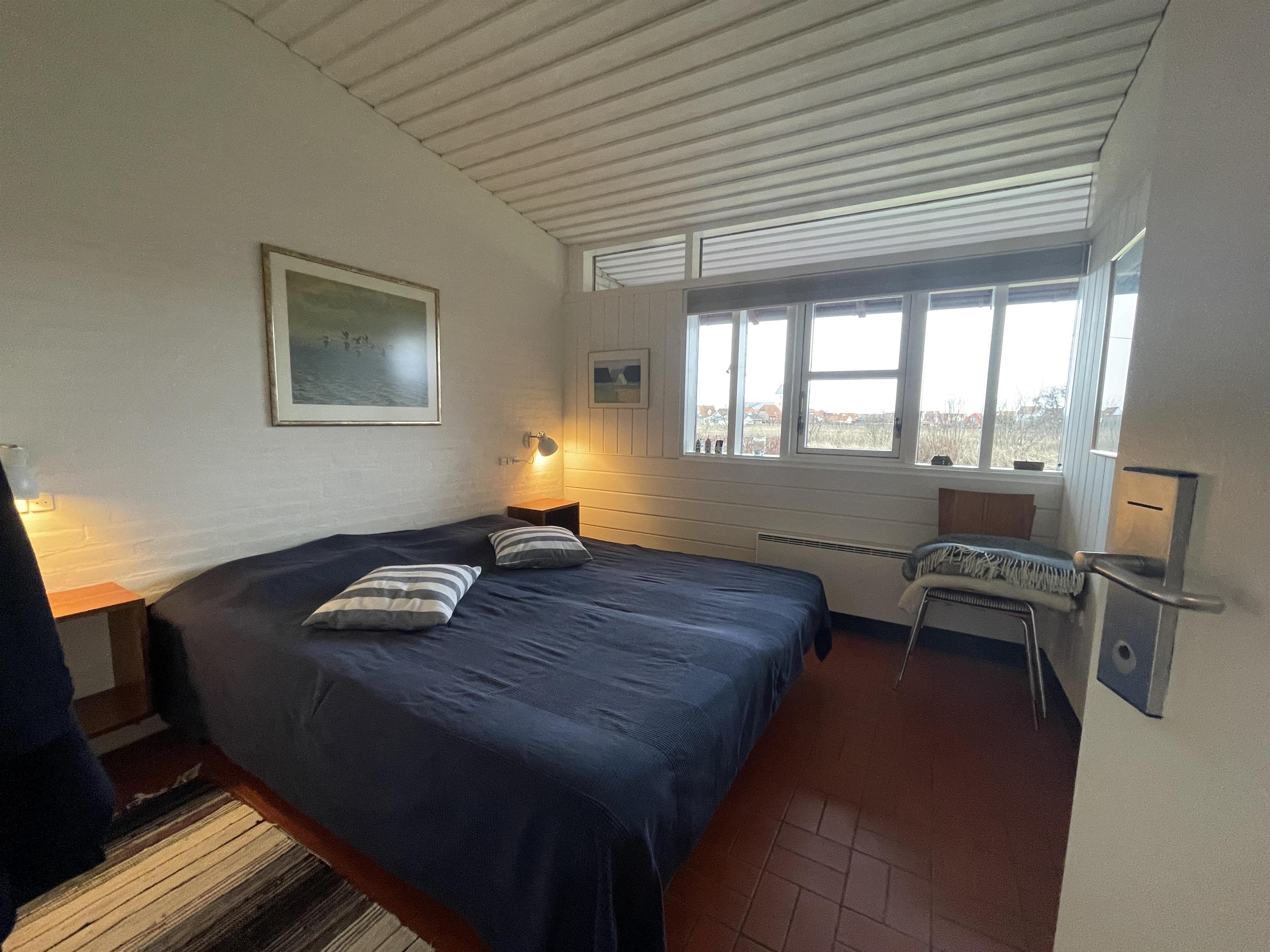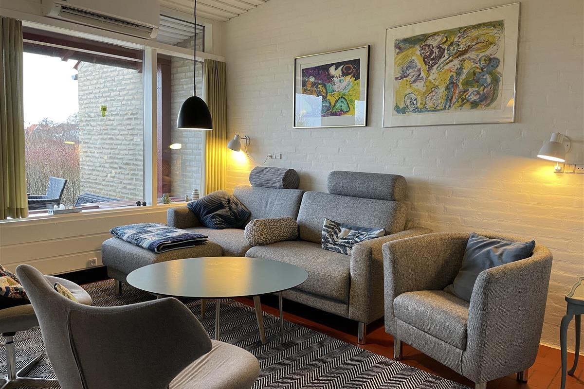 This holiday home located in the Sæby Søbad holiday centre is decorated with many beautiful architectural details and smart solutions. The ceiling is tilted, and the rooms are divided by windows at the top, which not only looks great but also provides light and lightness between the rooms. The home is designed for 6 people. One room is a bedroom with a good double bed, and the other is a room that can be flexibly arranged with the number of beds (2-4 beds) needed. There are 2 fixed single beds and 2 bunk beds that can be flipped up and down as needed. This is a detail that allows the room to be utilised optimally. The bedroom has plenty of closet space.