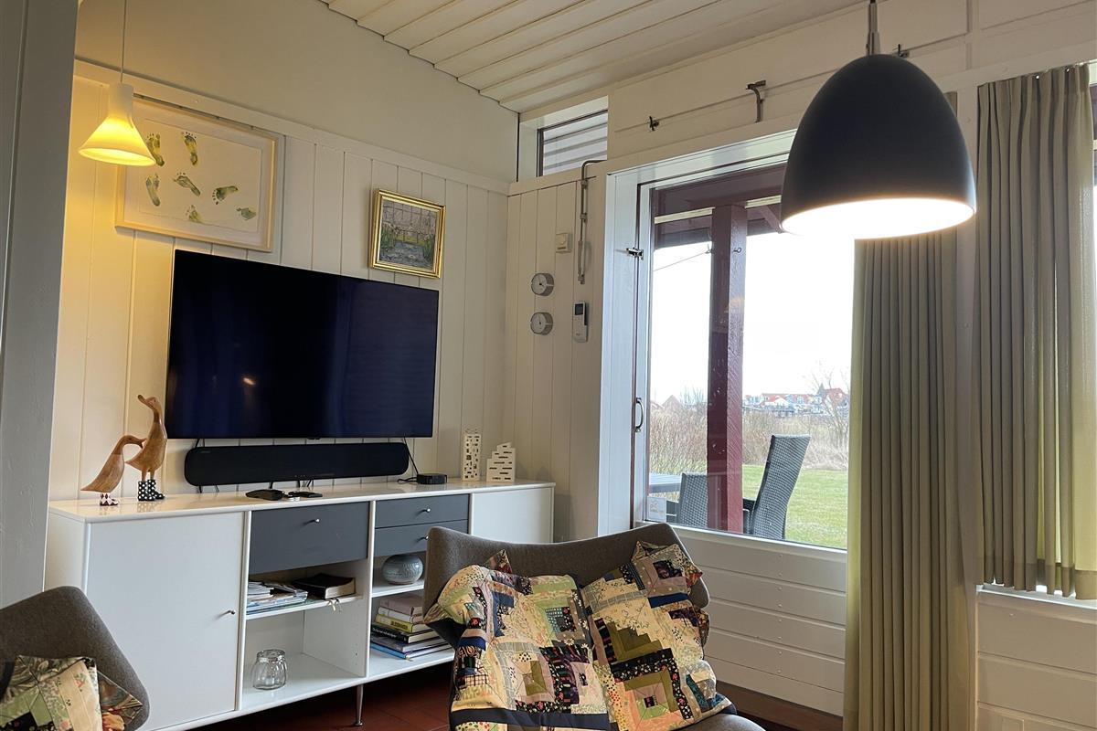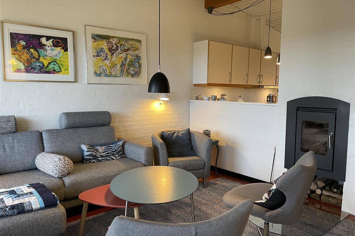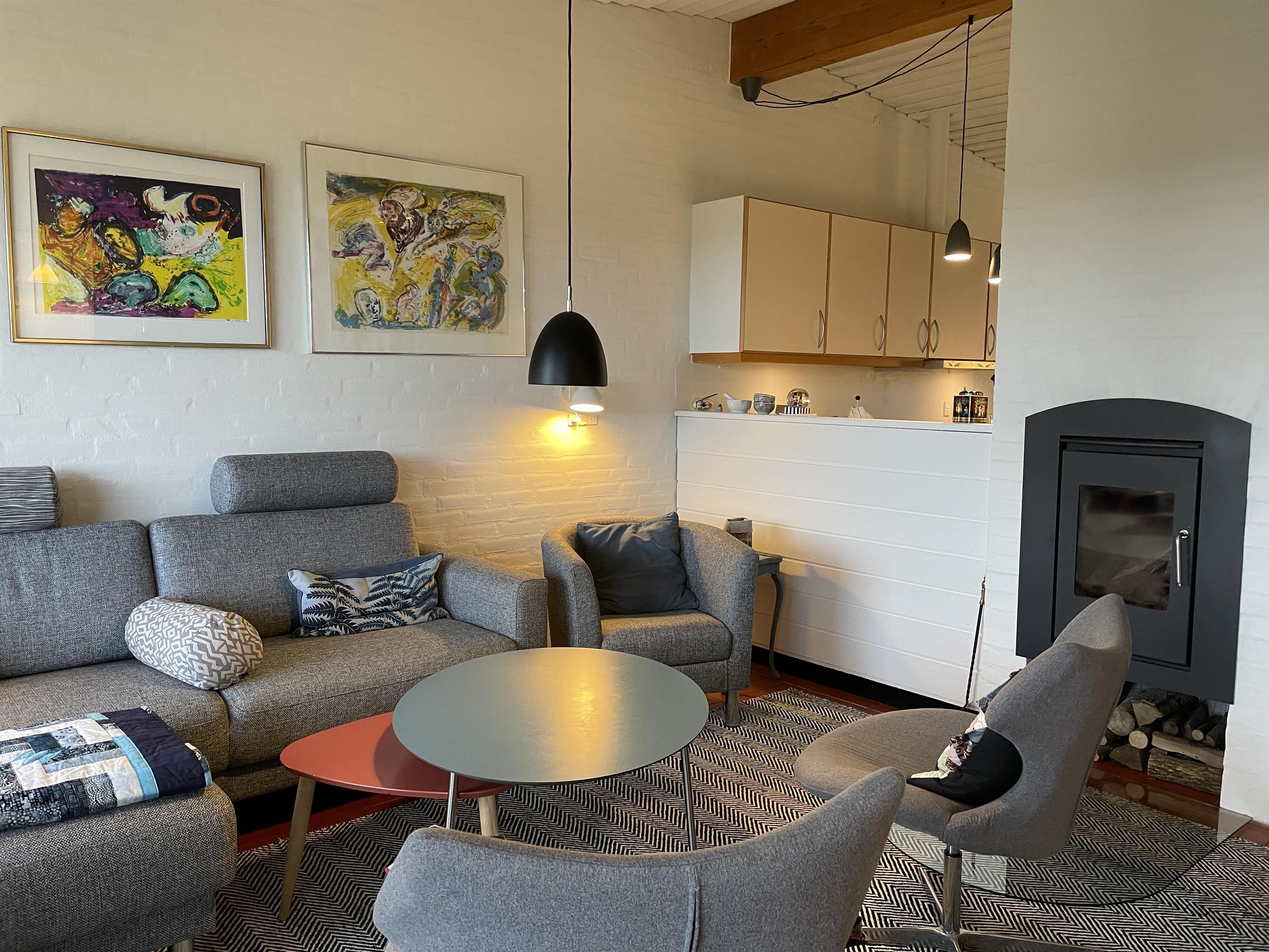 Part of the wall between the kitchen and living room has been opened to allow for cosiness and conversation wherever you are. The living room is smartly furnished with a beautiful sofa and armchairs. There is also a built-in fireplace for extra cosiness on chilly summer evenings.