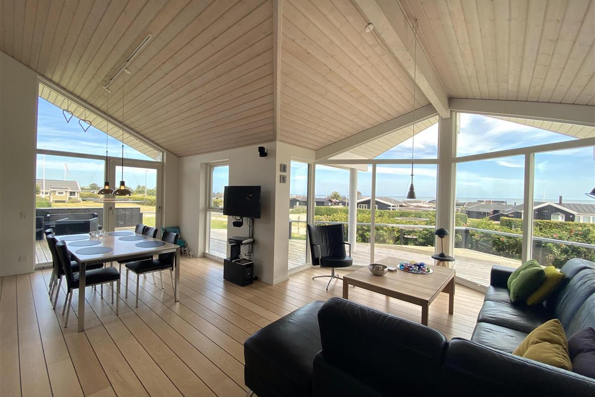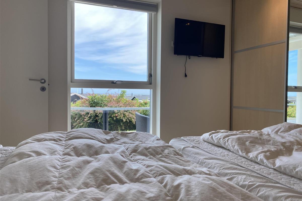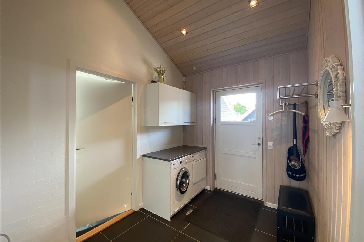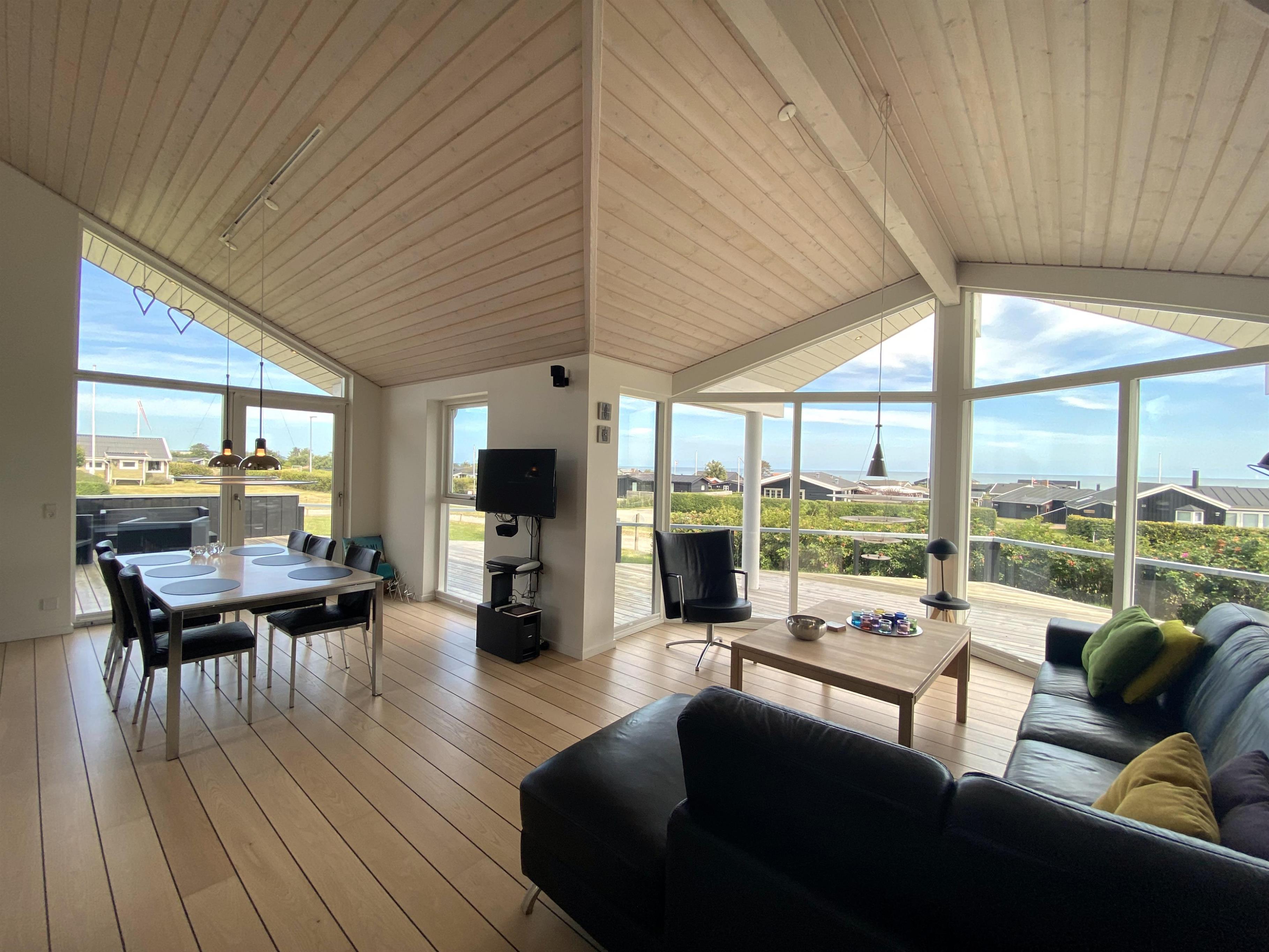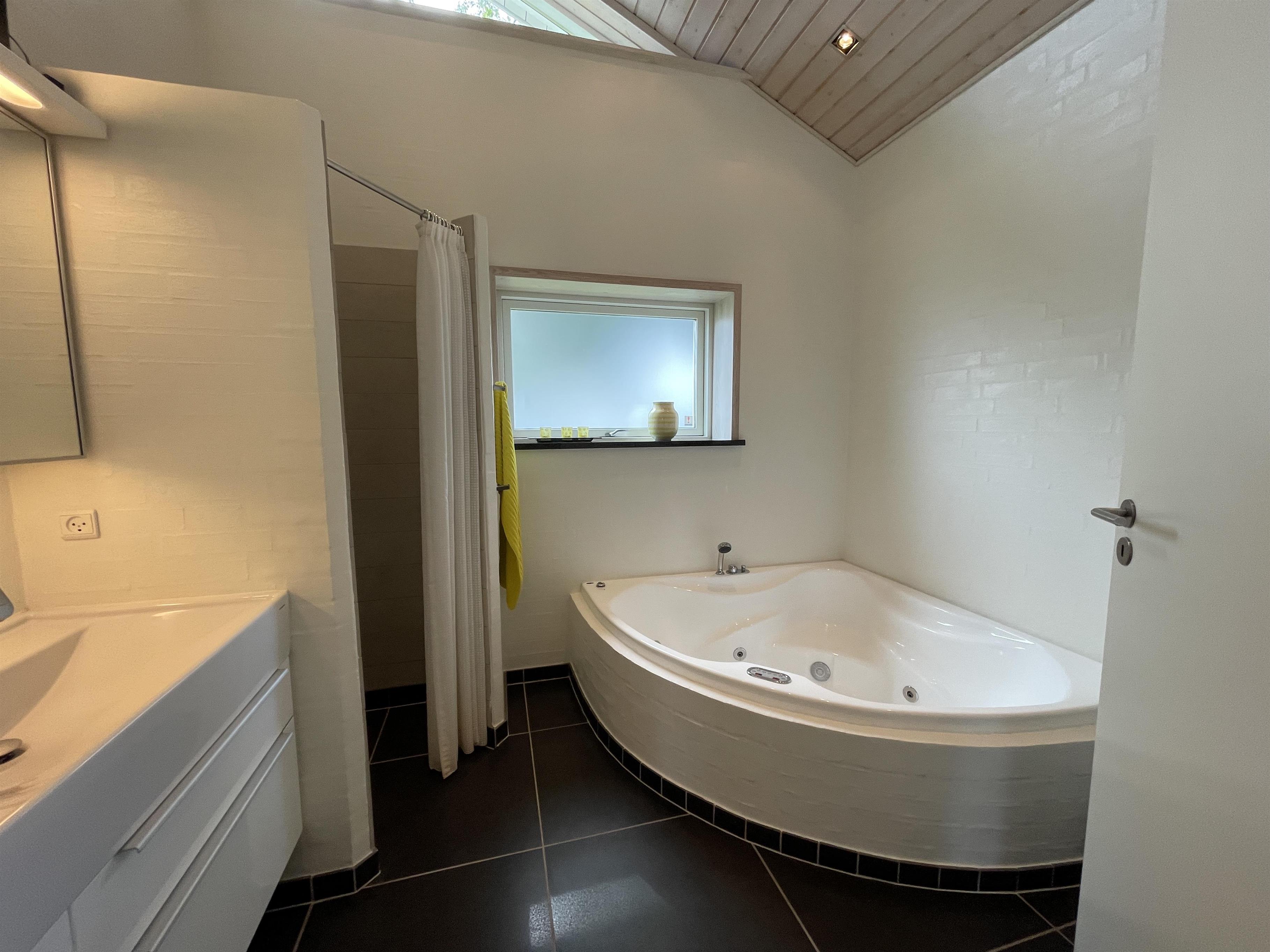 The kitchen, dining area, and living room are designed as a large, open space from which you can enjoy a breathtaking view of the Kattegat. From the sofa, you can admire the beautiful panorama, see Frederikshavn on the horizon, and follow the ship traffic. The kitchen is top modern with an impressive granite countertop and all the necessary kitchen equipment. There's also a Quooker installed, providing boiling water instantly. In the annex, you'll find an extra fridge with a freezer, ideal for additional storage. The bathroom is bright and elegant with large drawers and a wonderful spa bath, where you can relax after a day full of activities.