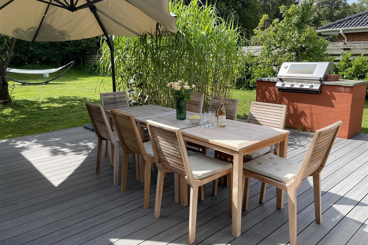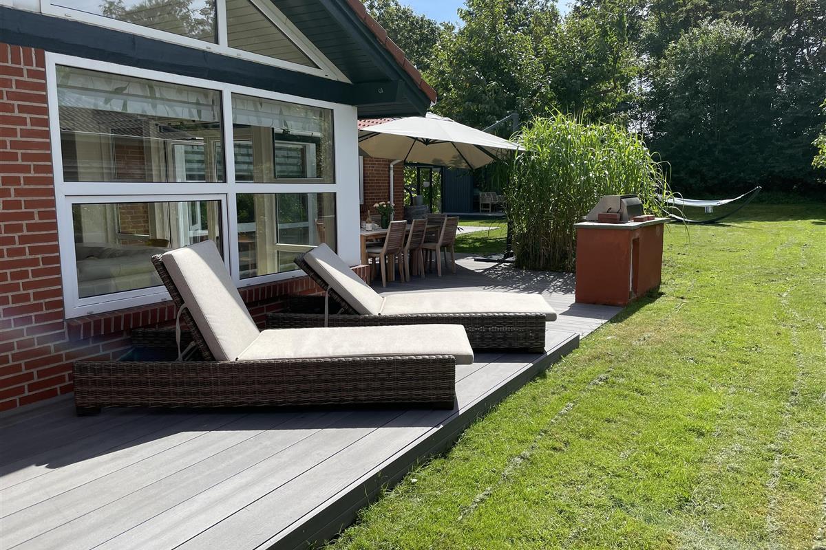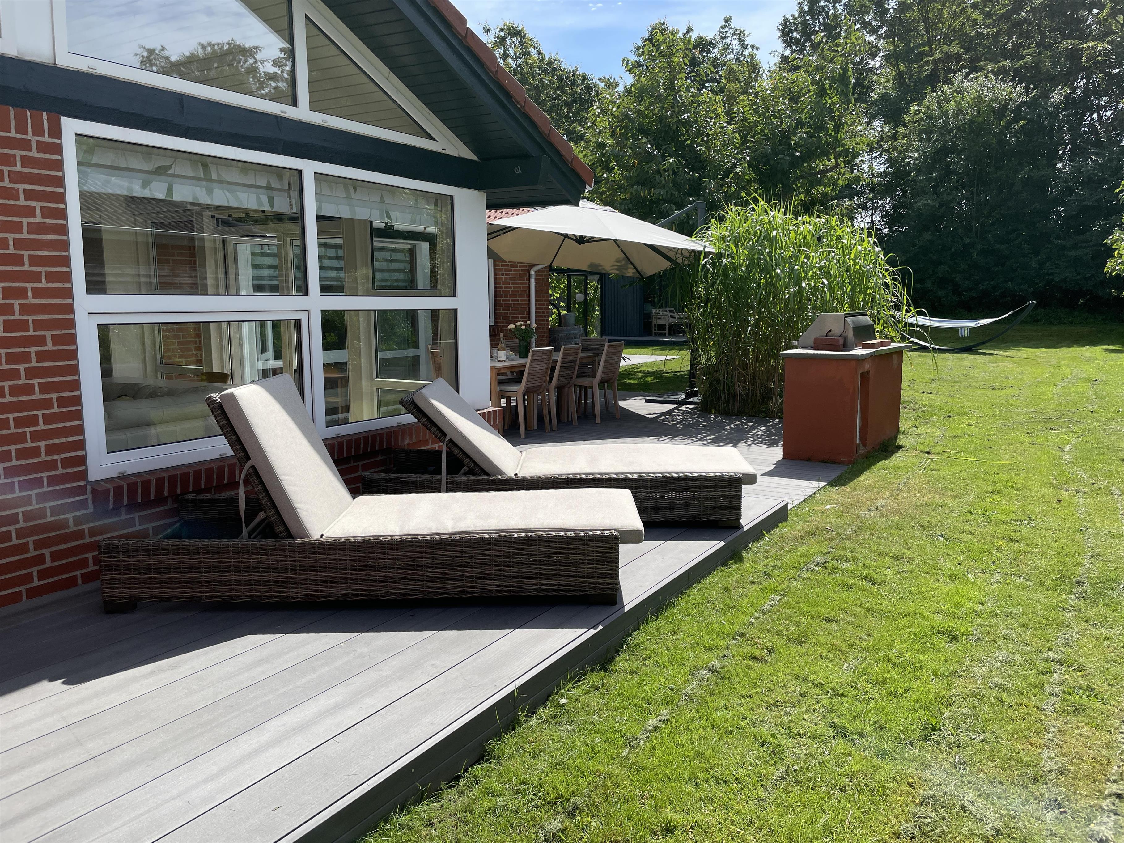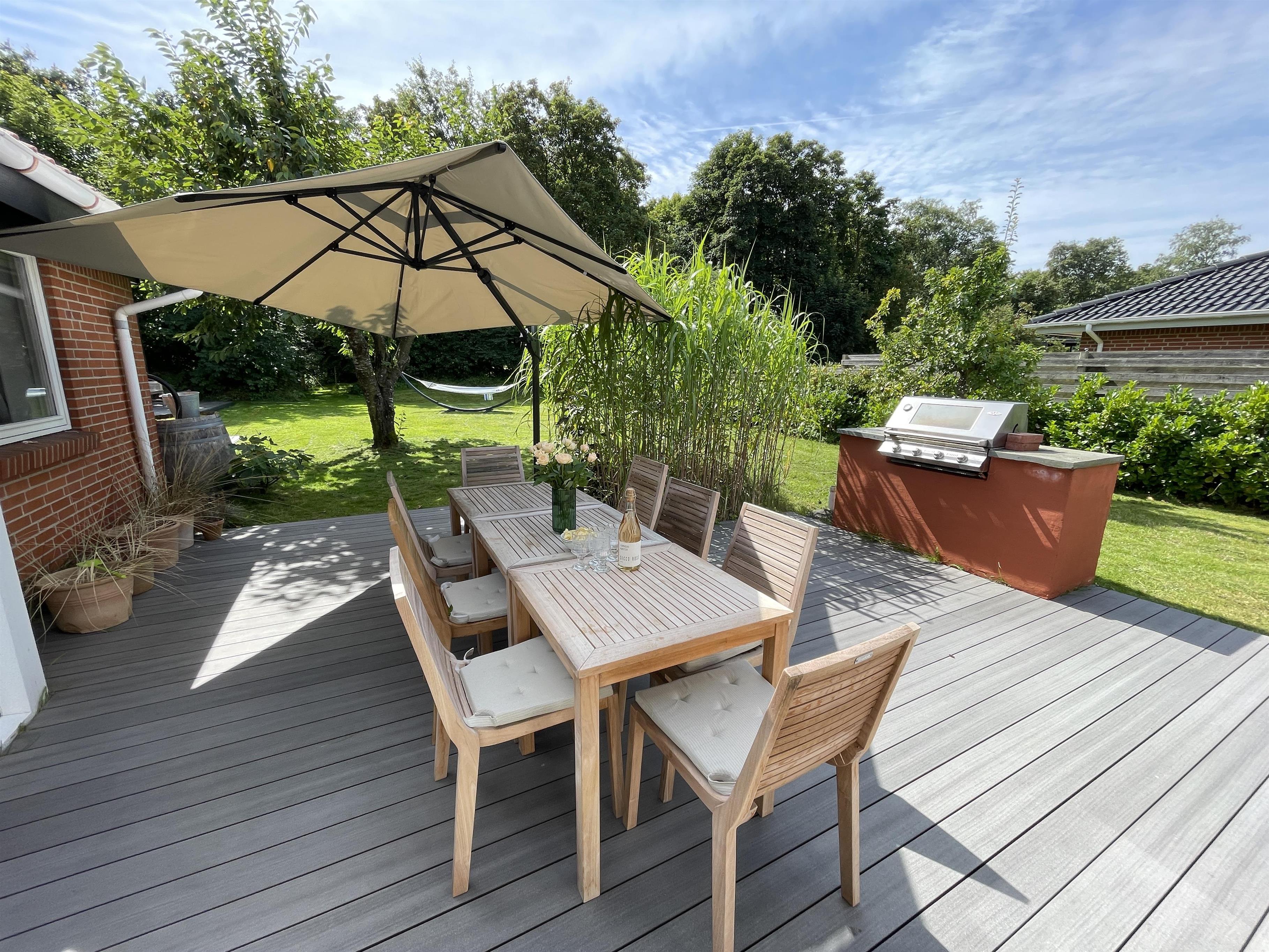 Outside there is a lovely west-facing and secluded wooden terrace sheltered by the forest. There is a built-in garden grill and an outdoor kitchen. On the terrace, you can enjoy outdoor life at the garden table or lying on the two luxurious sun loungers. There is also a huge garden parasol that can be turned over the dining table. All the furniture is of very good quality, and it is a fantastic place to enjoy the good summer days and evenings.