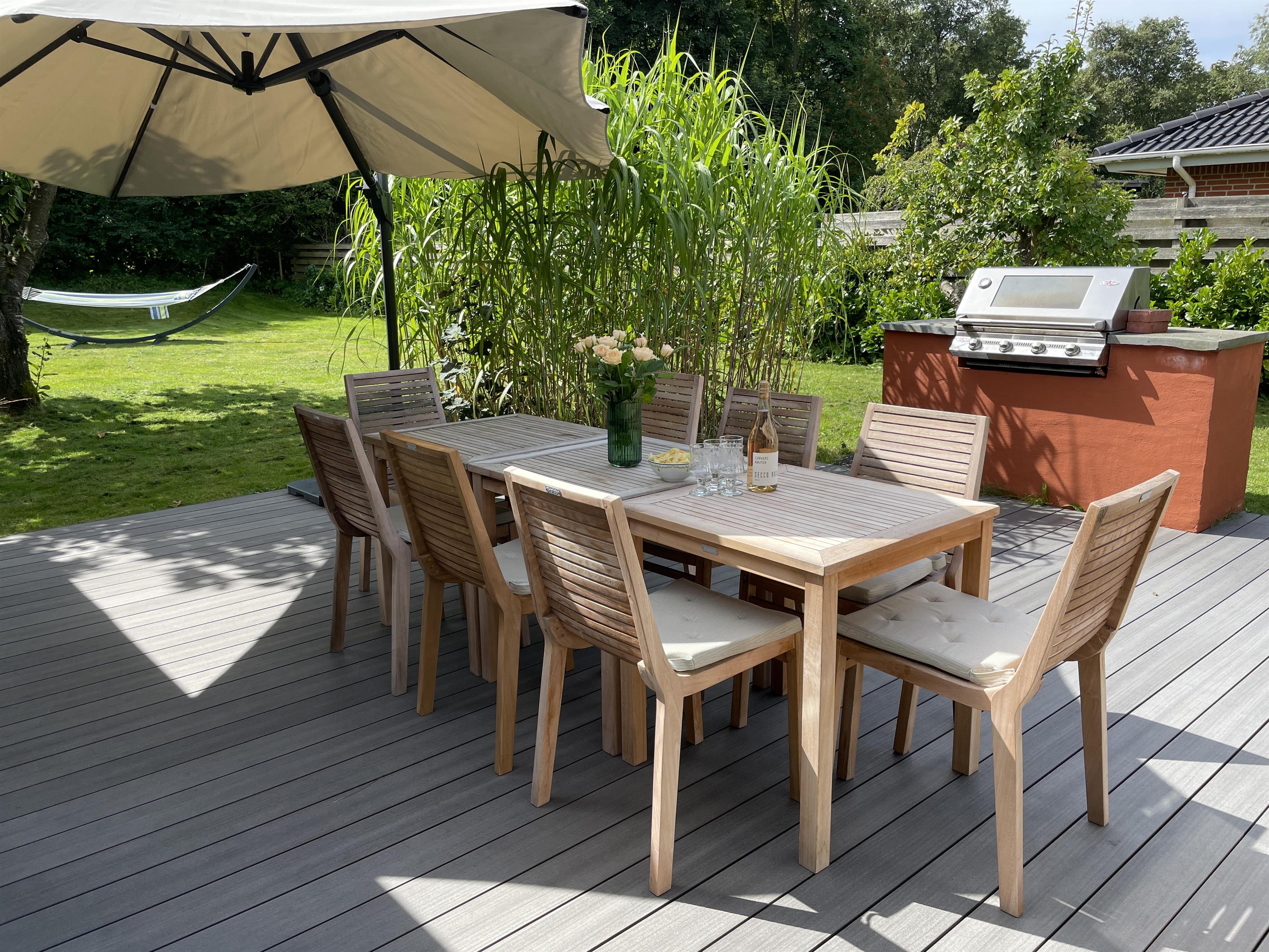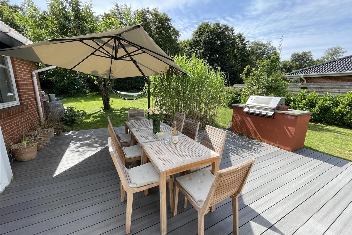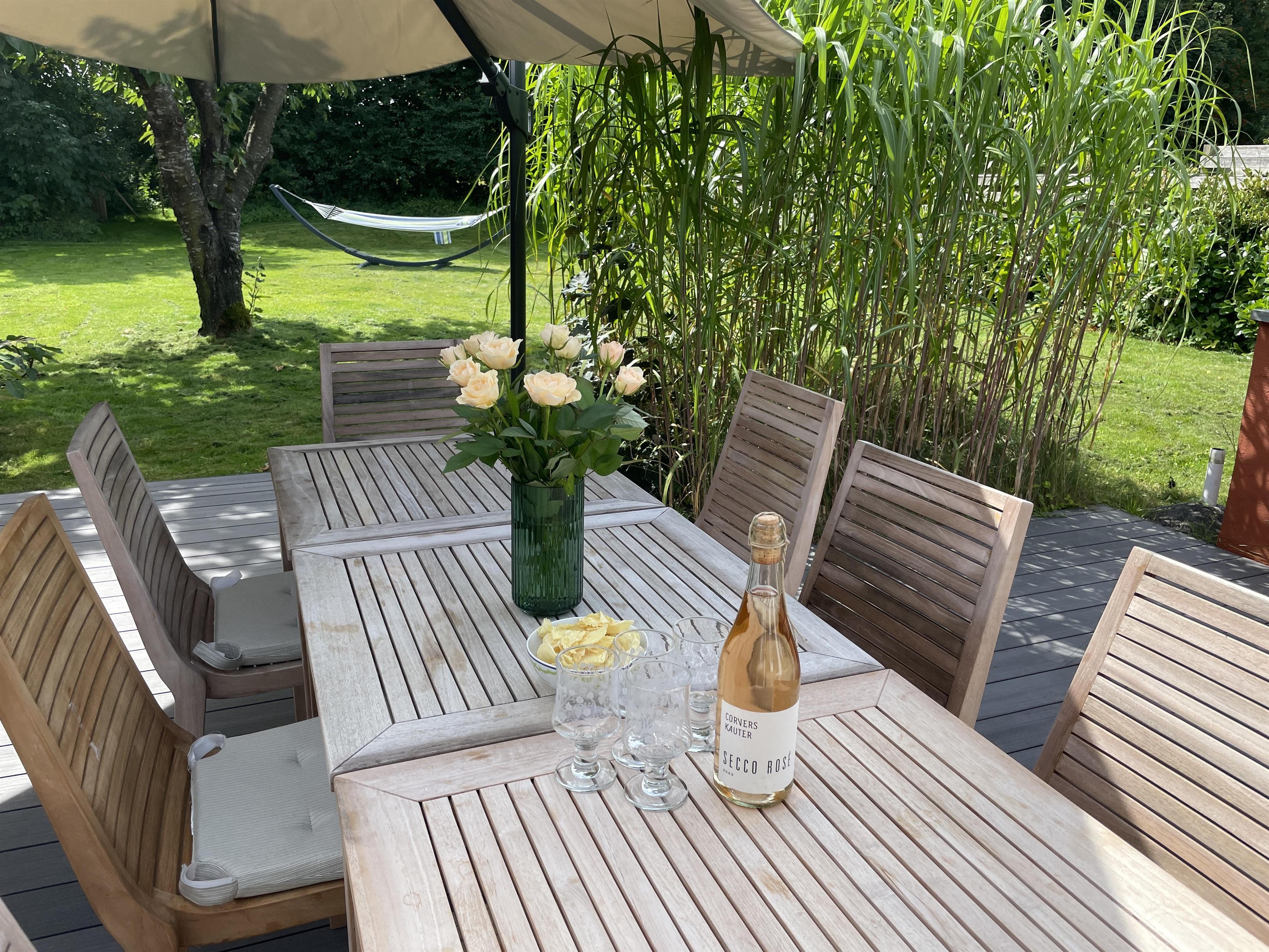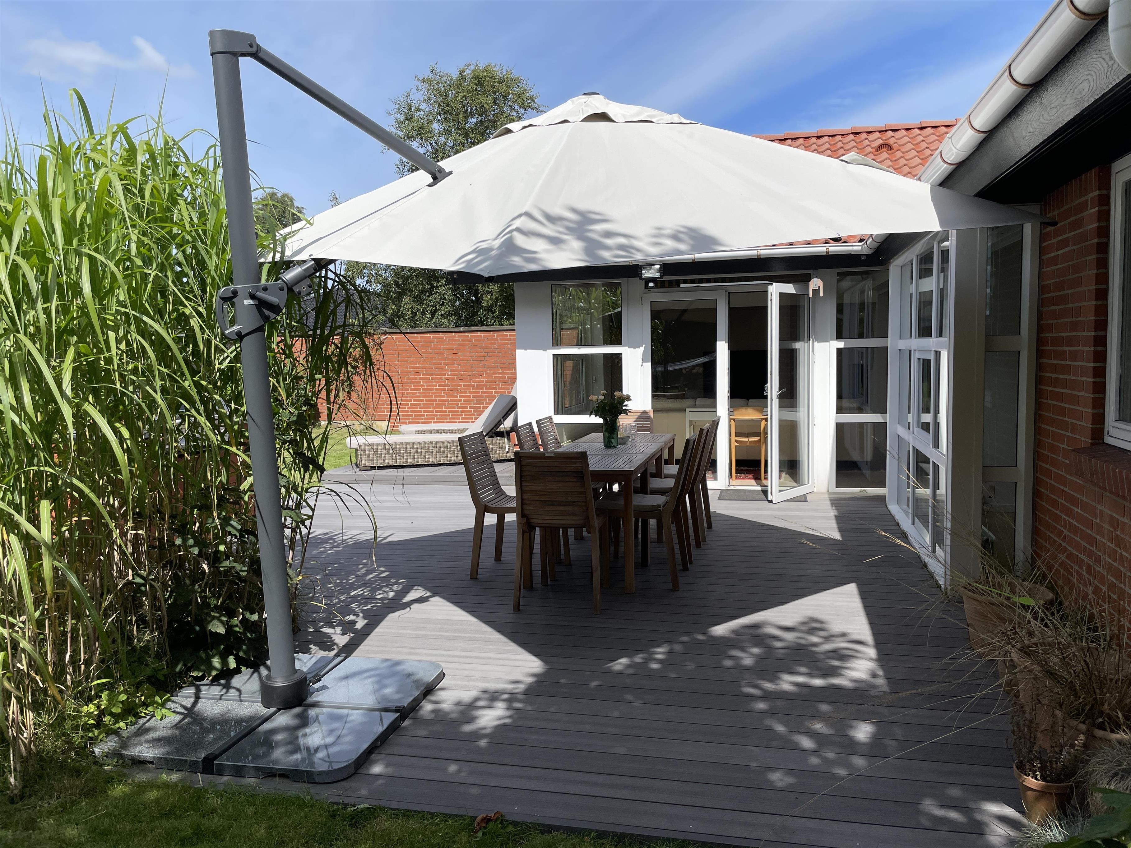 Outside there is a lovely west-facing and secluded wooden terrace sheltered by the forest. There is a built-in garden grill and an outdoor kitchen. On the terrace, you can enjoy outdoor life at the garden table or lying on the two luxurious sun loungers. There is also a huge garden parasol that can be turned over the dining table. All the furniture is of very good quality, and it is a fantastic place to enjoy the good summer days and evenings.