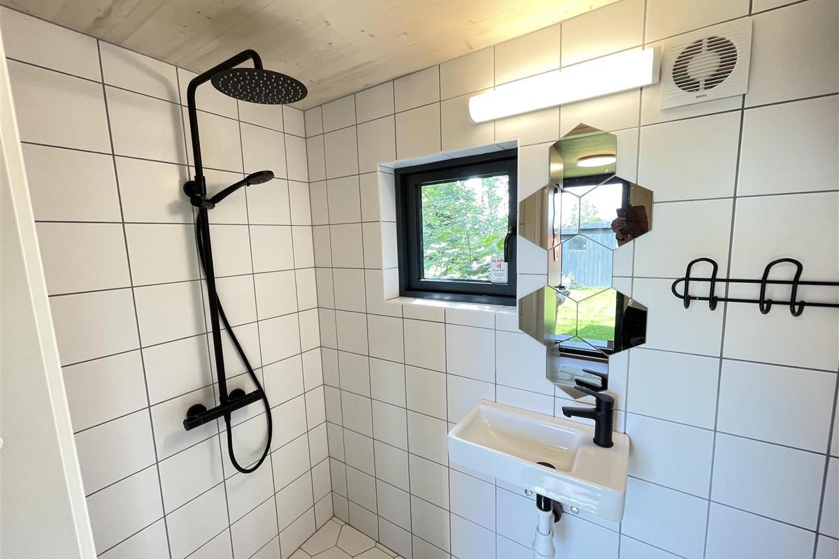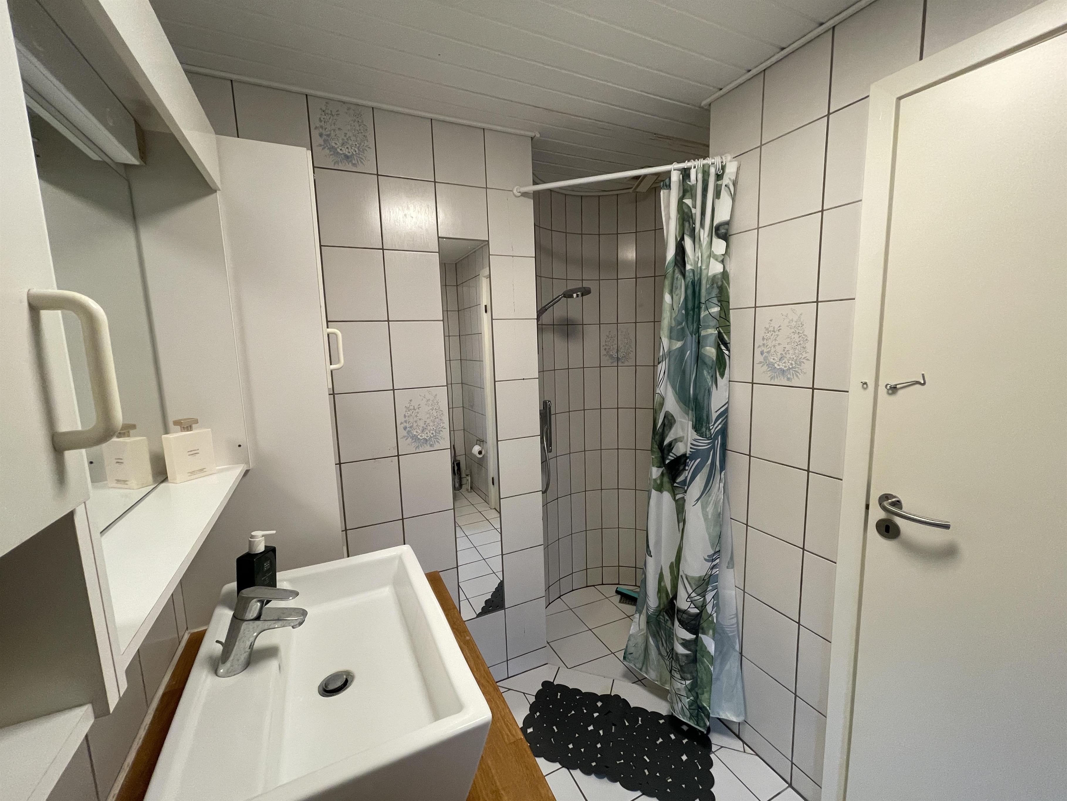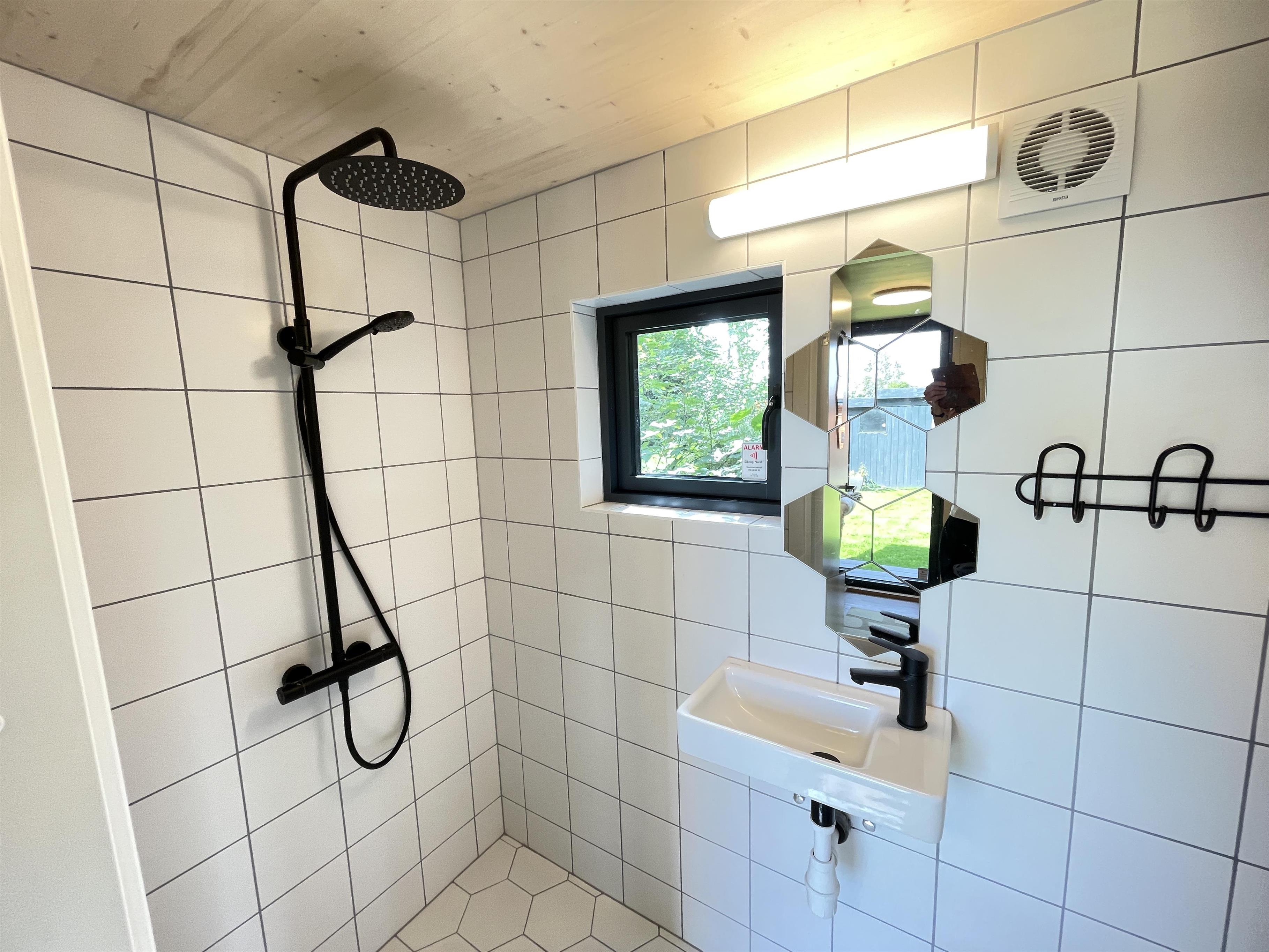 The bathroom in the house is very nice with light tiles. Here you can enjoy both the start and end of the day and use the large, round shower when you bathe.
