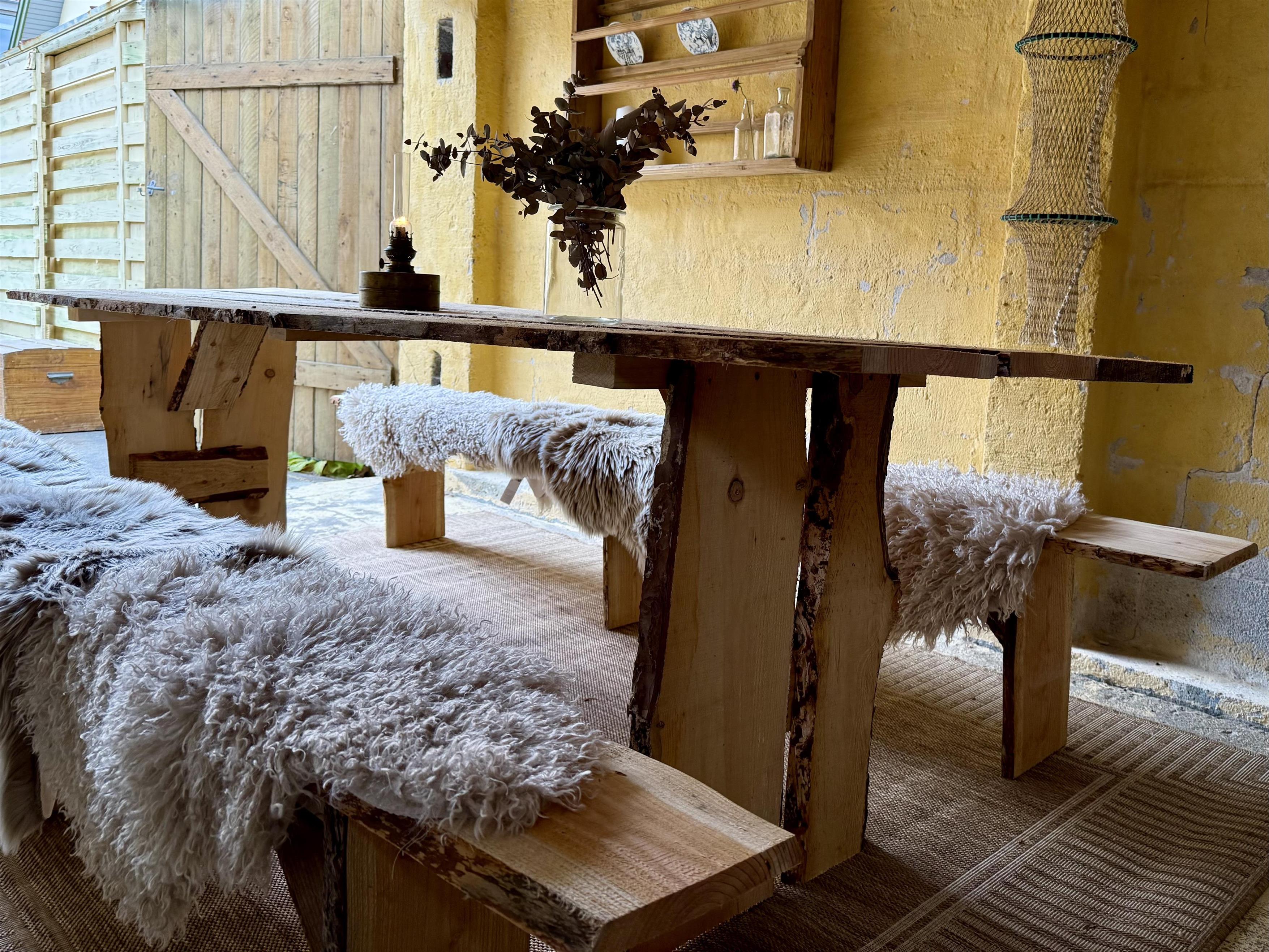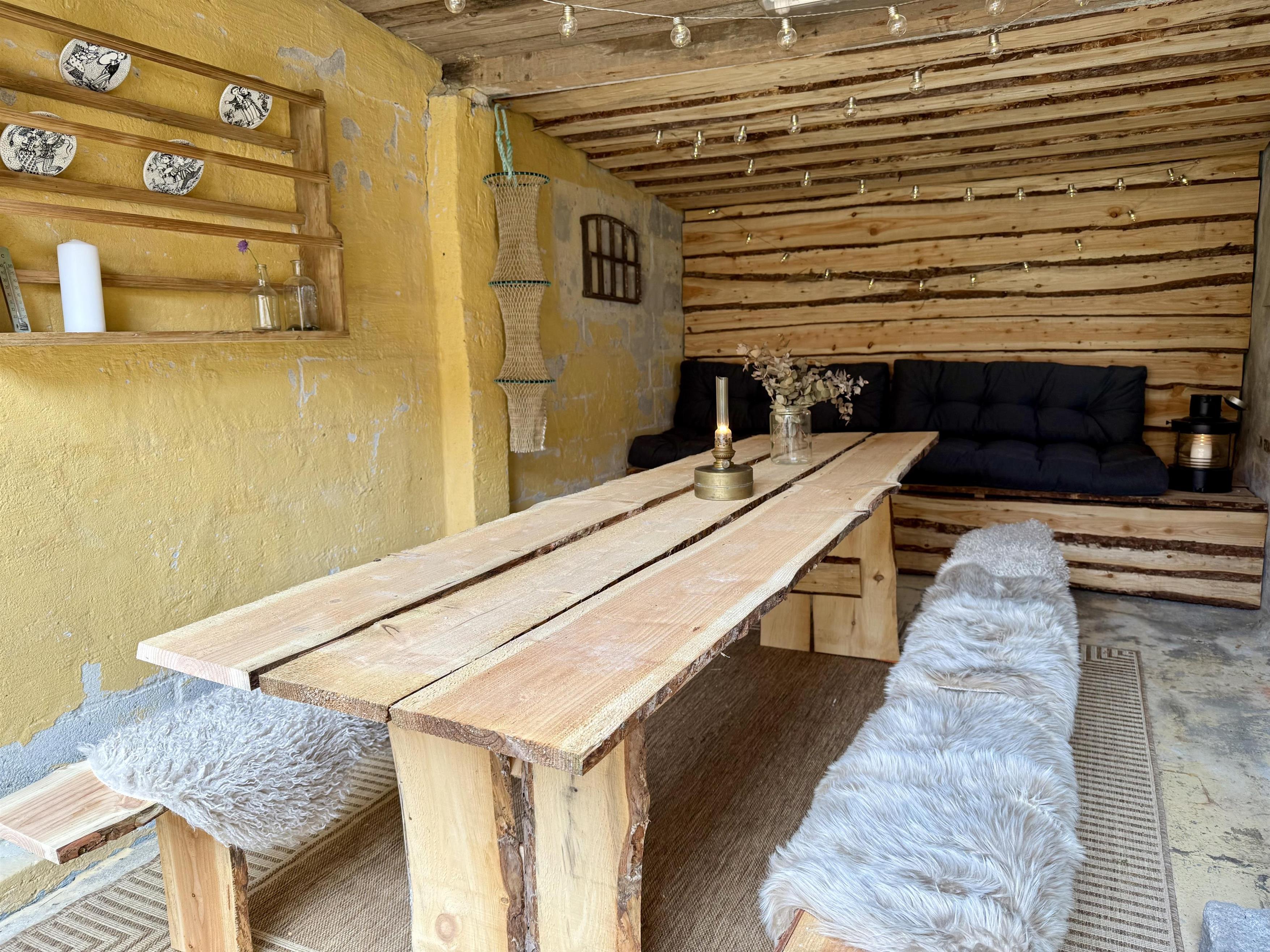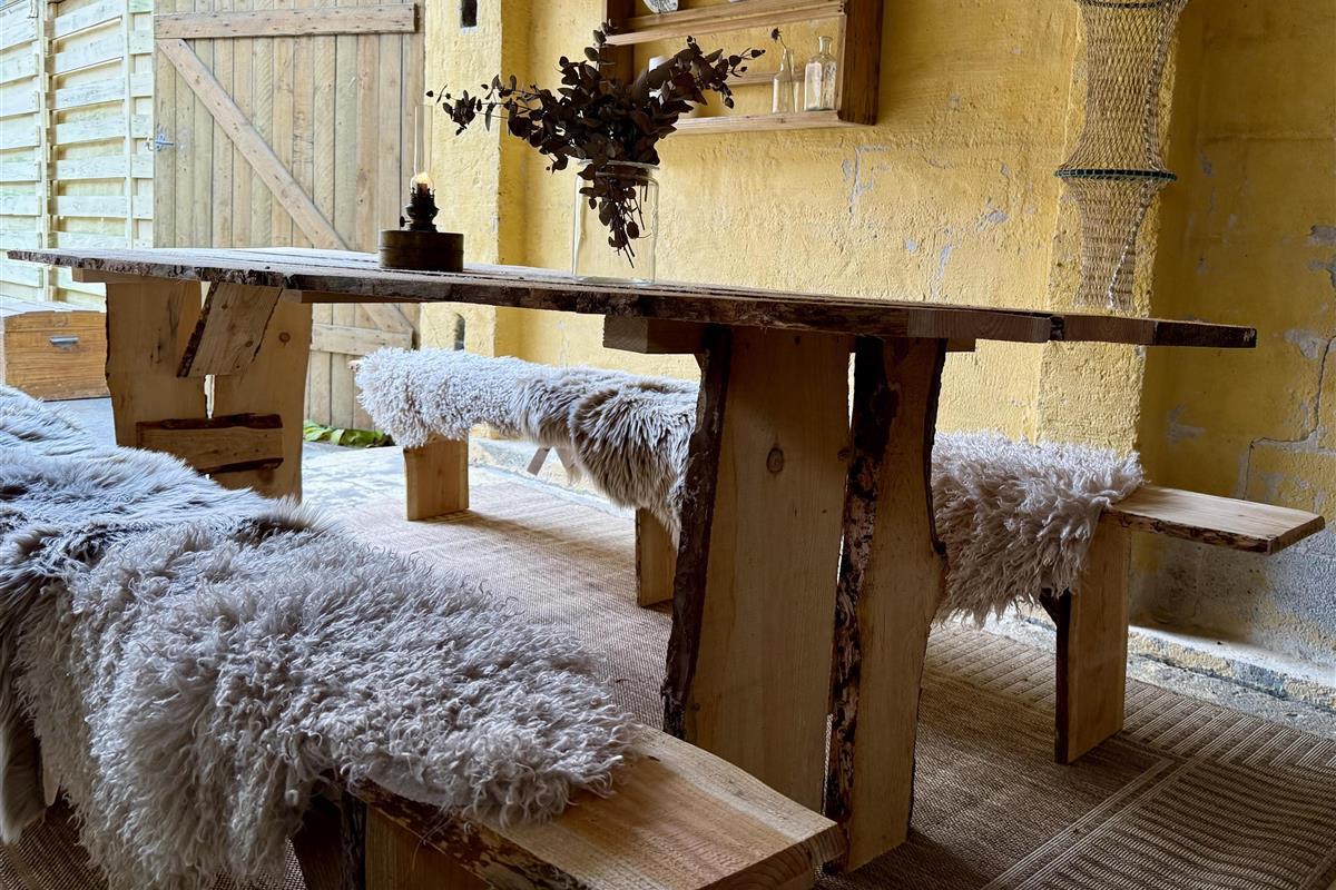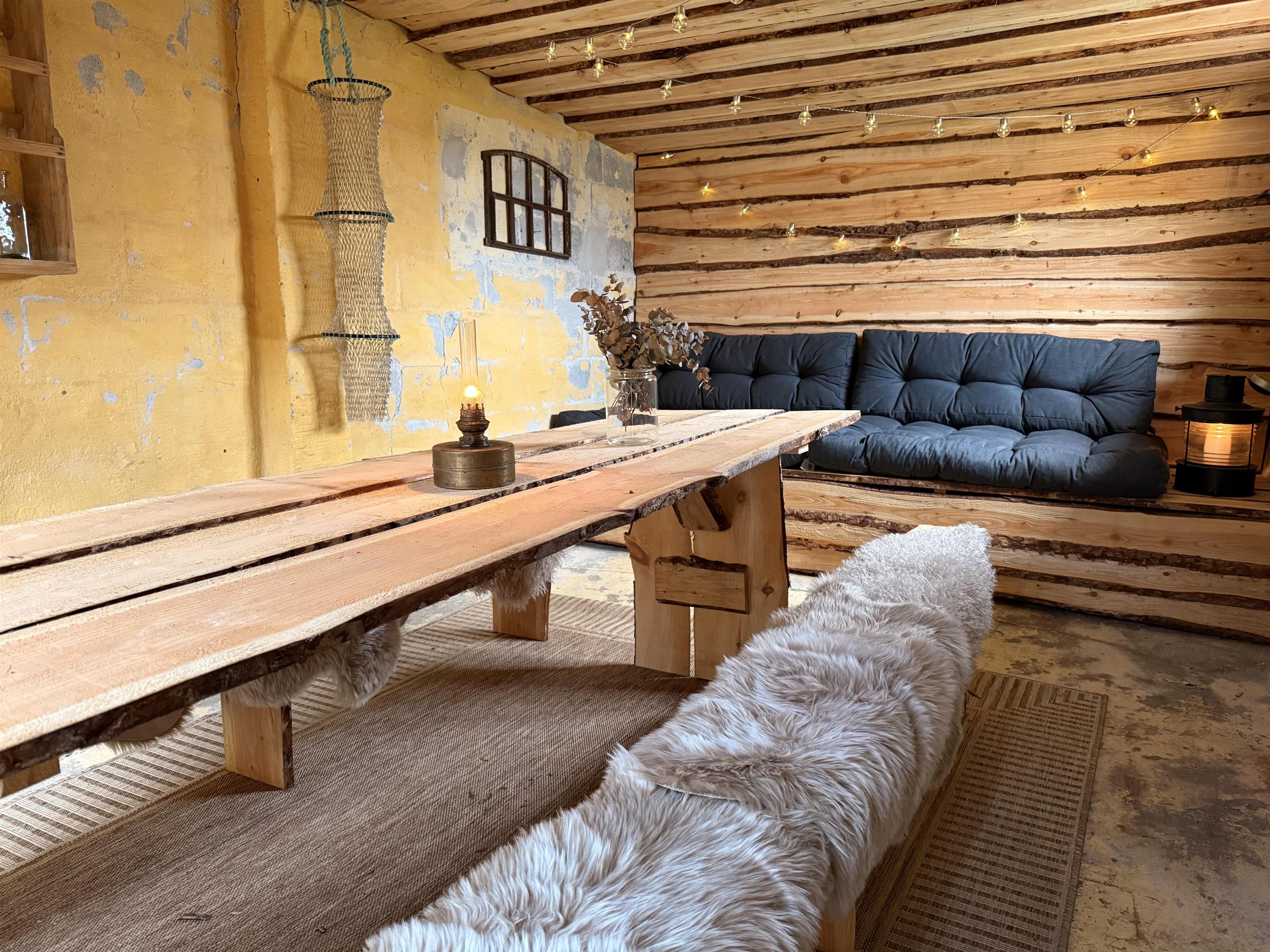 In connection with the terrace, a rustic and atmospheric oasis has been created in the outbuilding. Here you’ll find long tables and benches made of beautiful, untreated wood with sheepskins, cozy string lights, lounge furniture, and heating. Perfect for pleasant dinners and relaxation – whatever the weather, even on chilly evenings.