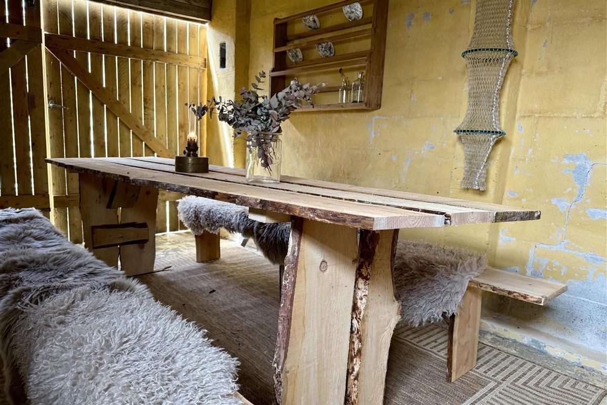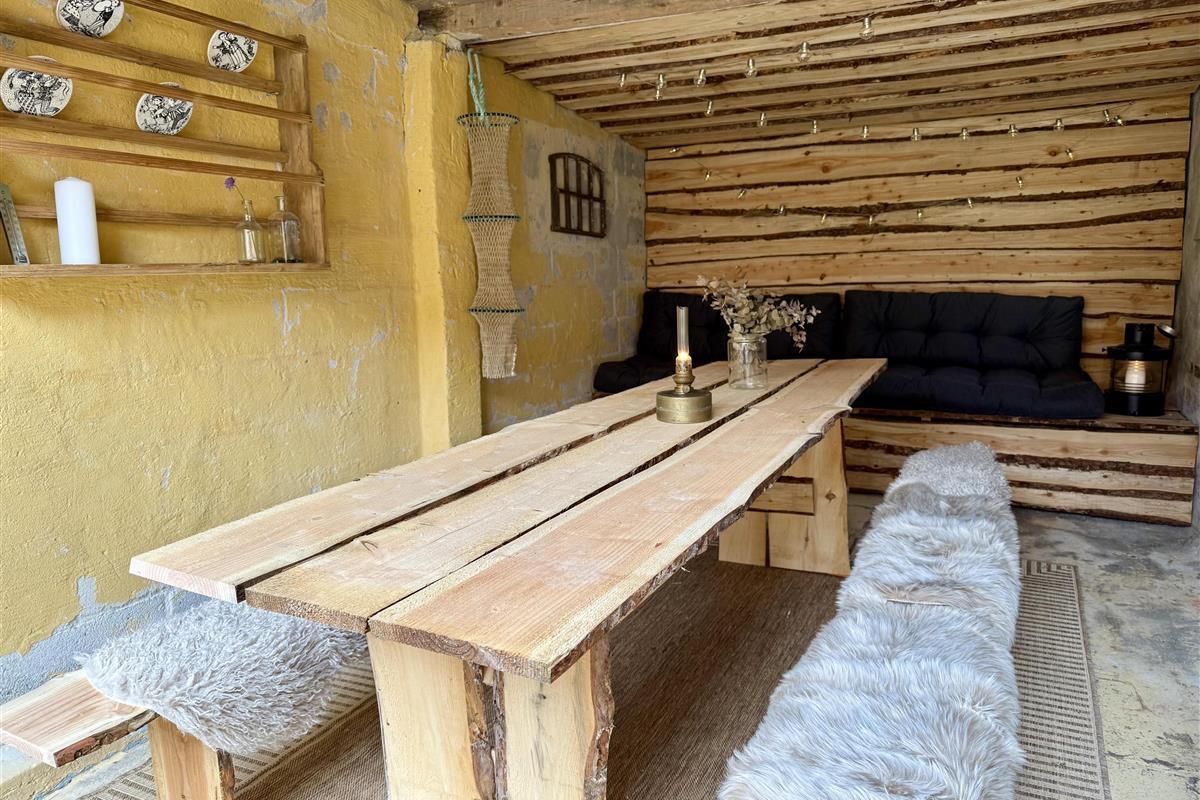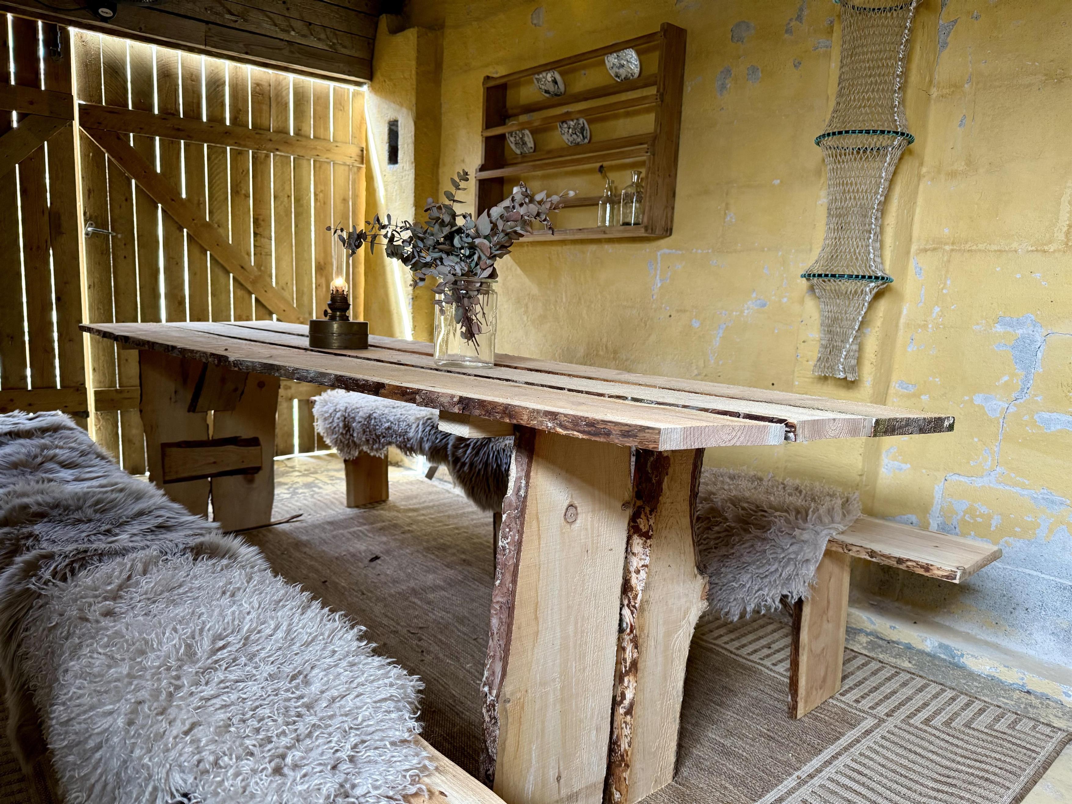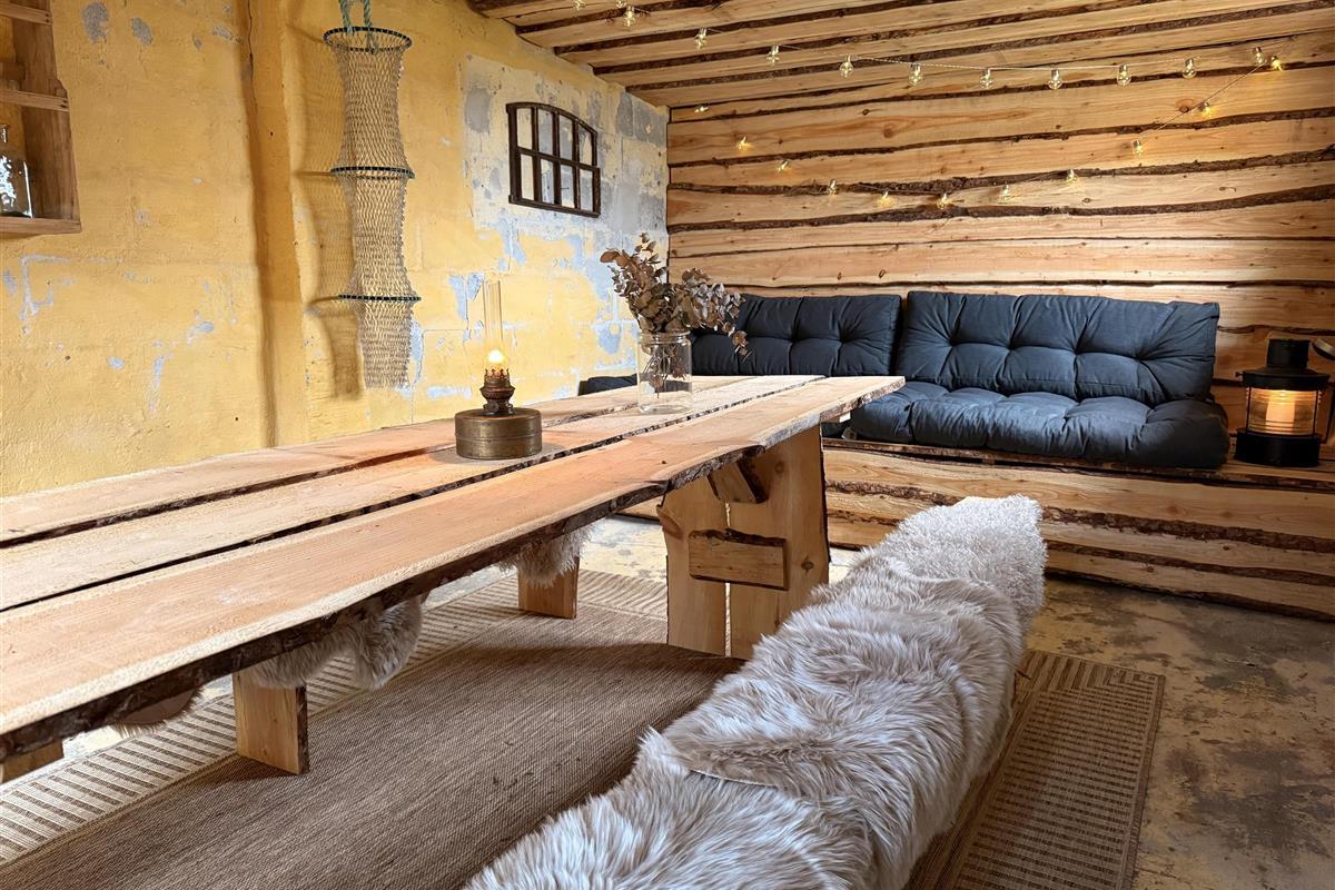In connection with the terrace, a rustic and atmospheric oasis has been created in the outbuilding. Here you’ll find long tables and benches made of beautiful, untreated wood with sheepskins, cozy string lights, lounge furniture, and heating. Perfect for pleasant dinners and relaxation – whatever the weather, even on chilly evenings.