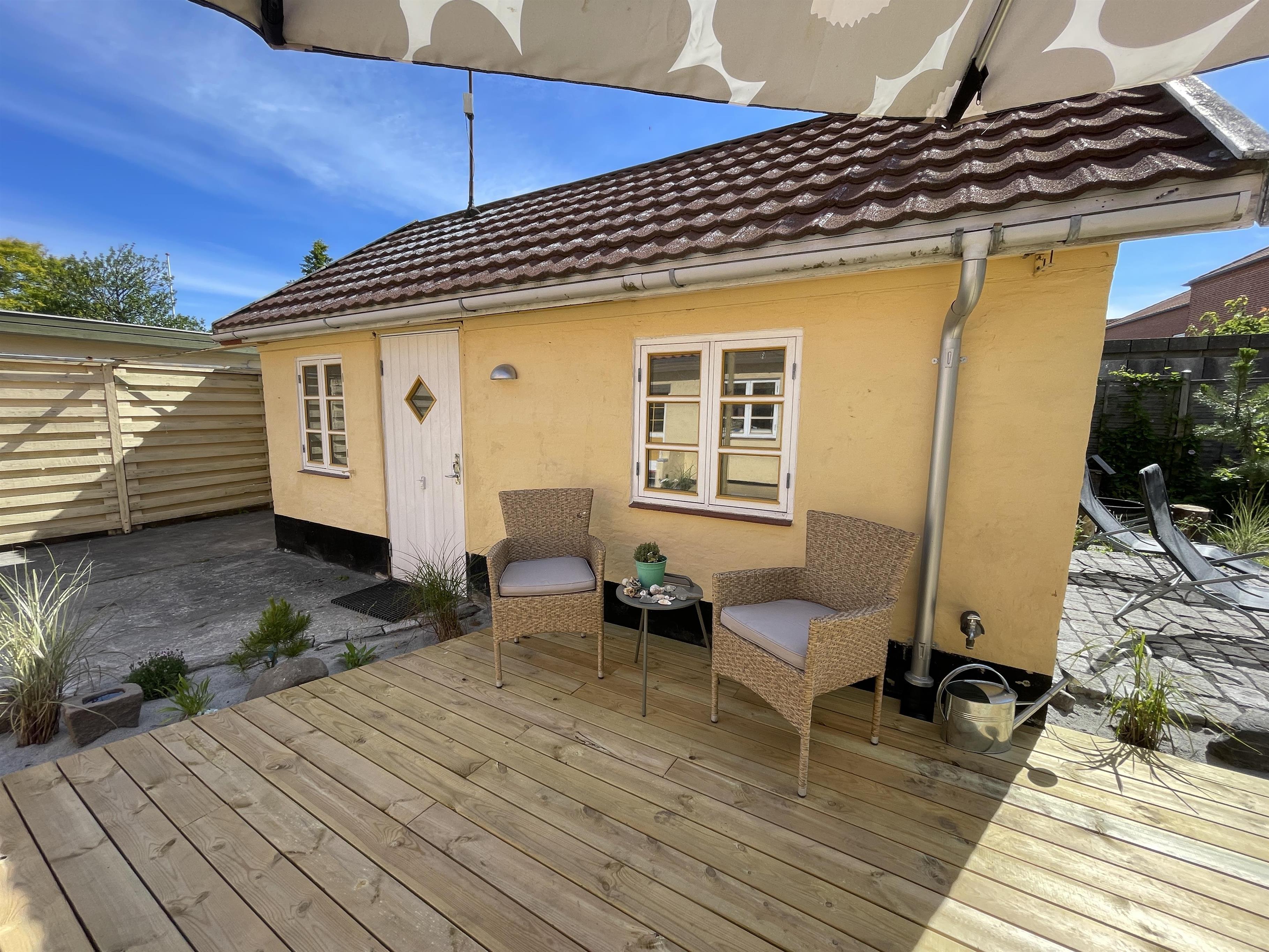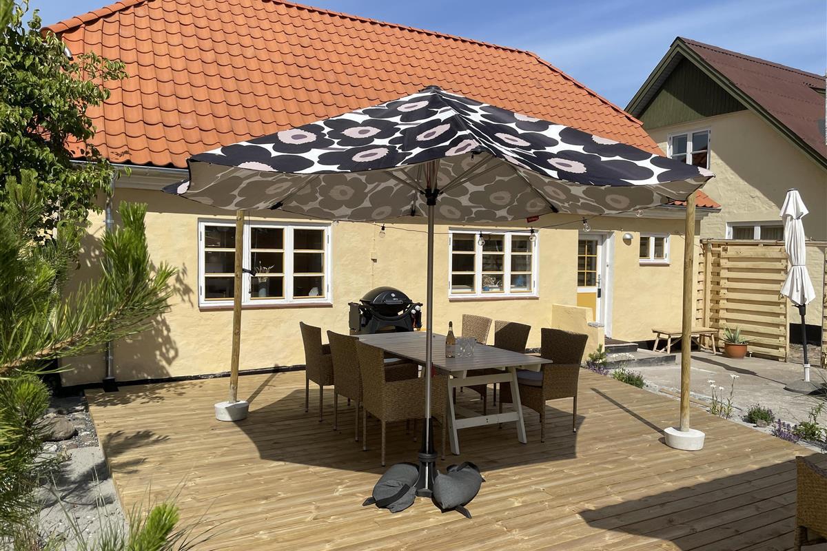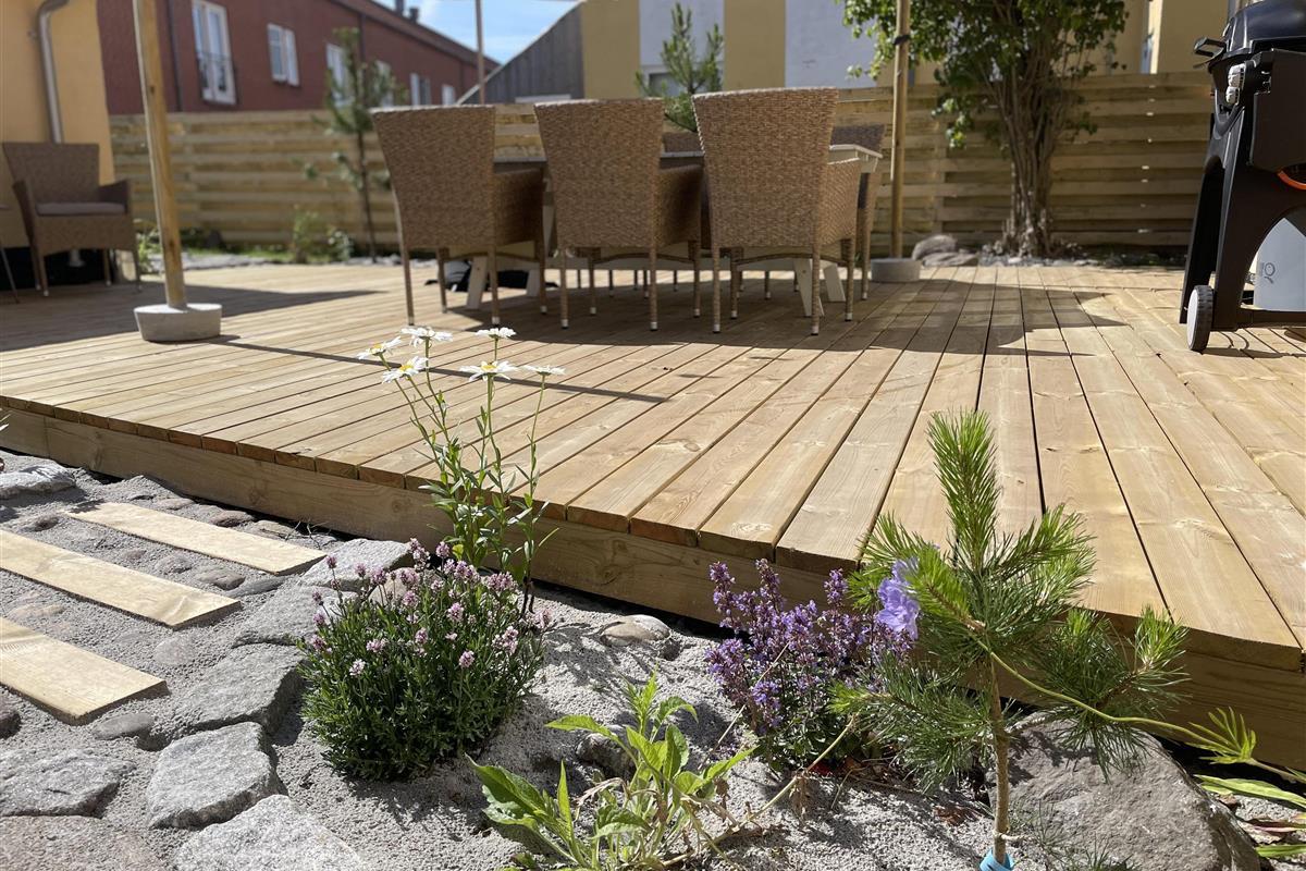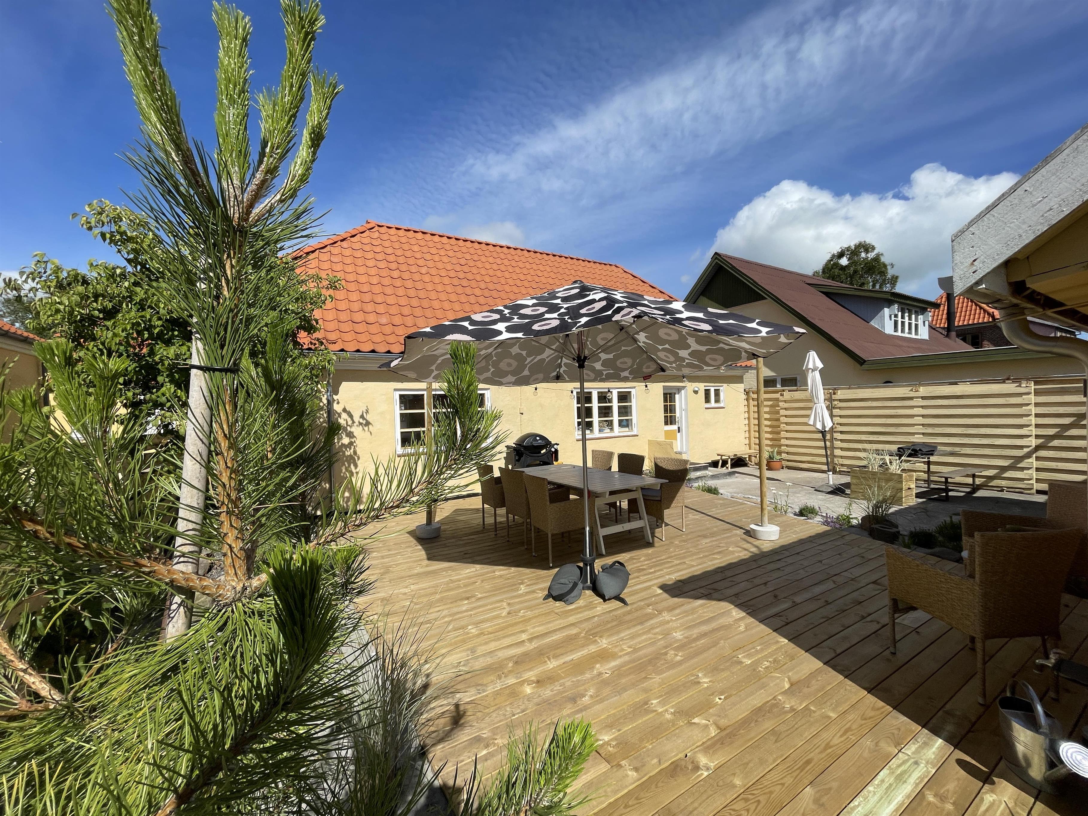 Outside you will find the most beautiful courtyard with a large new wooden terrace, lovely garden furniture and a good barbecue, as well as a cosy enclosed courtyard environment with small green shrubs and plants. It is a small oasis where you can enjoy the outdoors in the sun and sheltered from the weather.
