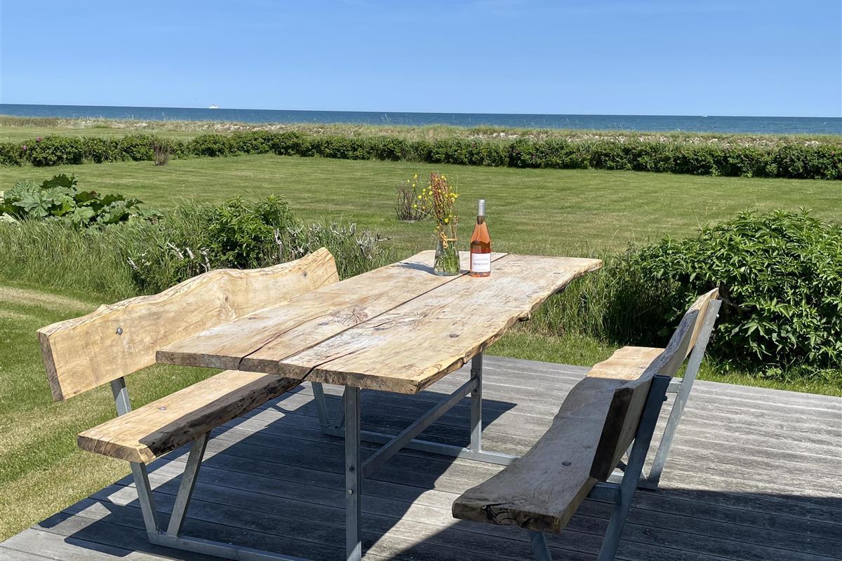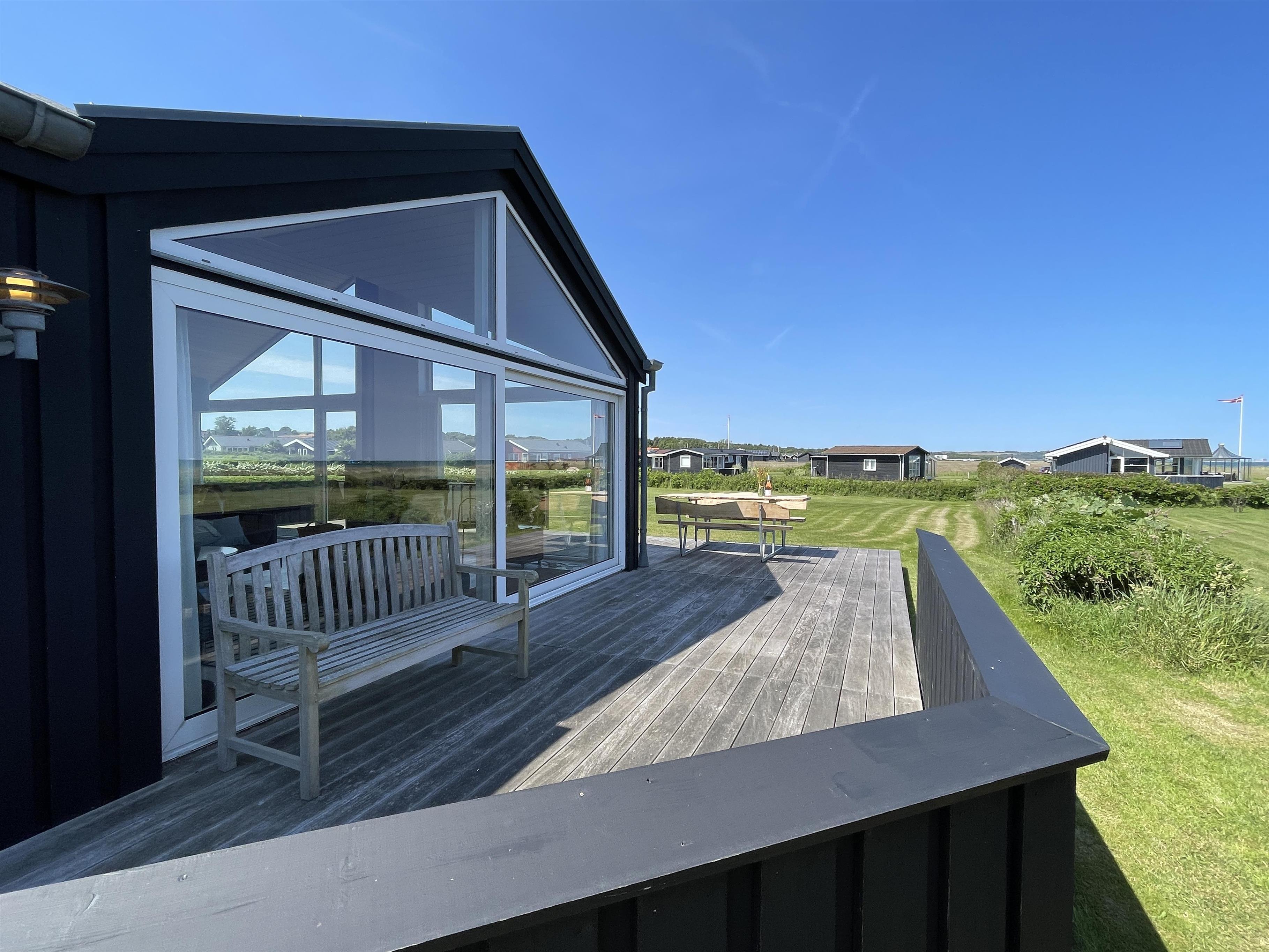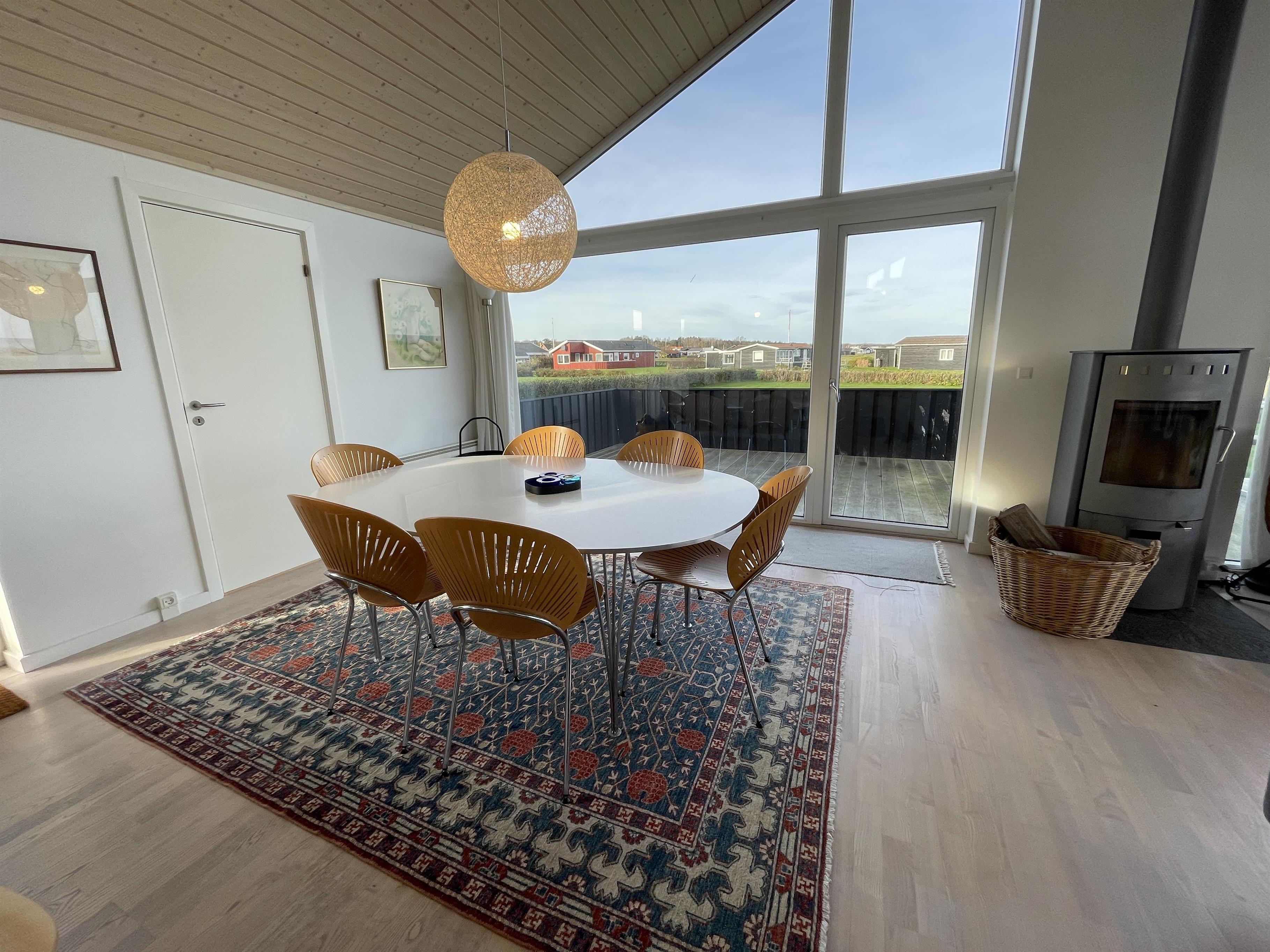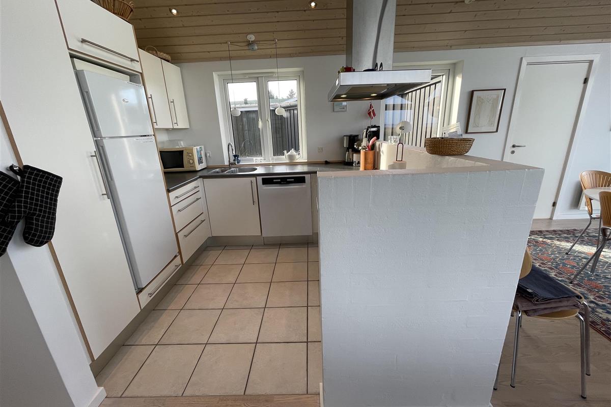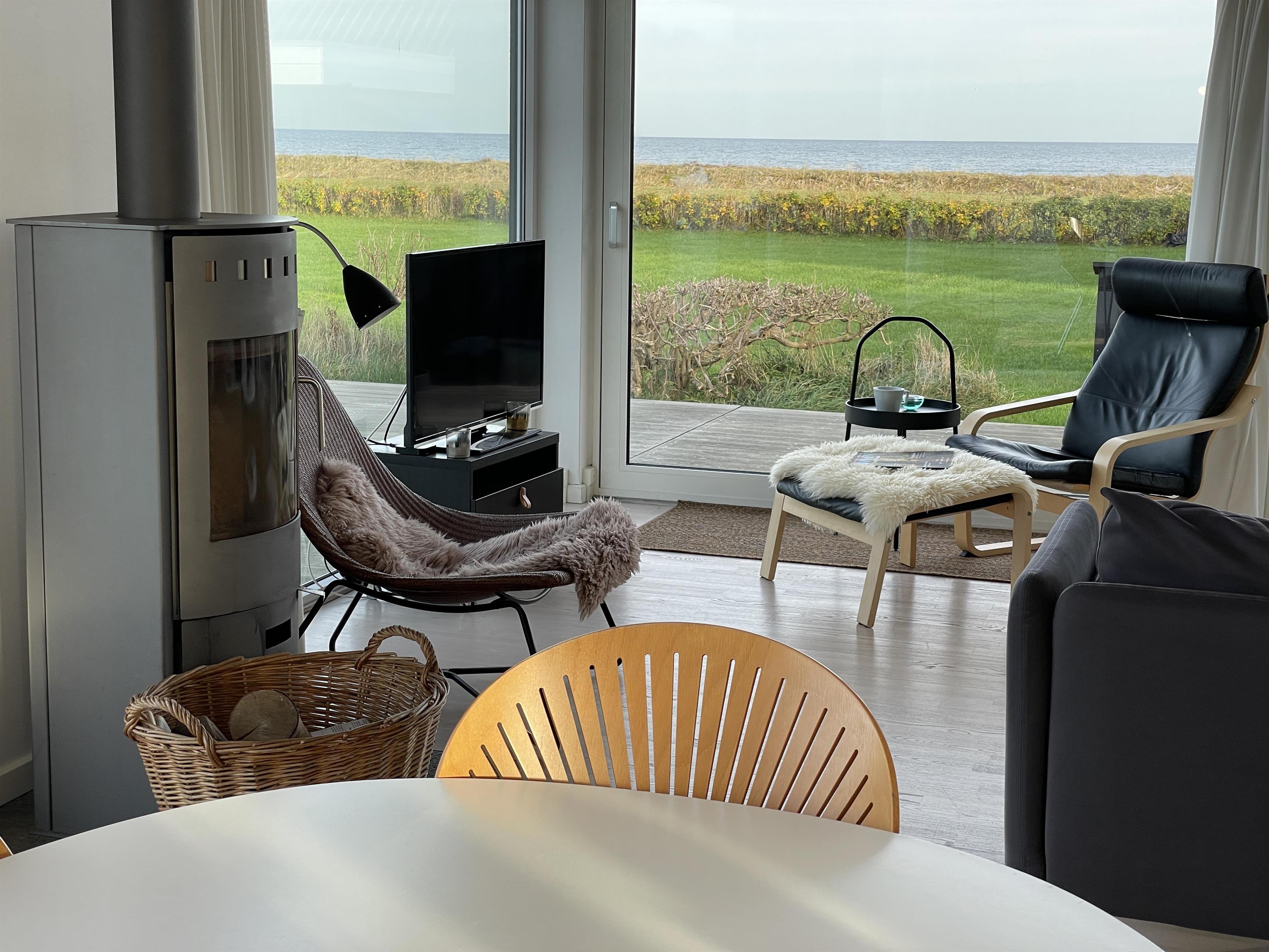 The kitchen is very well-equipped, containing everything you need to prepare delicious summer meals, which you can enjoy at the dining table by the large windowed patio, offering beautiful, private views of the Kattegat.
