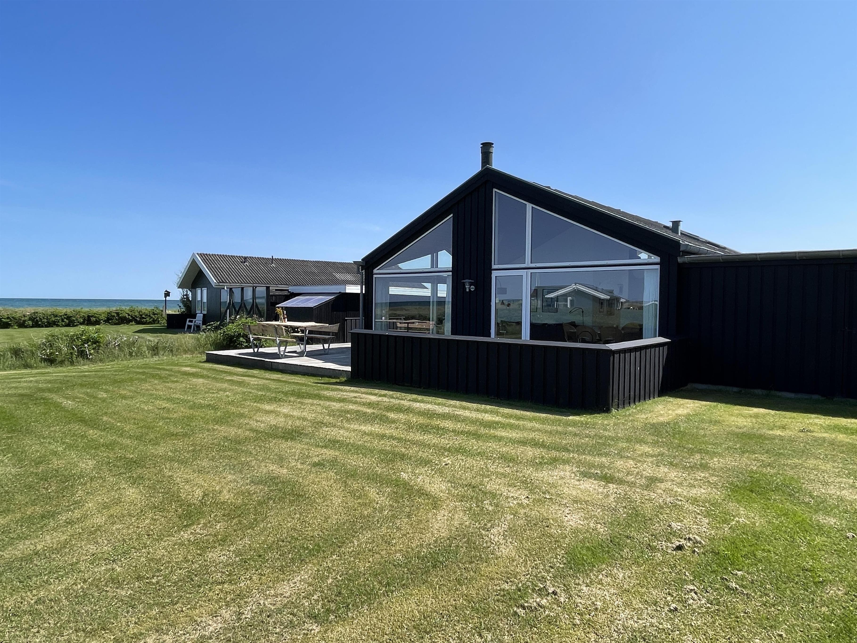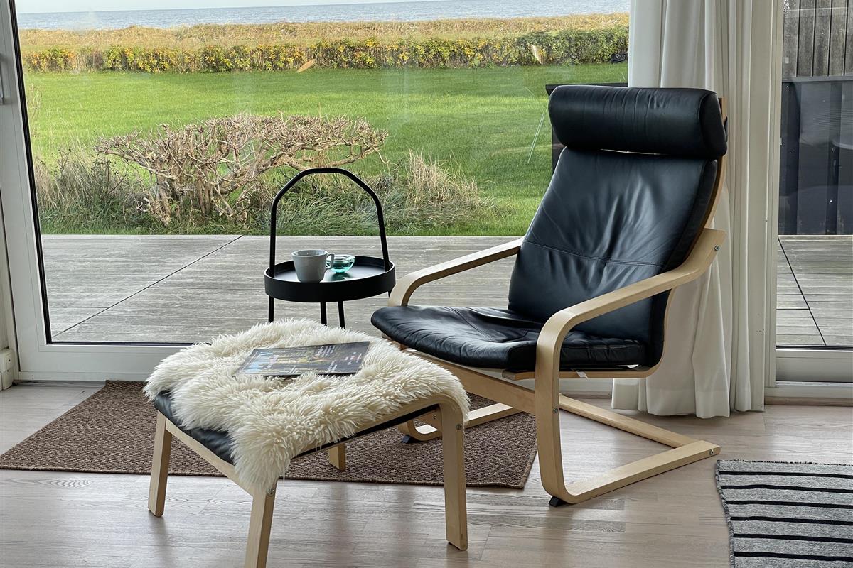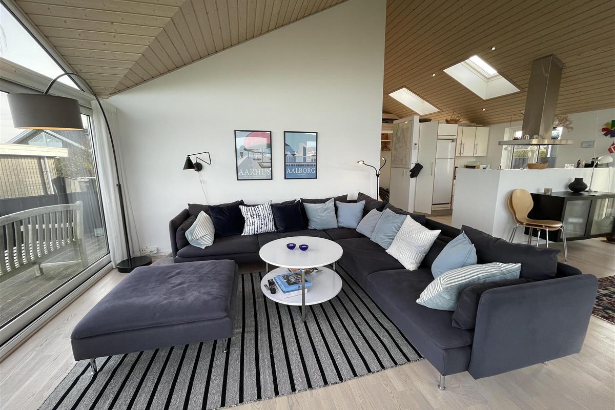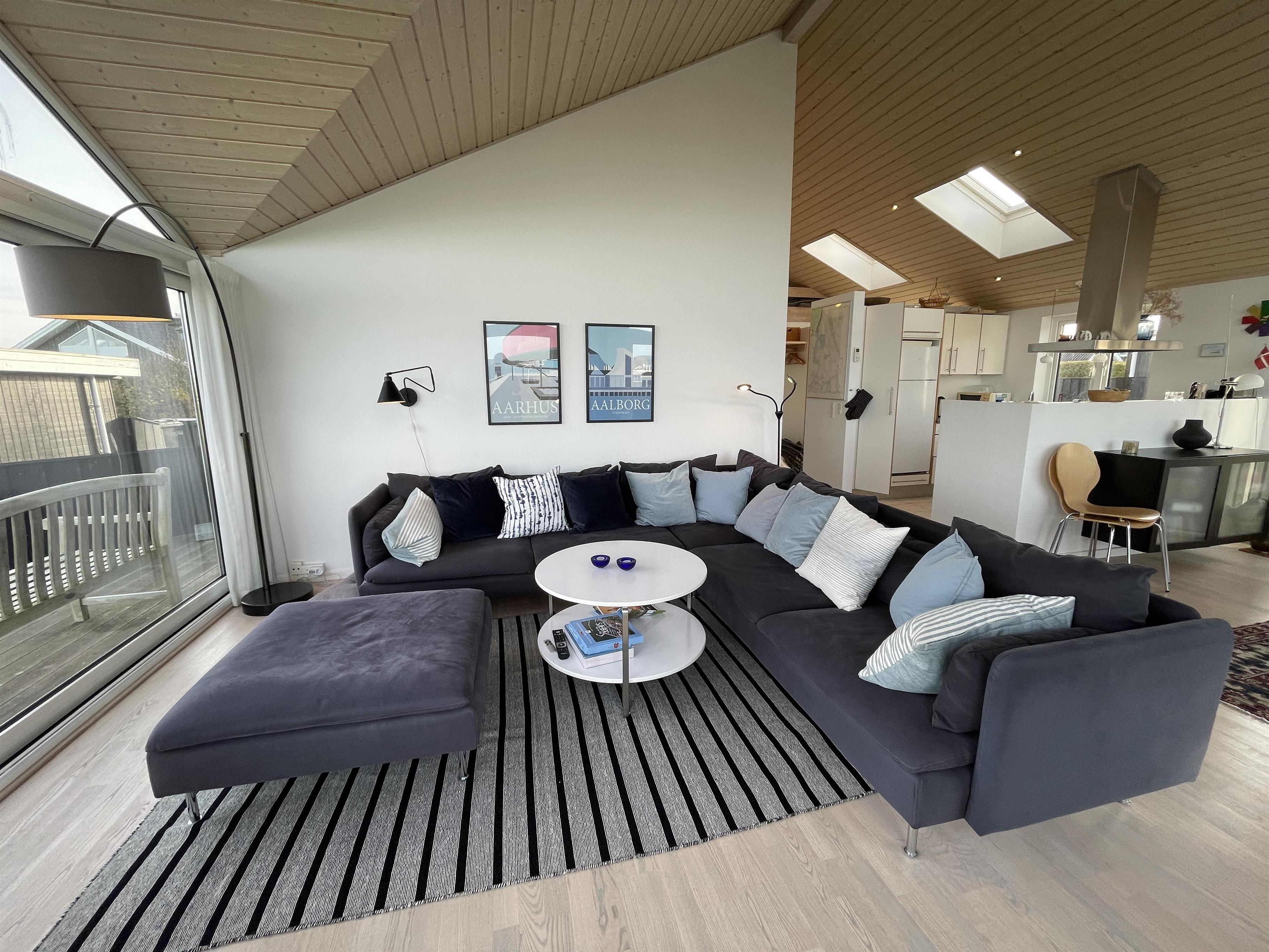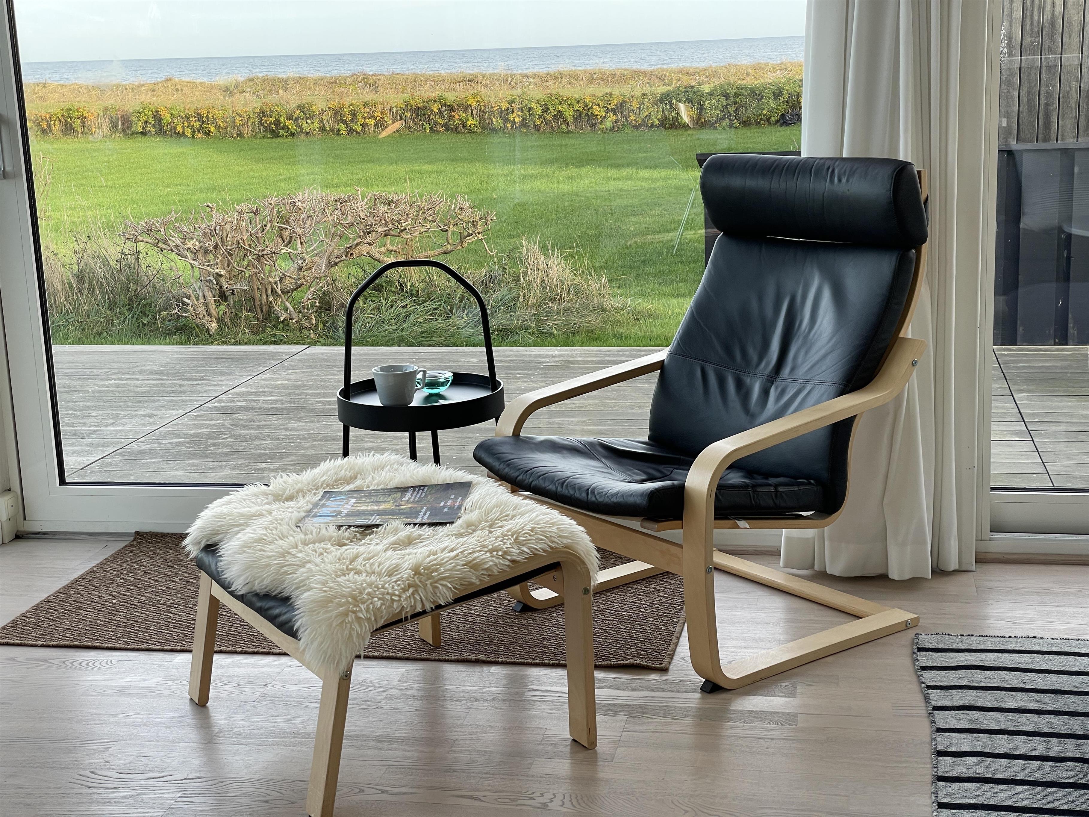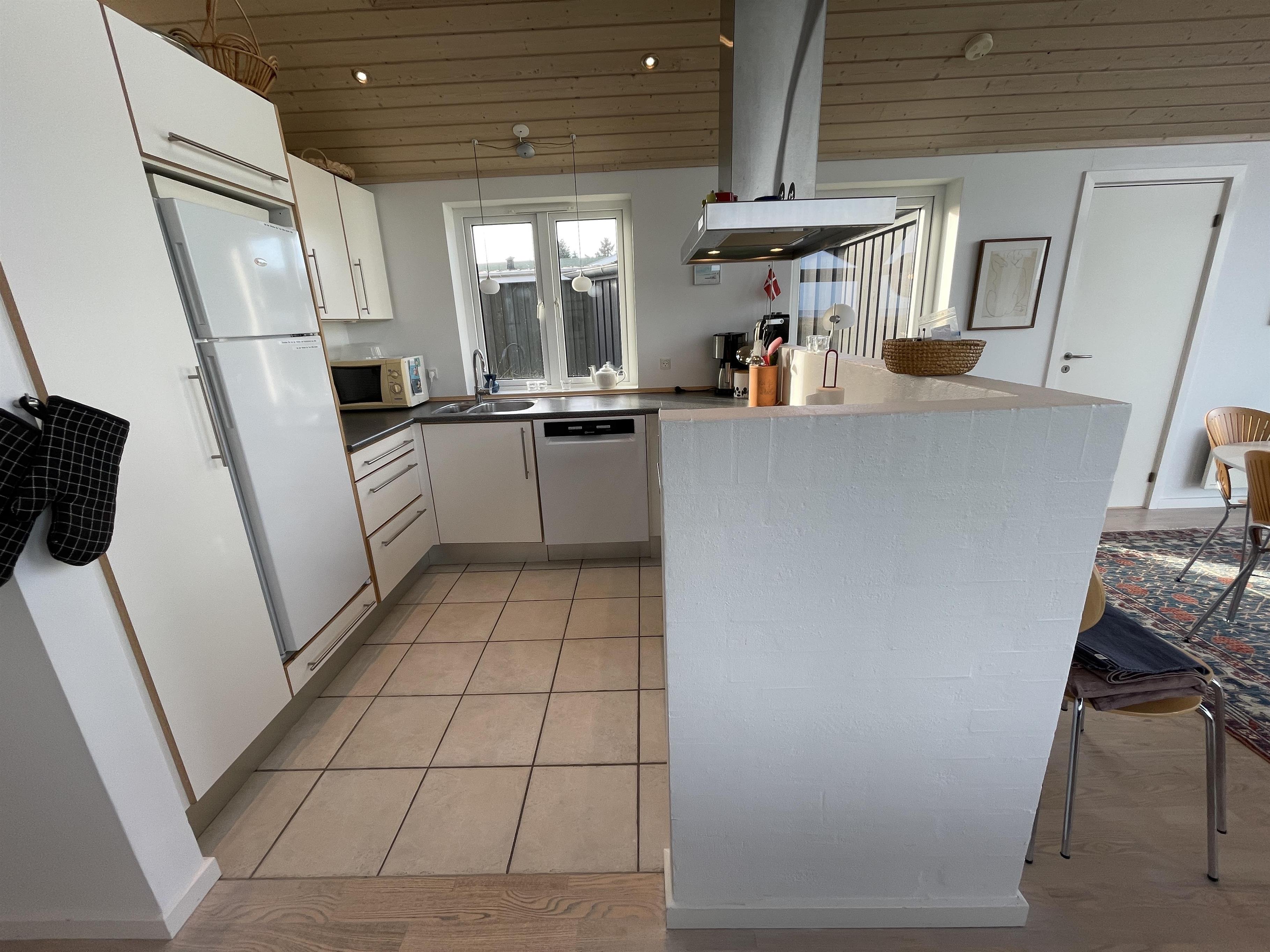 The kitchen is very well-equipped, containing everything you need to prepare delicious summer meals, which you can enjoy at the dining table by the large windowed patio, offering beautiful, private views of the Kattegat.