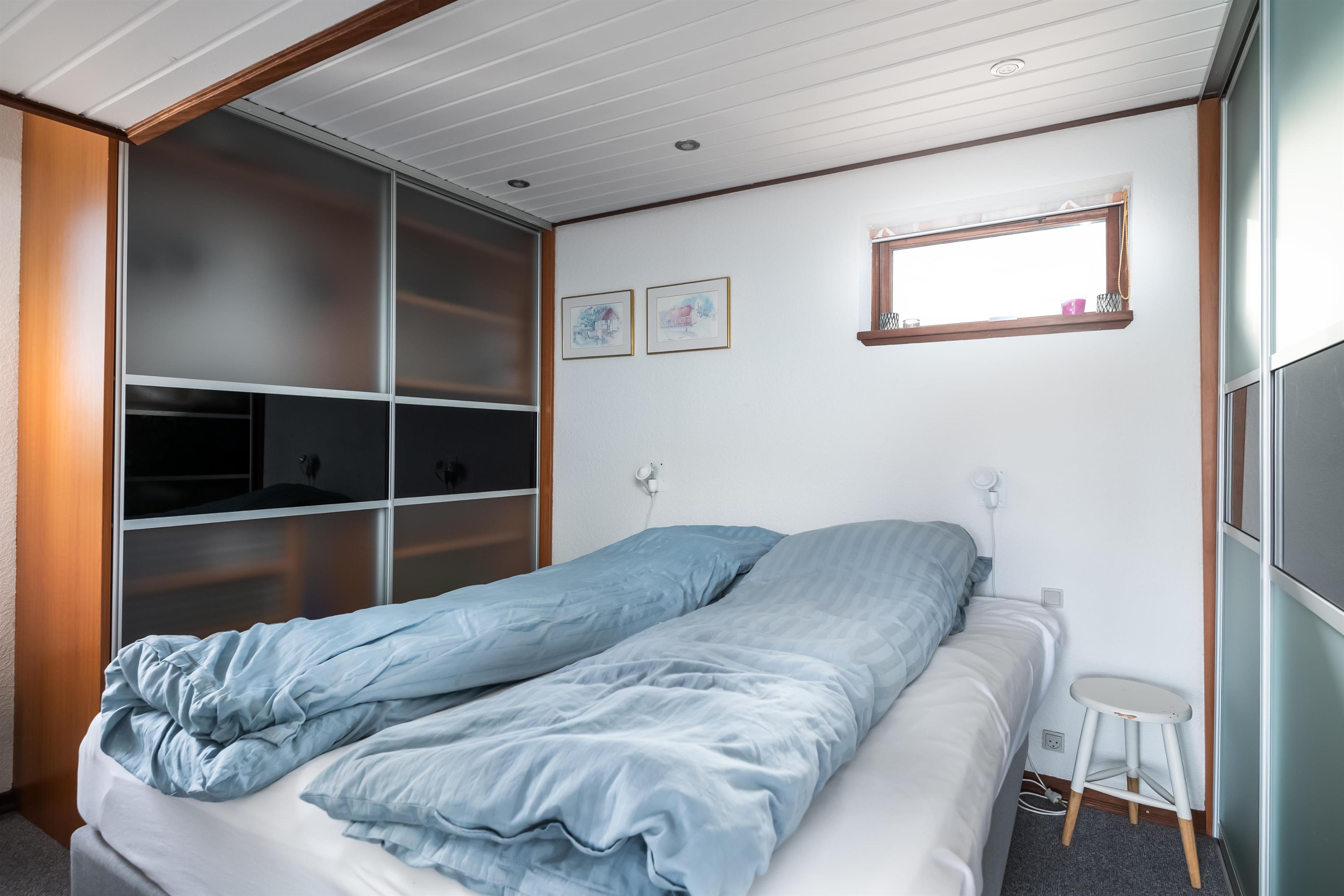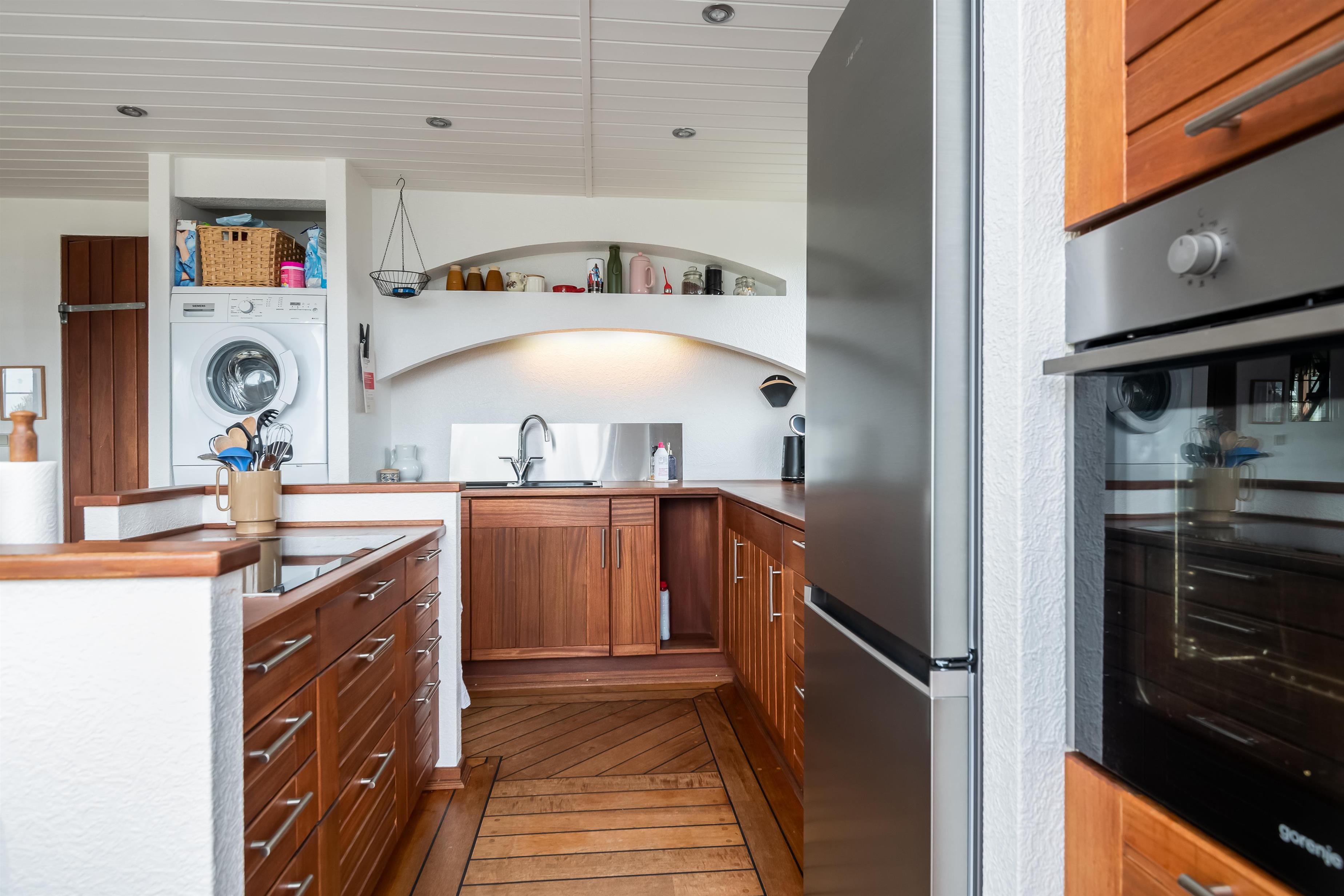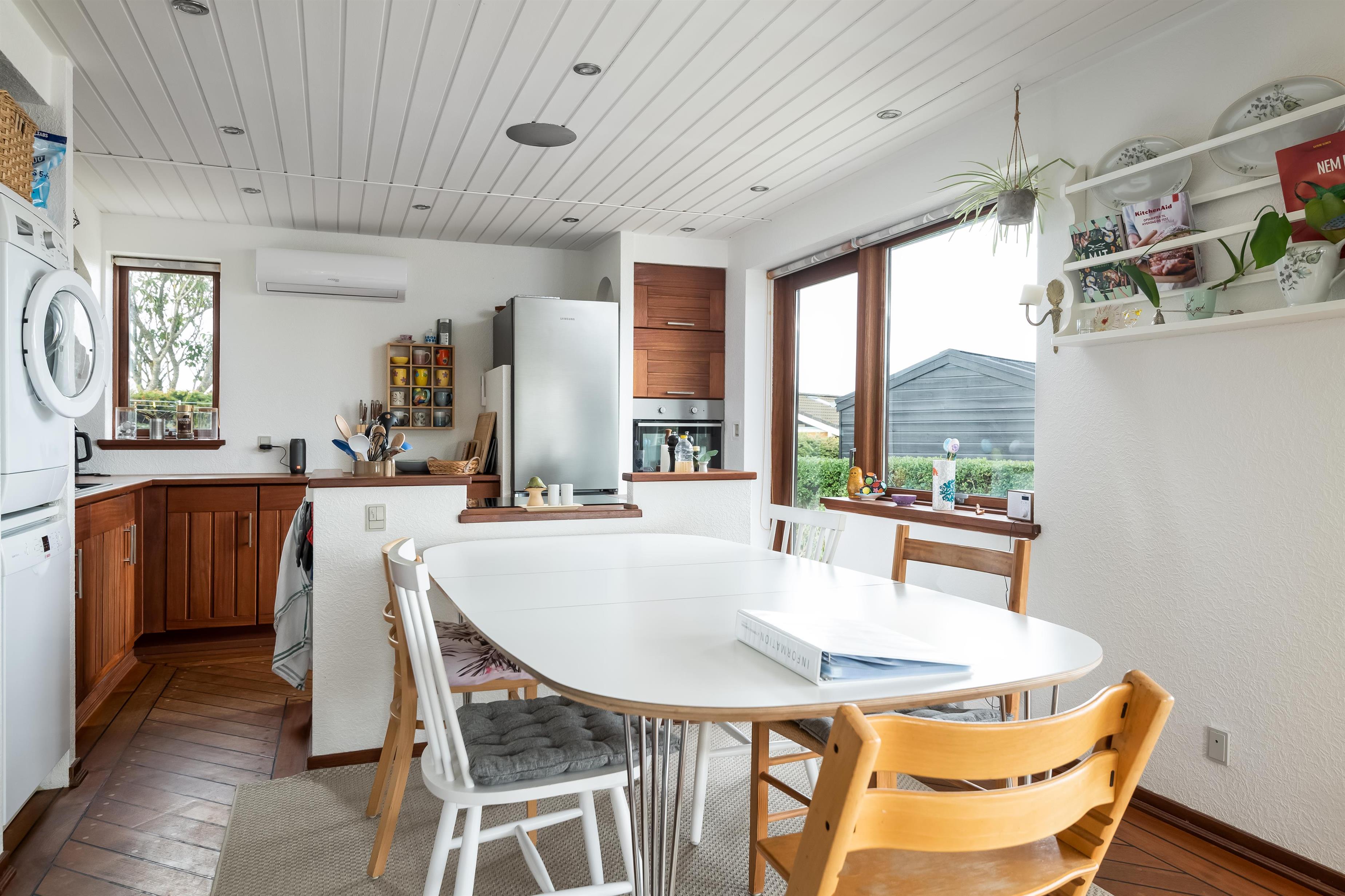 The house underwent a major renovation in 2002 and has been well maintained ever since – something that is clearly visible and felt. The kitchen is equipped with a dishwasher, fridge/freezer, coffee machine, various kitchen utensils, generous counter space, and a kitchen island with an induction hob facing the living area. Cooking here won’t feel like a lonely task. The bathroom features a shower and washing machine. A tumble dryer is available in the shed.