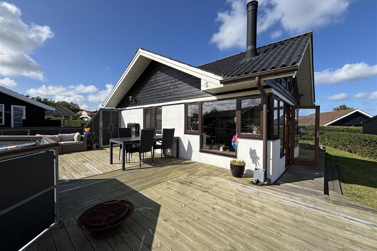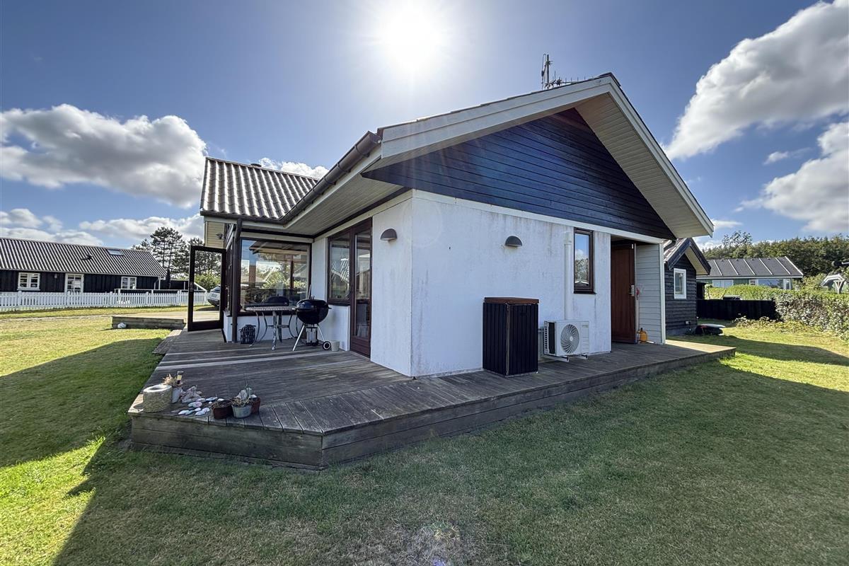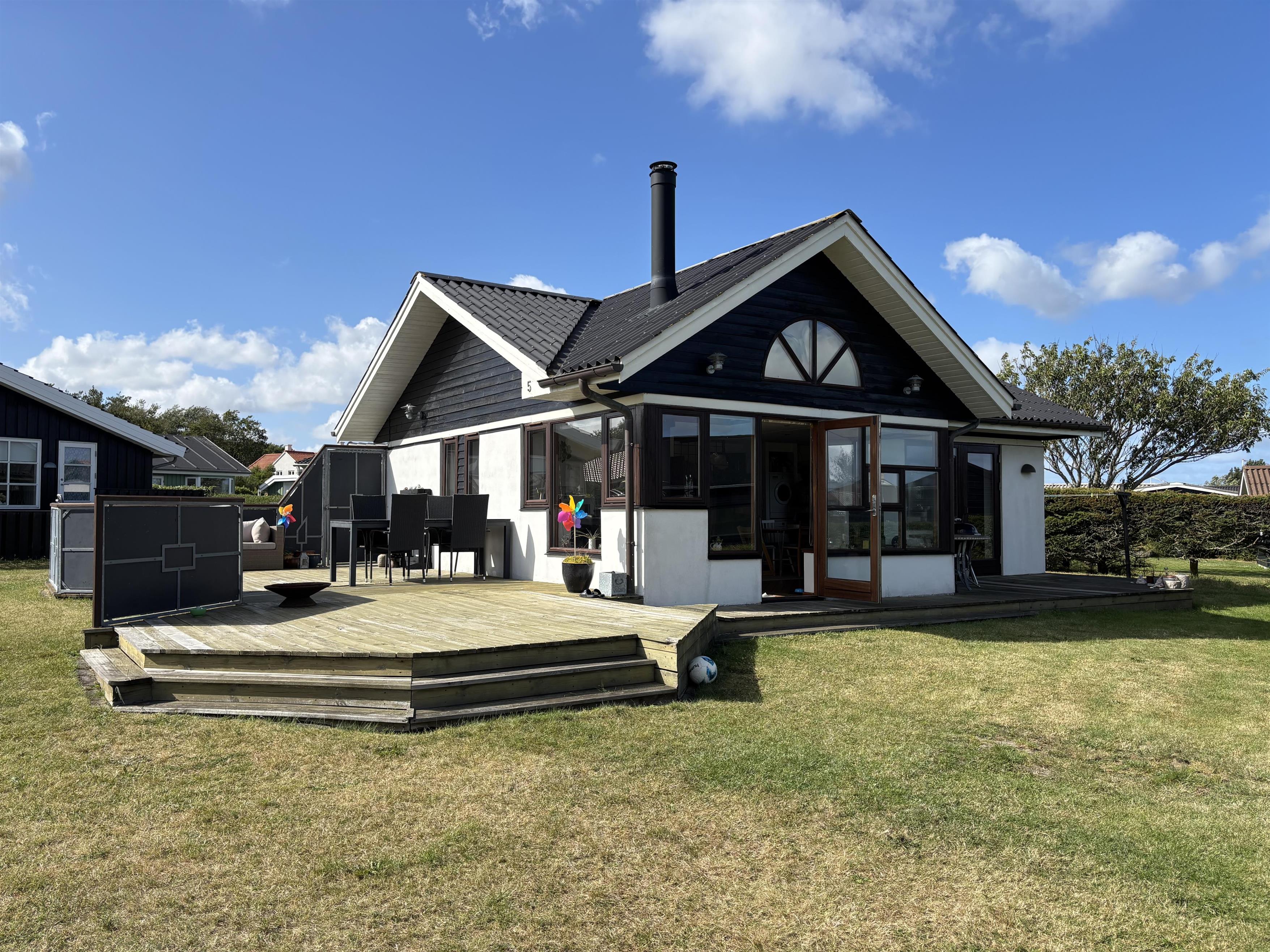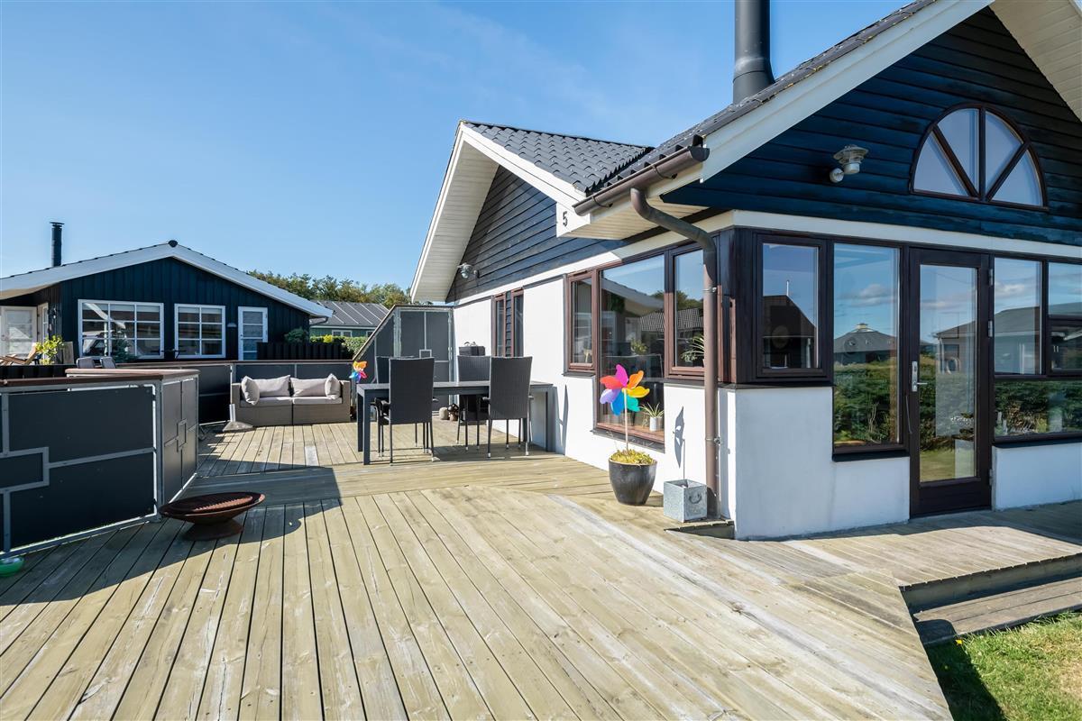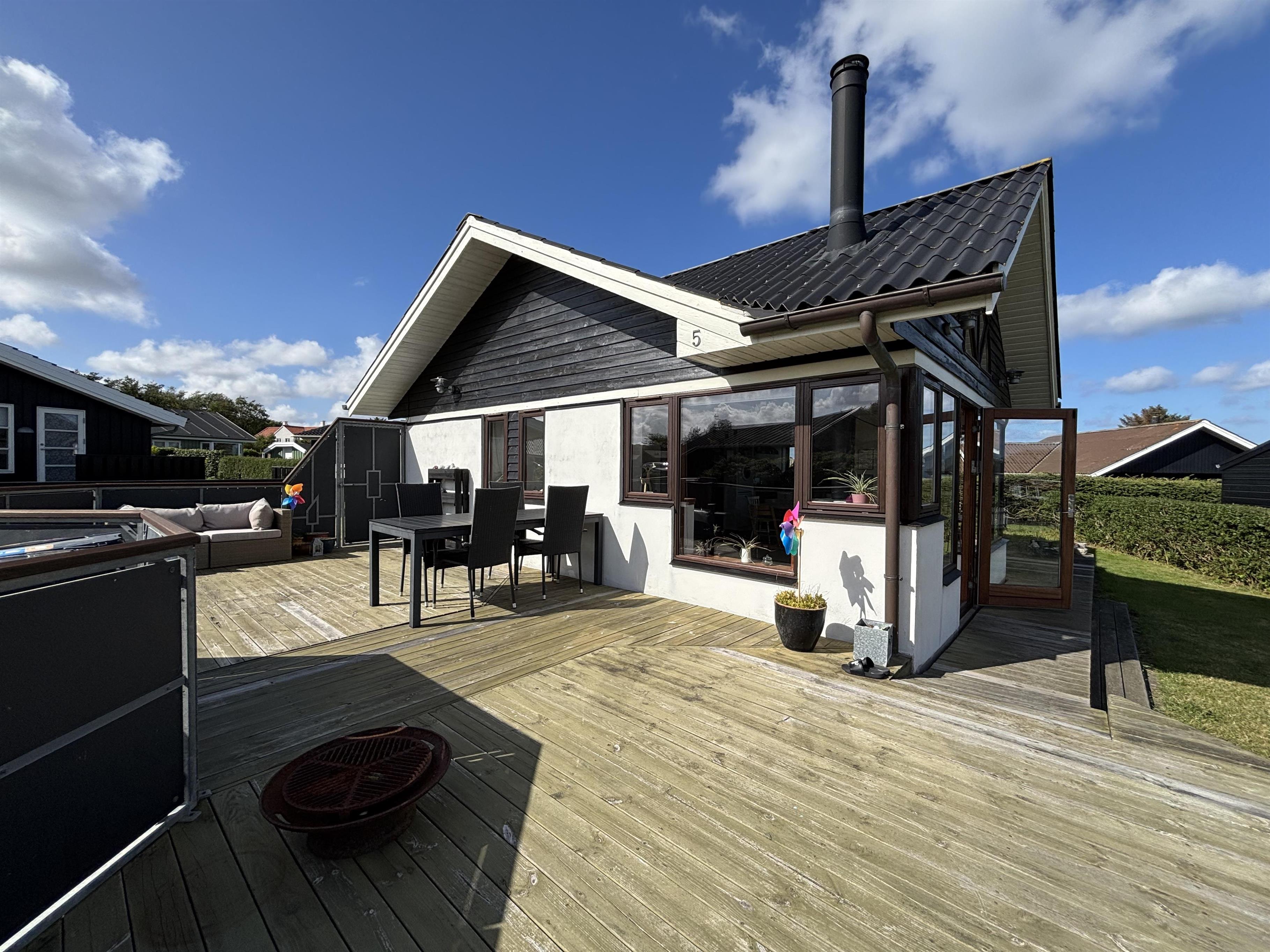 The kitchen and living room are open-plan, creating a beautiful maritime look with ship-style flooring, wooden kitchen, wooden doors, wood/metal staircase, and a carefully coordinated interior. Surrounding the entire house is a large wooden terrace with several cozy corners and access from both the living room and kitchen. The terrace is designed to allow wheelchair access from the driveway, although there are small doorsteps at the entrances. At the back of the house, there is an outdoor shower – perfect for rinsing off sand after a trip to the nearby Blue Flag beach.