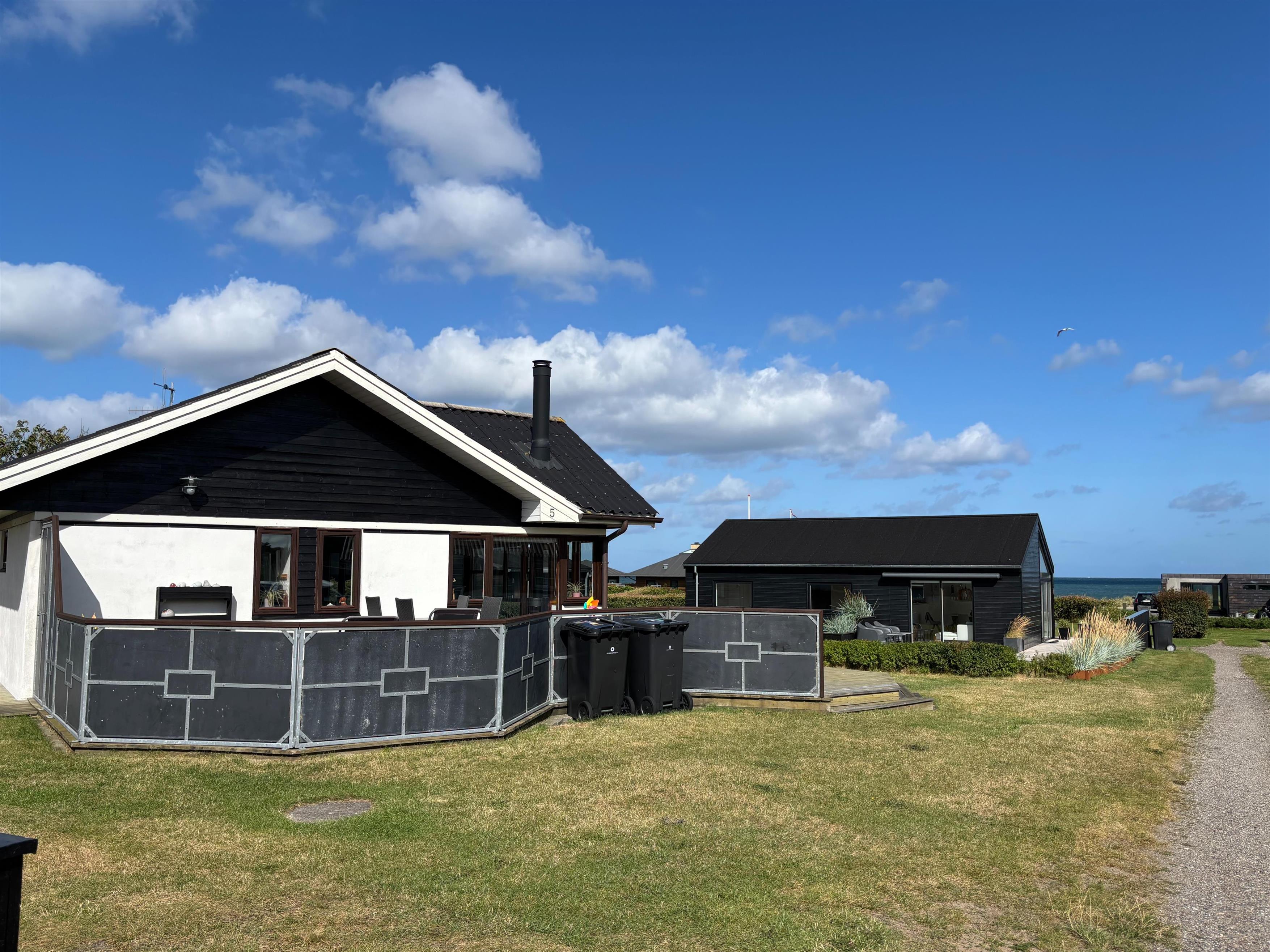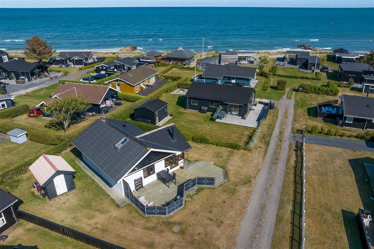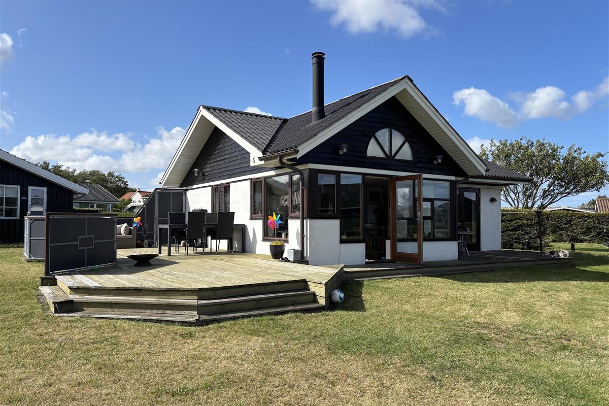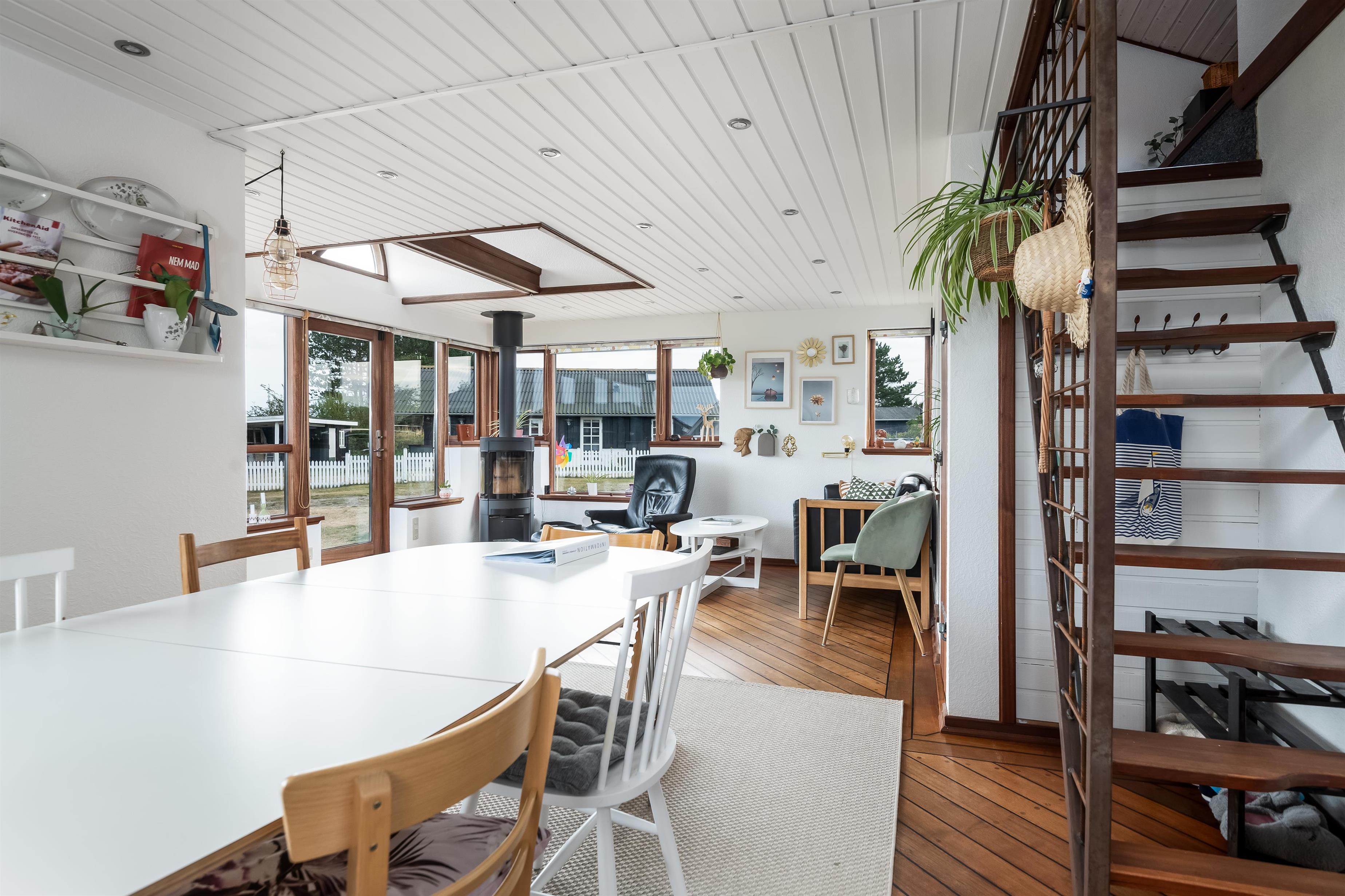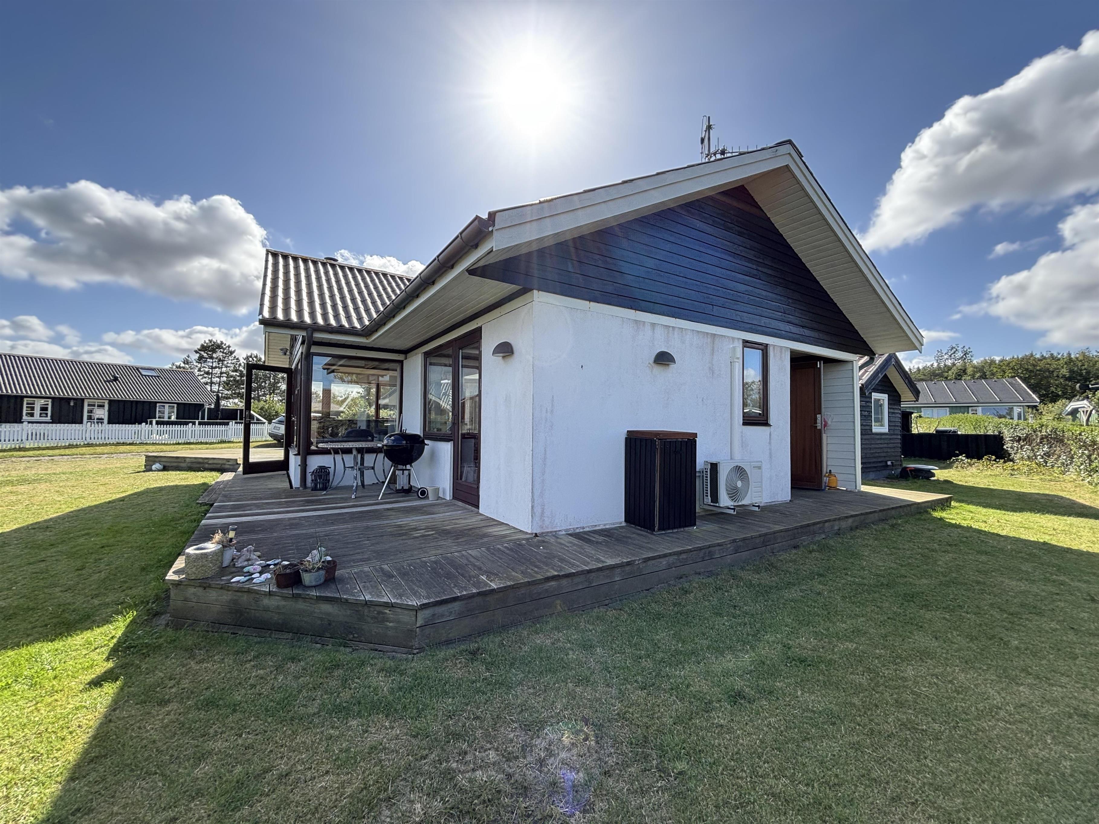 The kitchen and living room are open-plan, creating a beautiful maritime look with ship-style flooring, wooden kitchen, wooden doors, wood/metal staircase, and a carefully coordinated interior. Surrounding the entire house is a large wooden terrace with several cozy corners and access from both the living room and kitchen. The terrace is designed to allow wheelchair access from the driveway, although there are small doorsteps at the entrances. At the back of the house, there is an outdoor shower – perfect for rinsing off sand after a trip to the nearby Blue Flag beach.