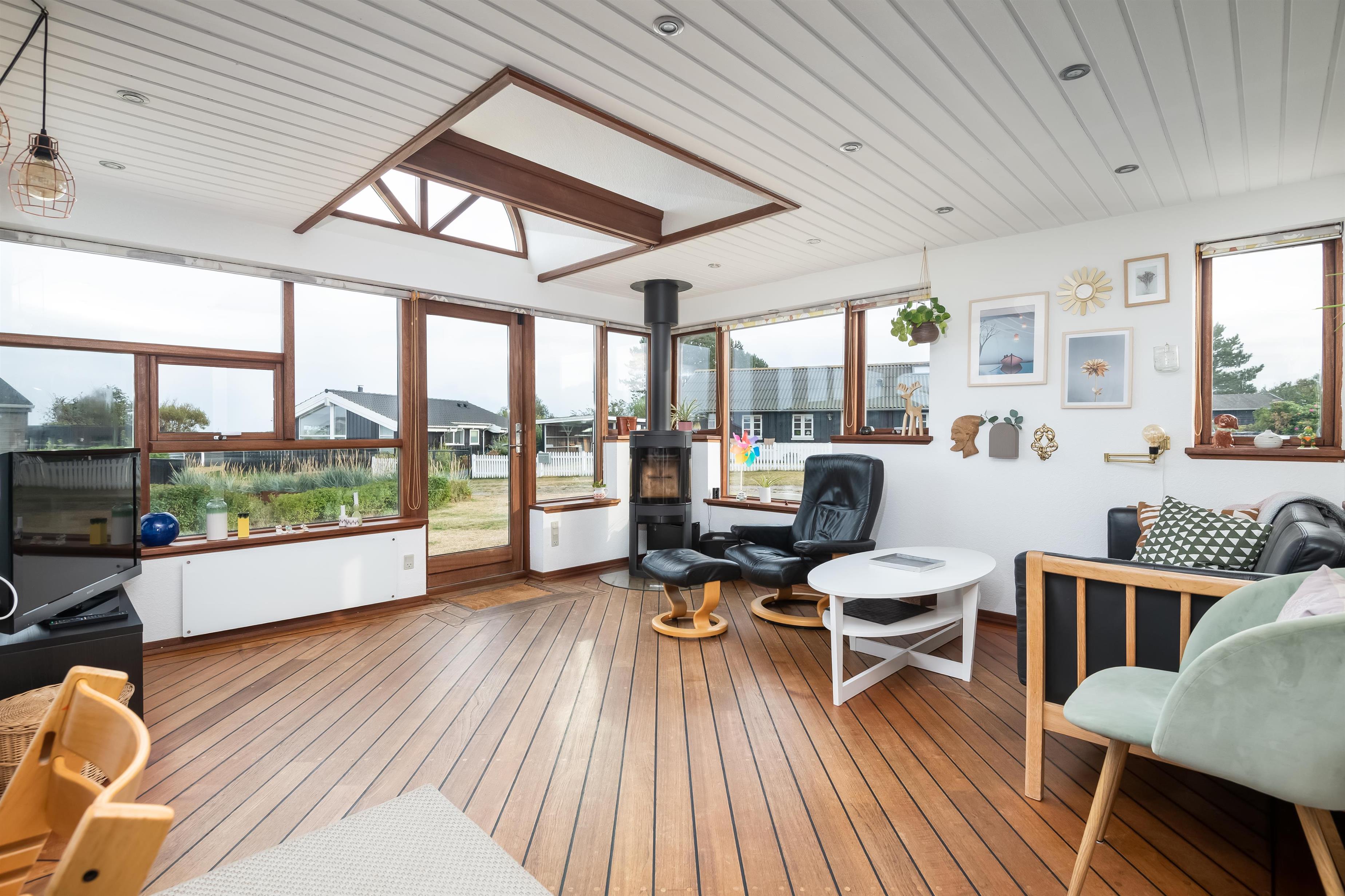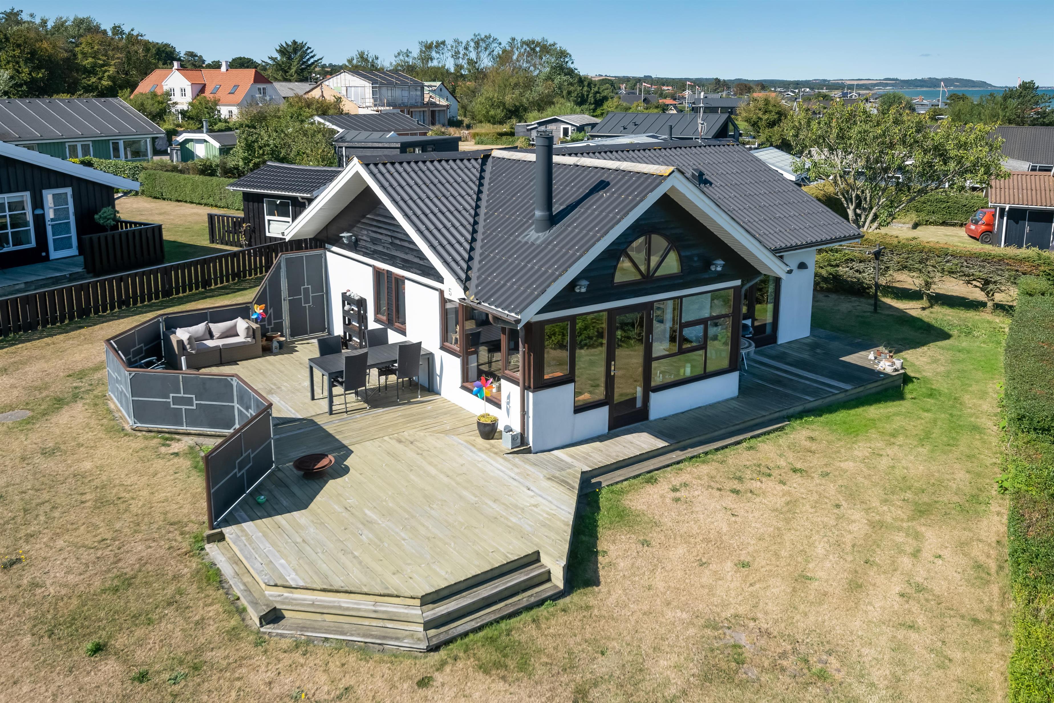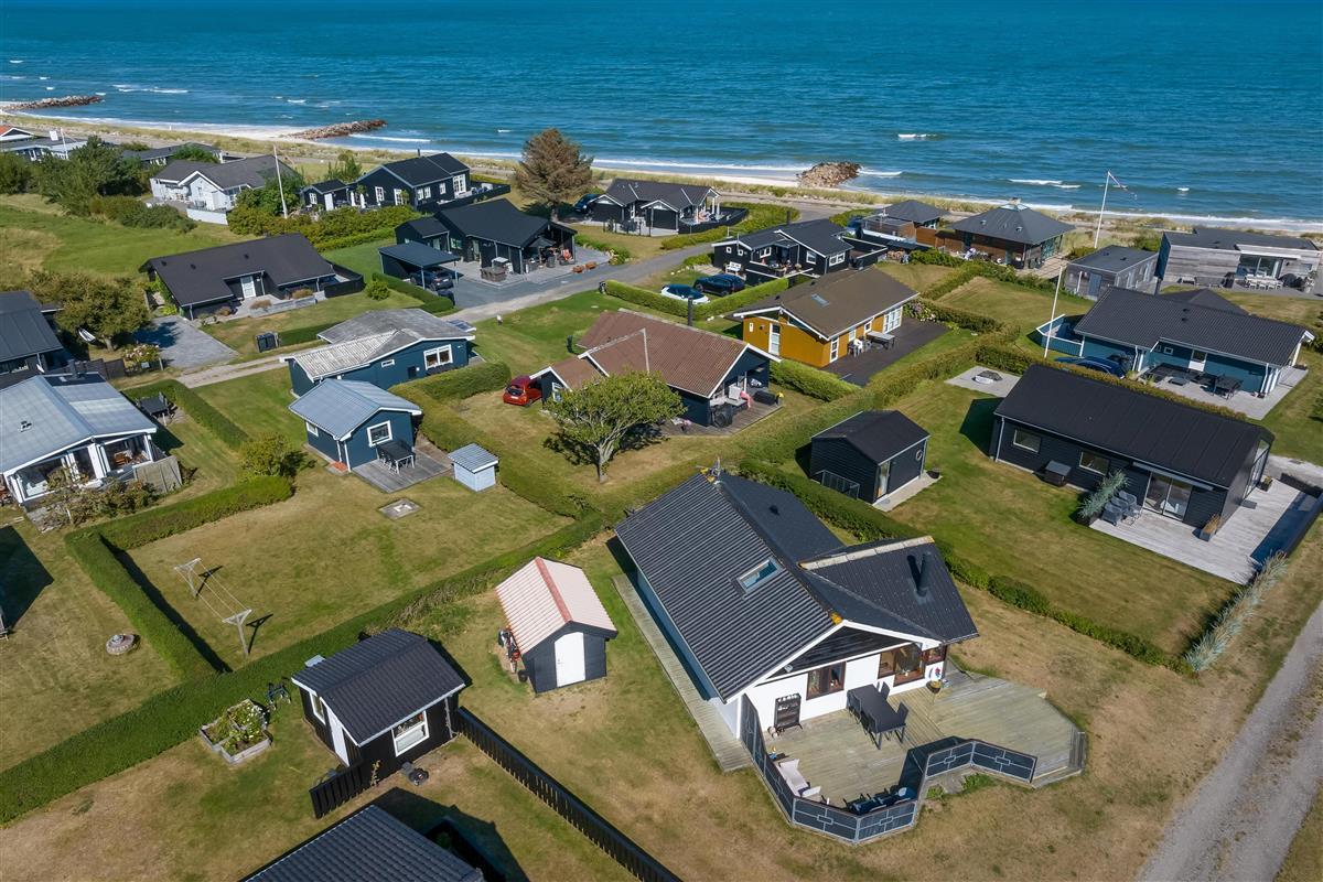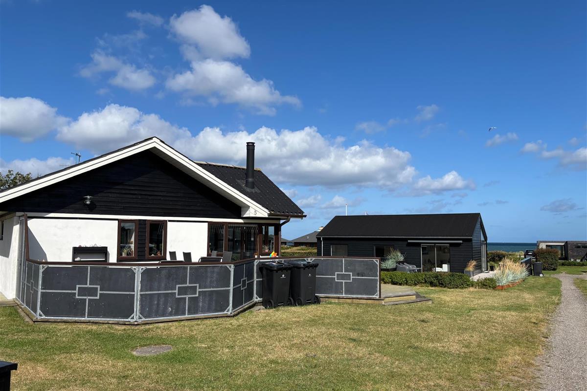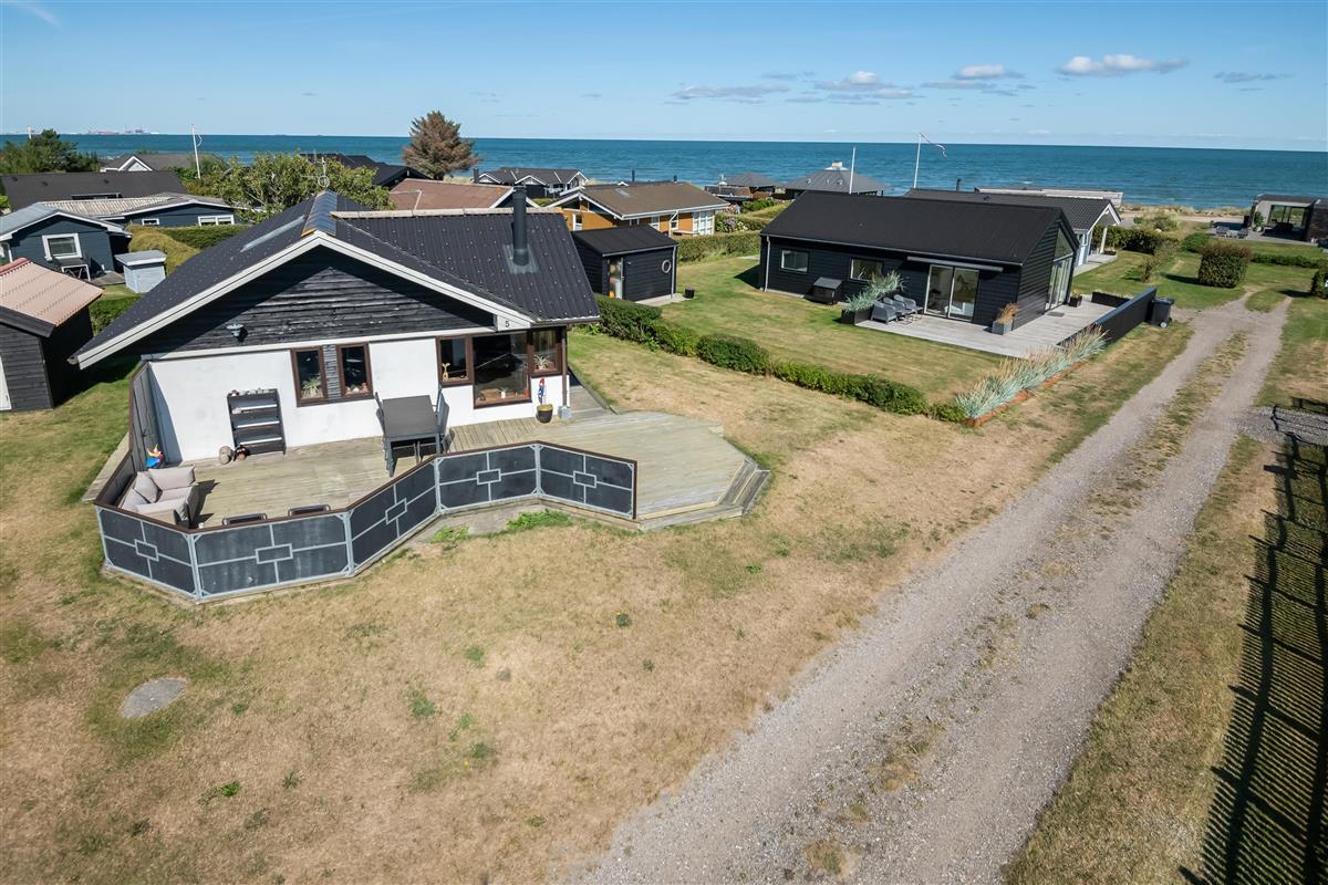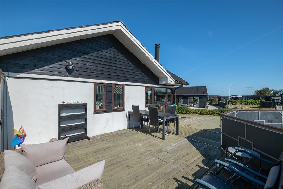 The kitchen and living room are open-plan, creating a beautiful maritime look with ship-style flooring, wooden kitchen, wooden doors, wood/metal staircase, and a carefully coordinated interior. Surrounding the entire house is a large wooden terrace with several cozy corners and access from both the living room and kitchen. The terrace is designed to allow wheelchair access from the driveway, although there are small doorsteps at the entrances. At the back of the house, there is an outdoor shower – perfect for rinsing off sand after a trip to the nearby Blue Flag beach.