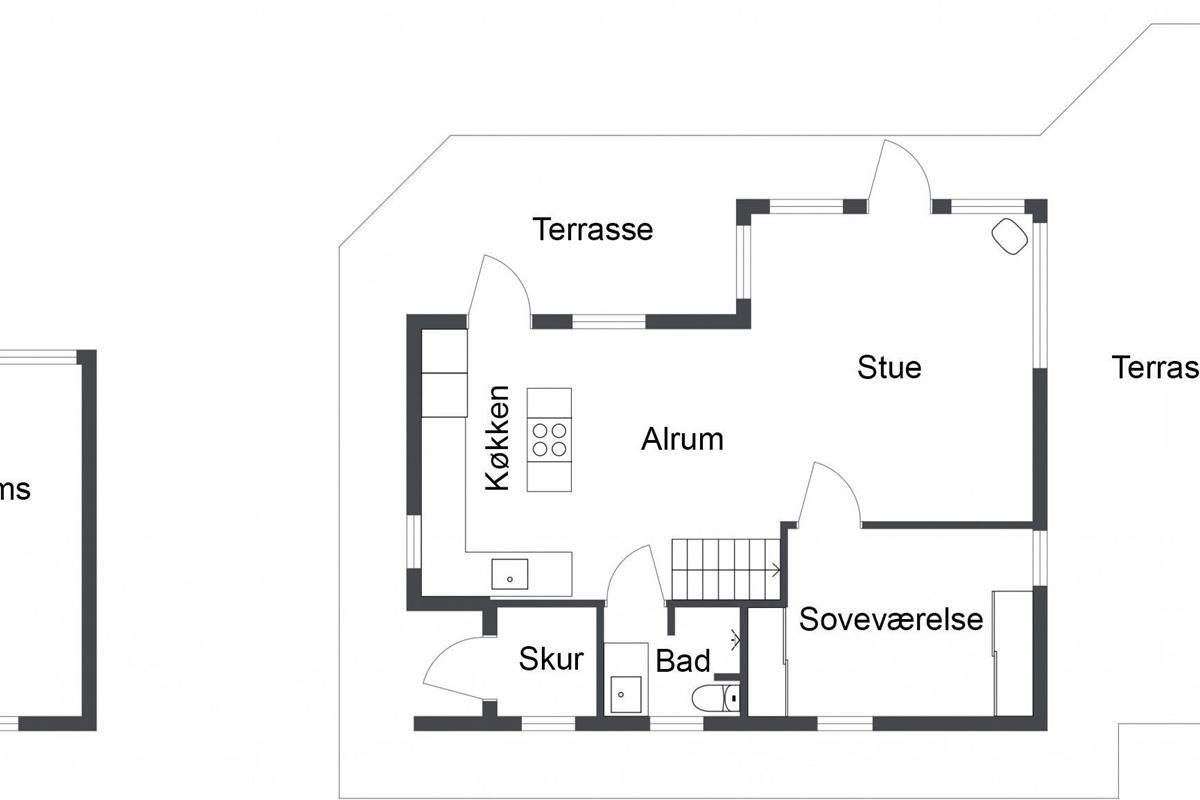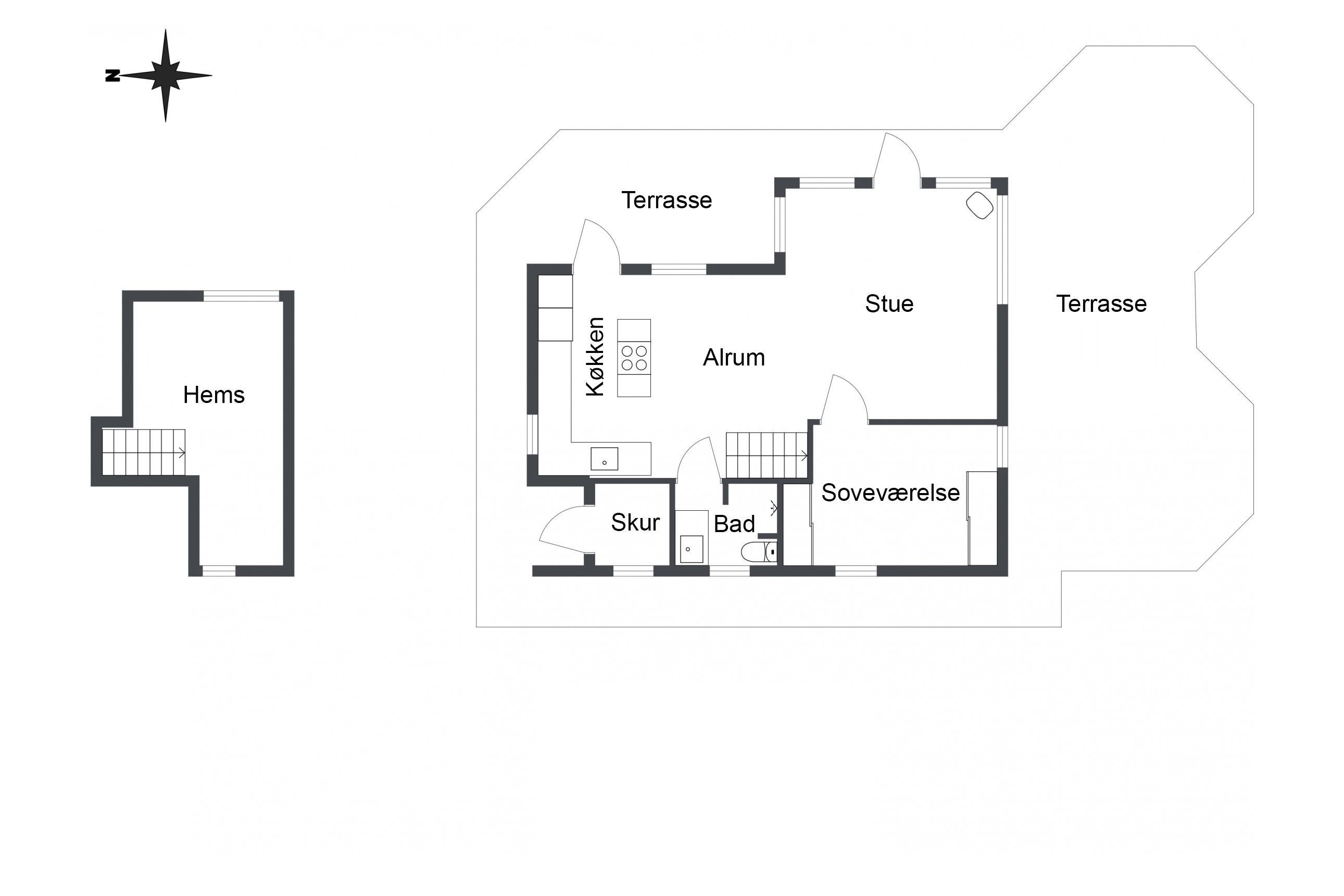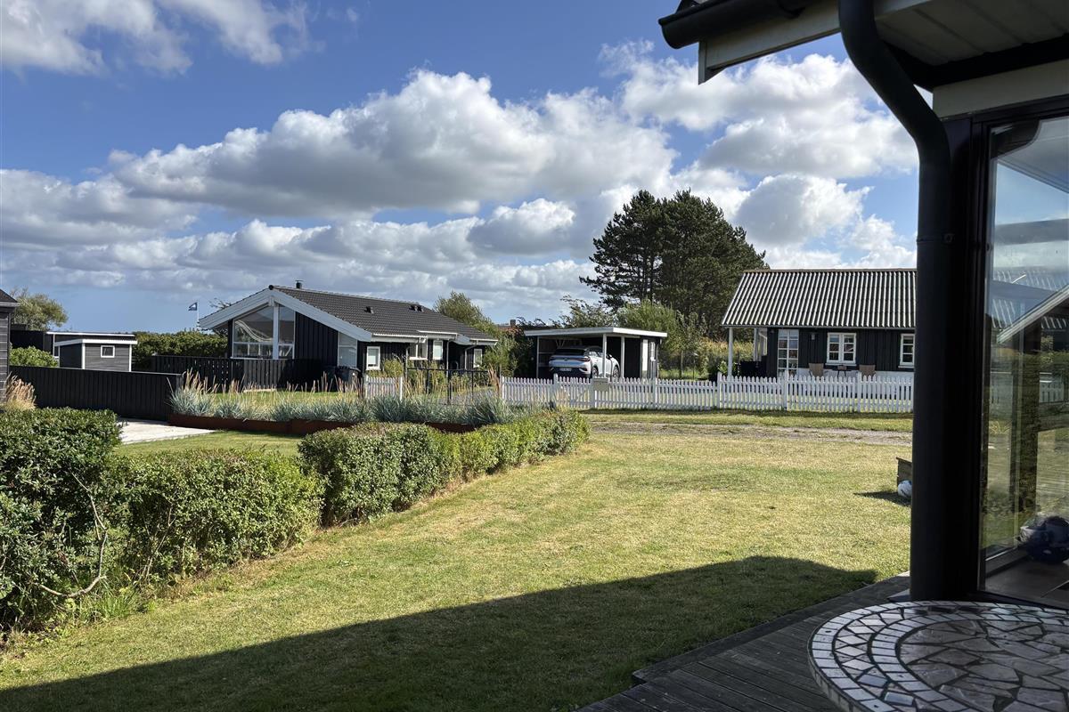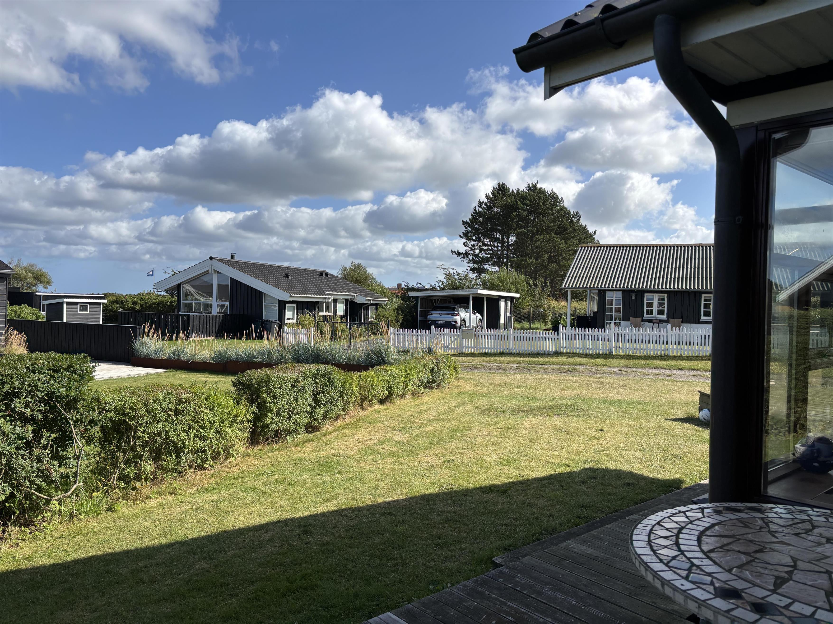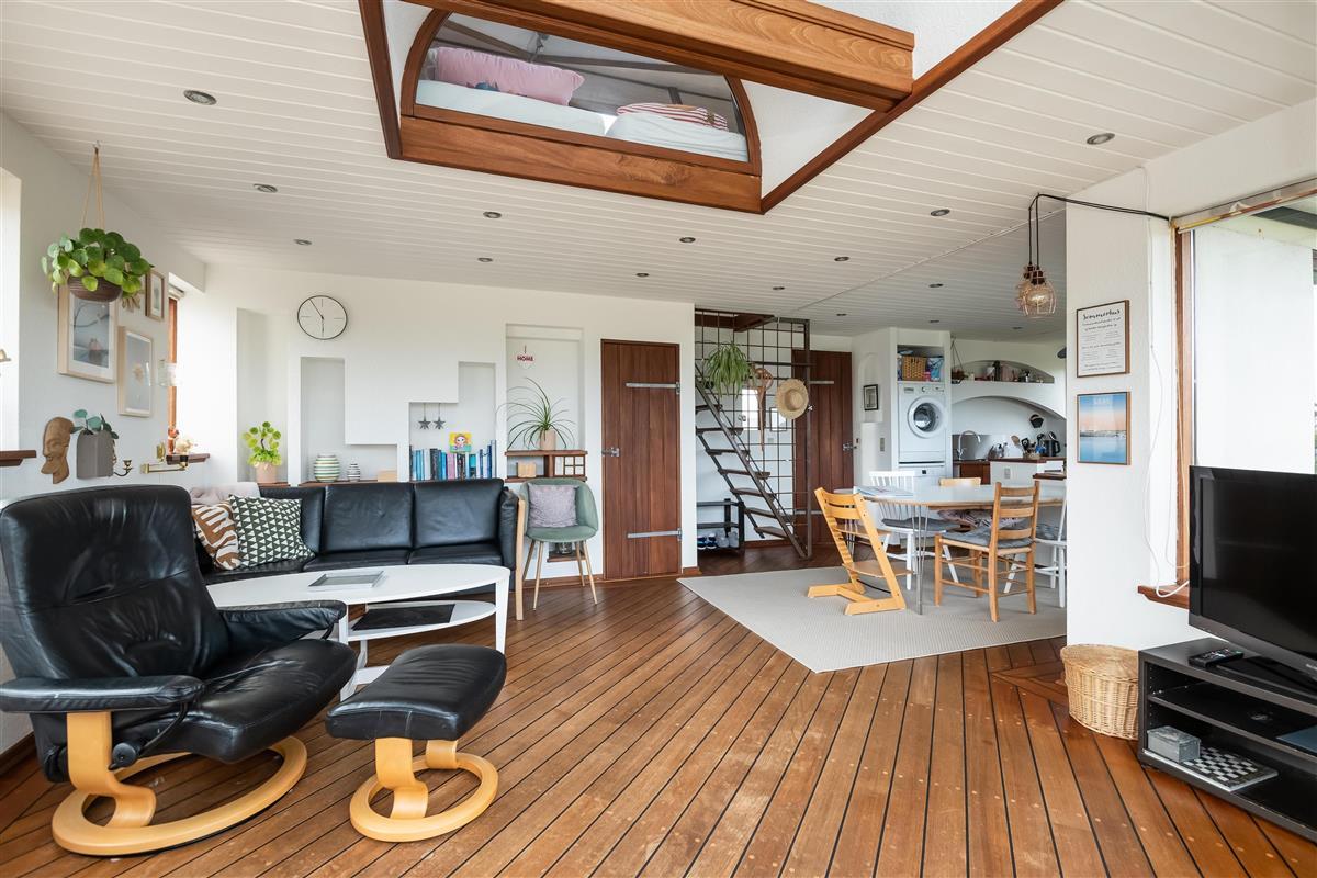 The kitchen and living room are open-plan, creating a beautiful maritime look with ship-style flooring, wooden kitchen, wooden doors, wood/metal staircase, and a carefully coordinated interior. Surrounding the entire house is a large wooden terrace with several cozy corners and access from both the living room and kitchen. The terrace is designed to allow wheelchair access from the driveway, although there are small doorsteps at the entrances. At the back of the house, there is an outdoor shower – perfect for rinsing off sand after a trip to the nearby Blue Flag beach.