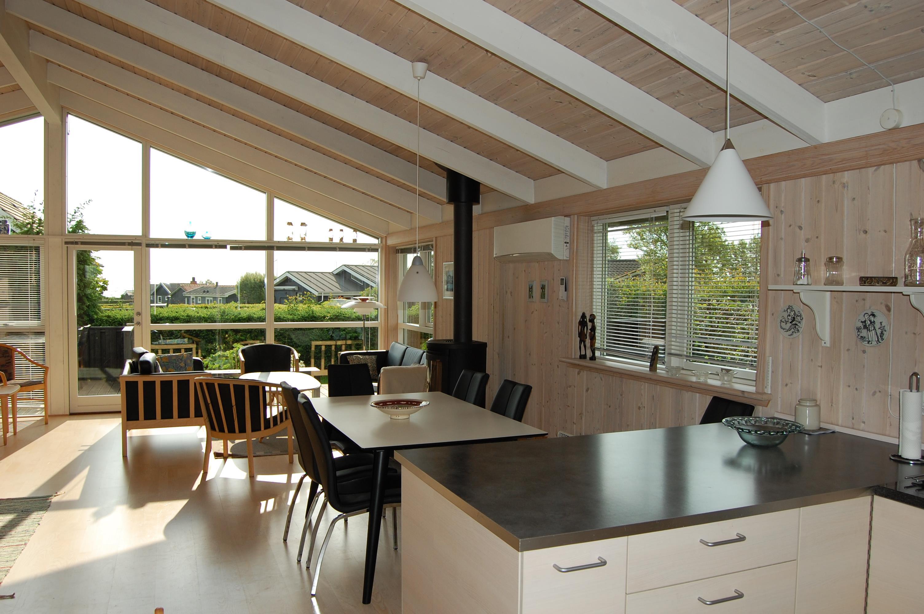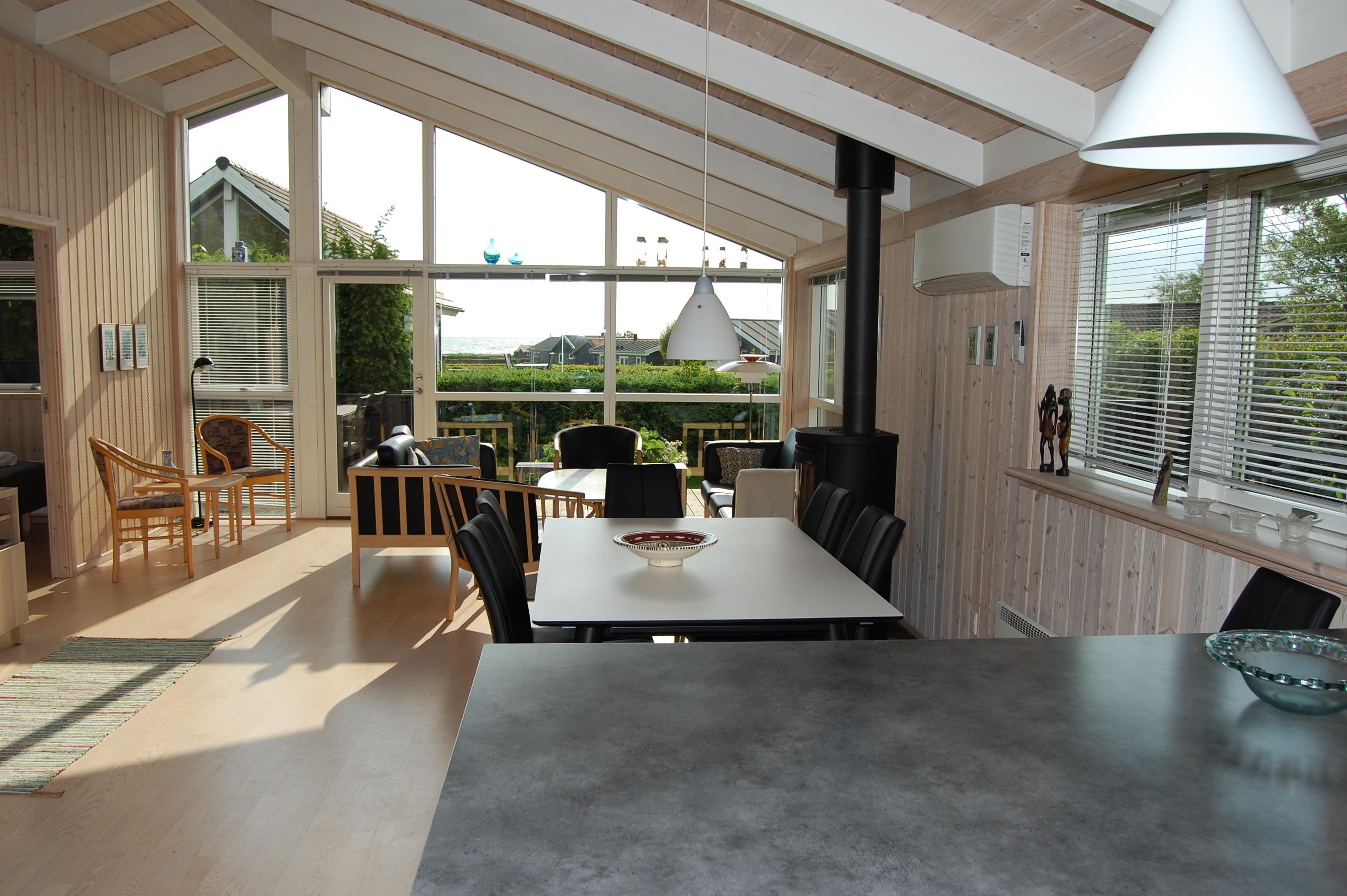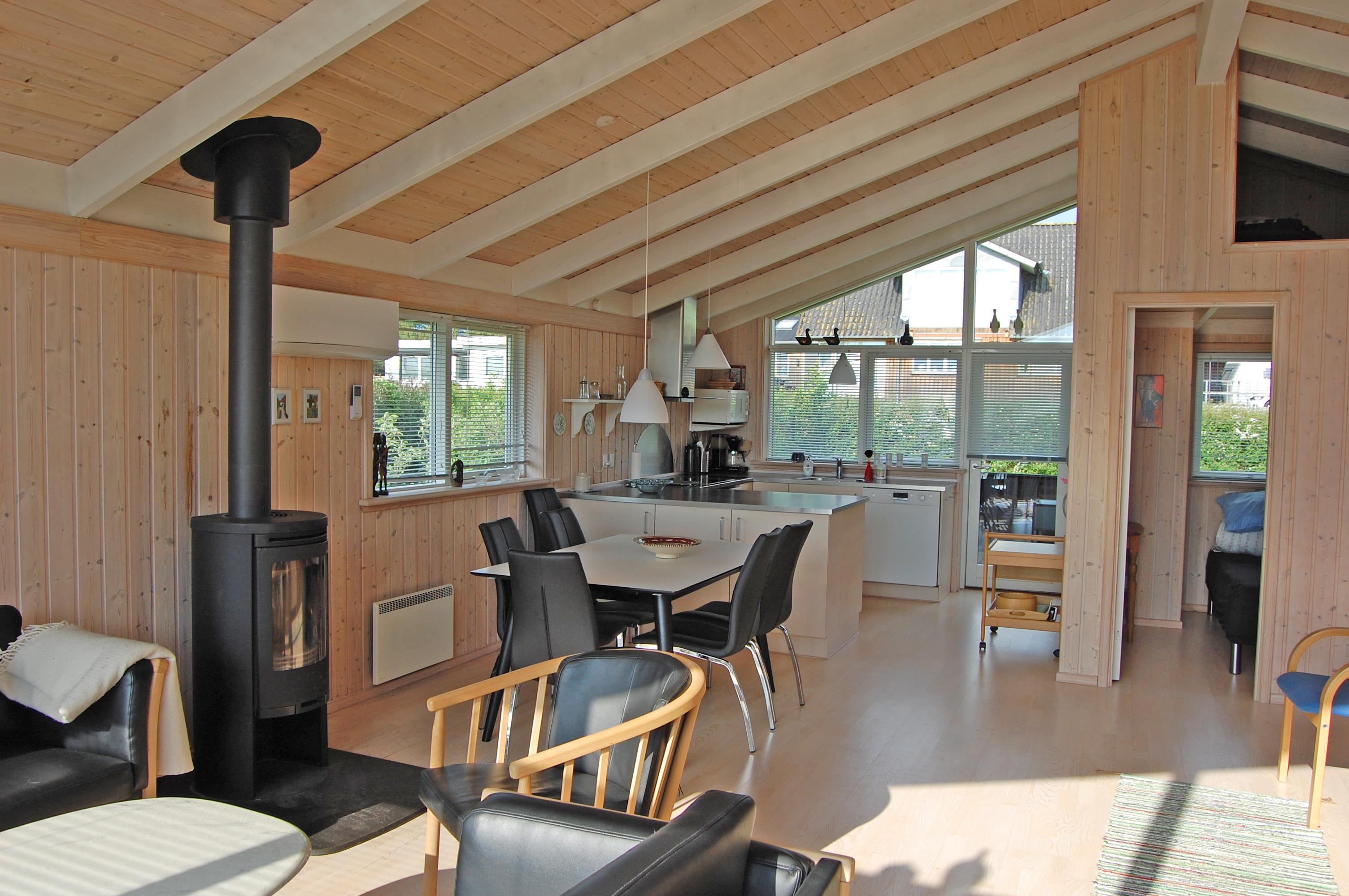 This newer and very beautiful house accommodates 6 people. The house is 73 m², built in 2011, and features light wood decor. It has a large, inviting kitchen/living room with a good dining area and a cozy corner with a wood stove for chilly days. Additionally, there are 3 bedrooms with either two 3/4 beds (140x200 cm) or a double bed (2 mattresses of 80 cm).