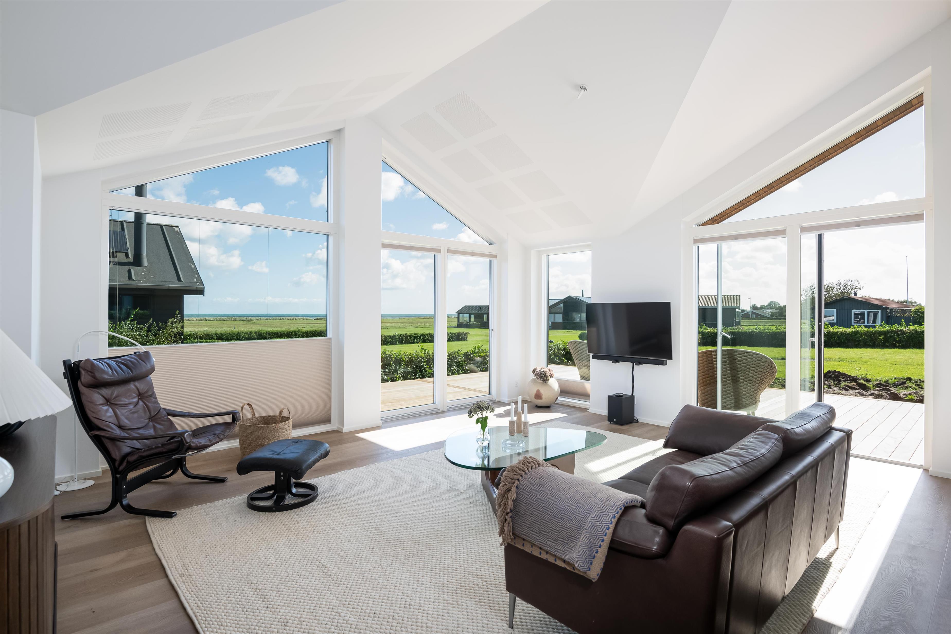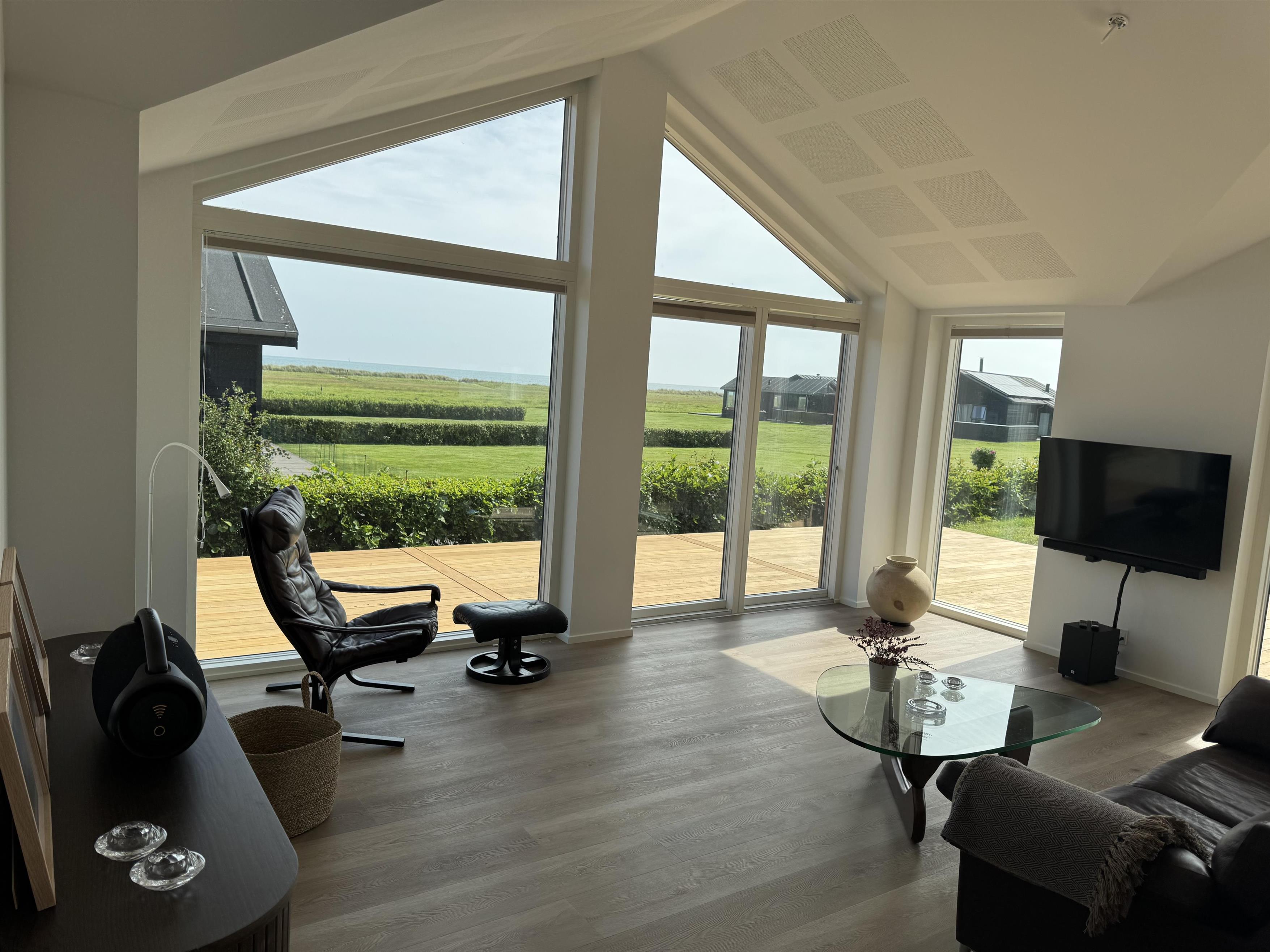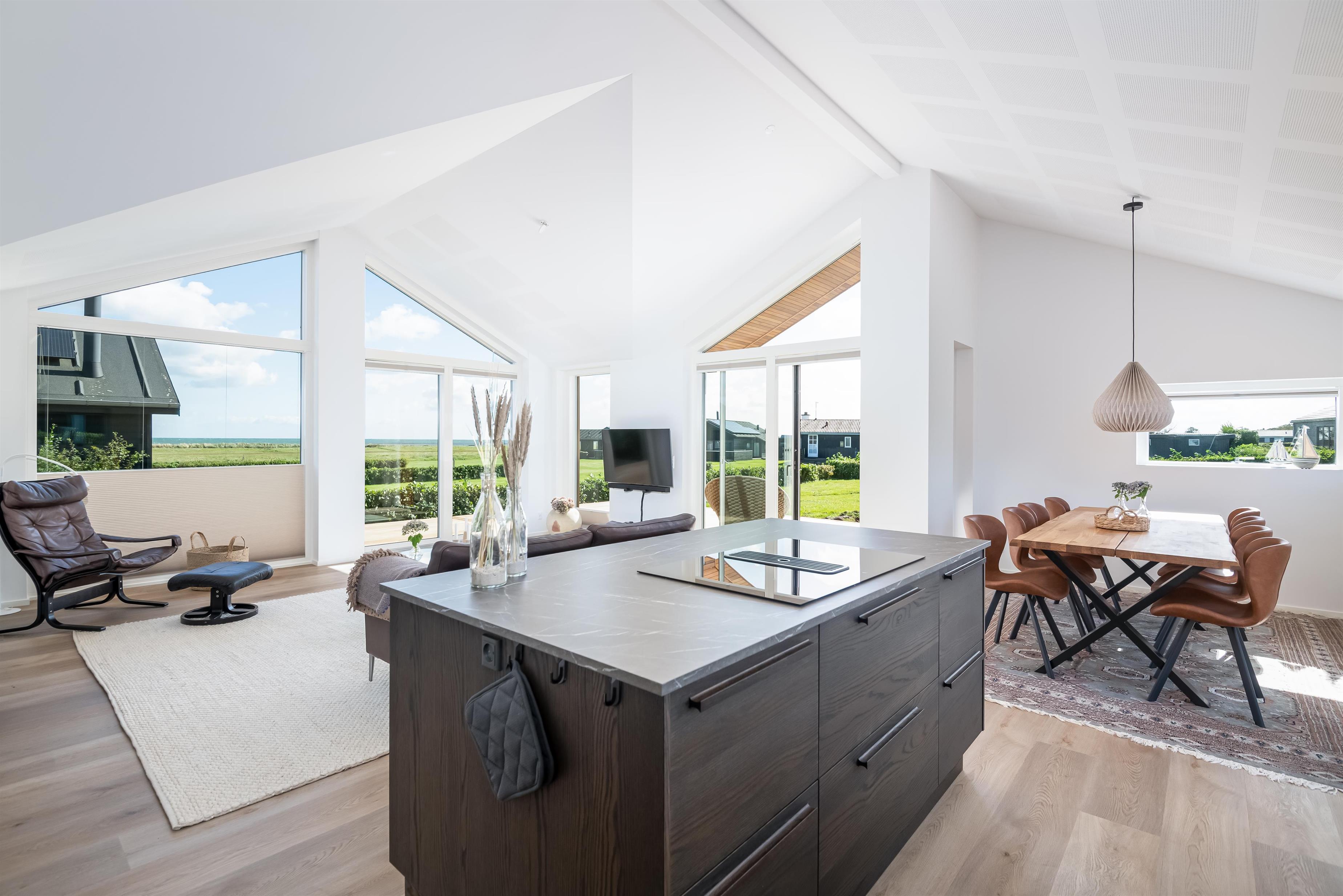 The main living area is bright and airy, with high ceilings and large windows facing the sea. There’s a cozy sofa corner and a dining area connected to the modern kitchen with an island – perfect for good meals and quality time together.