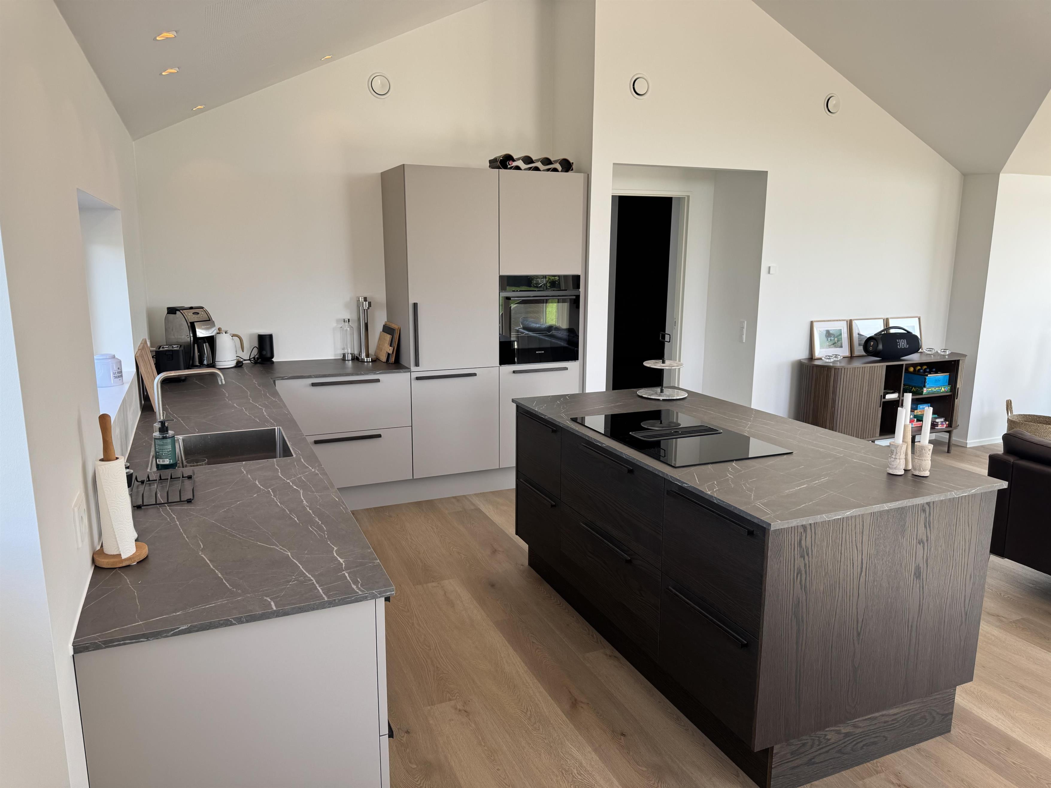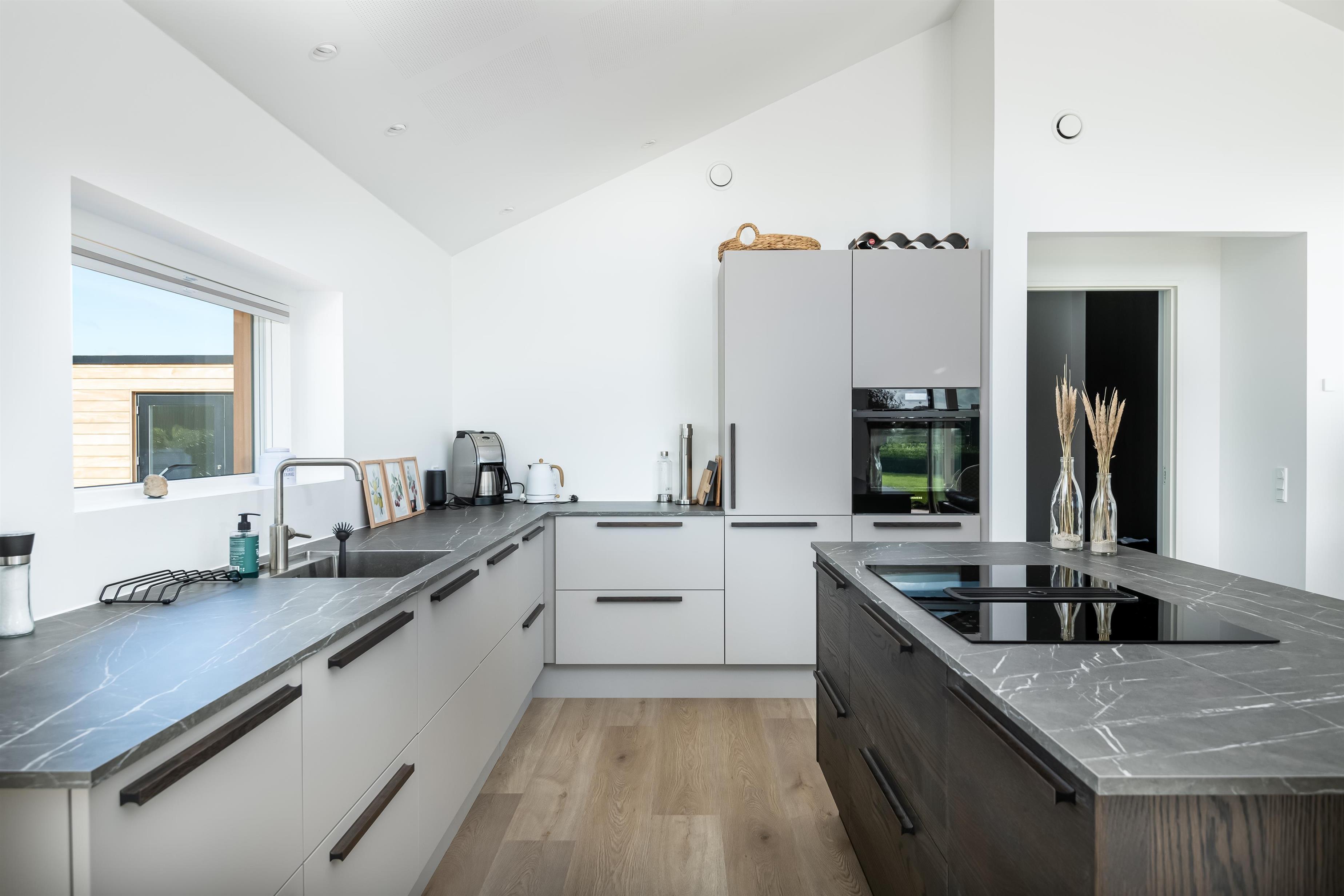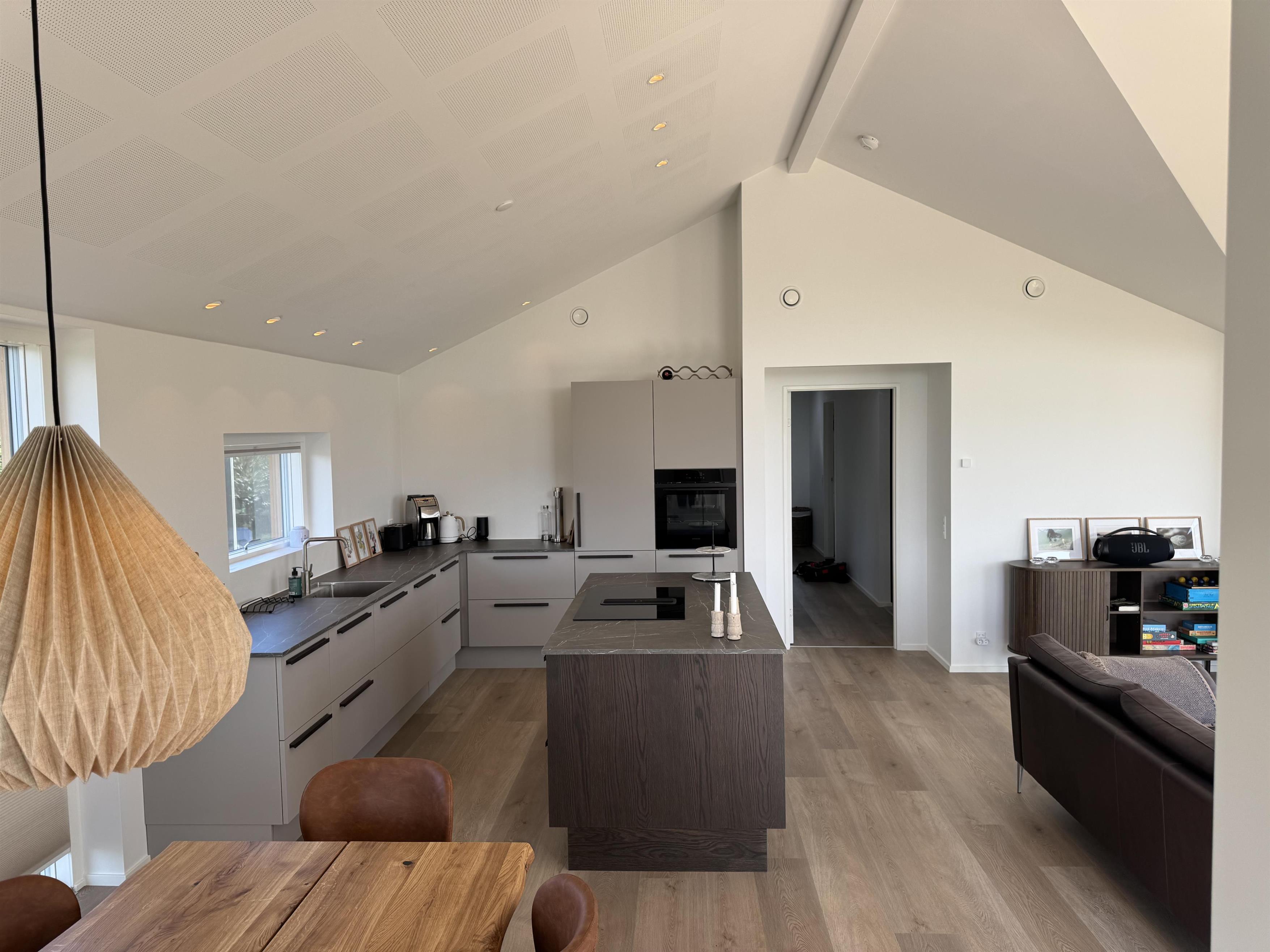 The main living area is bright and airy, with high ceilings and large windows facing the sea. There’s a cozy sofa corner and a dining area connected to the modern kitchen with an island – perfect for good meals and quality time together.