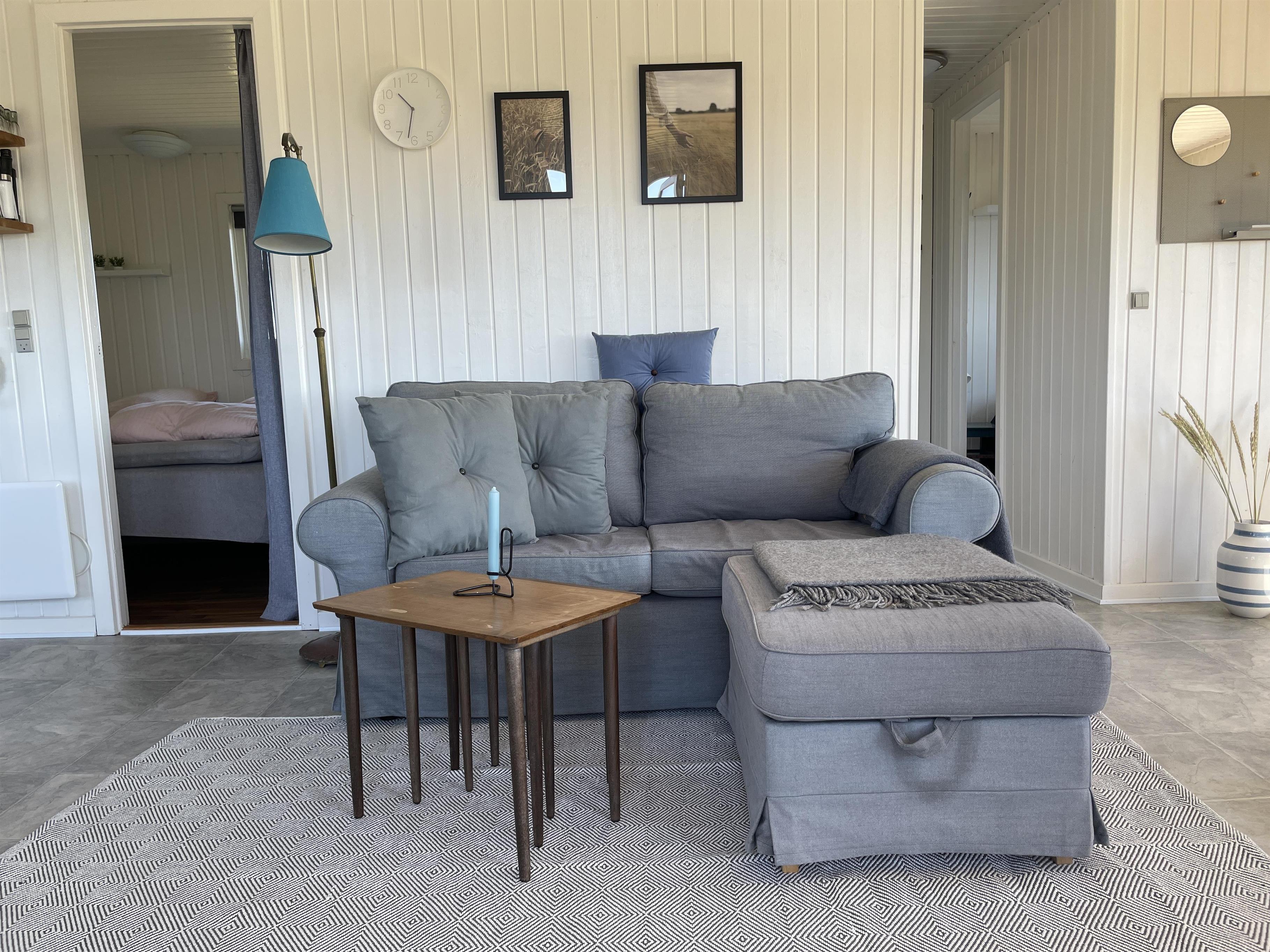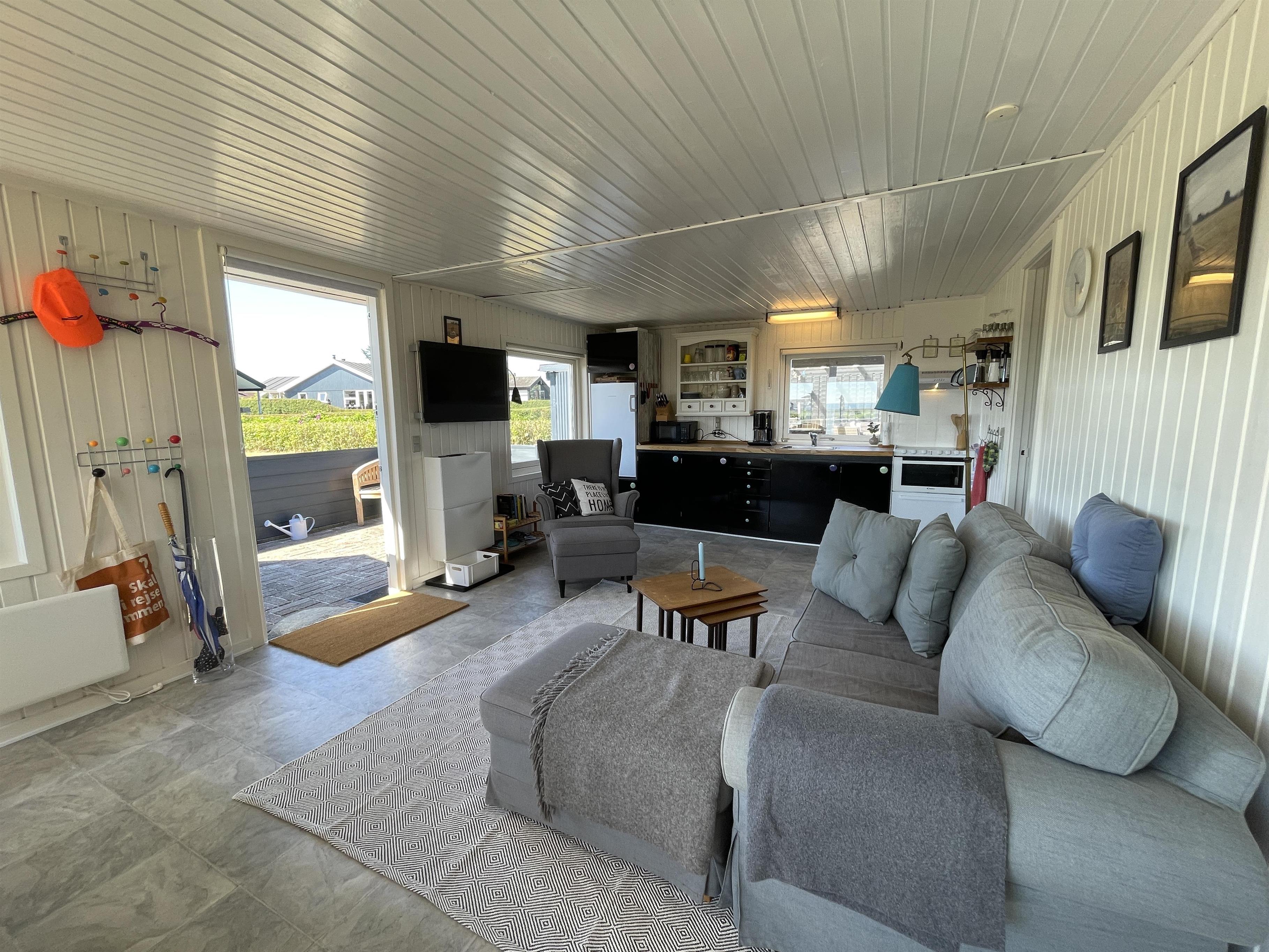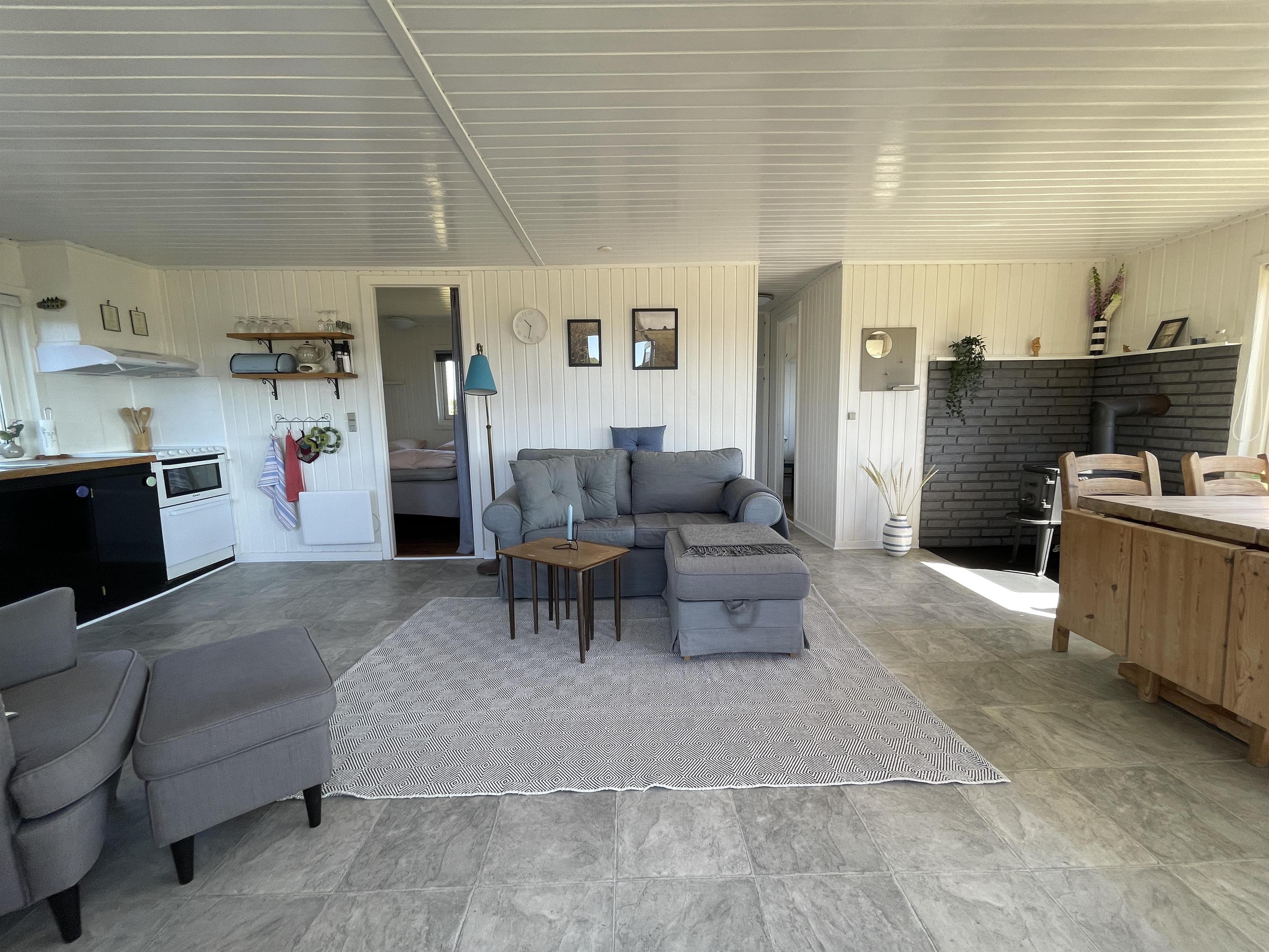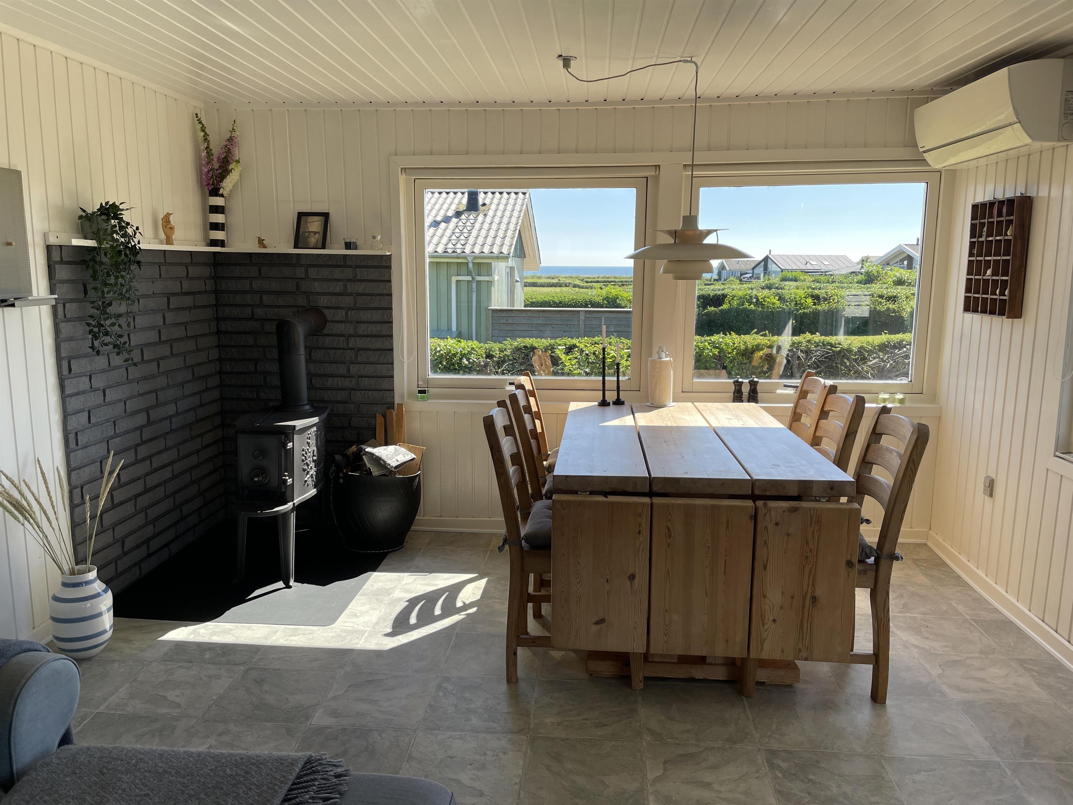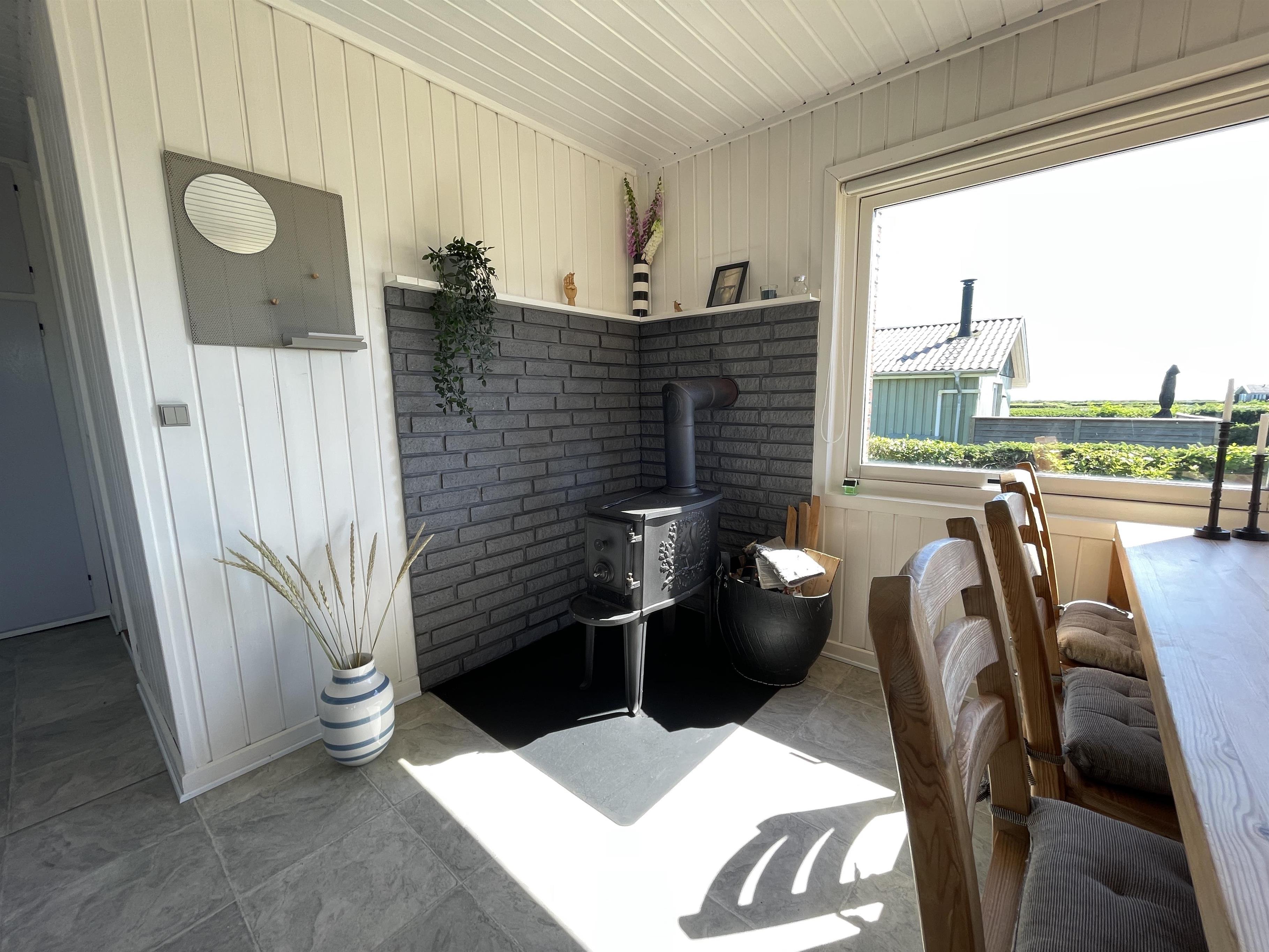 There are 2 bedrooms at opposite ends of the house, accommodating a total of 4 people. The kitchen is nice and equipped with everything you need to prepare and serve summer meals. The kitchen, living room, and dining area are well-connected in a large and bright space, with a wood-burning stove in one corner. There is a comfortable sofa and a good armchair in the living room, as well as a beautiful wooden dining table with a great view of the sea and the famous beautiful promenade that leads to the harbor in Sæby.