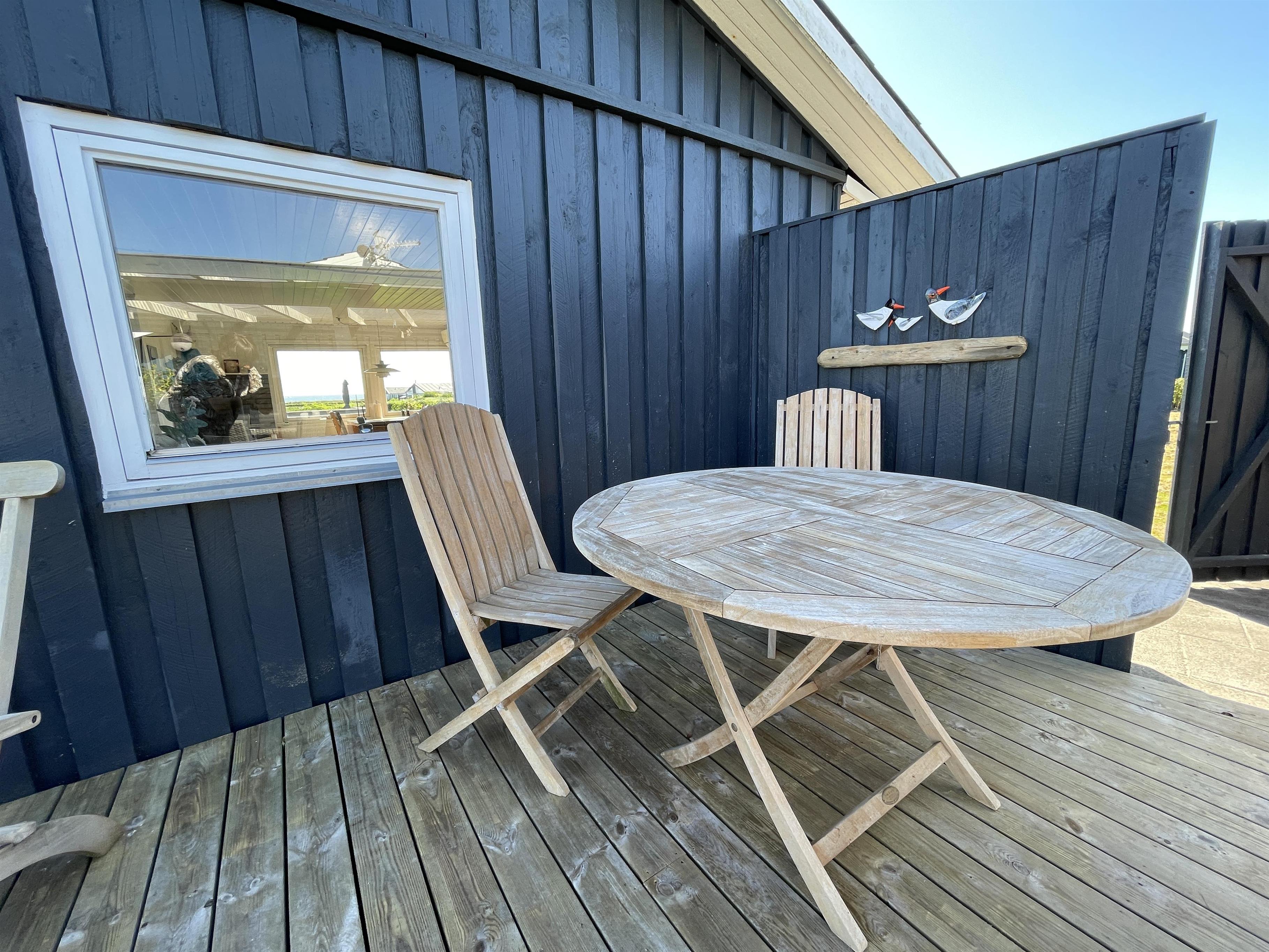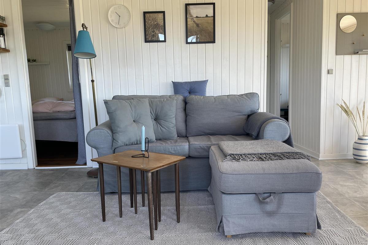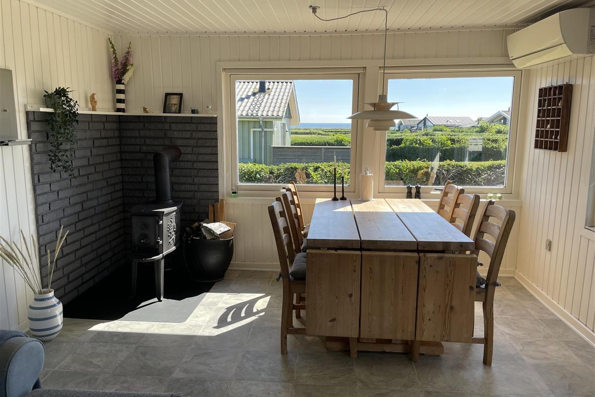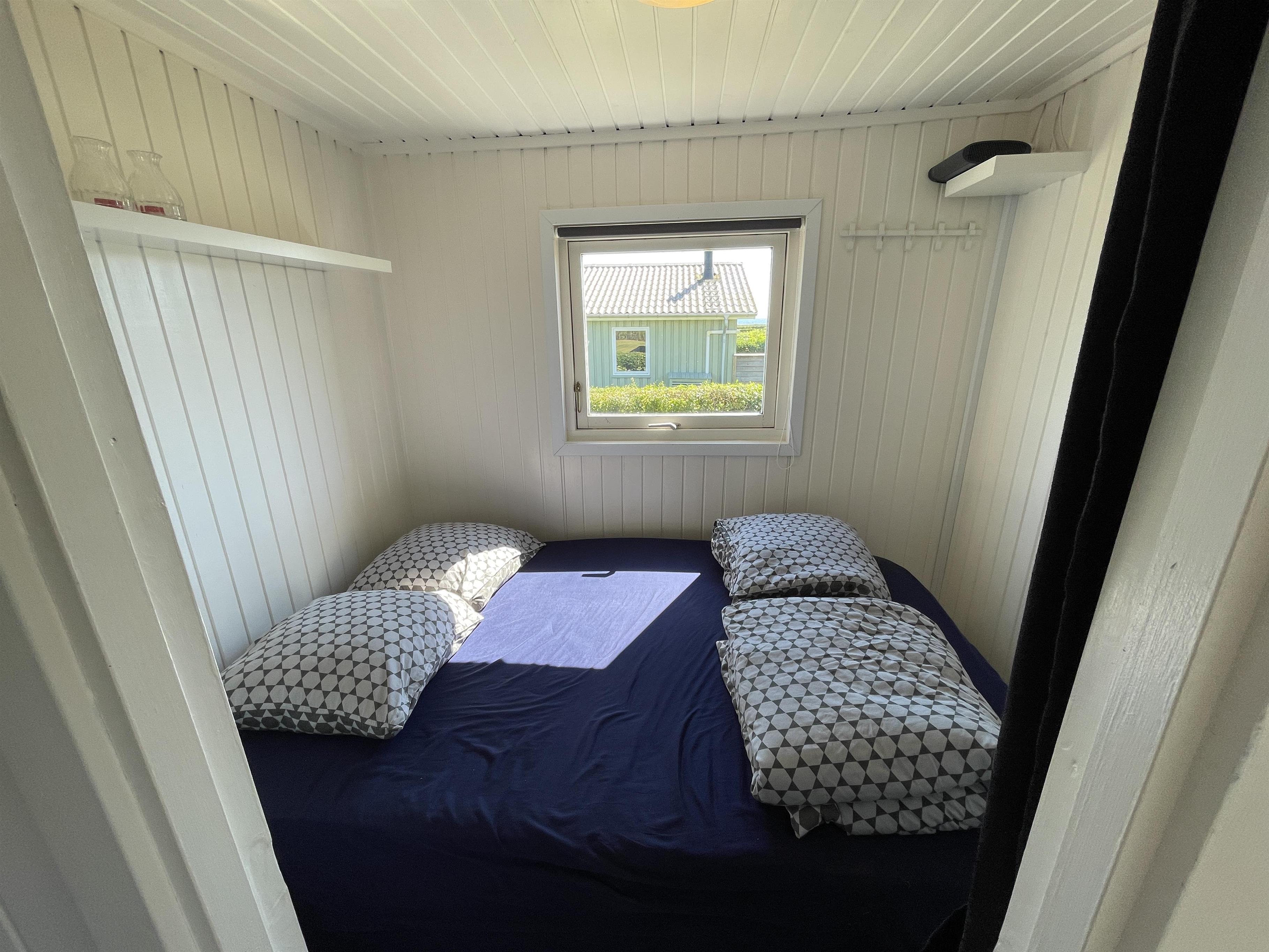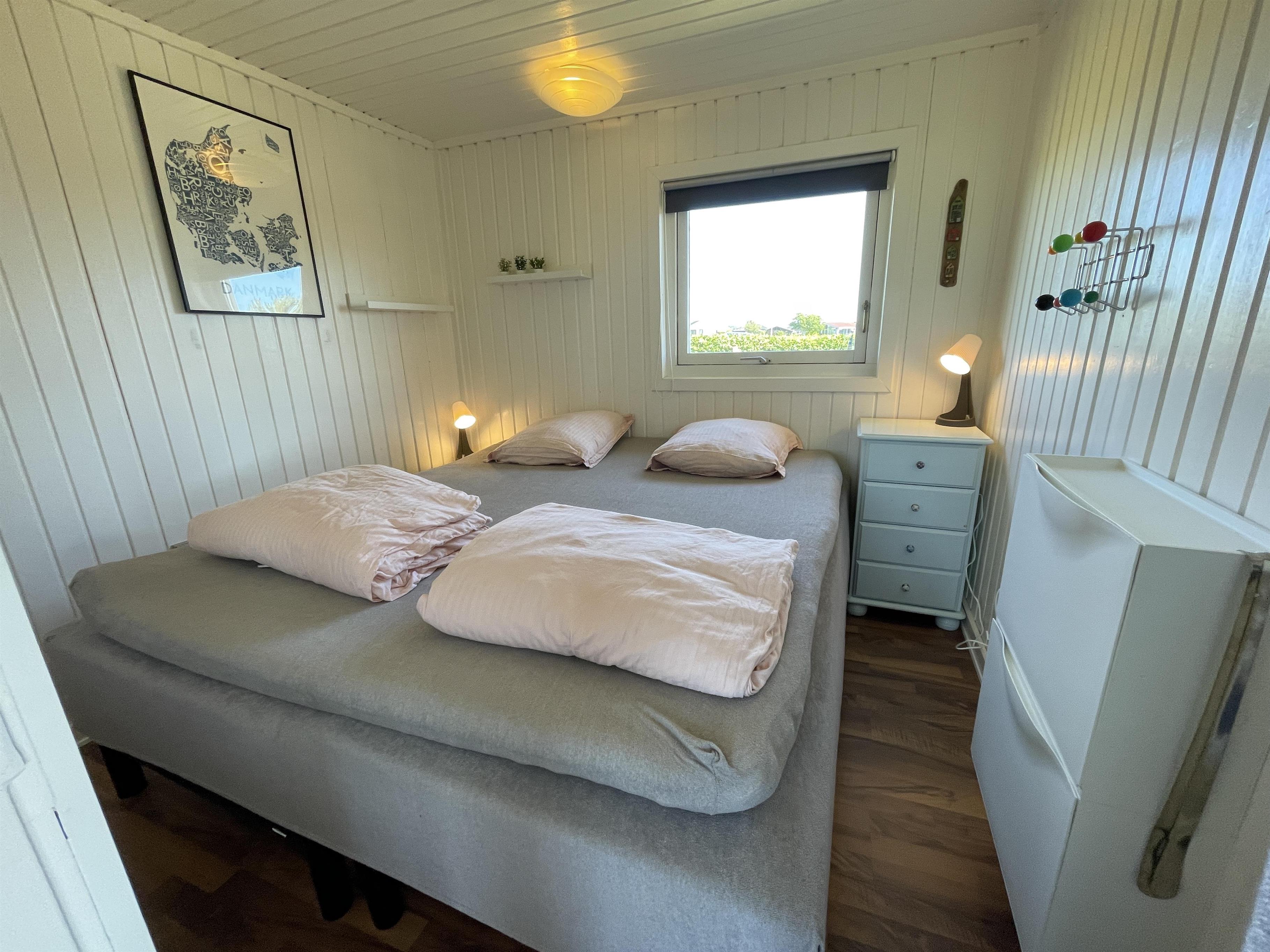 There are 2 bedrooms at opposite ends of the house, accommodating a total of 4 people. The kitchen is nice and equipped with everything you need to prepare and serve summer meals. The kitchen, living room, and dining area are well-connected in a large and bright space, with a wood-burning stove in one corner. There is a comfortable sofa and a good armchair in the living room, as well as a beautiful wooden dining table with a great view of the sea and the famous beautiful promenade that leads to the harbor in Sæby.