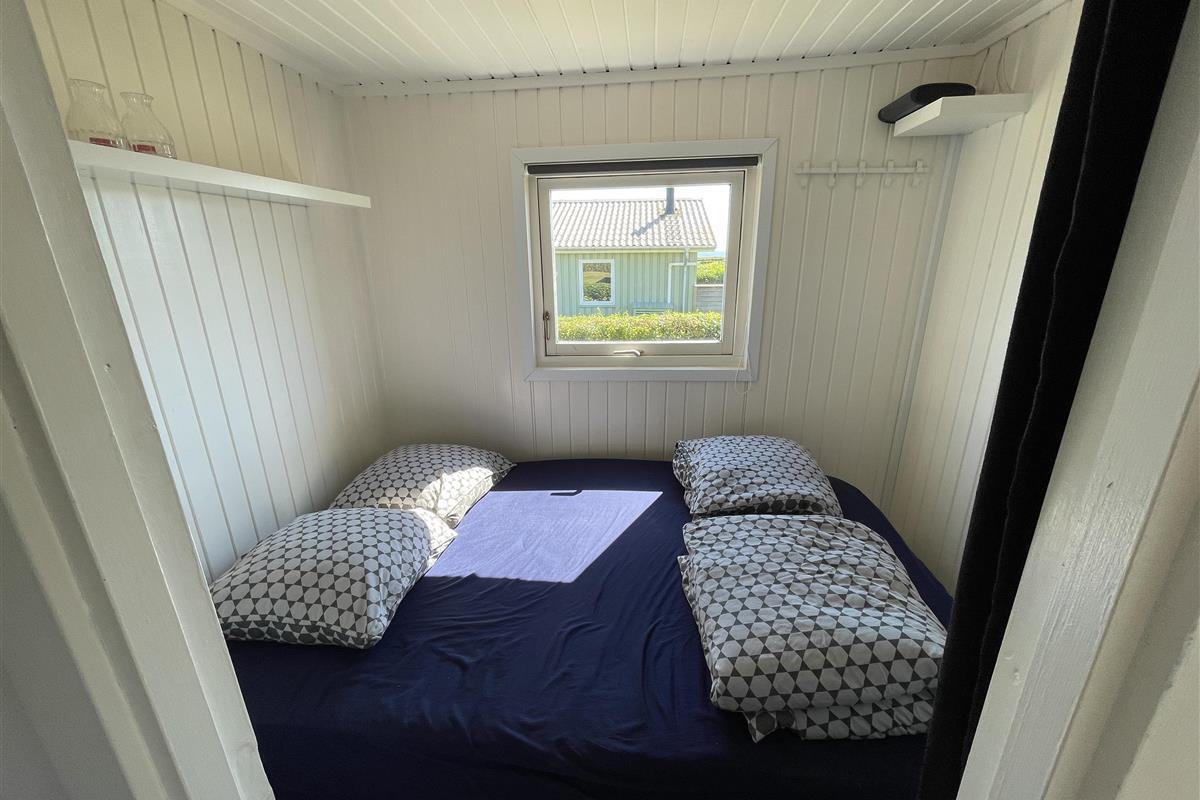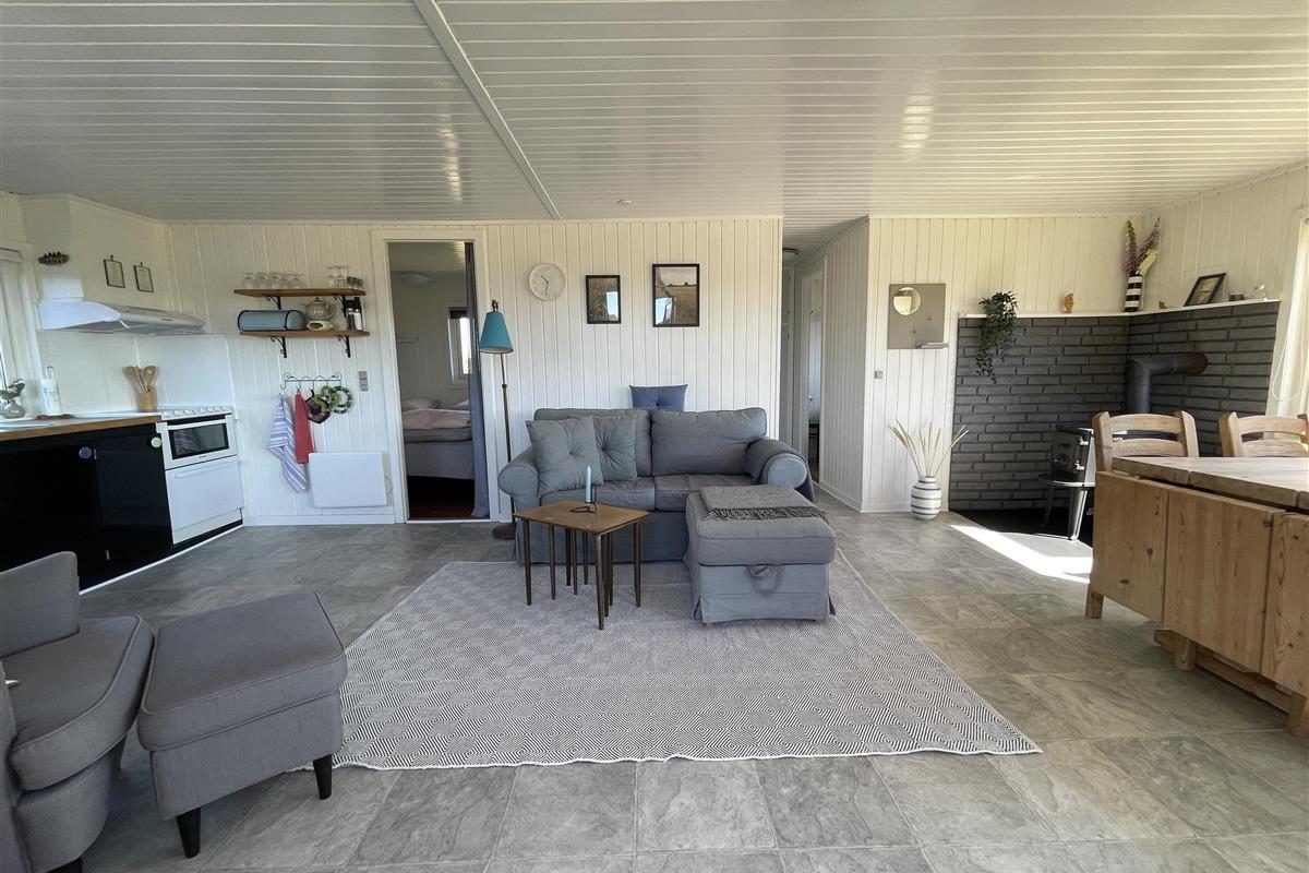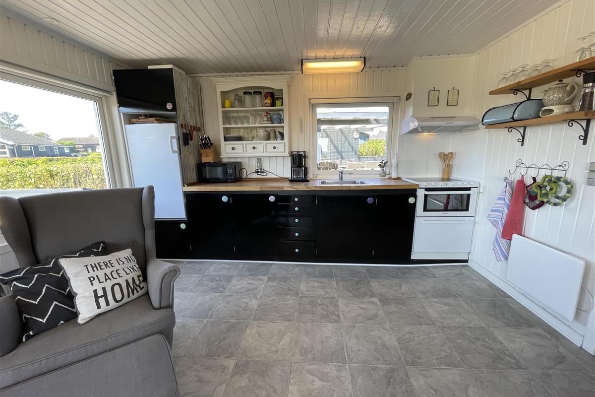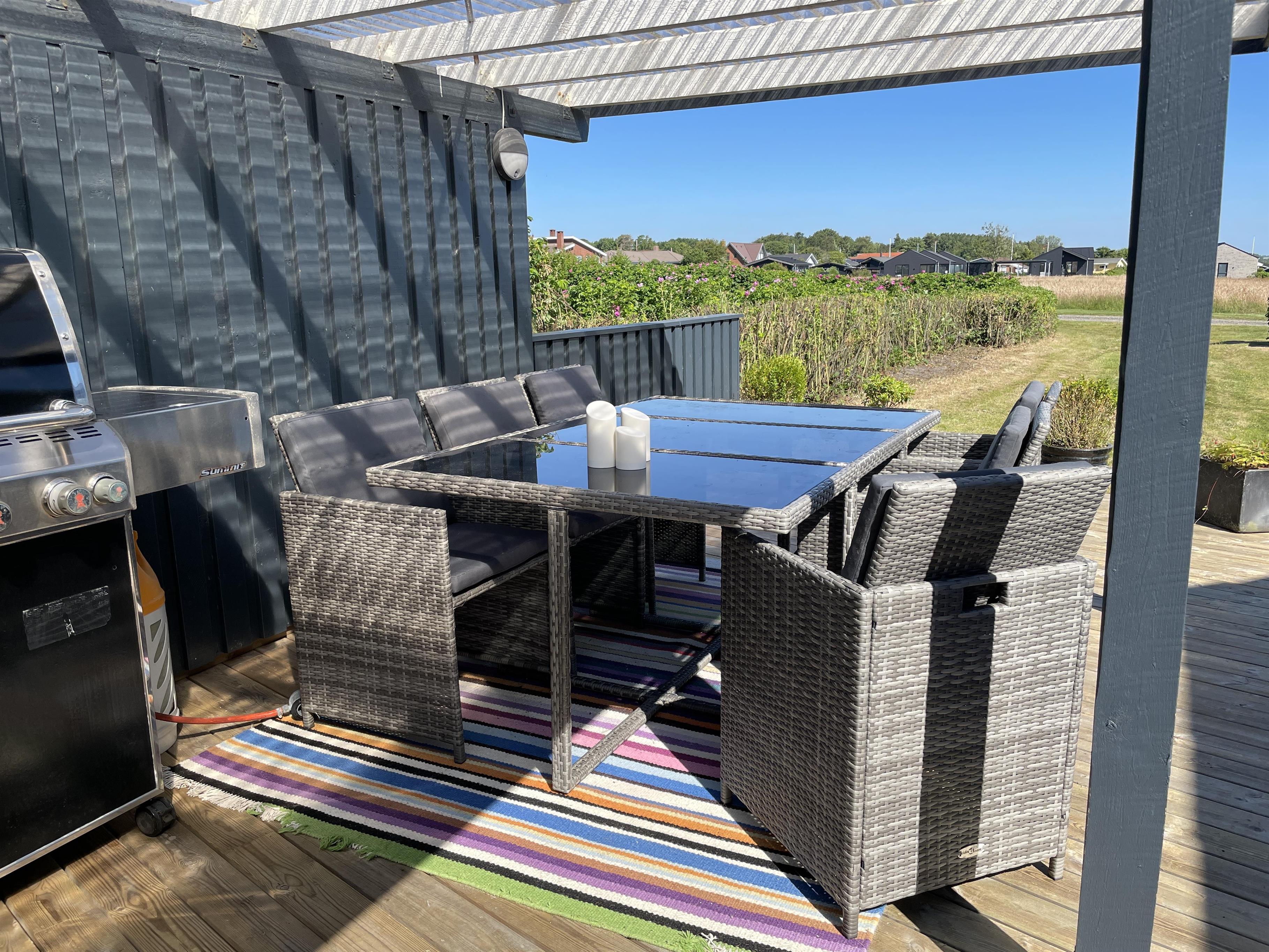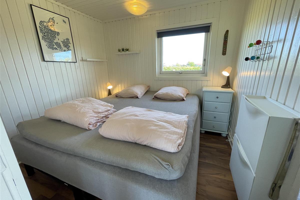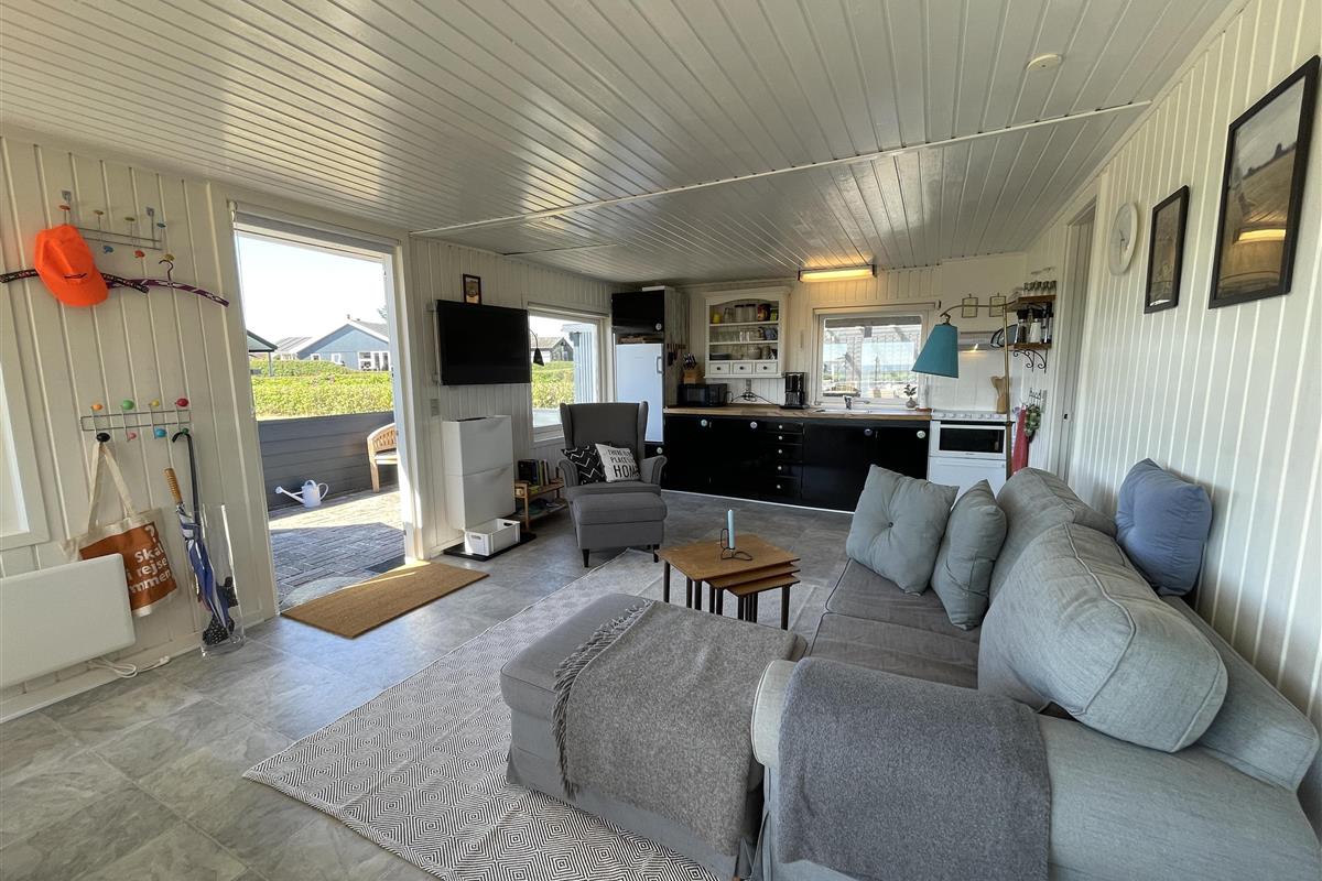 There are 2 bedrooms at opposite ends of the house, accommodating a total of 4 people. The kitchen is nice and equipped with everything you need to prepare and serve summer meals. The kitchen, living room, and dining area are well-connected in a large and bright space, with a wood-burning stove in one corner. There is a comfortable sofa and a good armchair in the living room, as well as a beautiful wooden dining table with a great view of the sea and the famous beautiful promenade that leads to the harbor in Sæby.