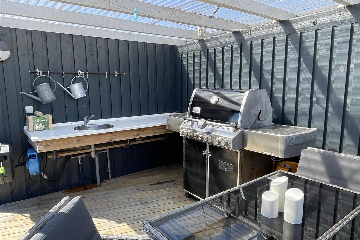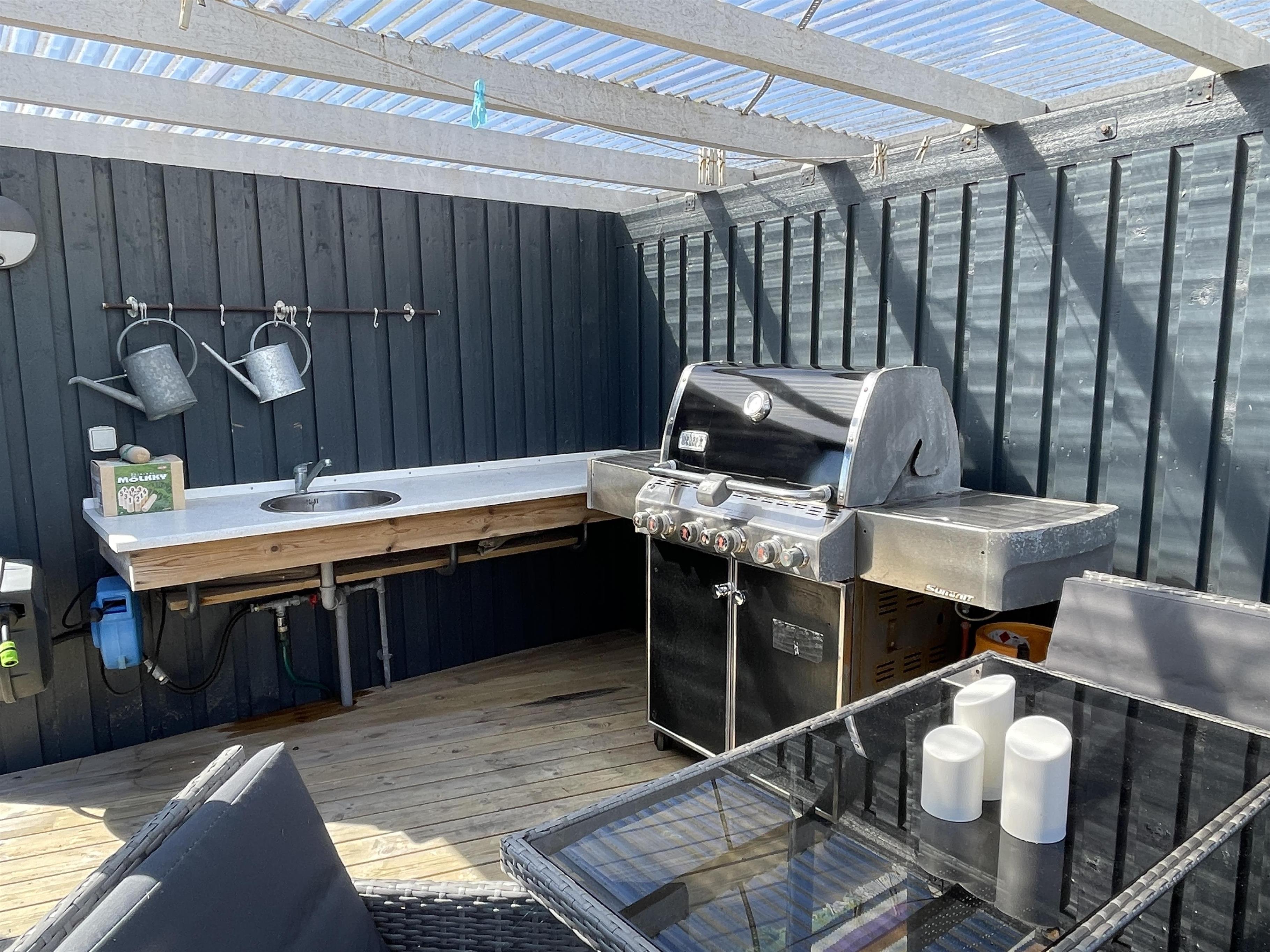 There is an outdoor shower and an outdoor kitchen with water connected to the evening terrace.
