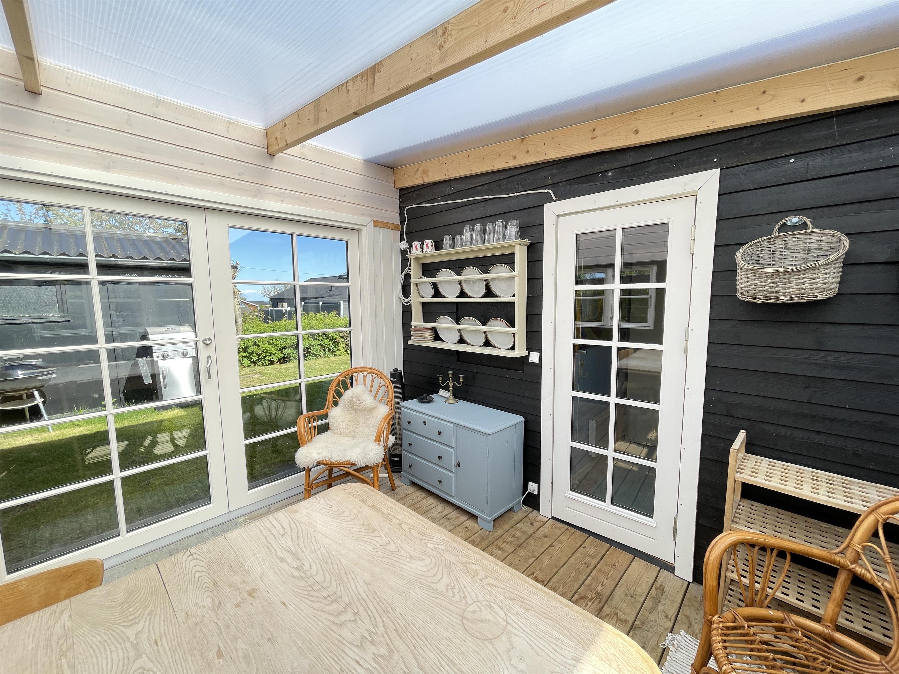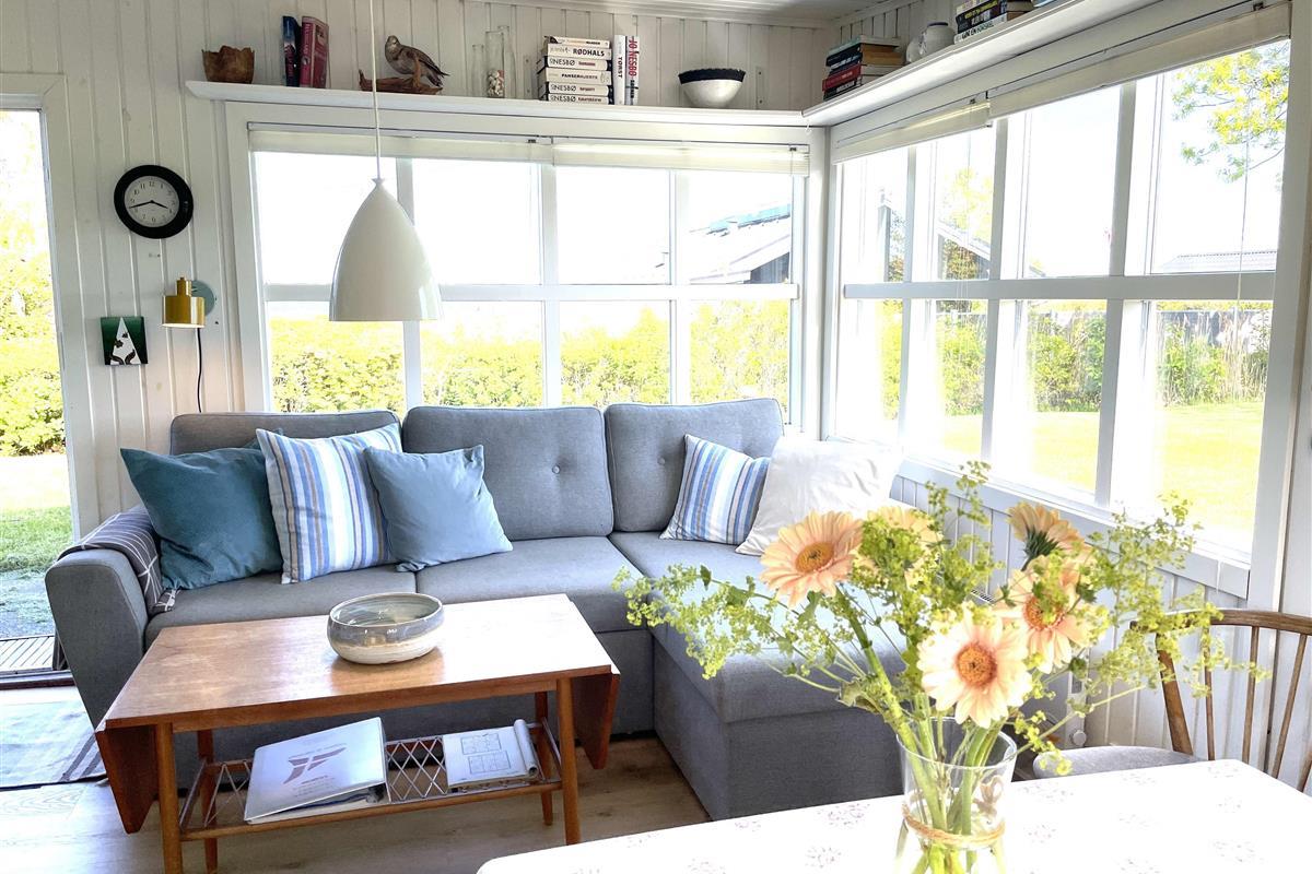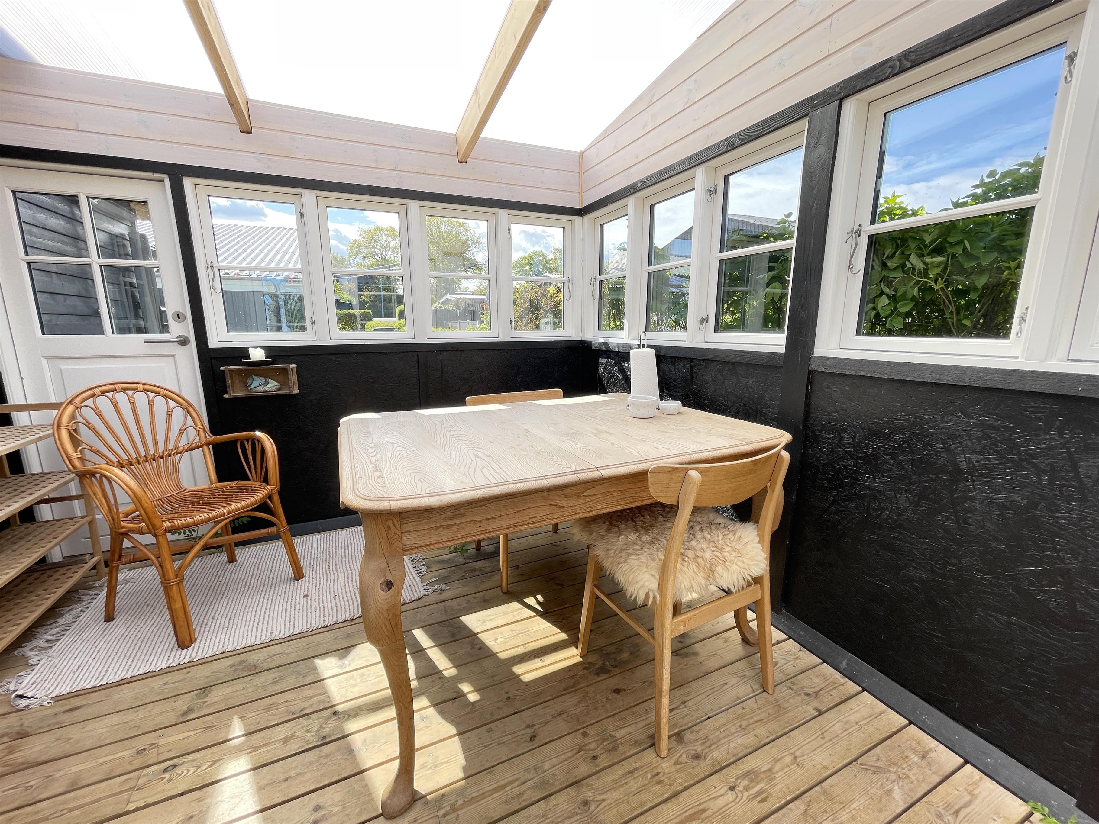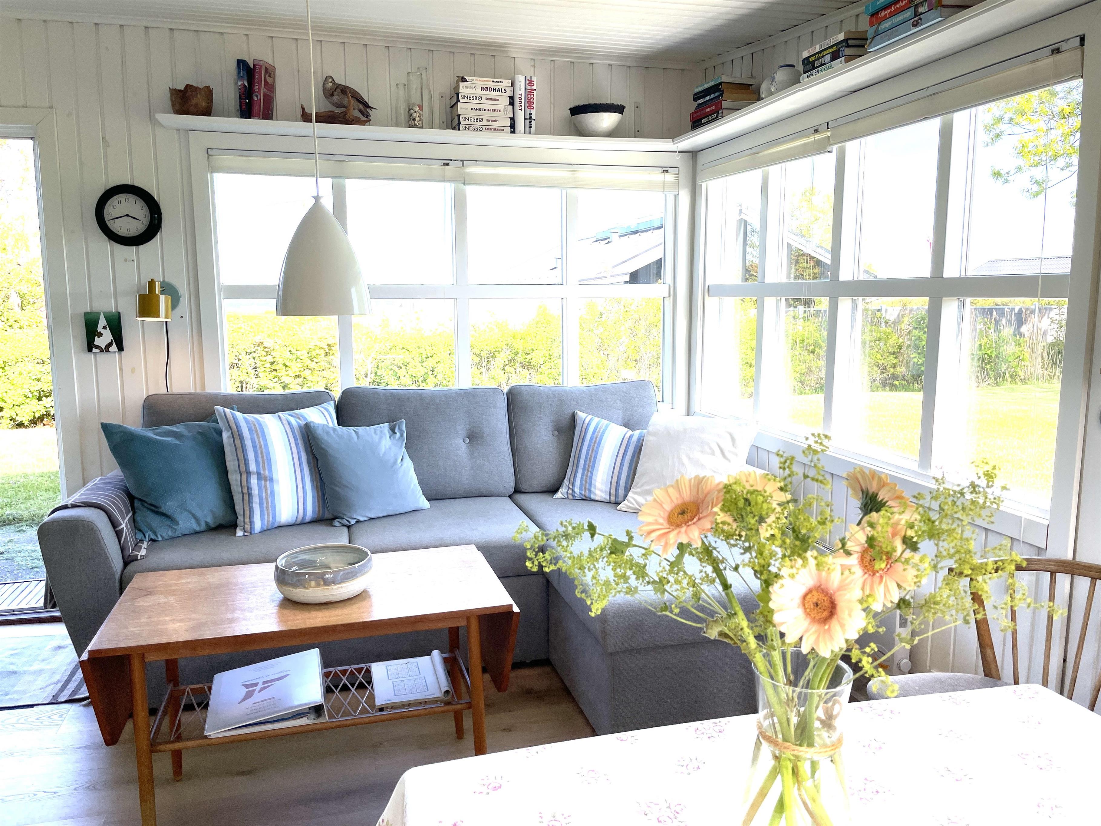 The living area has been beautifully renovated with a new floor and new furniture. It radiates charm and comfort, with a dining nook and a lovely sofa placed in the bay window. From here, you can enjoy views of the Kattegat Sea, just 200 meters away, and the peaceful natural surroundings. Attached to the house is a wonderful little sunroom.