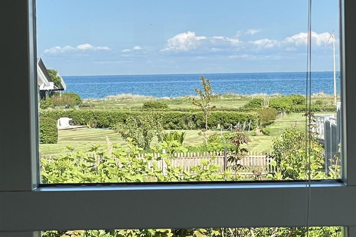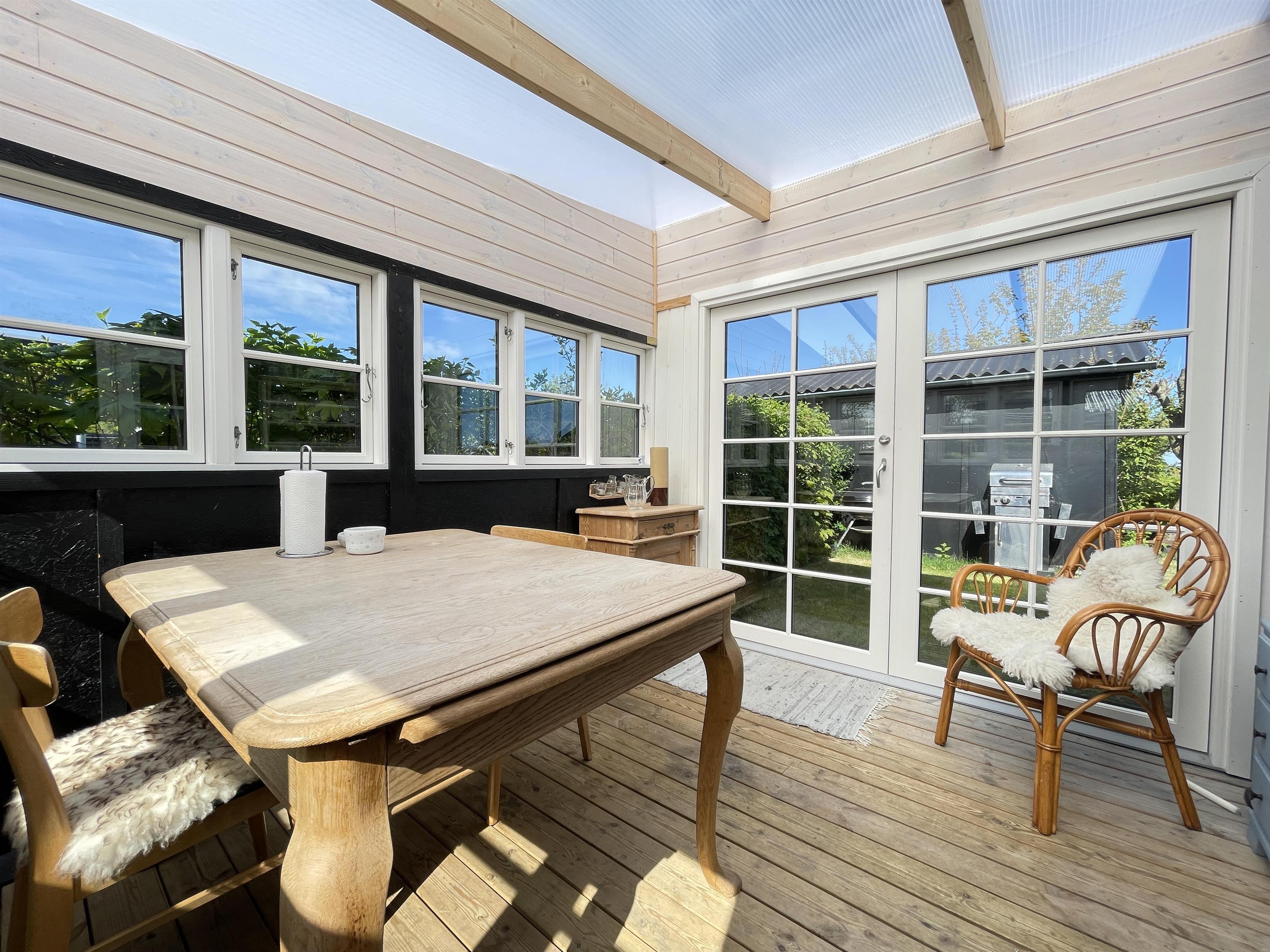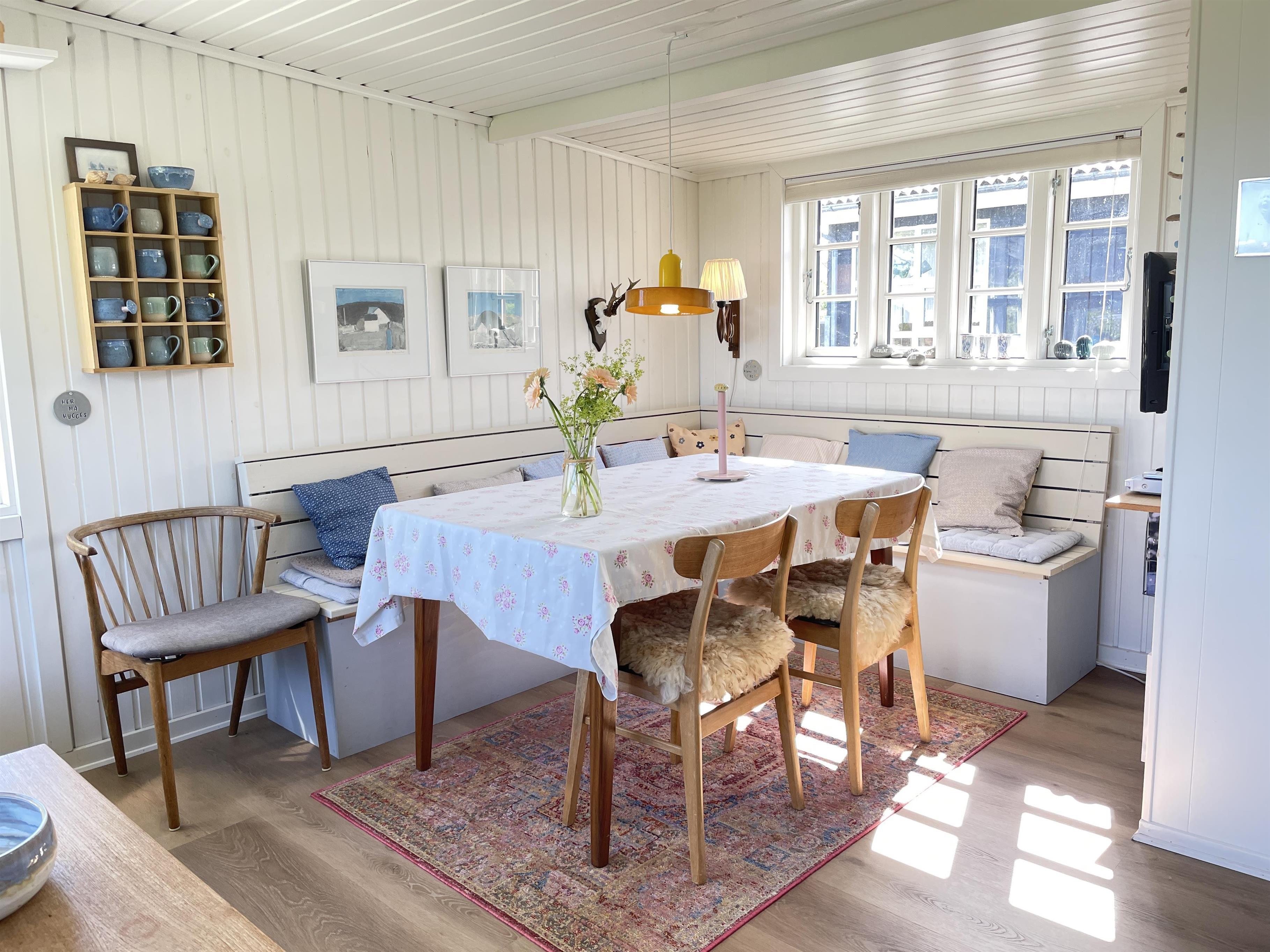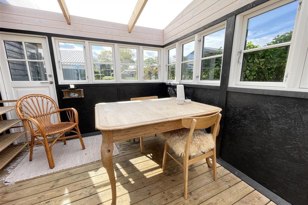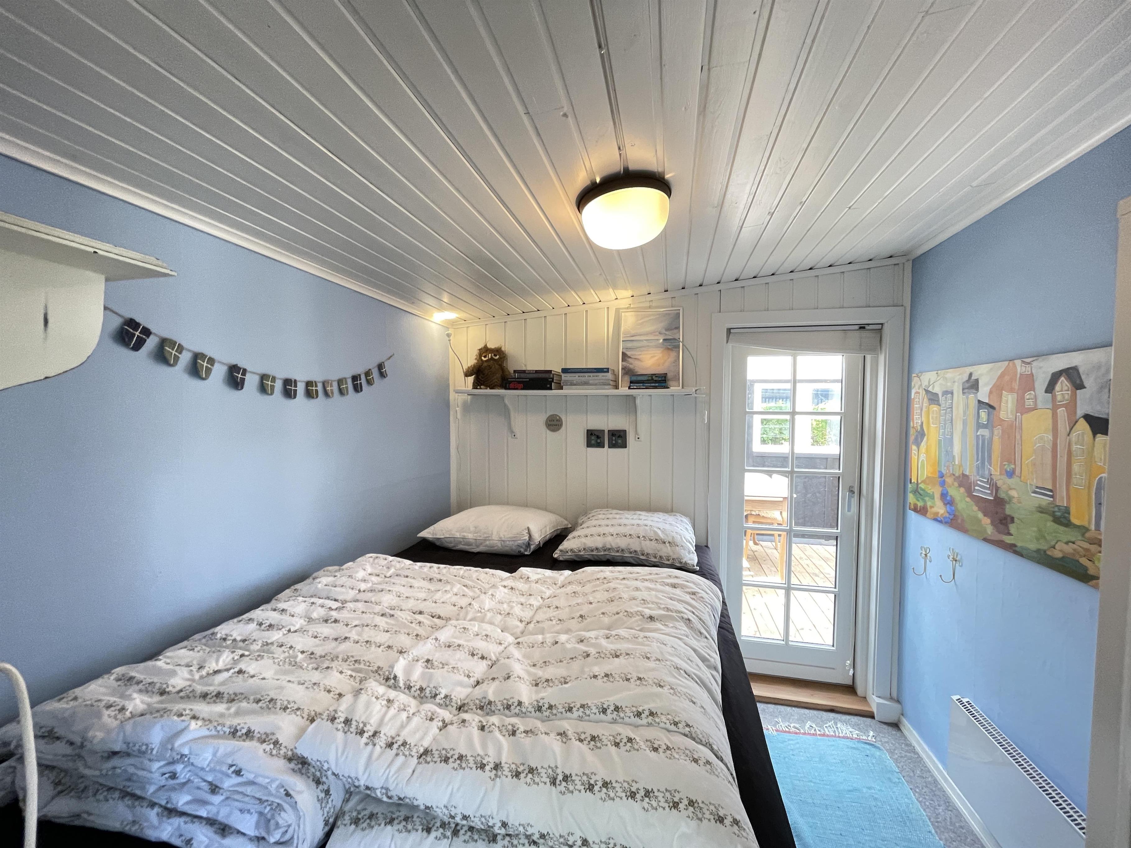 The living area has been beautifully renovated with a new floor and new furniture. It radiates charm and comfort, with a dining nook and a lovely sofa placed in the bay window. From here, you can enjoy views of the Kattegat Sea, just 200 meters away, and the peaceful natural surroundings. Attached to the house is a wonderful little sunroom.