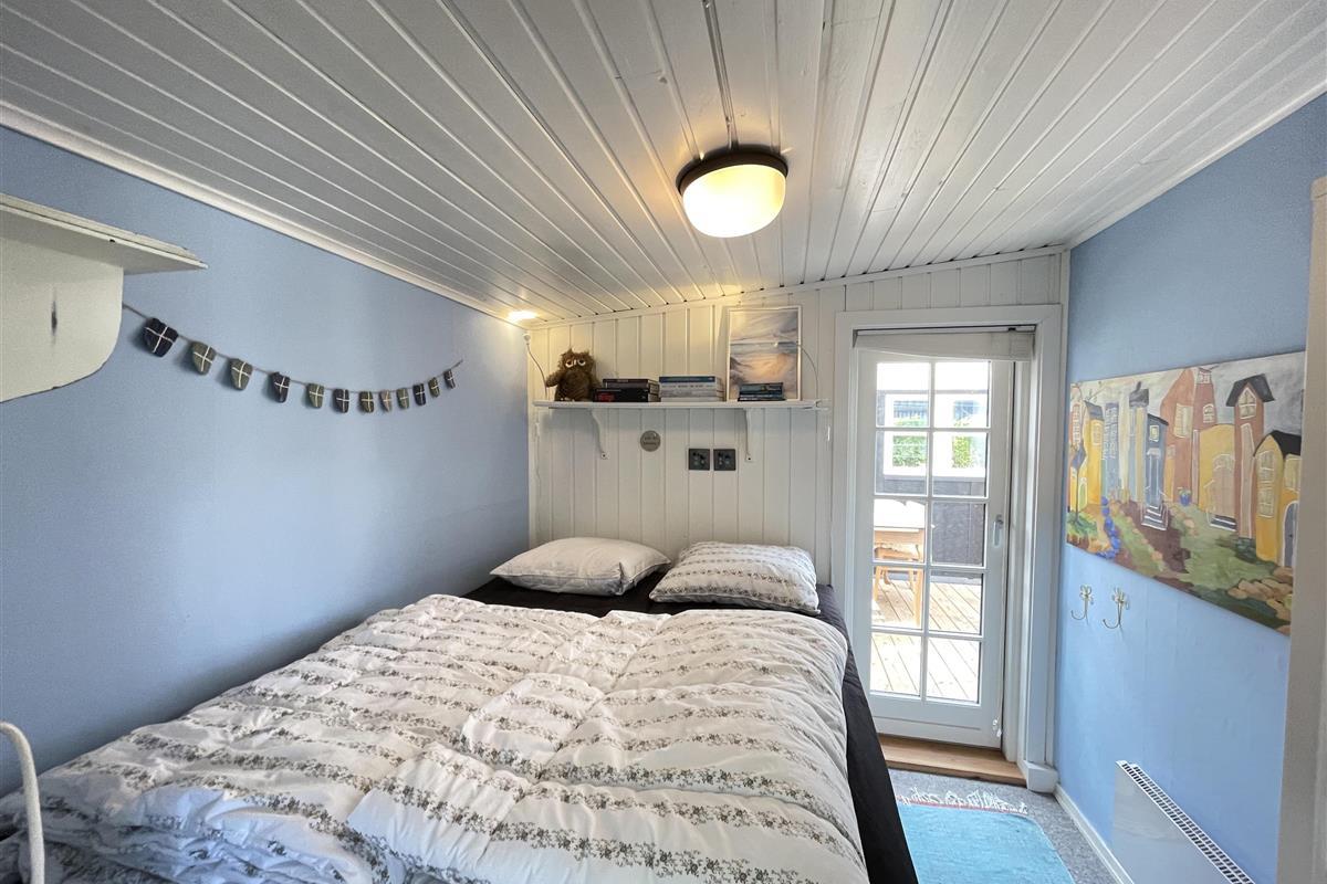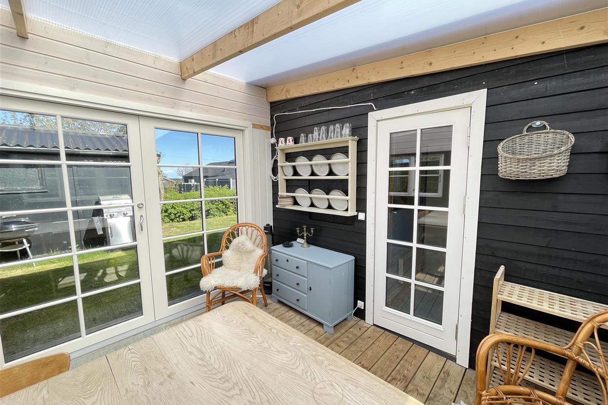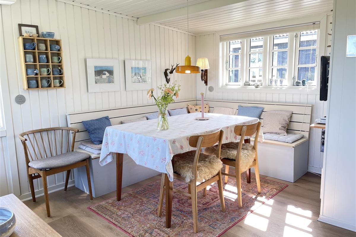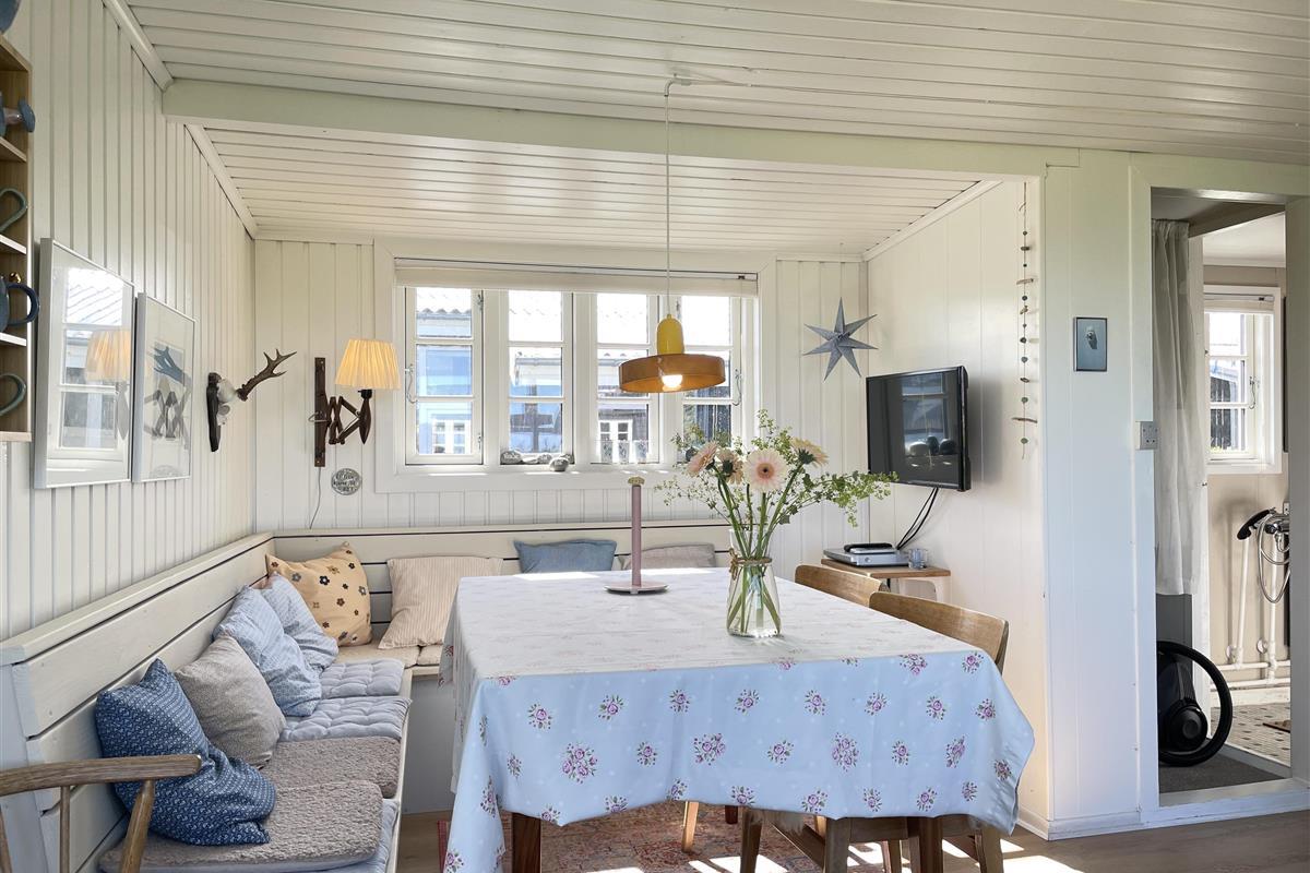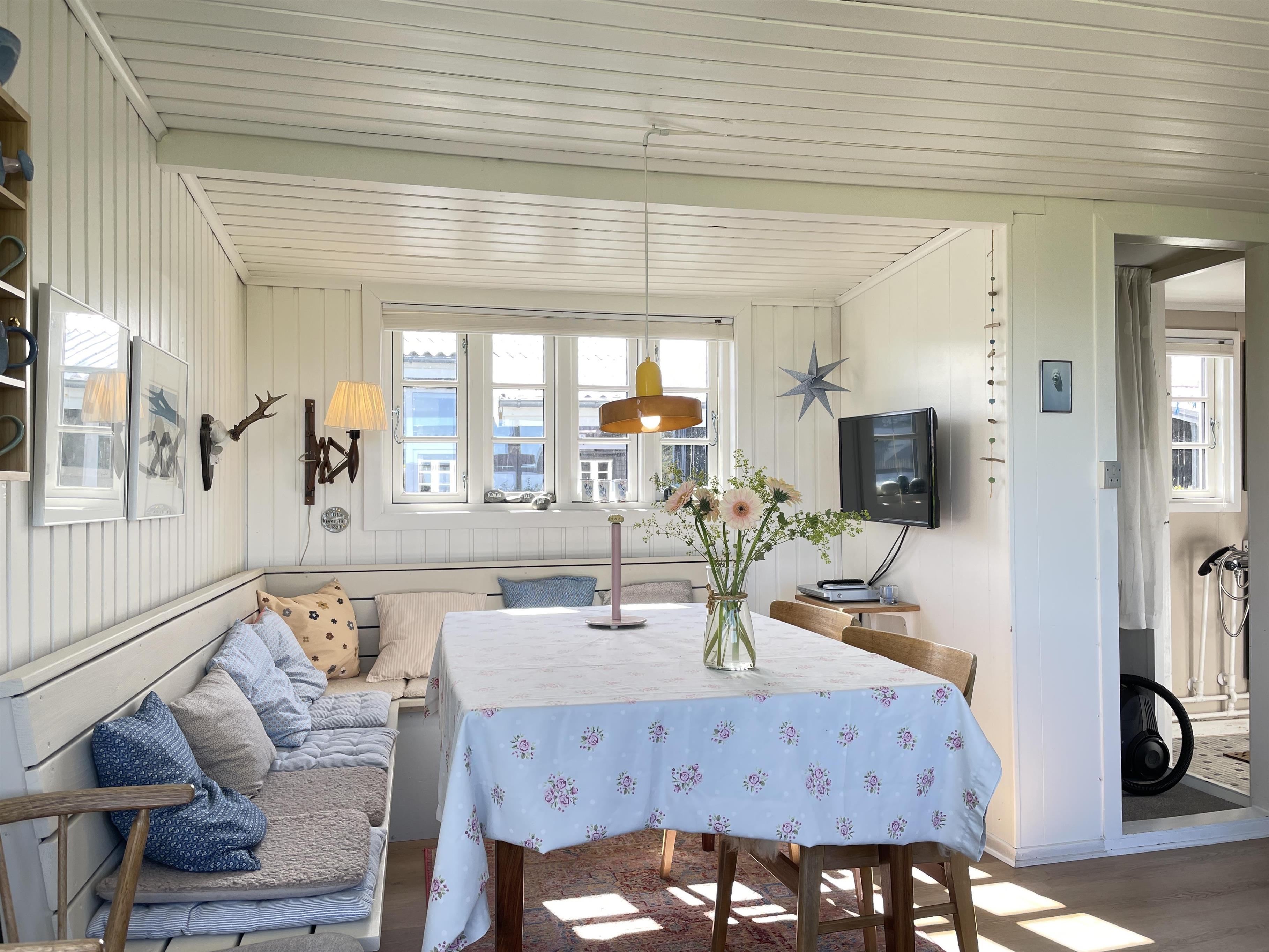 The living area has been beautifully renovated with a new floor and new furniture. It radiates charm and comfort, with a dining nook and a lovely sofa placed in the bay window. From here, you can enjoy views of the Kattegat Sea, just 200 meters away, and the peaceful natural surroundings. Attached to the house is a wonderful little sunroom.