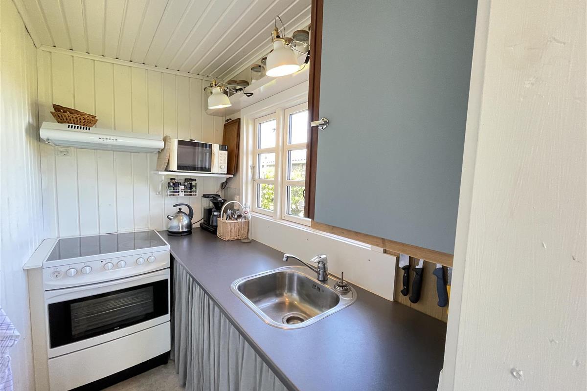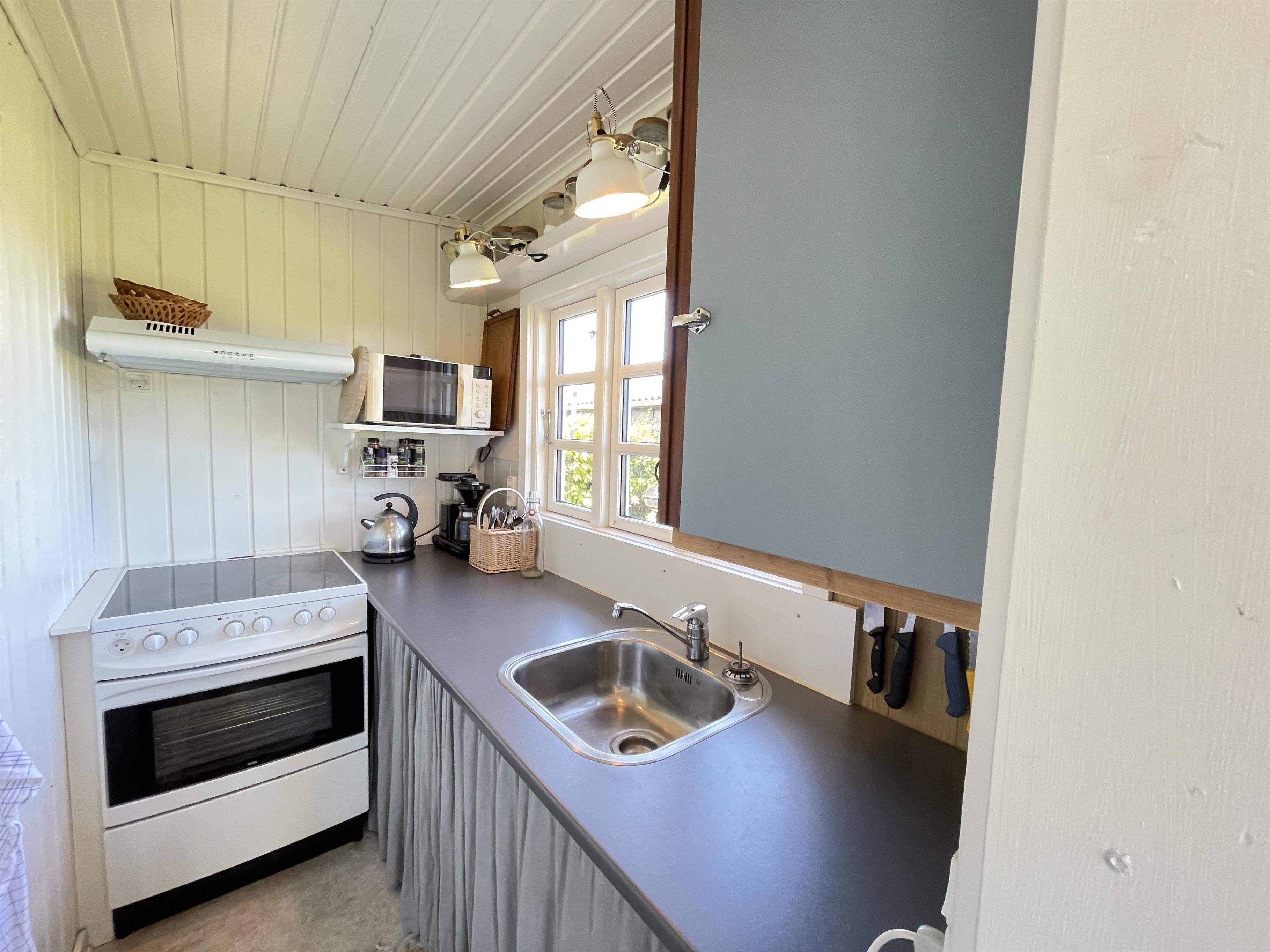 The holiday home has a small bedroom with a comfortable double bed, and the sofa can be pulled out to accommodate two additional guests. The kitchen is functional and equipped with everything needed to prepare delicious holiday meals, which can be enjoyed at the dining nook, in the sunroom, or out on the terrace.