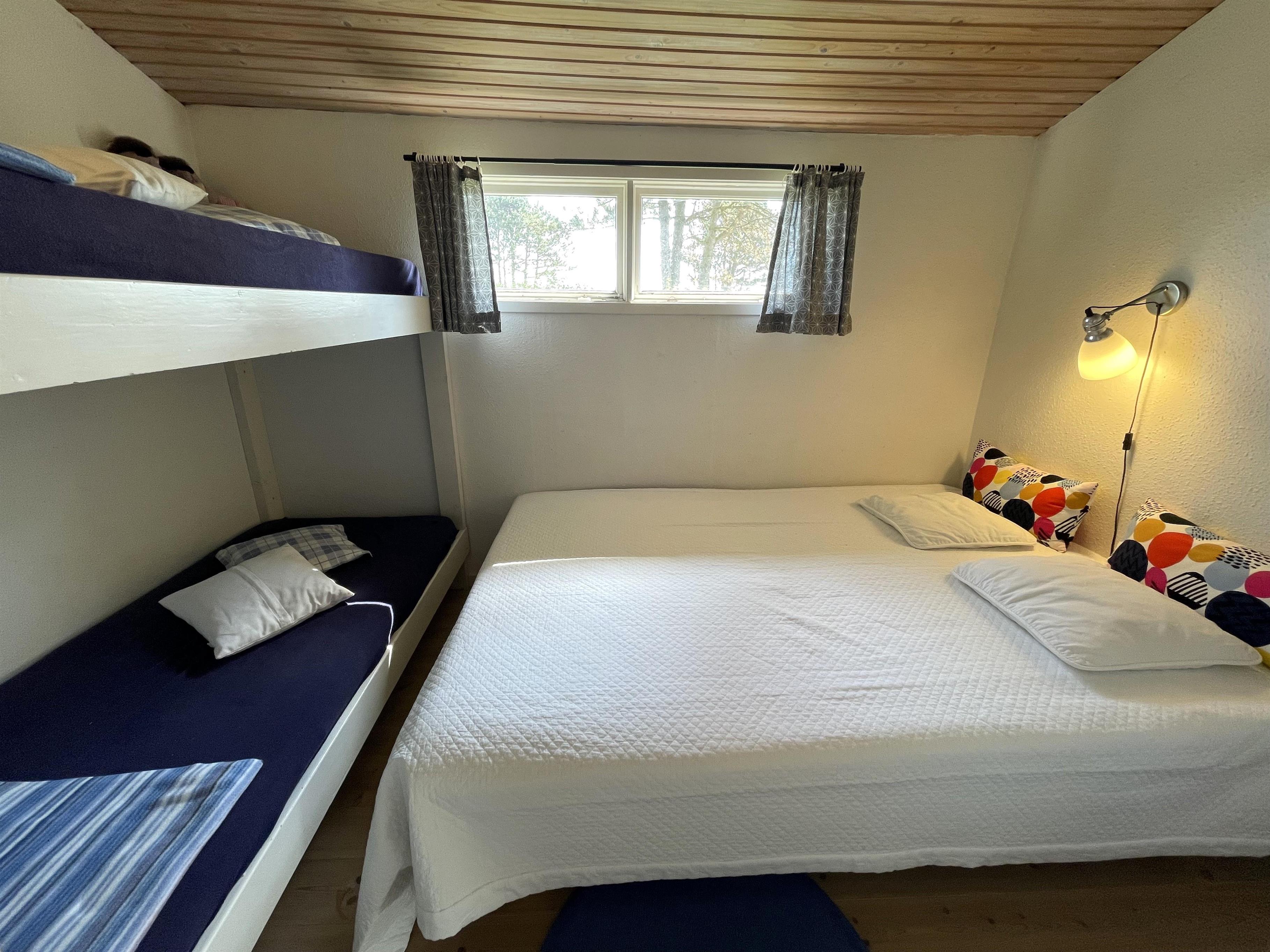 The cottage includes two bedrooms: One with a ¾ bed and a bunk bed – ideal for children. The other has a double bed and is accessed via the kitchen and terrace, creating a lovely sense of privacy.