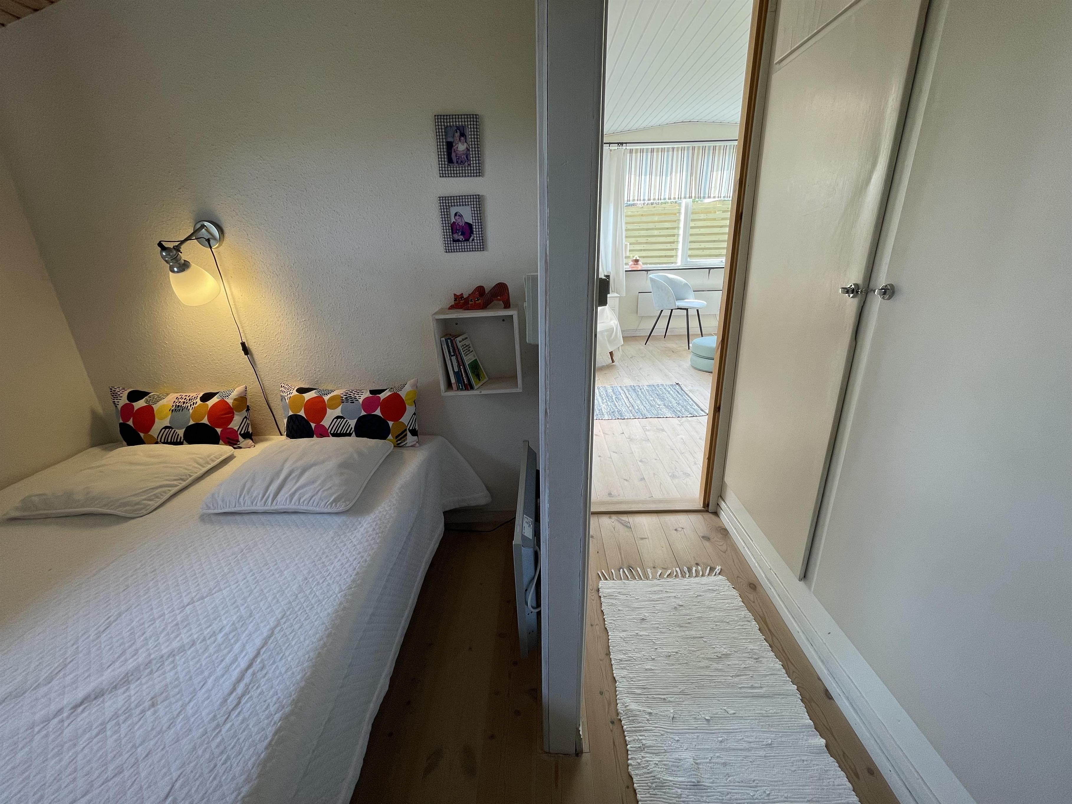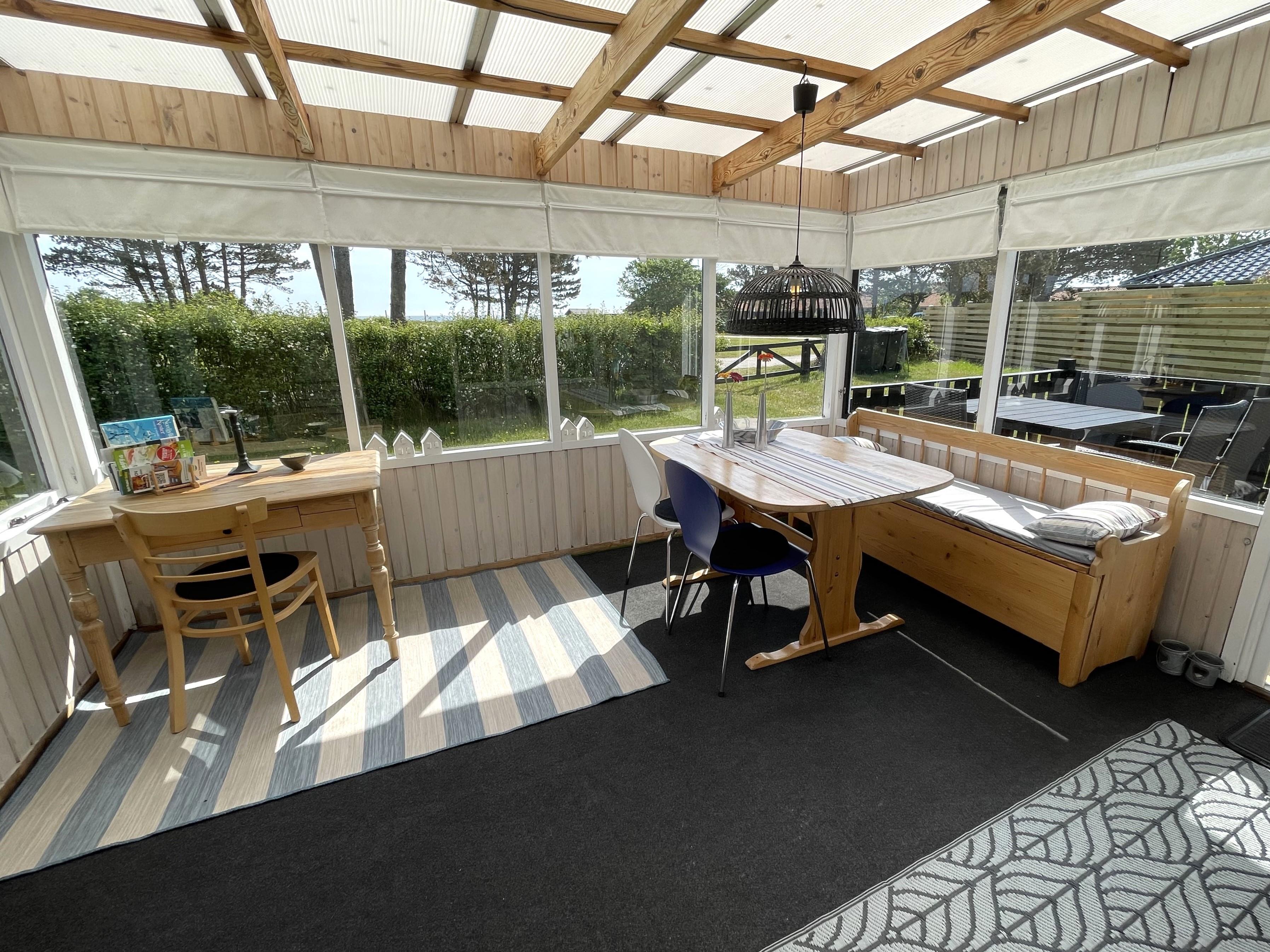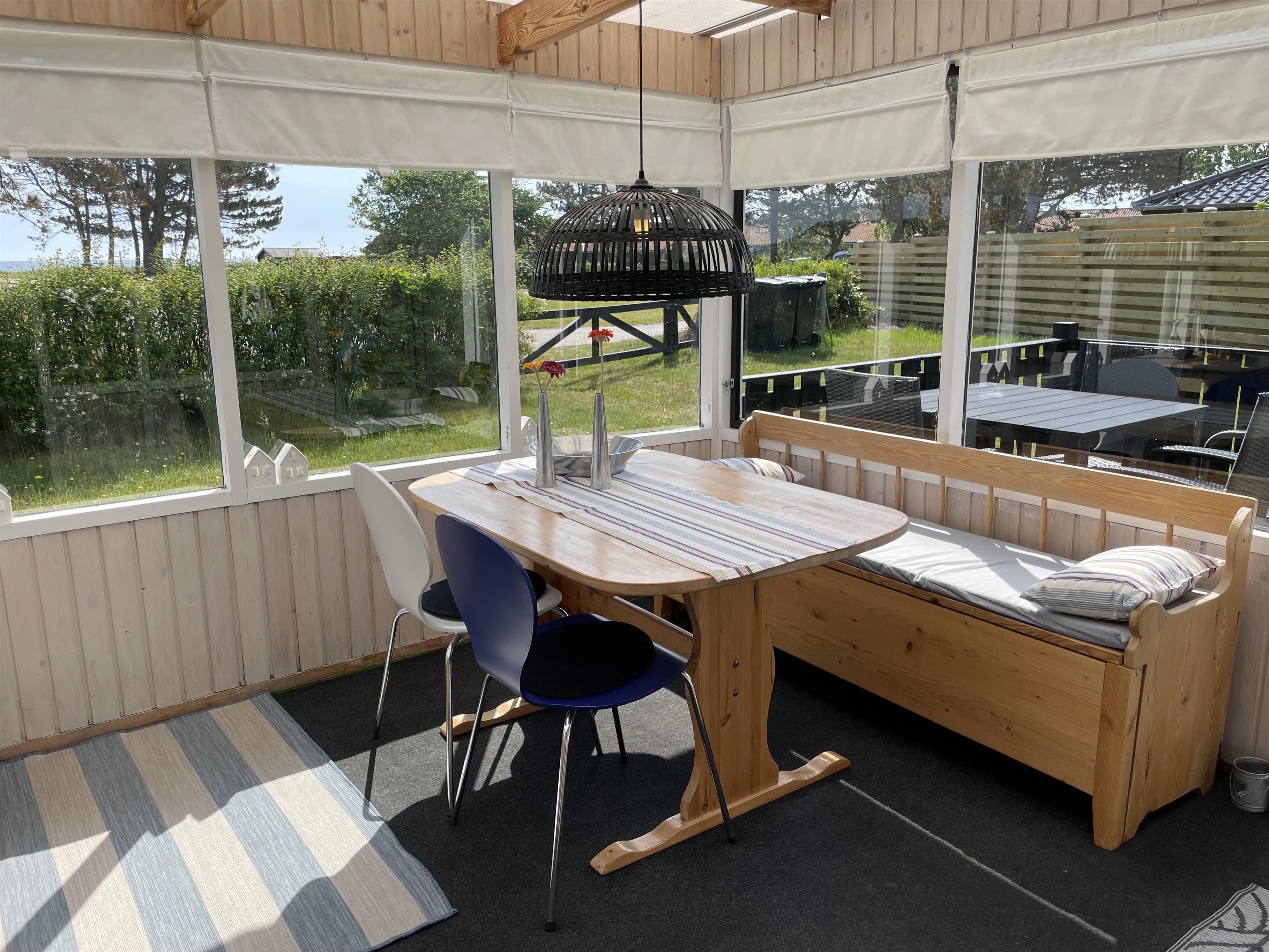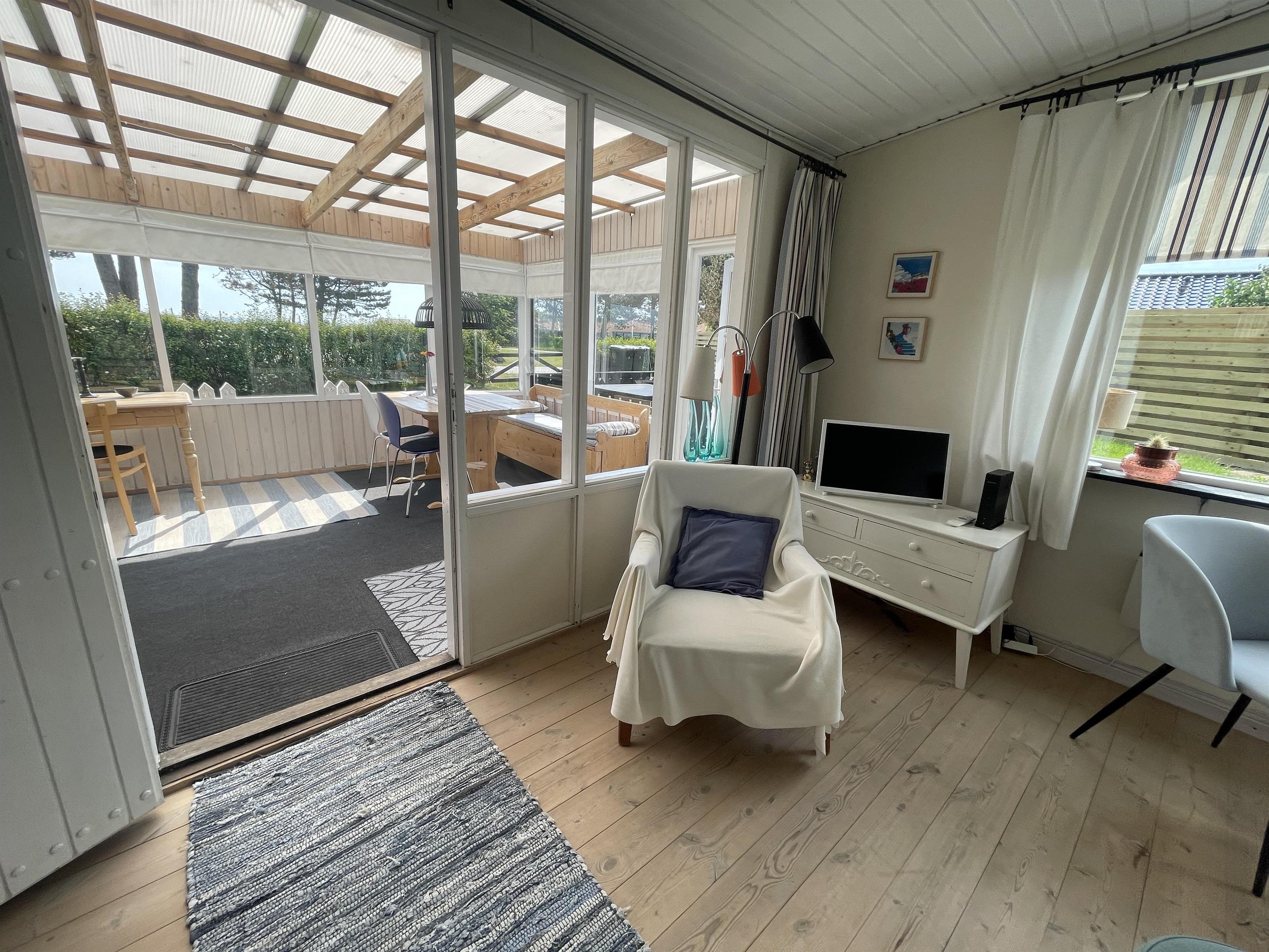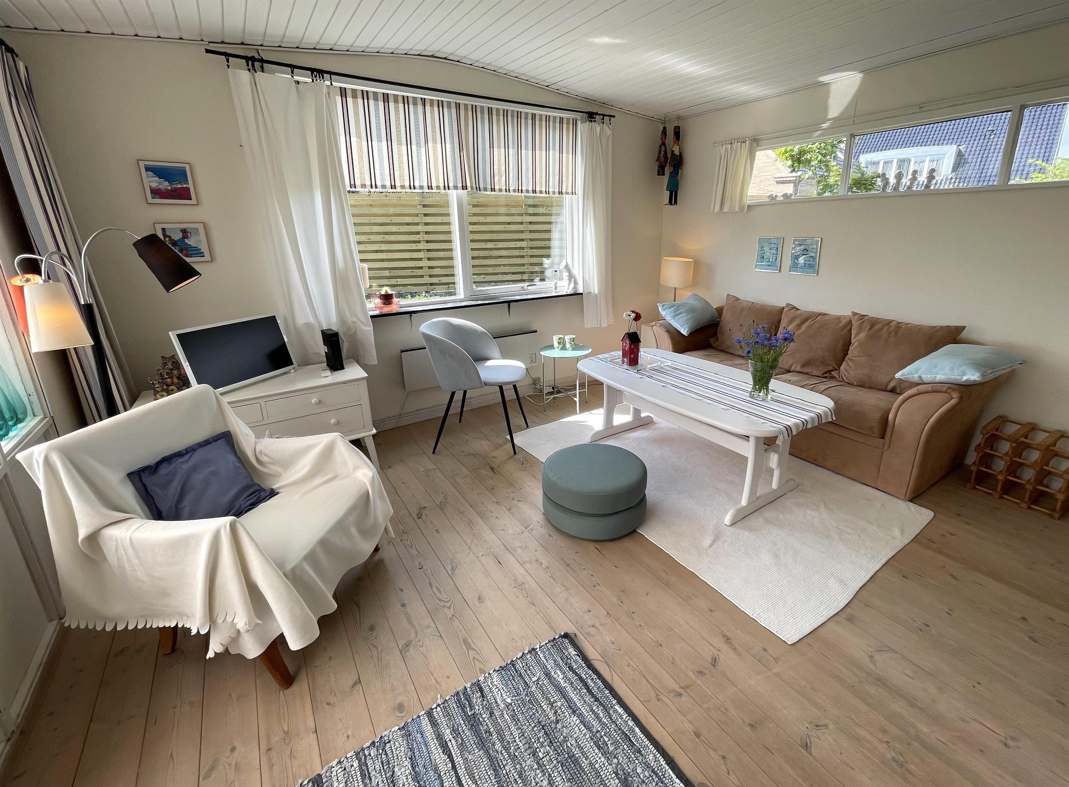 The layout is simple and functional, with a small, well-equipped kitchen and a cosy living room where you can enjoy the light streaming through large windows. From the living room, you enter a charming little sunroom with a classic built-in bench and dining area – a perfect spot for morning coffee or relaxing evenings with a view of the sea.