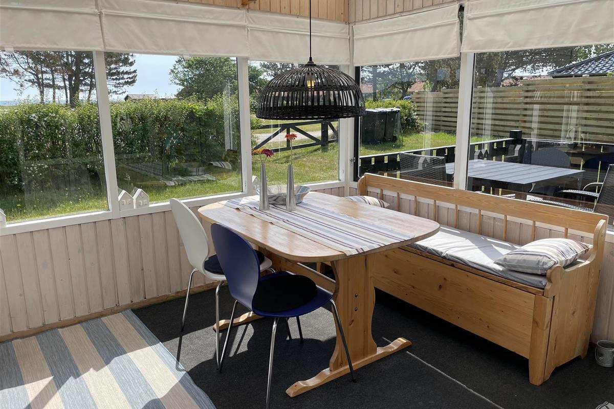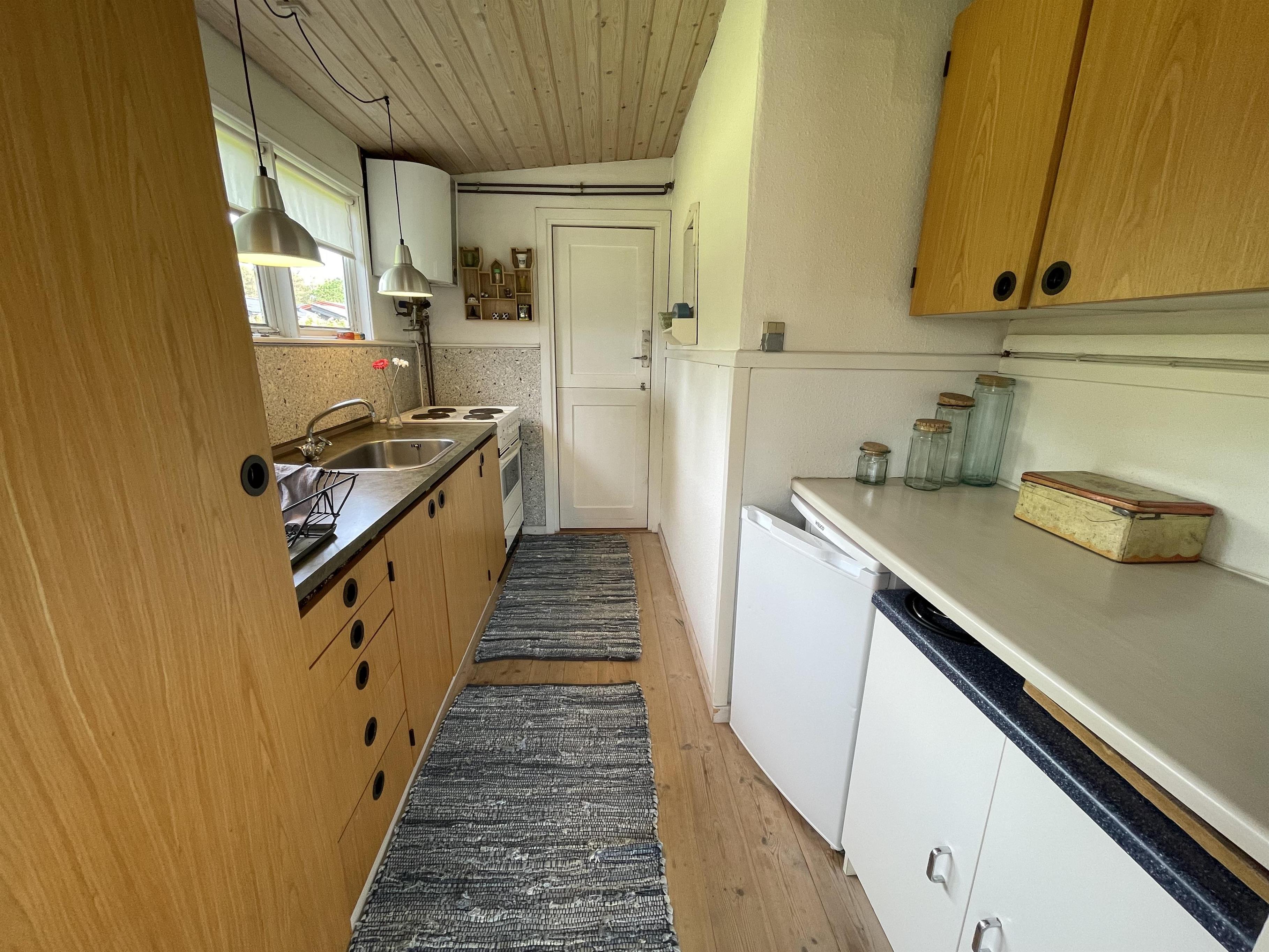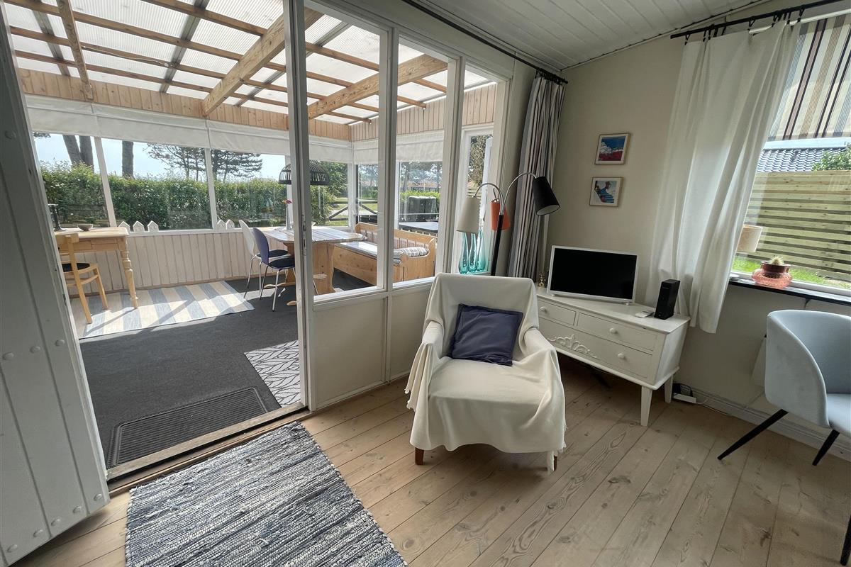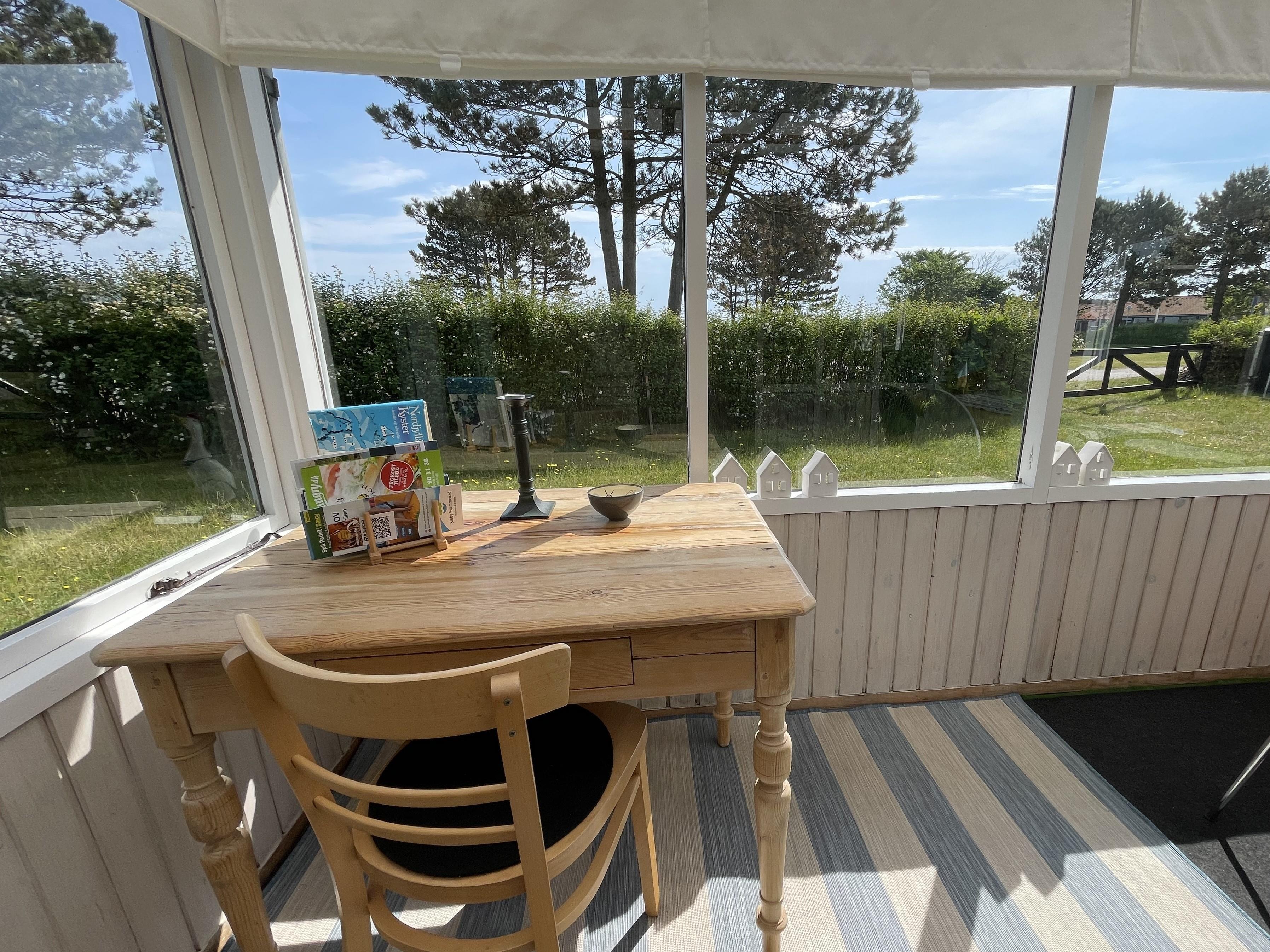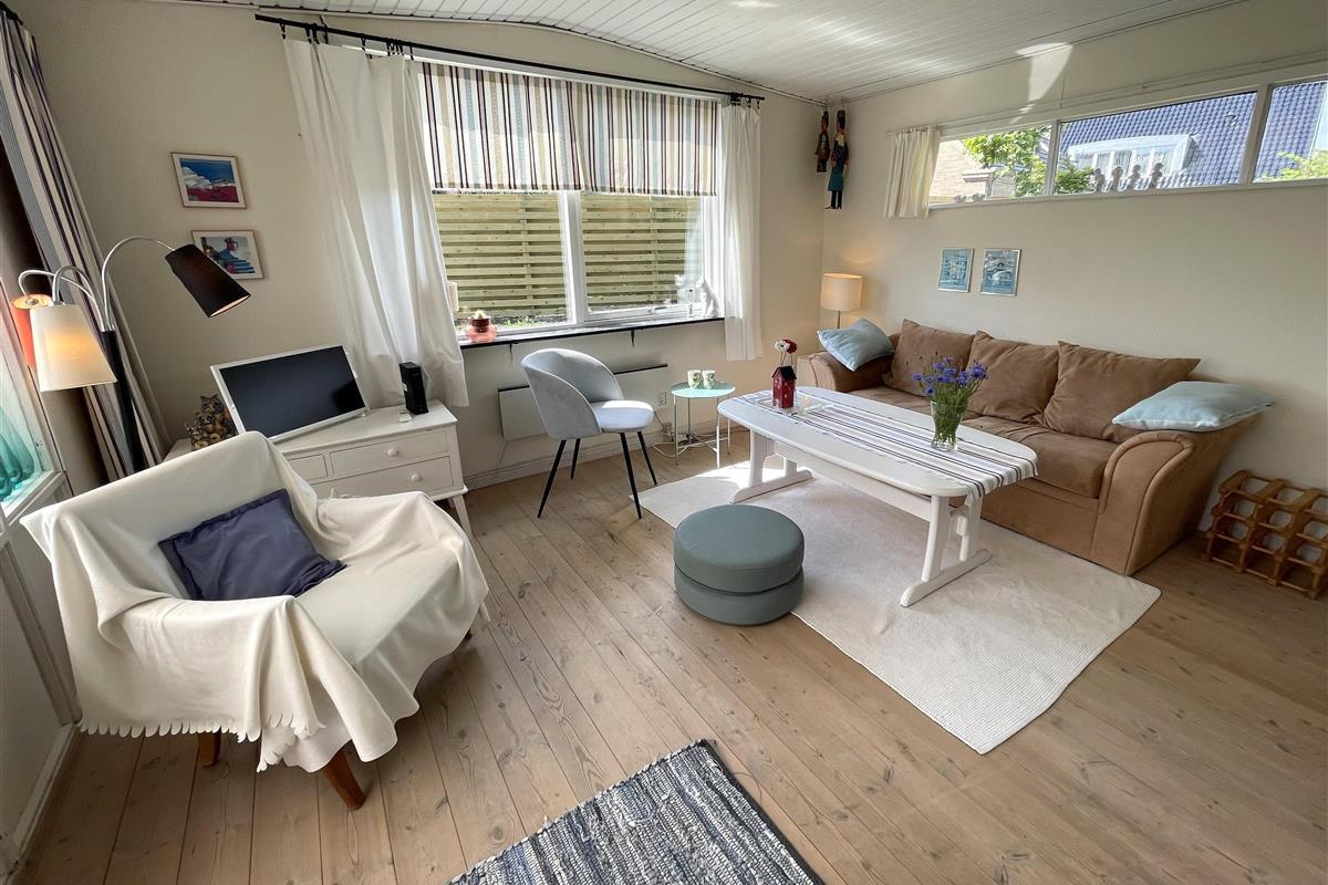 The layout is simple and functional, with a small, well-equipped kitchen and a cosy living room where you can enjoy the light streaming through large windows. From the living room, you enter a charming little sunroom with a classic built-in bench and dining area – a perfect spot for morning coffee or relaxing evenings with a view of the sea.