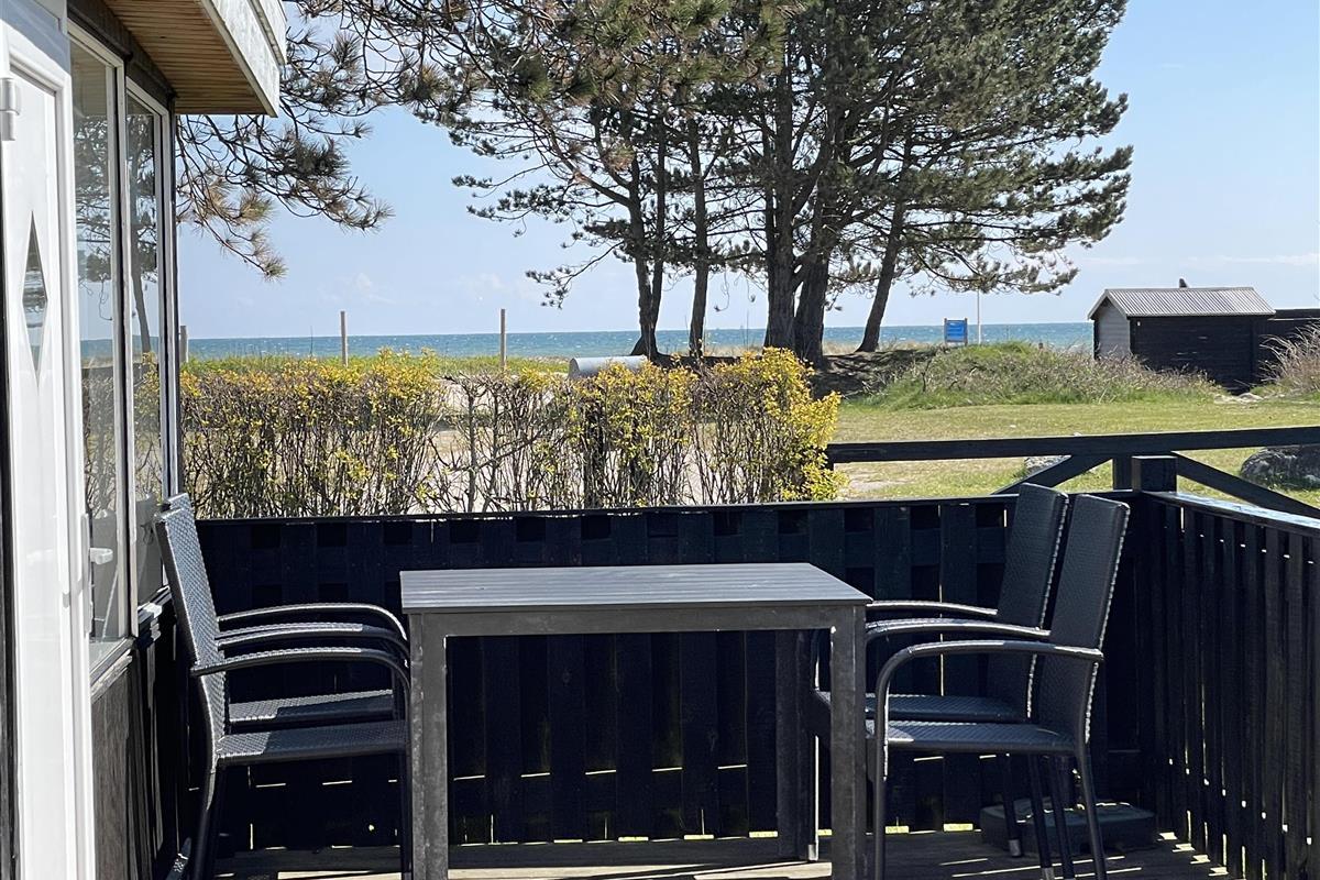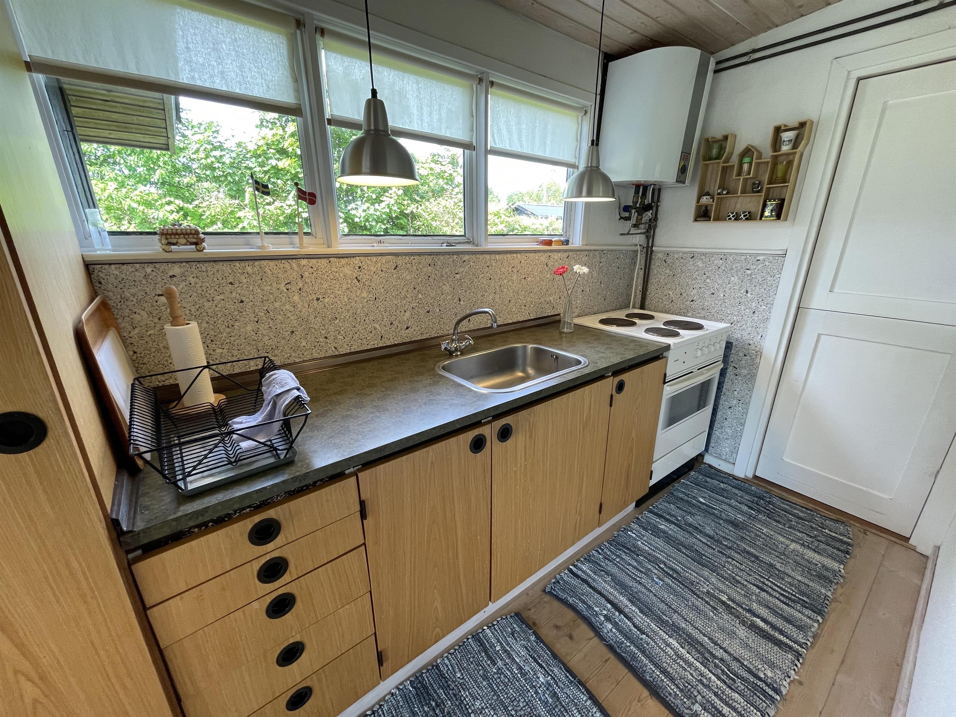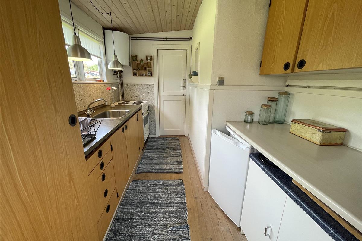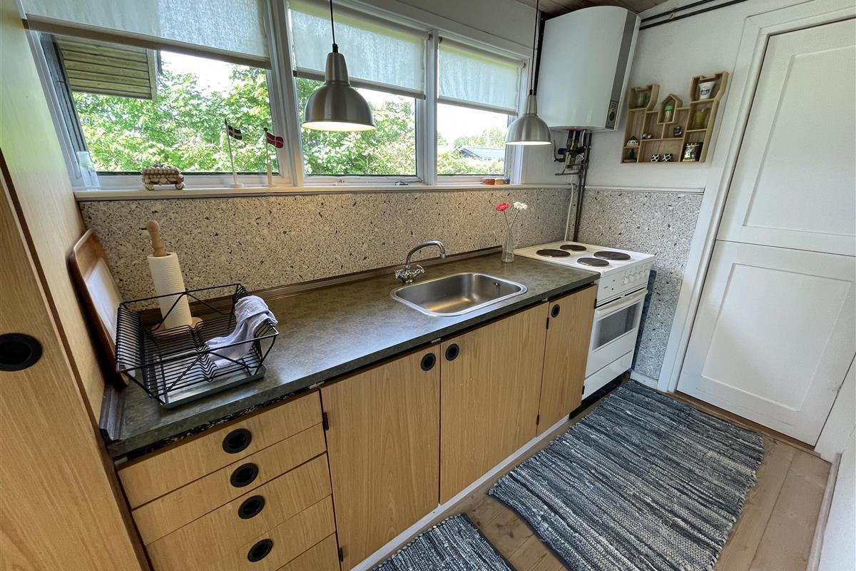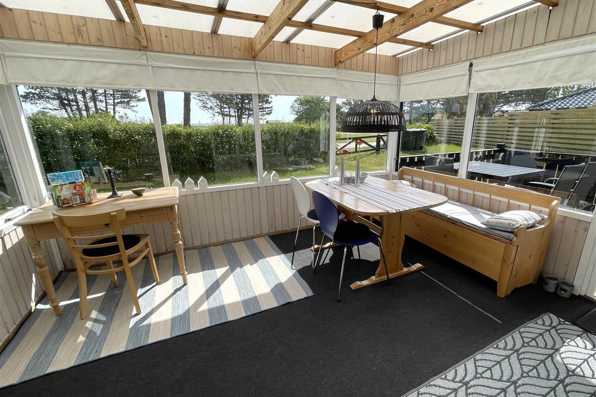 The layout is simple and functional, with a small, well-equipped kitchen and a cosy living room where you can enjoy the light streaming through large windows. From the living room, you enter a charming little sunroom with a classic built-in bench and dining area – a perfect spot for morning coffee or relaxing evenings with a view of the sea.