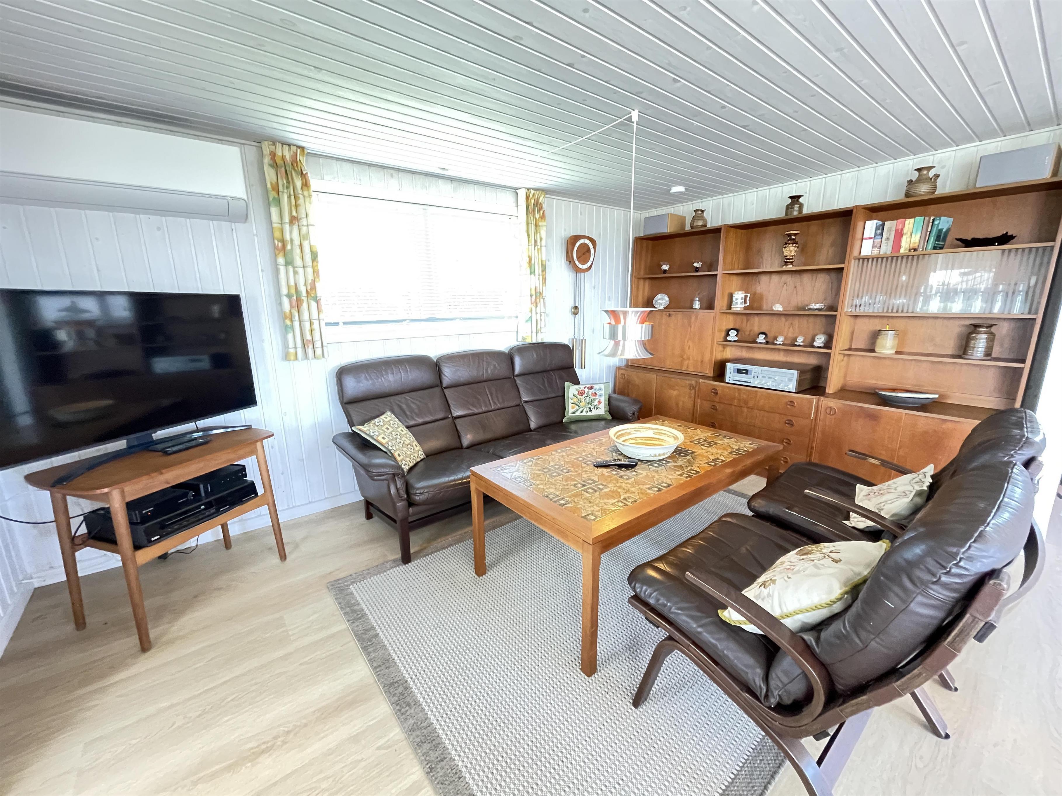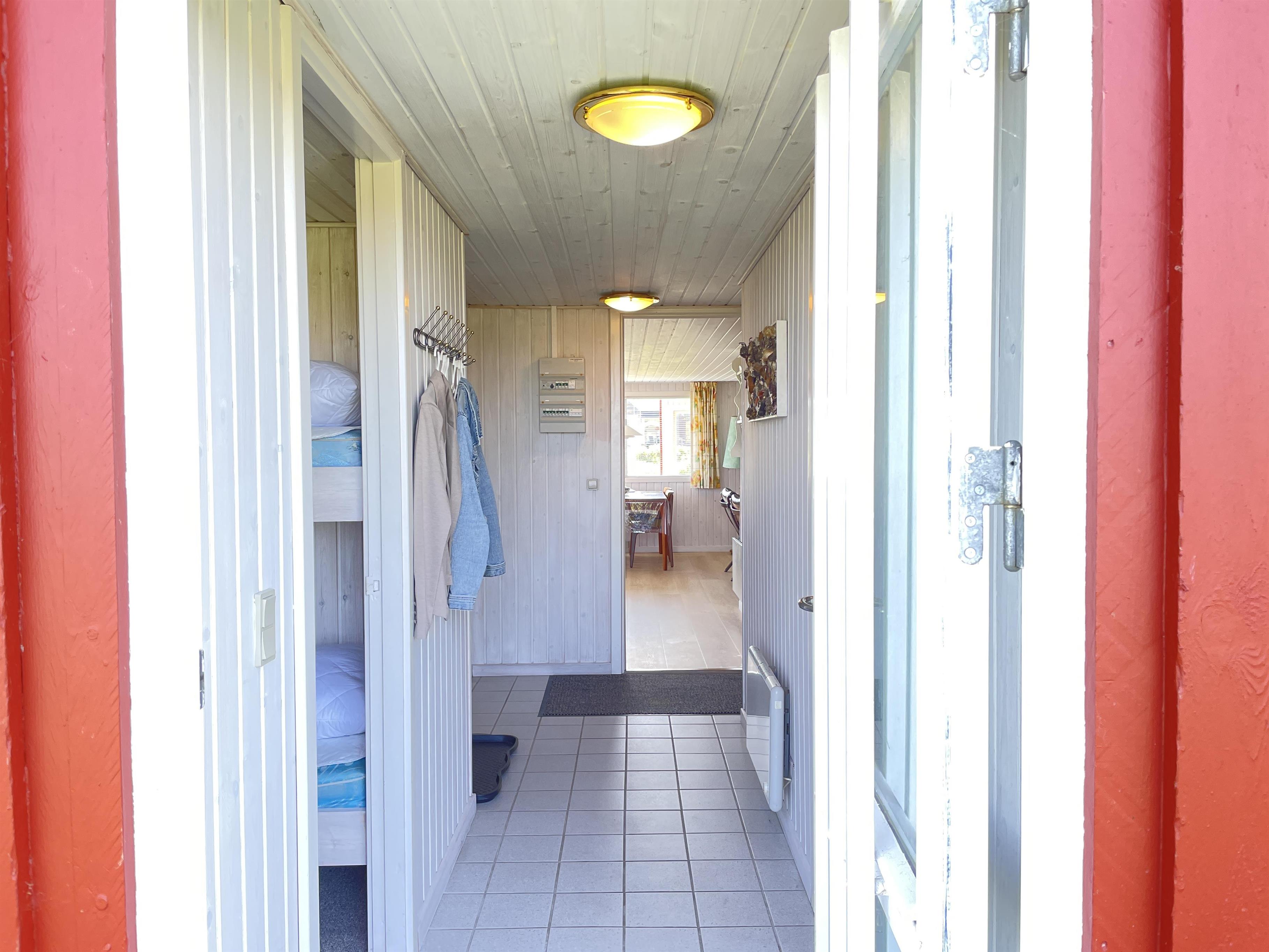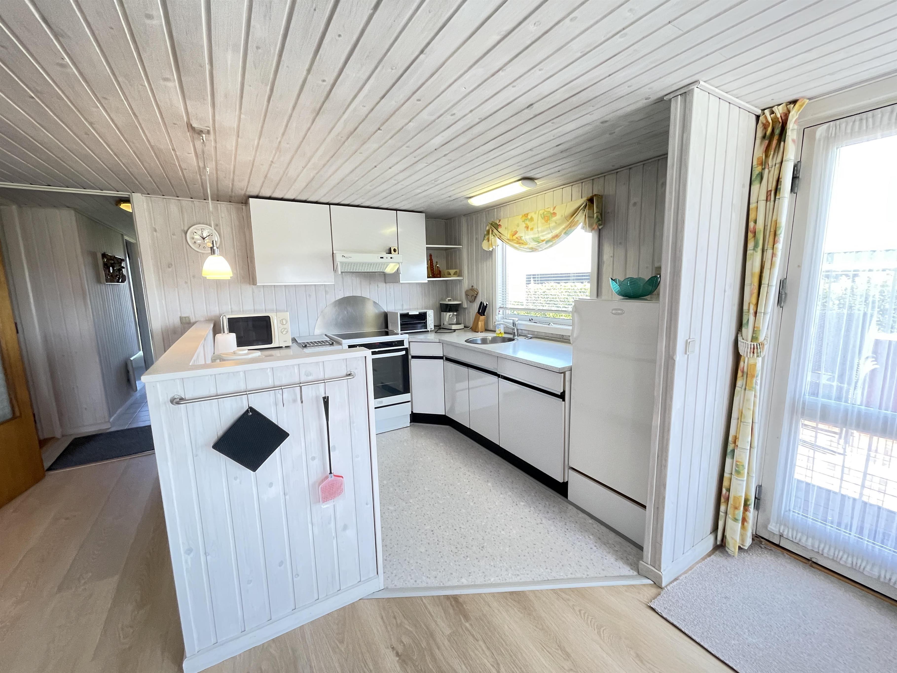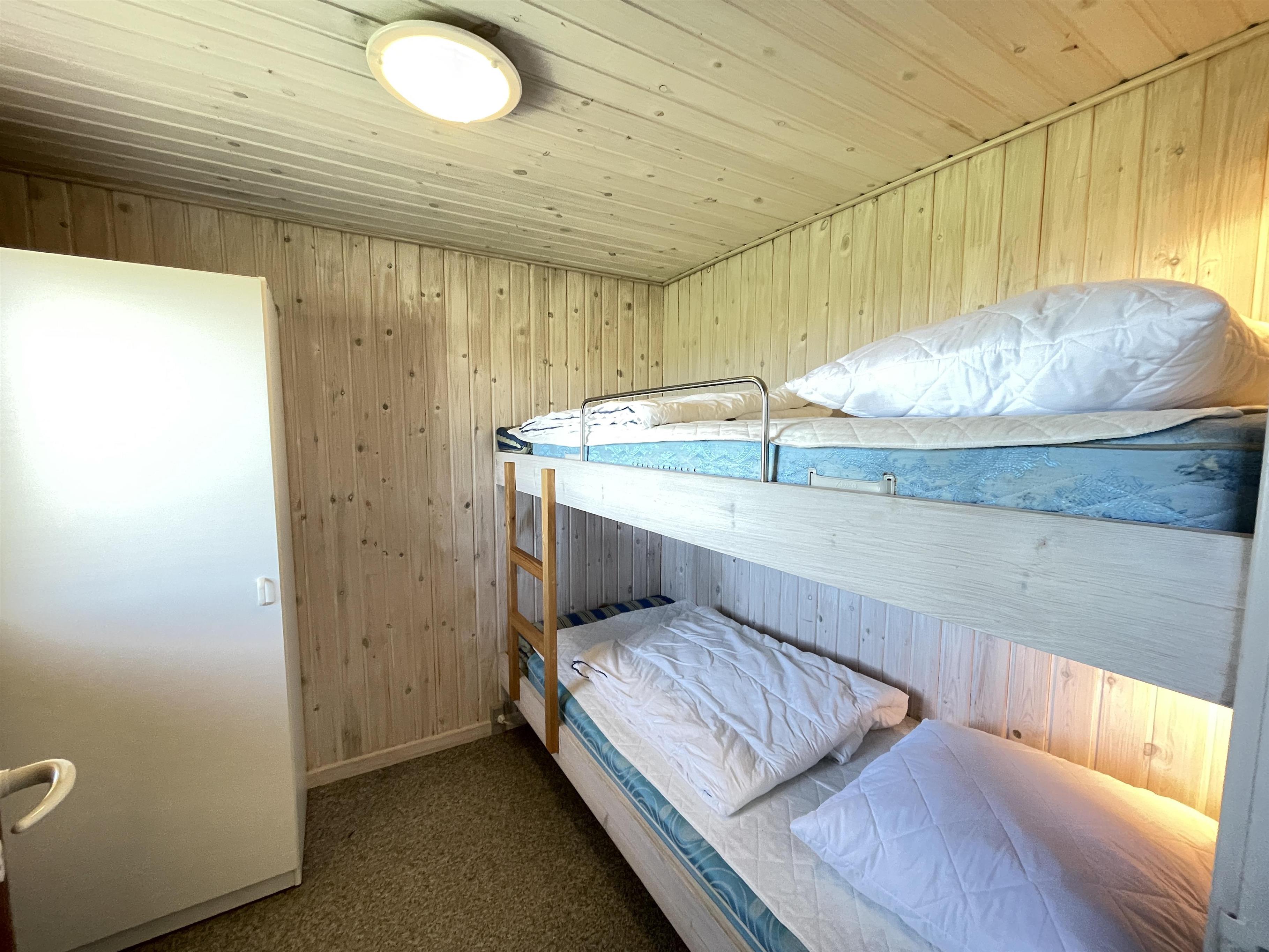 The living room has direct access to a cozy covered terrace, where you can enjoy your morning coffee while listening to the soothing sound of the waves. The summer house features three well-appointed bedrooms, all with ample closet space. Here, you’ll find comfortable sleeping arrangements for up to 6 people, including a double bed, two single beds, and a bunk bed (80 cm x 210 cm).