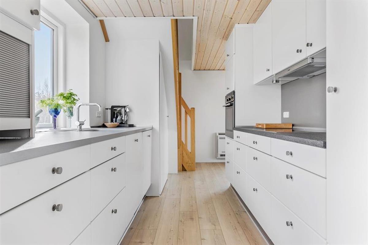 Der schöne, offene und dennoch gut voneinander getrennte Küchen- und Essbereich ist der erste Raum, den Sie betreten. Er fungiert zugleich als kleiner Eingangsbereich mit Platz für Jacken und Schuhe. Dank der Trennwand zwischen Küche und Essbereich ist es möglich, während der Zubereitung der Mahlzeiten die Küchengerüche in der Küche zu halten und gleichzeitig einfachen Zugang zum Esstisch und zum Wohnraum zu genießen.