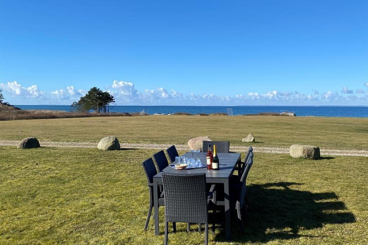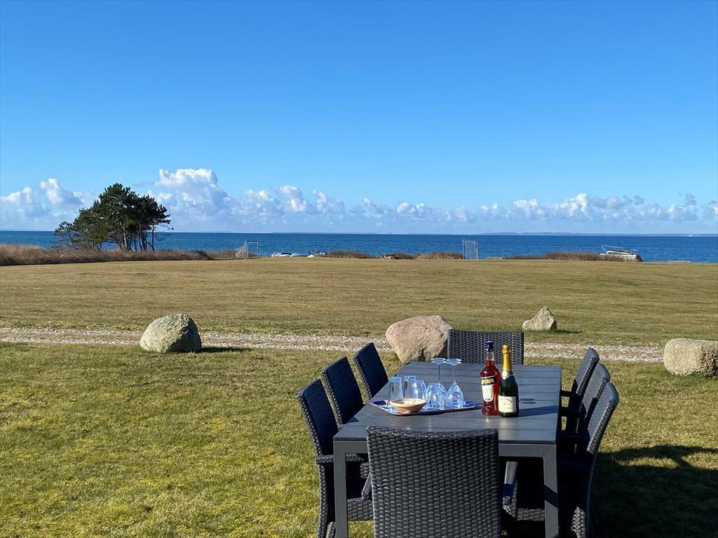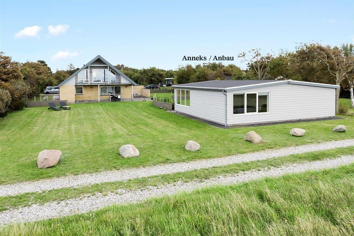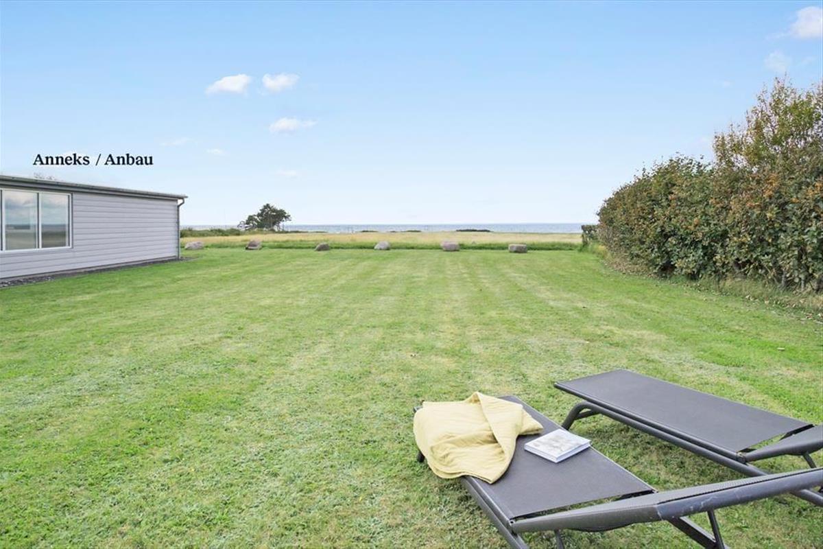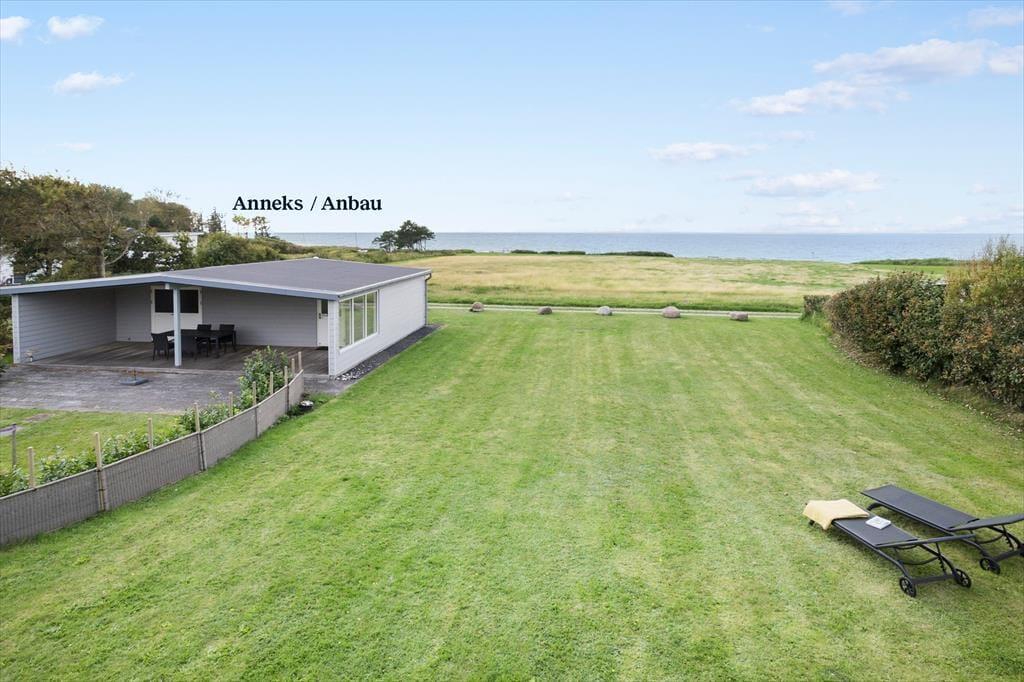 Das Ferienhaus befindet sich auf einem großen, offenen und mit Gras bewachsenen Grundstück. Dadurch genießen Sie den Ausblick in seiner ganzen Pracht. An den Grundstücksrändern sind einige Büsche gepflanzt, die durch niedrige Zaunelemente teilweise abgeschirmt werden. Die großen Terrassen laden zu erholsamen Stunden und zu gemeinsamen Essen unter freiem Himmel ein. Bei schönem Wetter machen Sie es sich auf Liegestühlen in der Sonne gemütlich. Die Südterrasse ist durch eine halbhohe Mauer abgeschirmt, die Privatsphäre und Windschutz bietet. In Richtung Wasser steht Ihnen eine große, überdachte Terrasse zur Verfügung. Auf dieser werden Sie viele Abende mit Ausblick auf das Meer und auf die wundervollen Sonnenuntergänge verbringen.