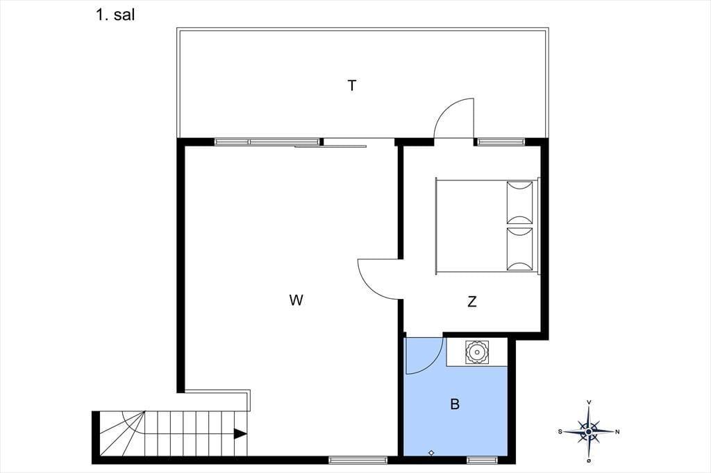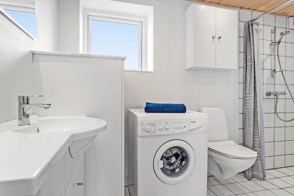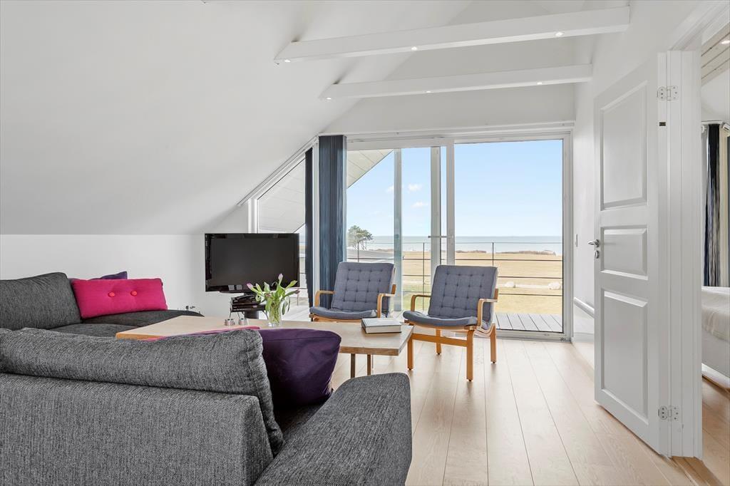 Im ersten Stock treffen Sie auf einen schönen Aufenthaltsraum mit einem komfortablen Sofa. Hier können Sie sich in Ruhe niederlassen und durch die großen Fenster aufs Meer blicken. Für Abwechslung sorgt ein Fernseher, der mit seinem Satelliten-Receiver unter anderem dänische, deutsche und schwedische Sender empfängt. Kostenloses WiFi steht zur Verfügung. Vom Wohnraum gelangen Sie auf einen Balkon, der mit einer herrlichen Aussicht über das offene Grundstück und die nur 150 Meter entfernte Westküste Samsøs zu begeistern weiß. Auf diesem Balkon genießen Sie garantiert prachtvolle Sonnenuntergänge und unvergessliche Momente.