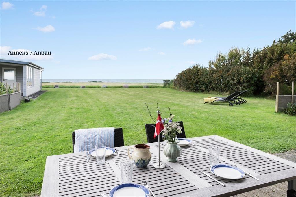 Vor dem Nebengebäude steht Ihnen eine große Terrasse zur Verfügung. Diese wird von einem Zaun, der die Terrasse optisch vom offenen Grundstück trennt, schön eingerahmt. Zwischen dem Grundstück und dem Meer verläuft ein kleiner Schotterweg. Hinter dem Schotterweg erstreckt sich ein Gemeinschaftsareal, dass Sie beispielsweise gut für das ein oder andere Fußballspiel nutzen können.