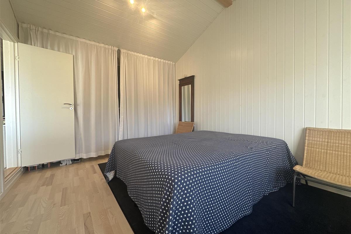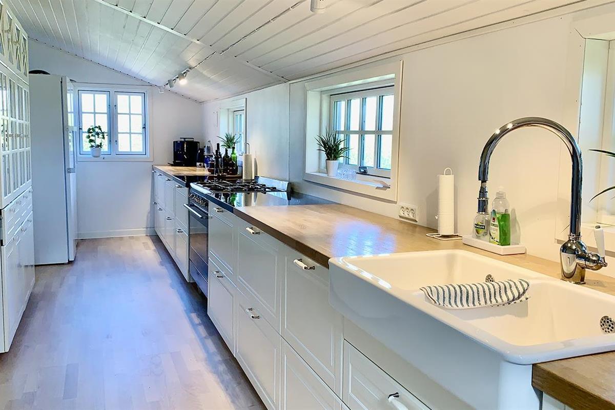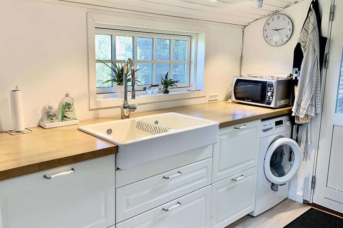 The kitchen opens onto the spacious living room with a large dining area and a cosy sofa where you can relax and enjoy the natural light streaming in through the large windows. It's easy to gather with family or friends here and create memorable moments. The holiday home has three bright and inviting bedrooms with comfortable beds that ensure you a good night's sleep – ready for another day of exciting experiences. The bathroom is modern and functional with a shower cubicle, perfect for freshening up after a day out in nature.