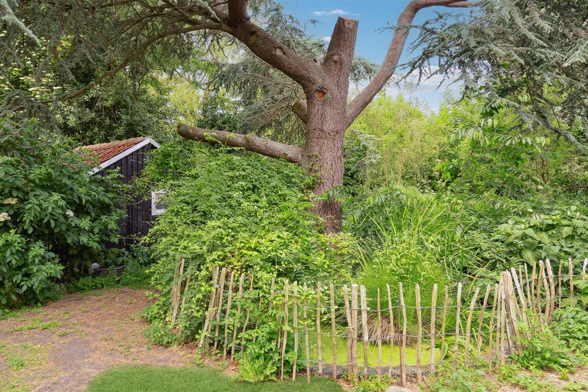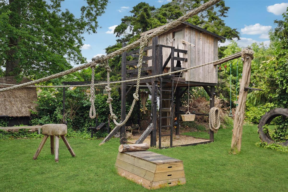 Het grote natuurlijke perceel, met kruidenperken en fruitbomen en fitnessapparatuur voor buiten, zijn ook fijne plekken om buiten van de zon te genieten. Je kinderen zullen blij zijn met het speelhuisje in de bomen en 's avonds kun je genieten van ontspannende avonduren in de hoek van het pand met vuurplaats en buitenhaard. Extra grond hoort bij het pand, dat aan de andere kant van de weg ligt.