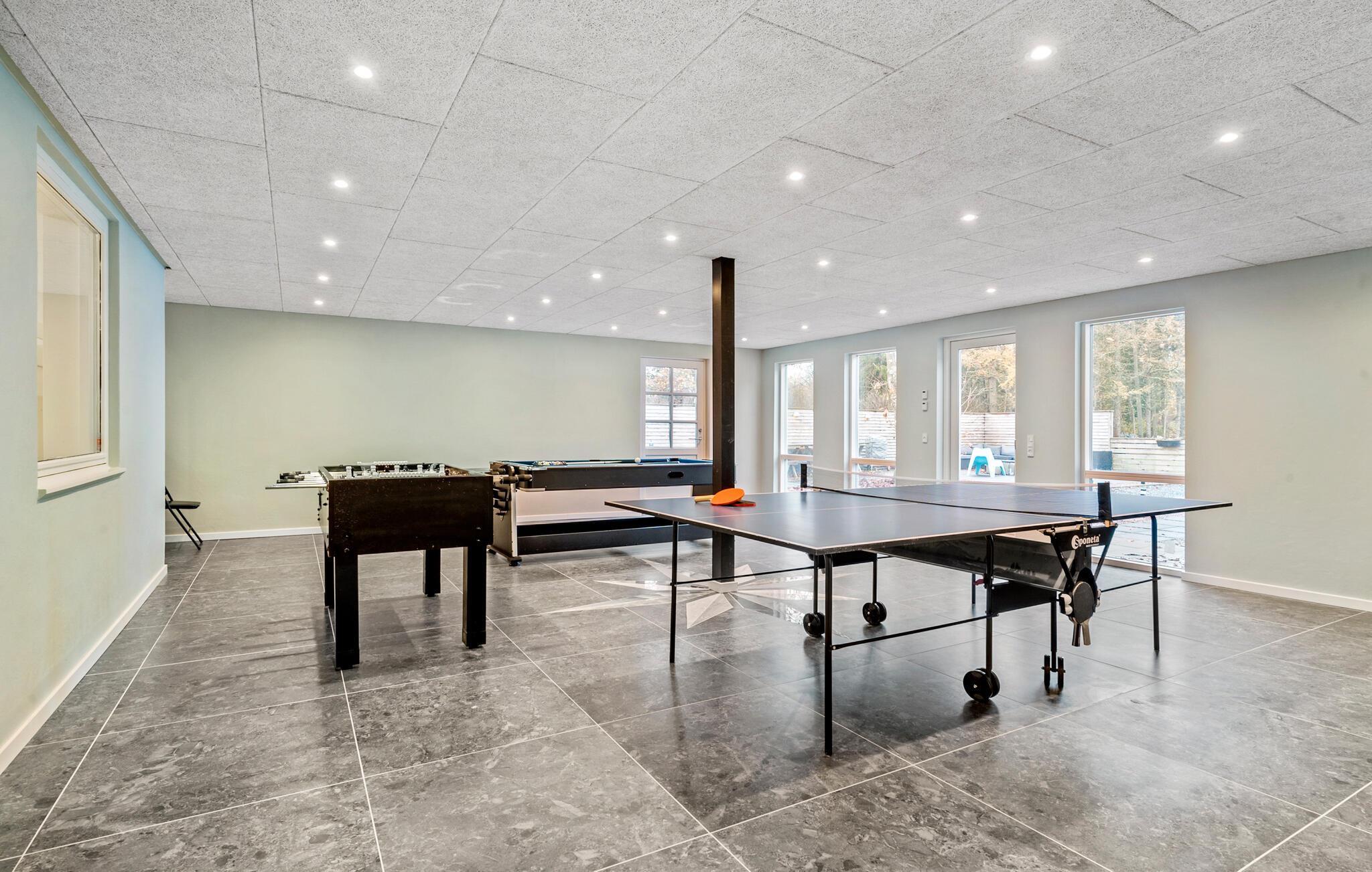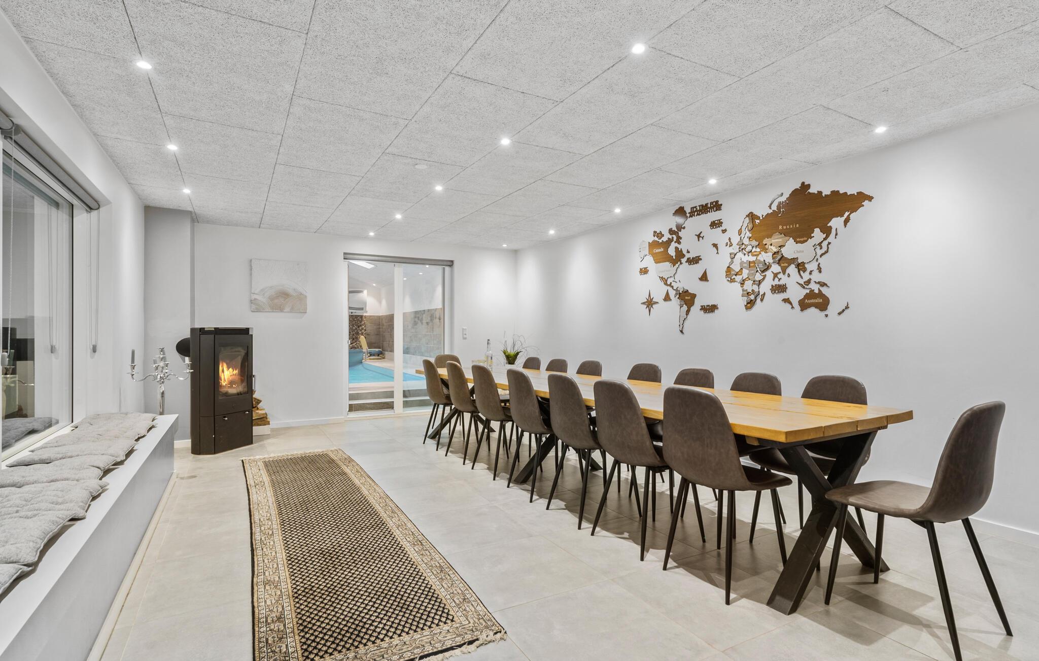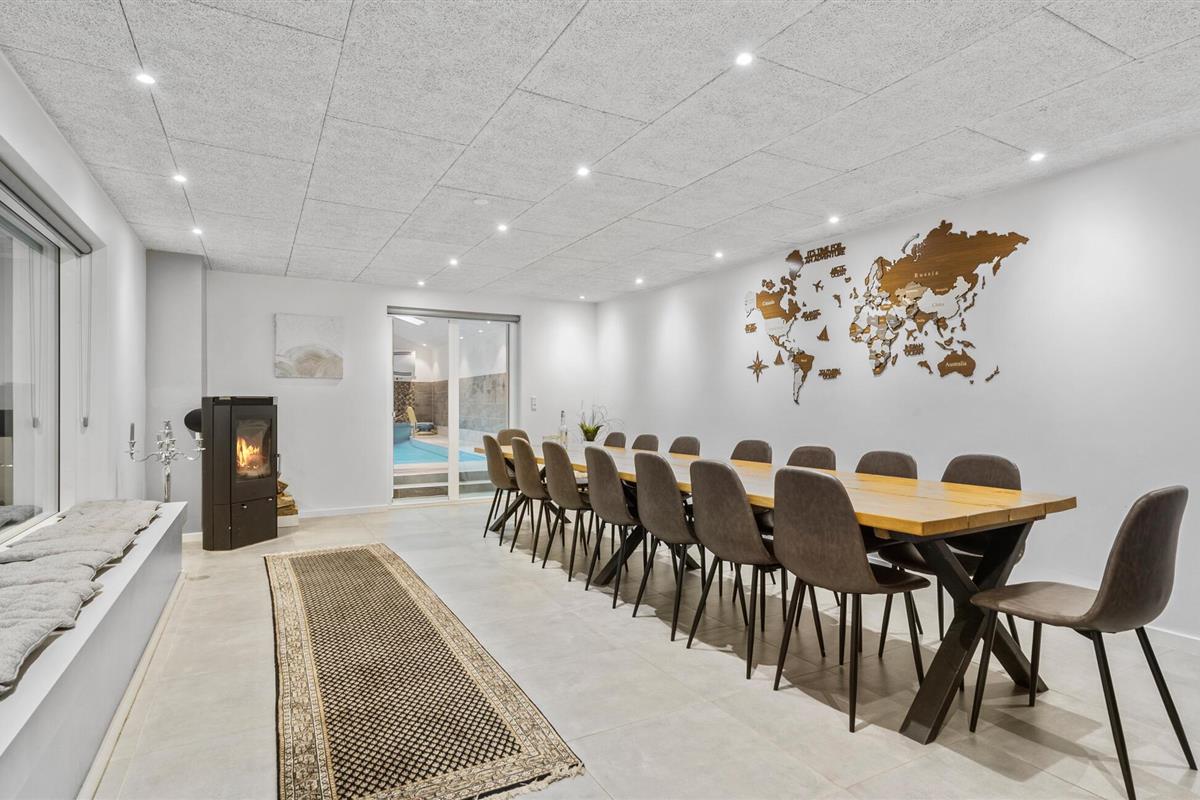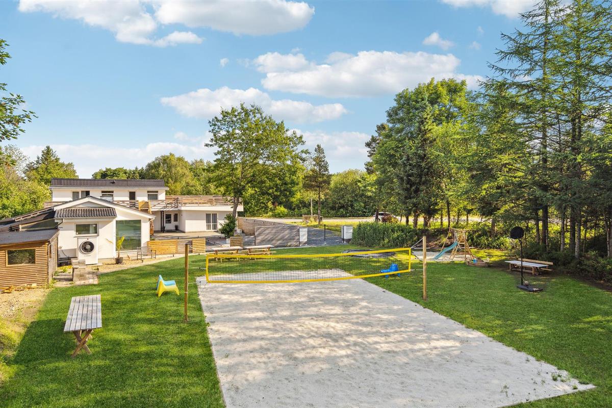 Kom naar Søbylund met uw uitgebreide familie of meerdere vriendenfamilies en breng een onvergetelijke vakantie door in deze geweldige accommodatie die niets te wensen overlaat. Ervaar het grote huis en maak de open keuken, met aangrenzende woonkamer en eetkamer uw natuurlijke ontmoetingsplaats. Geniet van uw tijd met koken, ontspannen of spelen terwijl u door het raam naar het binnenzwembad kijkt. Dit is een van de hoogtepunten van het huis. Ongeacht het weer kunt u hier onbeperkt badplezier beleven; terwijl uw kinderen in het water spelen, maakt u het uzelf gemakkelijk in de whirlpool of sauna en neemt u een verkoelende duik in het bad. U kunt zich ook verheugen op het enorme terras op de 1e verdieping, dat u een rustgevend uitzicht op het bos en over de tuin biedt en de juiste sfeer tijdens het zonnebaden. Maar ook de tuin met verdere terrassen en een speelplaats voor de kinderen nodigt uit tot vertoeven.